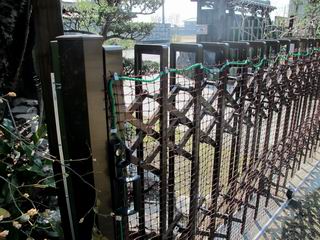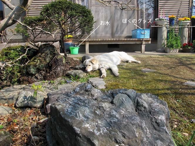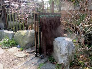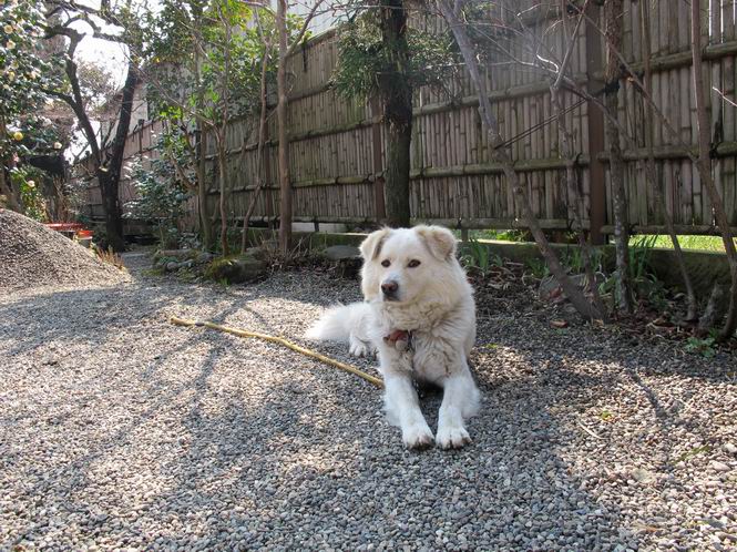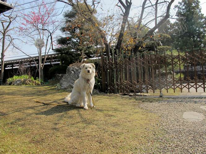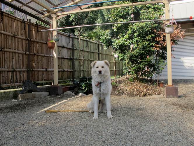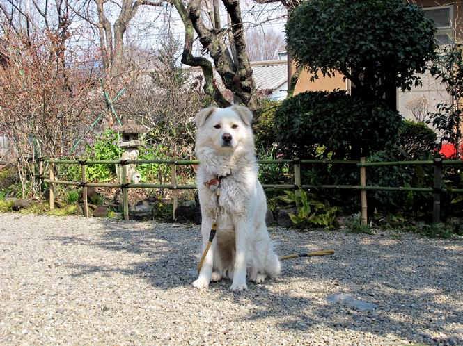 | 平成二十三年三月三十一日 Before 写真集目次へ Next 門扉の両側の竹垣が傷んでしまい,ぼくが道路に出たら大変と、鬼石の造園屋さんとお父さんが手伝って造りました。もう少しで完成する時に、大地震がきました。ぼくは玄関でとっさに駆け上がり、お母さんに抱きかかえてもらってました。お父さんは、この桜の木の奥で屋根を見上げていたそうです。そんなわけで造園屋さんに、早く帰ってもらって、残りはお父さんとお母さんで仕上げたってわけ。 ついでに門扉のスキマにネットを張りました、「これで完璧かな」、って言ってました。 目立たないように茶色のネットです。 門扉を開けると一緒にたたまれます。 この後はガラクタ置き場になってましたが、竹垣を延長しました。ツバキの陰にトビラがあります。 ここはお花が植わっているところです。ぼくが入らないように、残材を利用してお父さんが組んで、お母さんが縄掛けをしました。 これで安心、思い切り走ったり、寝そべったり、できるぞ。 こんな格好で、門扉の近くで番犬をしています。 Before 写真集目次へ Next |