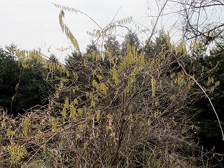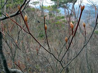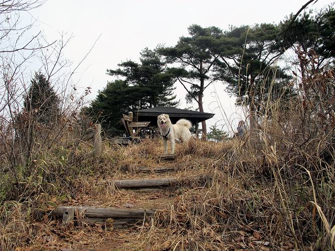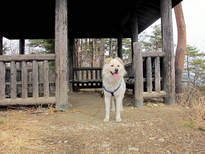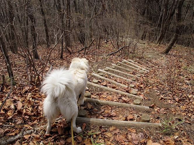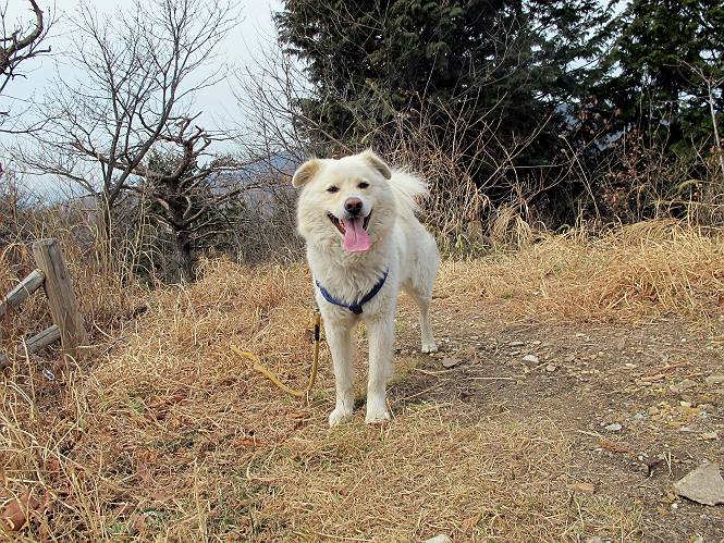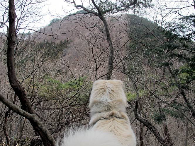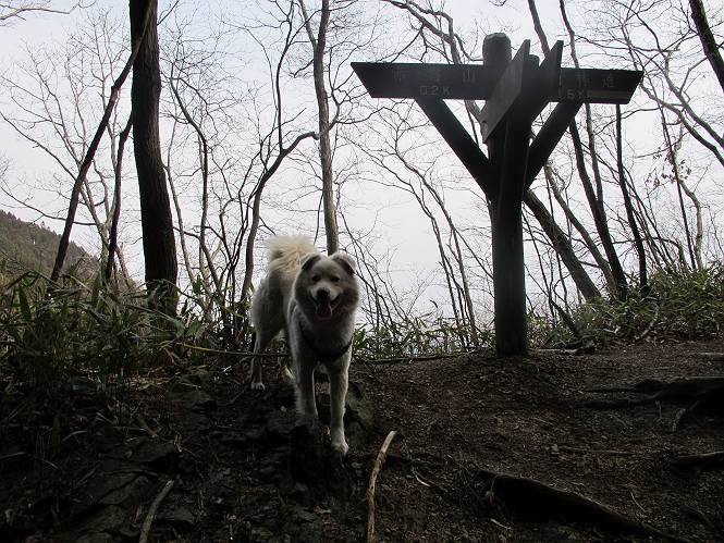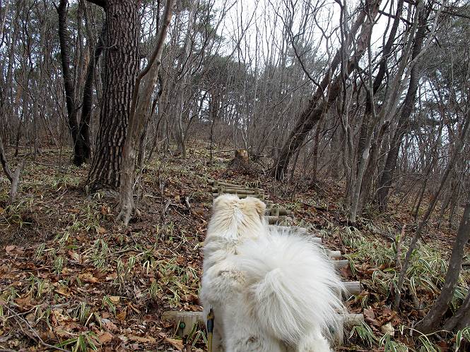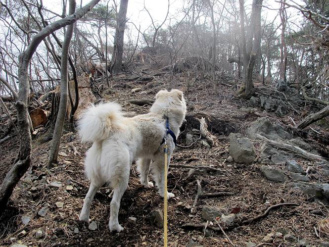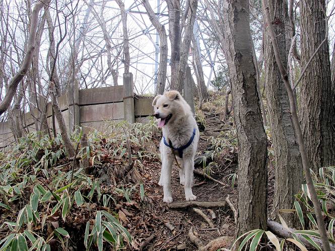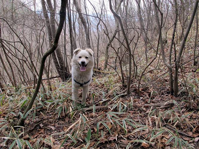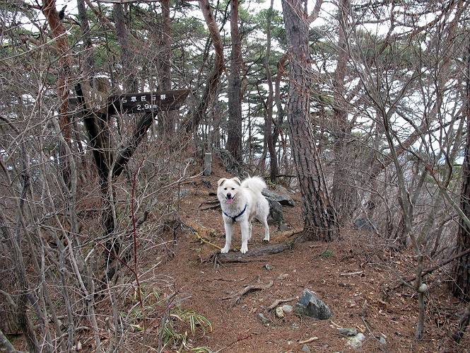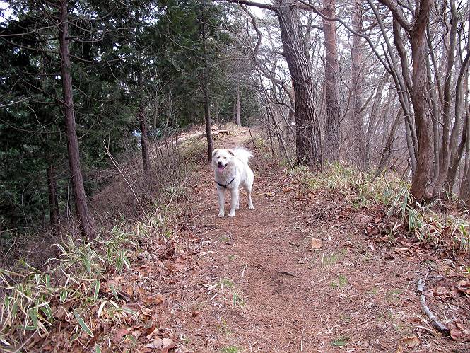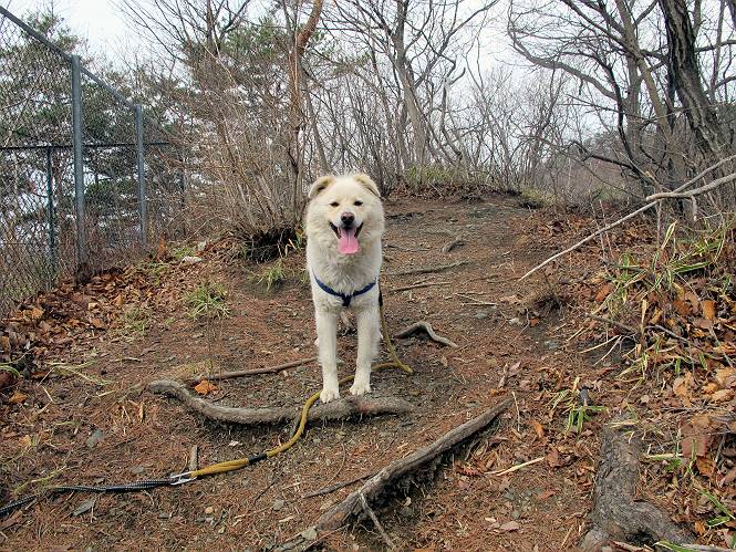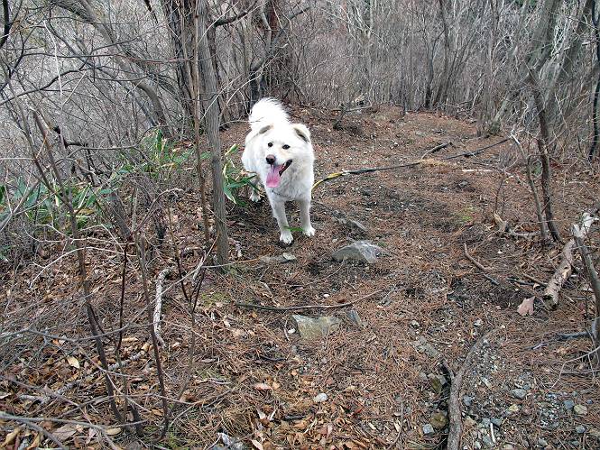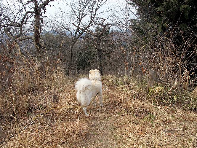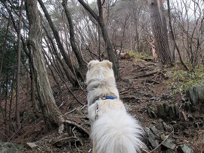| 平成二十三年四月二日 Before 写真集目次へ Next お父さんが赤雪山へヤシオツツジの下見に出かけるので、一緒に連れてってもらいました。長石林道というクニャクニャした坂道を走り、足利市と佐野市の境から歩きました。 急な丸太の階段を一気に上るとあとは緩やかなアップダウンの道でした。 最初のピークを越え、下ると大きな電力鉄塔の下に出ました、後が鉄塔です。 次のピークが見えてきました。 ダンコウバイが点々と咲いてました。 キブシが沢山咲いてました。 アカヤシオツツジが出てきました、先のあかくなった蕾がありましたが、ほとんど茶色をしてました。 お父さんが雑木林でアカヤシオを探しています。 この辺は最近枯れた松の木を伐採したようです、登山道脇に転がってました。 アカヤシオの開花は1週間ほど先ではないか、と言ってます。 反射板のある小ピークに着きました。 長い木段がまた出てきました。 もう少しで小さいピークに着きます。 ここで登山道が左に曲ってます、この辺にもアカヤシオはありましたが、咲いてません。 下って、松田湖の東の駐車場から来る道の合流点に出ました。山頂へ最後の上りにかかります。 赤雪山山頂に着きました。 キブシは咲いてましたが、まだほとんど草木は寝ているそうです。 こちらに下ると松田川ダムの西側に出ます。 今日はここで少し休んで、来た道を戻ります。 もう、枯れた松の伐採の所に来ました。 丸太の階段を下って、アップダウンを2,3回繰り返して、車に戻りました。峠にMTBでやってきたおじさんがいて、ぼくの写真を撮ってました、お父さんとちがって、恥ずかしかったなあ、ワン。 Before 写真集目次へ Next |