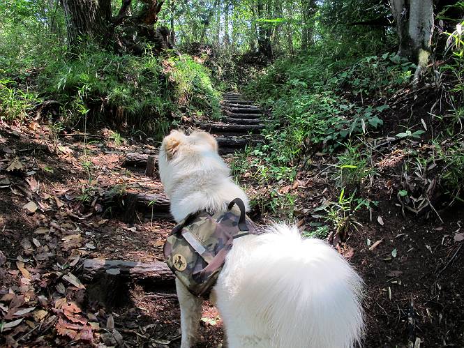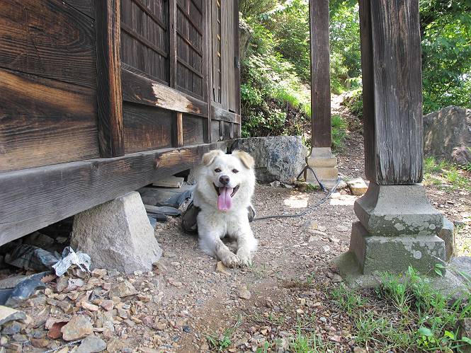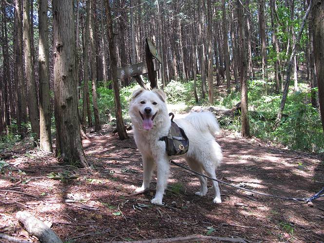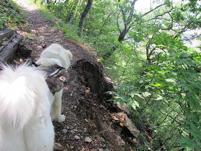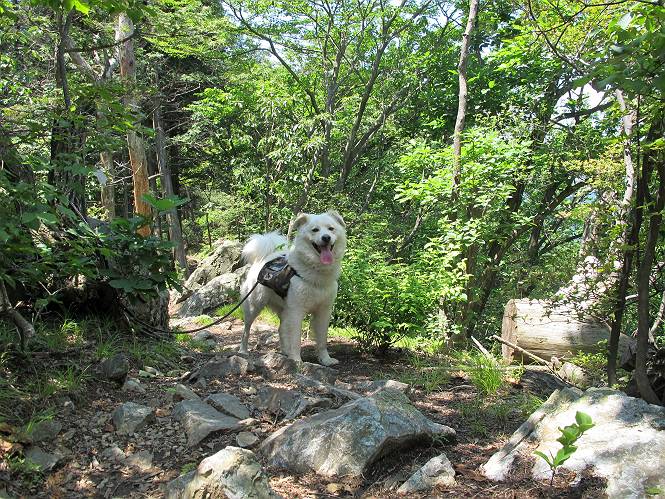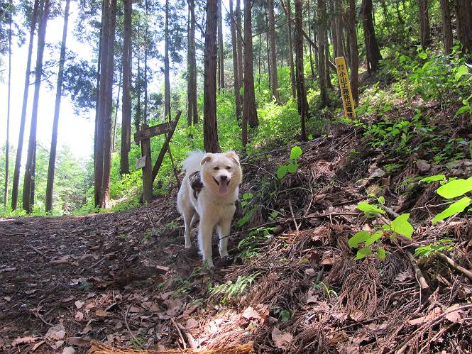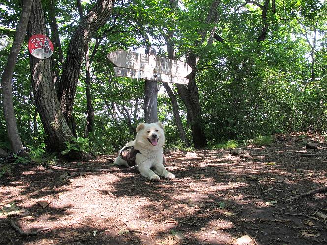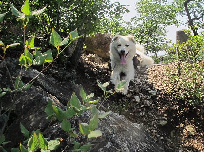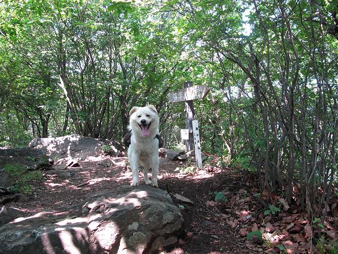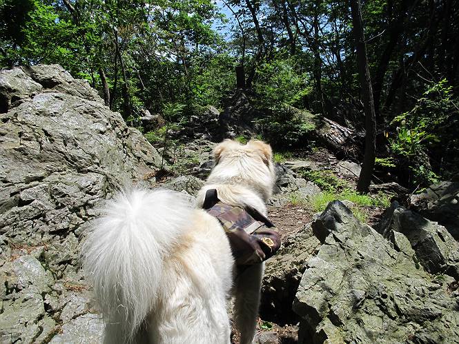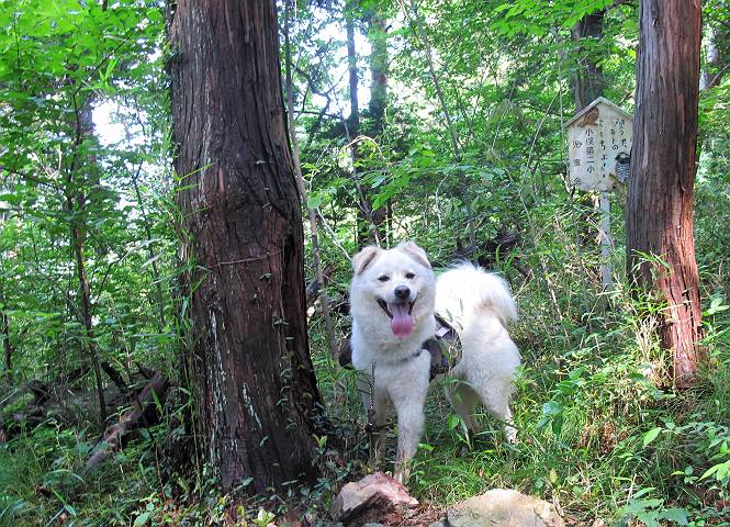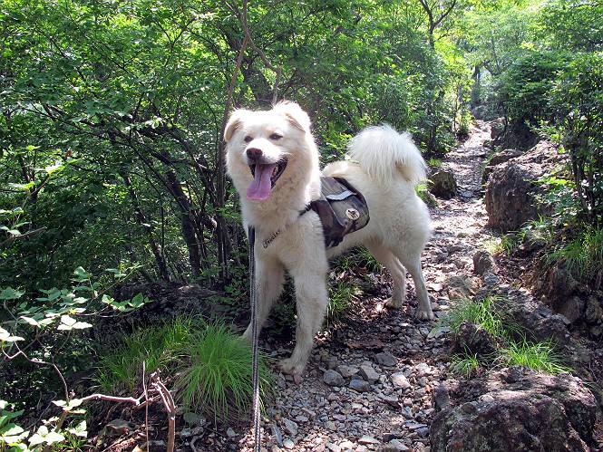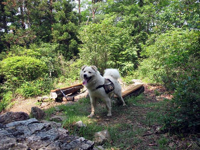 | 平成二十三年六月六日 Before 写真集目次へ Next 昨日の晩は雷雨で怖くて、物置に移動してもらって、階段の隅で止むのをじっと待ってました。今朝は久々の青空、お父さんも退屈してか、「忠治、山へ行くか」、「連れてって、ワン、ワン、ワン、♪♪♪」、と決まり。お母さんに送り迎えしてもらって、足利市小俣町の叶花不動尊から入って、石尊山、深高山と歩いて、猪子トンネルの東側の駐車場に出ることになりました。 叶花不動尊から杉森の間の道を進みました。 登山者用に沢から水が引いてあります。ぼくもお水を頂きました、冷たくておいしかったです。 その脇の沢で一遊び、何かいるかと思ったのですが、何もいませんでした。 しばらく急坂が続いて“女人禁制”の石碑に出ました。 立派な石碑でしょう。 今度は丸太の階段を上ります。 ちょっと開けたベンチのある休憩所に出ました。 ここから先は楽しい岩場が連続します。 ここは釈迦岩展望と書かれています。南側の尖った岩が見える場所です。 また、真下の大きな採石場を介して南の湯殿山が良く見えてます。 ちょっとお休みしてます。 少し上って展望のきく岩の上に出ました。今日は、赤城山は雲で見えません。 姥穴山方面と桐生の街です。 こちらが赤城山方面です。 また、木陰で一休みしてます。お水を飲みました。 奥の院に着きました。ここは風が抜けて涼しいです。 奥の院の先は登山道が崩落してました。地震で崩れたのでしょうか。 奥の院の裏の広場に出ました 。モグラの穴を掘り返してます。 「なんだ、忠治、その顔」、「アハハハハ」 広場から少し進むと石尊山の山頂に出ました。木々に覆われて周りは見えませんでした。 緩いアップダウンの木漏れ日の道がずっと続きます。静かな山です。 アヤメが1ヶ所で咲いてました。 深高山に着きました。ここの山頂も、今の時期は周りが見えません。 オヤツを頂いてます。 休憩中です、山の上の木陰は気持良いですね。 そろそろ出発だそうです。 岩のゴツゴツした道を通ります。 小さなアップダウンの道があり、 急坂や階段もあり、面白いコースです。 粟谷町の分岐点まで下りました。 林道に沿って下り猪子峠に出ました。 コアジサイが咲いてました。 ここから右に曲って少し進み、 階段を下ると林道に出て、間もなく猪子トンネルに出ます。 お母さんが迎えに来てました。静かな石尊山、深高山の尾根歩きでした、ワン。 Before 写真集目次へ Next |