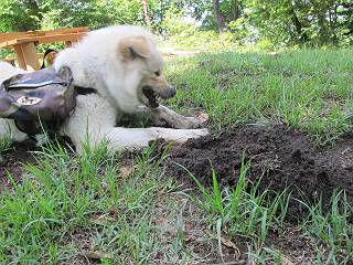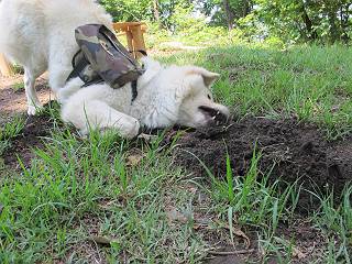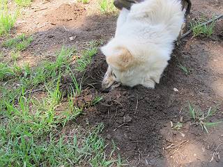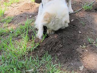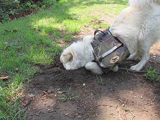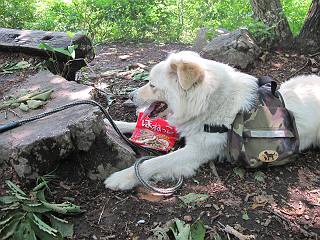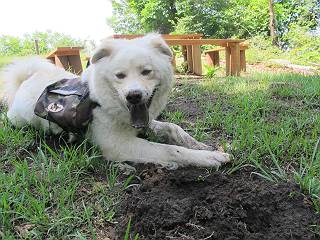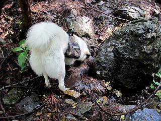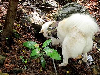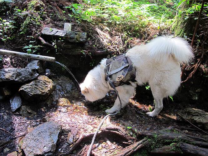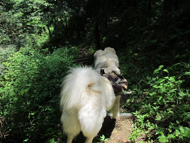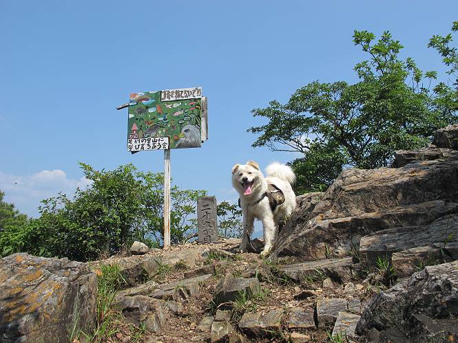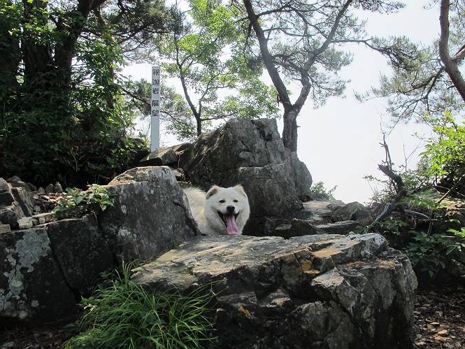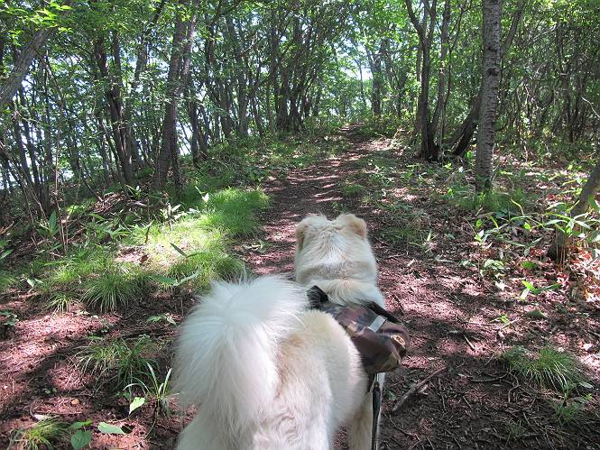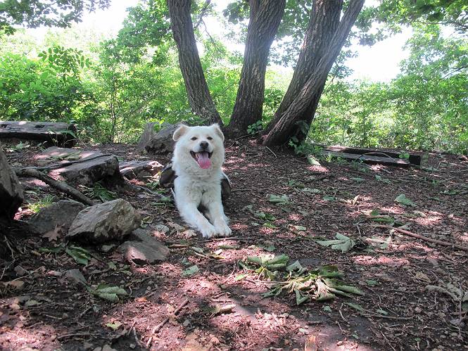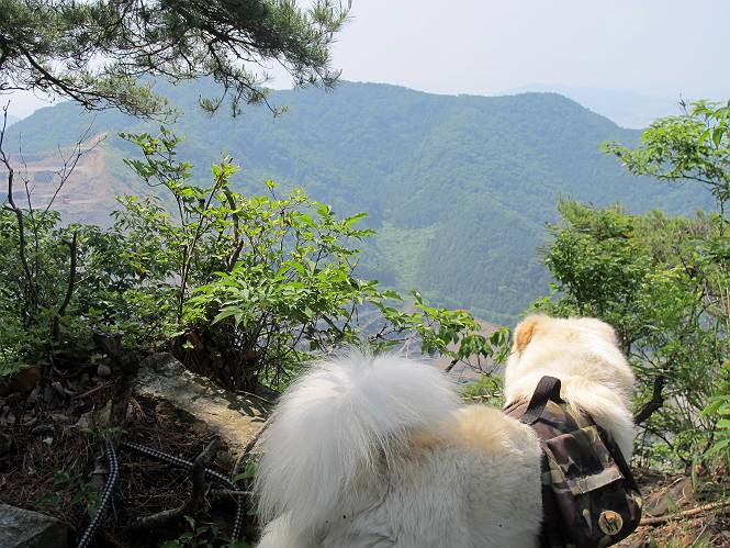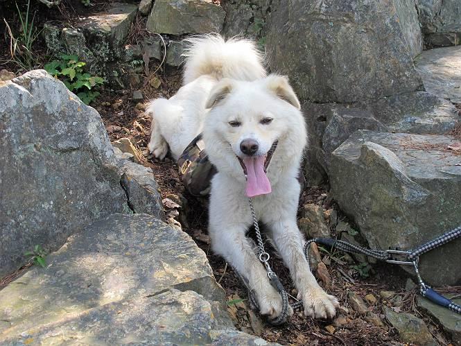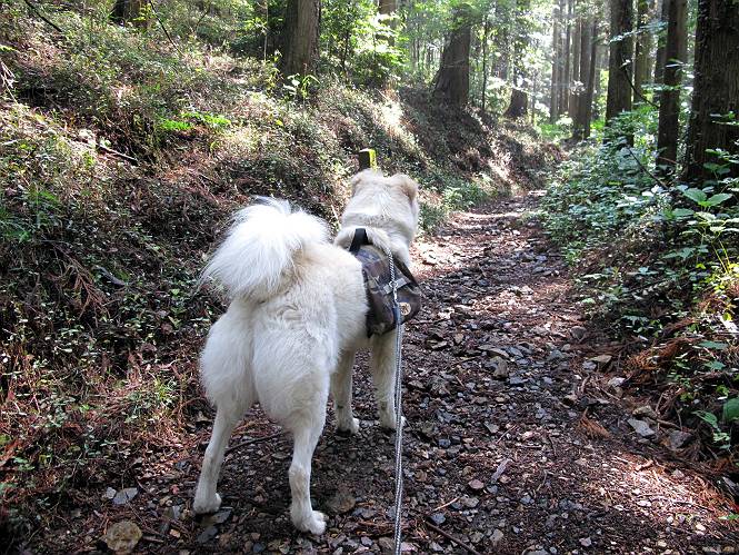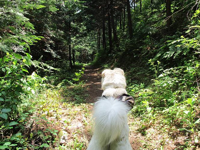 | 平成二十三年六月六日 Before 写真集目次へ Next 昨日の晩は雷雨で怖くて、物置に移動してもらって、階段の隅で止むのをじっと待ってました。今朝は久々の青空、お父さんも退屈してか、「忠治、山へ行くか」、「連れてって、ワン、ワン、ワン、♪♪♪」、と決まり。お母さんに送り迎えしてもらって、足利市小俣町の叶花不動尊から入って、石尊山、深高山と歩いて、猪子トンネルの東側の駐車場に出ることになりました。 叶花不動尊から杉森の間の道を進みました。 登山者用に沢から水が引いてあります。ぼくもお水を頂きました、冷たくておいしかったです。 その脇の沢で一遊び、何かいるかと思ったのですが、何もいませんでした。 しばらく急坂が続いて“女人禁制”の石碑に出ました。 立派な石碑でしょう。 今度は丸太の階段を上ります。 ちょっと開けたベンチのある休憩所に出ました。 ここから先は楽しい岩場が連続します。 ここは釈迦岩展望と書かれています。南側の尖った岩が見える場所です。 また、真下の大きな採石場を介して南の湯殿山が良く見えてます。 ちょっとお休みしてます。 少し上って展望のきく岩の上に出ました。今日は、赤城山は雲で見えません。 姥穴山方面と桐生の街です。 こちらが赤城山方面です。 また、木陰で一休みしてます。お水を飲みました。 奥の院に着きました。ここは風が抜けて涼しいです。 奥の院の先は登山道が崩落してました。地震で崩れたのでしょうか。 奥の院の裏の広場に出ました 。モグラの穴を掘り返してます。 「なんだ、忠治、その顔」、「アハハハハ」 広場から少し進むと石尊山の山頂に出ました。木々に覆われて周りは見えませんでした。 緩いアップダウンの木漏れ日の道がずっと続きます。静かな山です。 アヤメが1ヶ所で咲いてました。 深高山に着きました。ここの山頂も、今の時期は周りが見えません。 オヤツを頂いてます。 休憩中です、山の上の木陰は気持良いですね。 そろそろ出発だそうです。 岩のゴツゴツした道を通ります。 小さなアップダウンの道があり、 急坂や階段もあり、面白いコースです。 粟谷町の分岐点まで下りました。 林道に沿って下り猪子峠に出ました。 コアジサイが咲いてました。 ここから右に曲って少し進み、 階段を下ると林道に出て、間もなく猪子トンネルに出ます。 お母さんが迎えに来てました。静かな石尊山、深高山の尾根歩きでした、ワン。 Before 写真集目次へ Next |