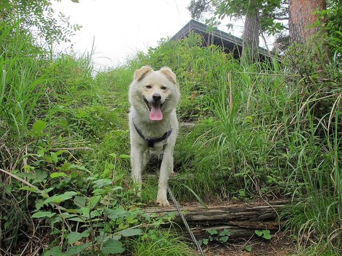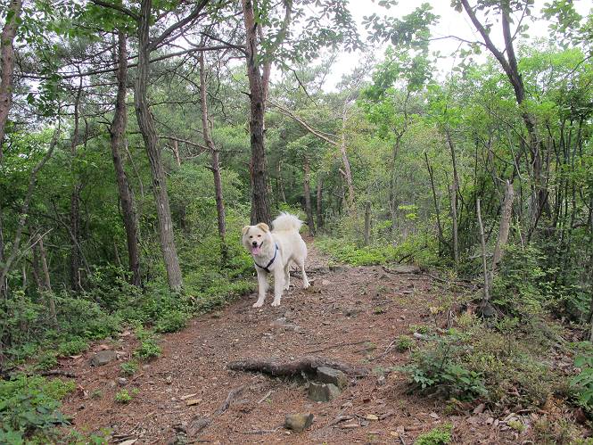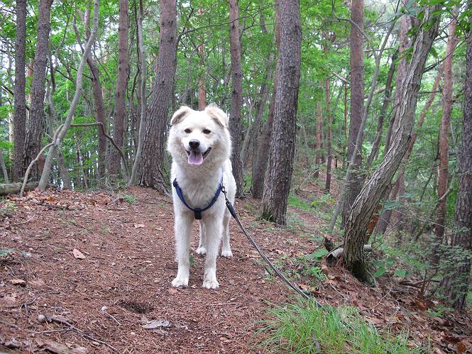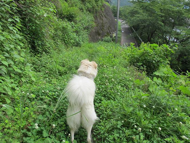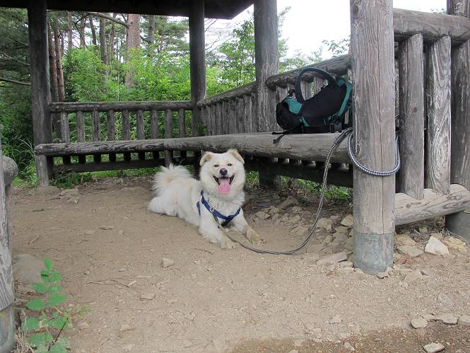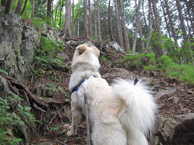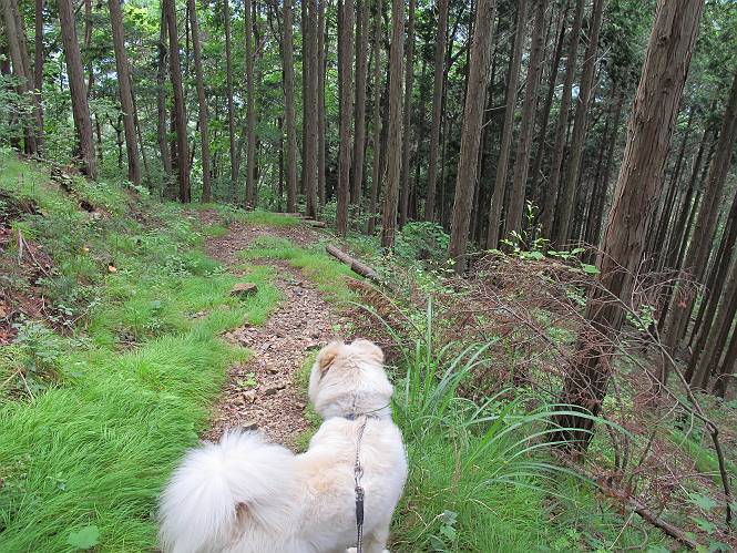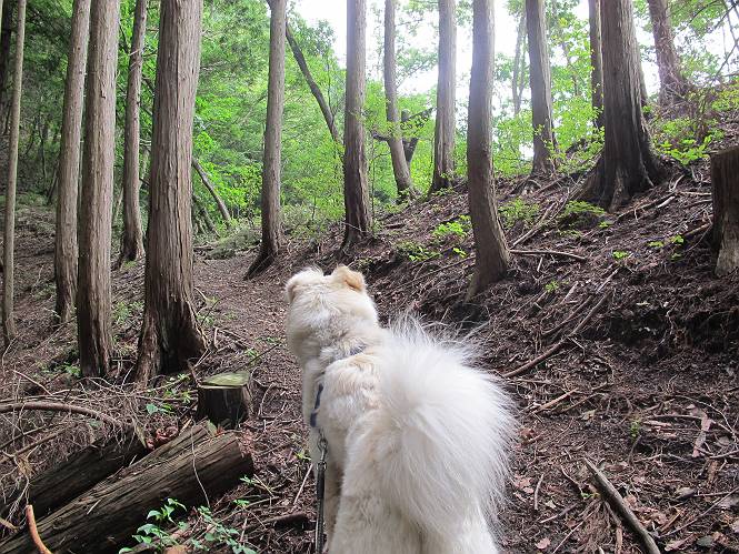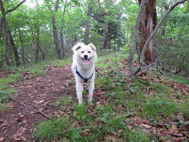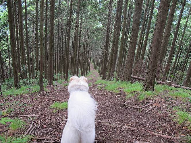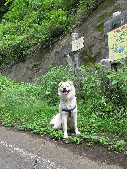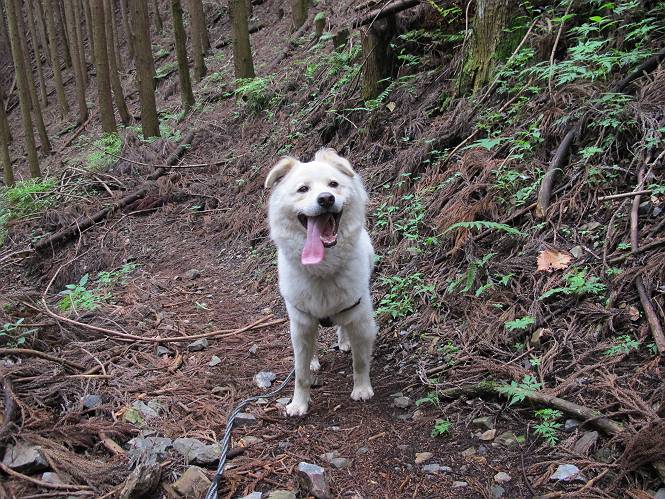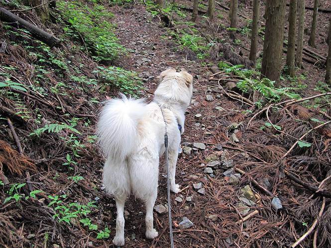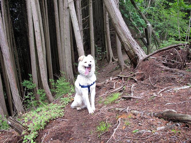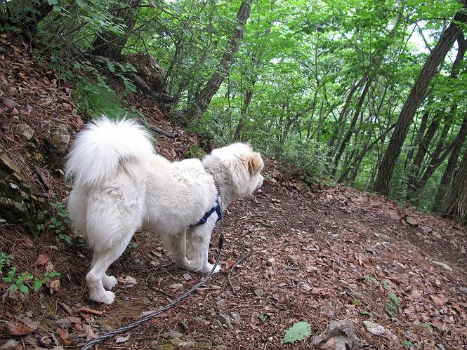 | 平成二十三年六月十五日 Before 写真集目次へ Next 今日は曇っていて涼しいので、いつも行く赤雪山へ連れてってもらいました。松田川ダムの奥の駐車場から一回りします。駐車場から小さな沢沿いを遊びながら歩いて杉森の中の道に入りました。結構な急坂で、尾根に出るまで250mほど上るそうです。 沢で水遊びをしてたら、「もう、上って来な」、って引っ張られてしまいました。ダニスプレーをかけてもらいましたが、ちょっとで終わってしまいました。またいっぱいついてしまうかな。 ジグザグして上ってます、息が荒くなって汽車みたいだな、って言われます。ぼくはこうして熱をだしているんだもんね。 道標が見えました、尾根に出ます。 お水を飲んで、ちょっと休んでます。 尾根に出てしまえば、桧の森を80mほど上って山頂です。 コアジサイとアヤメが1本咲いてました。 もう後が山頂です。 山頂には道標とベンチが2つあって、休憩できる東屋があります。すっかり草が茂ってしまいましたね。 ステキな東屋でしょう。ここから北へ行けば松田川ダムの上の方をぐるっと回って足利で一番高い山、仙人ケ岳へ出るそうです。ぼくはまだこの道を歩いてないんです。 お水とオヤツをもらってお休み中です。今日はここから真っ直ぐ南に下って松田川ダムに降りて駐車場に戻ります。 はじめはゆるい坂道を下がって、また上がり、といくつか繰り返します。秋から春にかけては、広葉樹の道、気持ちの良い尾根歩きができます。 赤松の林もありましたね。 この辺から急坂がいくつかあります、粘土質なので、今の時期は滑りやすいですよ。 ここもちょっとしたピークのようです、周りは雑木林ですね。 桧の林に入ります、ここからずっと急坂になります。でもジグザグ下りますからね。 ここ、真っ直ぐで長い急坂です。その先はまたジグザグです。 桧林を抜けてダムと道が見えました。 ここが南からの登山口です。あとはダムに沿った道を歩き、ちょっと登れば駐車場に出ます。 駐車場に戻ると、草刈機がうなってました。「イノシシが沢山いるから危ないよ」、って言ってました。見通しの利くように刈り込んでいるのでしょうか。おじさんが手を休めて、ちょっとだけ遊んでくれました、うれしいね。 Before 写真集目次へ Next |