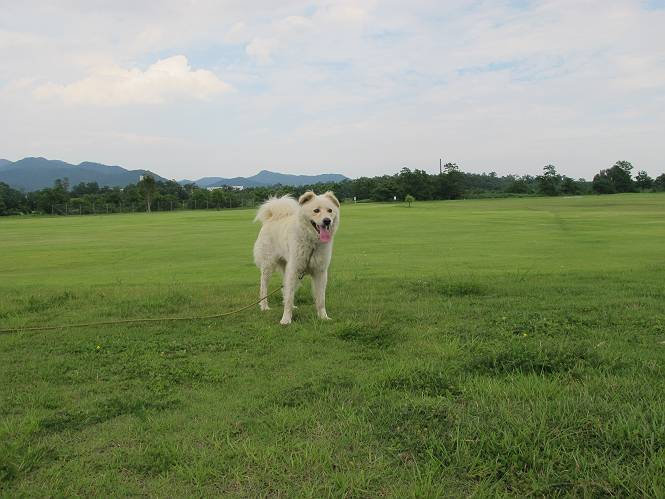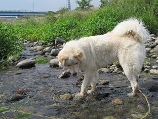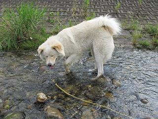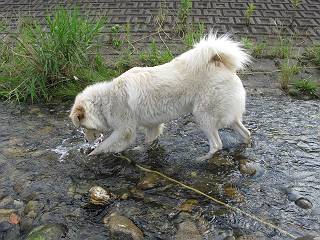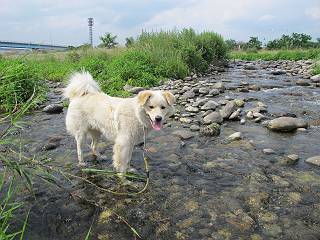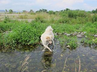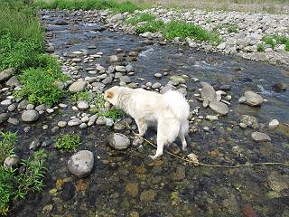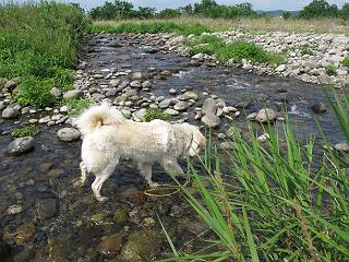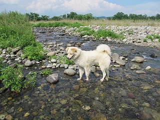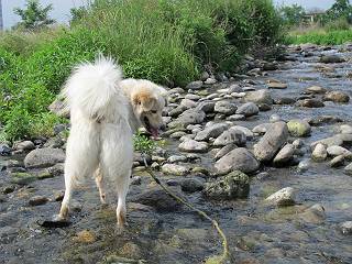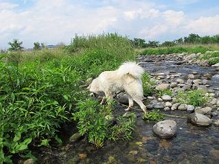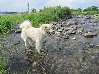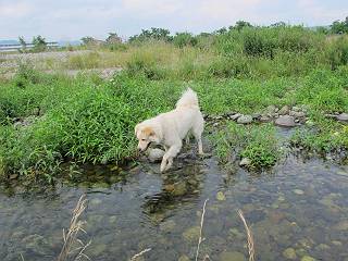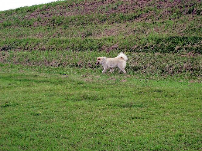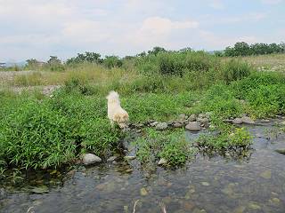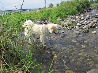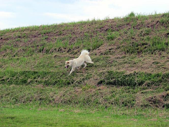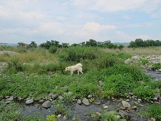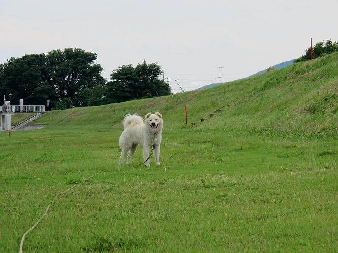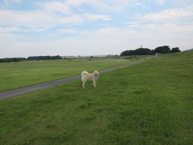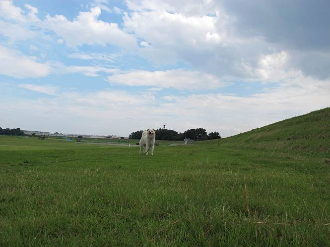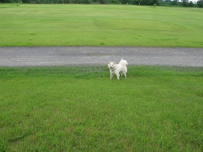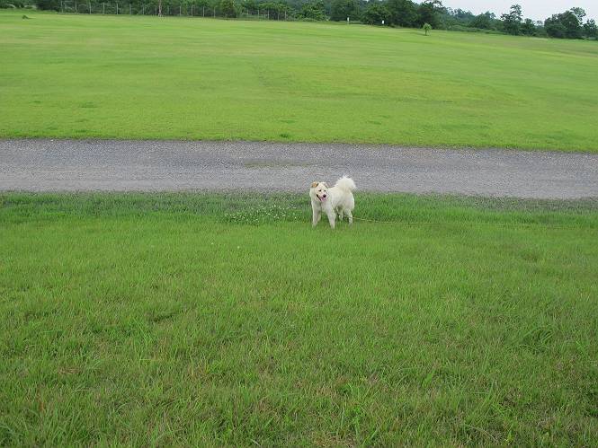 | 平成二十三年六月二十三日 Before 写真集目次へ Next 午後になって暑いので玄関で横になっていますと、お父さんが「渡良瀬川へ遊びに行くか」、て言うんです。「うれしいな、ワン、ワン」 車でいつもの場所へ、長ーいリードに替えてもらって、浅瀬に入りました。お父さんはコンクリートの護岸からぼくを撮ってました。(手のマークはクリックすると顔が大きくなるよ) ぼくのひとり遊び@ ぼくのひとり遊びA ぼくのひとり遊びB ぼくのひとり遊びC ぼくのひとり遊びD ぼくのひとり遊びE おお、水が冷たくて気持ちよかったでーす。グラウンドを横切って土手の最上段に上りました。だけど、「道の舗装が熱くなっているから降りて来い」、と言ってます。 走れ、走れ、草刈したばっかりで早く走ると足に引っかかります。 ここが土手の中段、ここは歩く人だけですから安全です。 いつもの水門まで行きます。渡良瀬川はこの辺で大きくカーブしているんですよ。 「お父さん、早くウウ」、何してるのかな 「ネジバナを撮ってたのさ」、「ぼくんちにも咲いてるね」 「下に行っていい」、「向こうの芝生に入るなよ」 ここを歩くのははじめてです。 今日は芝生に誰もいません、また上に戻ります。。 もう少しで水門です。黒い雲が出てきましたね、嫌だなあ。 水門にやってきました。いつもですと上を歩いてここから下に降りて戻るのですが、今日はこの中段を戻ります。 Before 写真集目次へ Next |