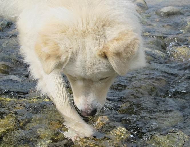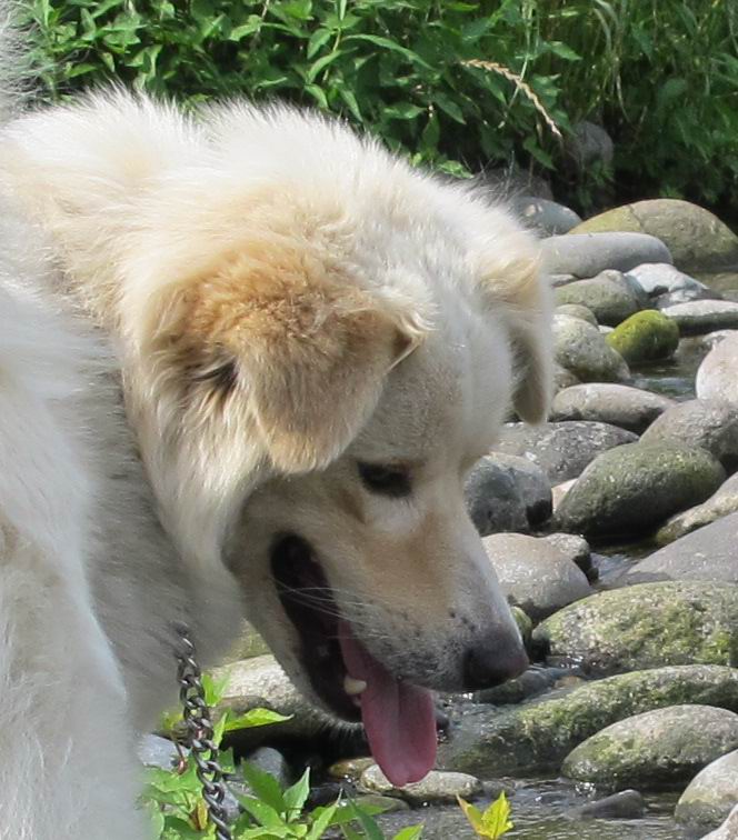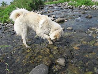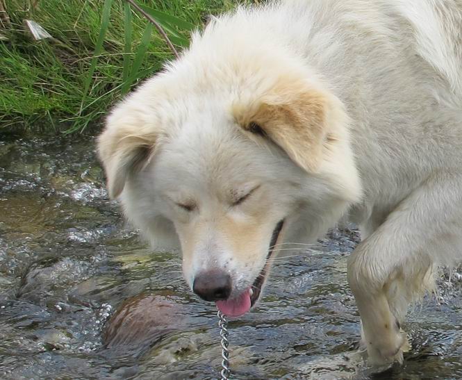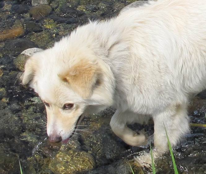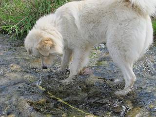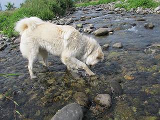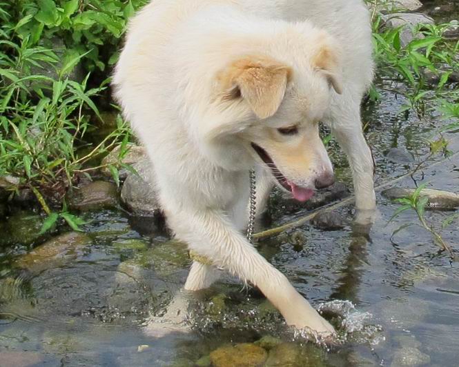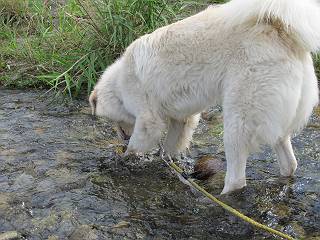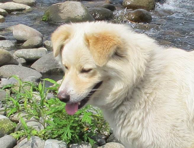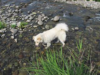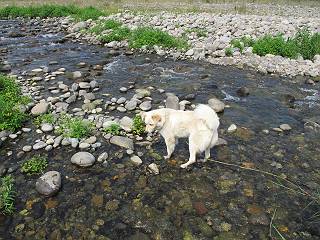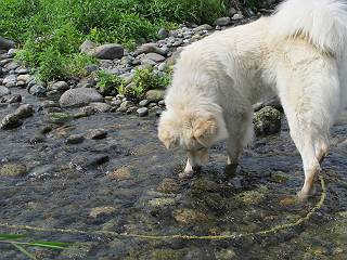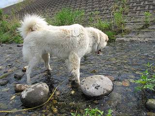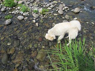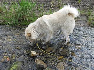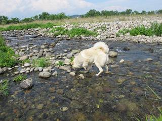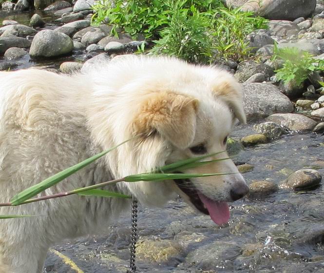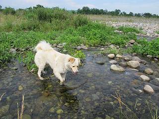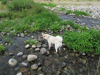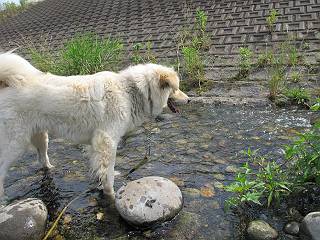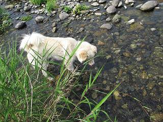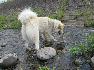 | 平成二十三年六月二十三日 Before 写真集目次へ Next 午後になって暑いので玄関で横になっていますと、お父さんが「渡良瀬川へ遊びに行くか」、て言うんです。「うれしいな、ワン、ワン」 車でいつもの場所へ、長ーいリードに替えてもらって、浅瀬に入りました。お父さんはコンクリートの護岸からぼくを撮ってました。(手のマークはクリックすると顔が大きくなるよ) ぼくのひとり遊び@ ぼくのひとり遊びA ぼくのひとり遊びB ぼくのひとり遊びC ぼくのひとり遊びD ぼくのひとり遊びE おお、水が冷たくて気持ちよかったでーす。グラウンドを横切って土手の最上段に上りました。だけど、「道の舗装が熱くなっているから降りて来い」、と言ってます。 走れ、走れ、草刈したばっかりで早く走ると足に引っかかります。 ここが土手の中段、ここは歩く人だけですから安全です。 いつもの水門まで行きます。渡良瀬川はこの辺で大きくカーブしているんですよ。 「お父さん、早くウウ」、何してるのかな 「ネジバナを撮ってたのさ」、「ぼくんちにも咲いてるね」 「下に行っていい」、「向こうの芝生に入るなよ」 ここを歩くのははじめてです。 今日は芝生に誰もいません、また上に戻ります。。 もう少しで水門です。黒い雲が出てきましたね、嫌だなあ。 水門にやってきました。いつもですと上を歩いてここから下に降りて戻るのですが、今日はこの中段を戻ります。 Before 写真集目次へ Next |