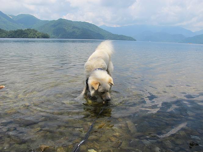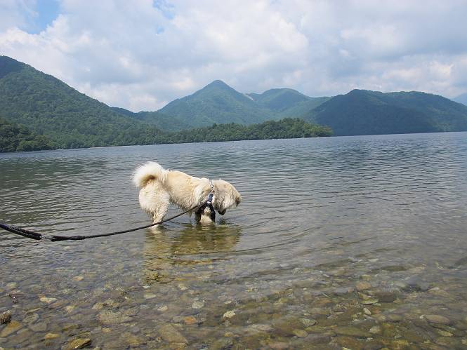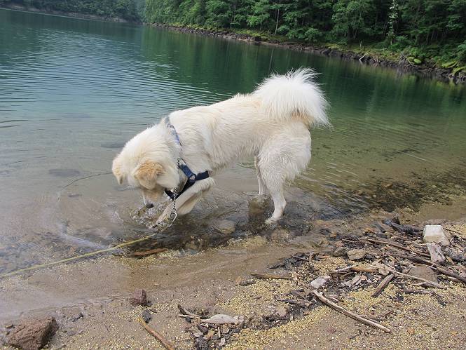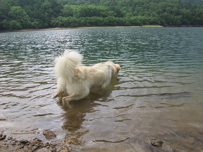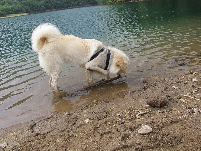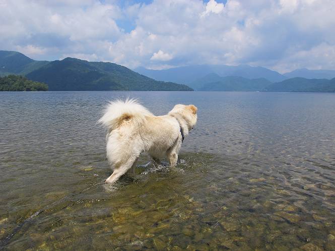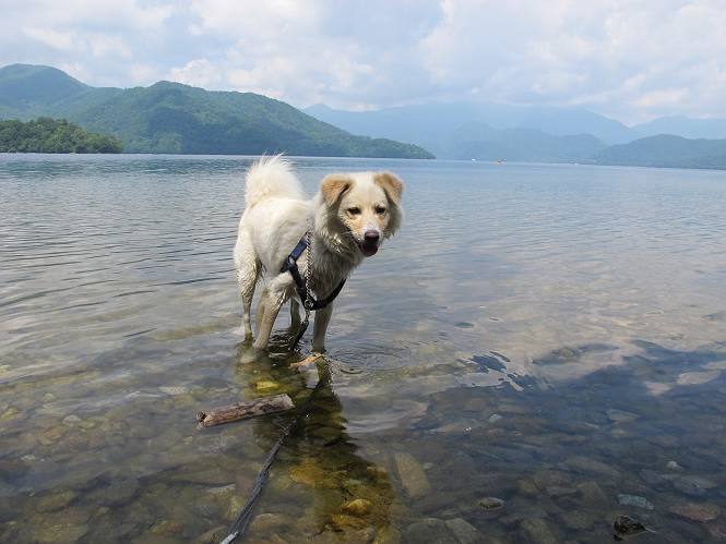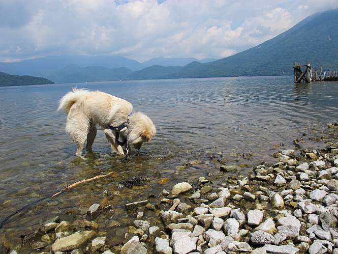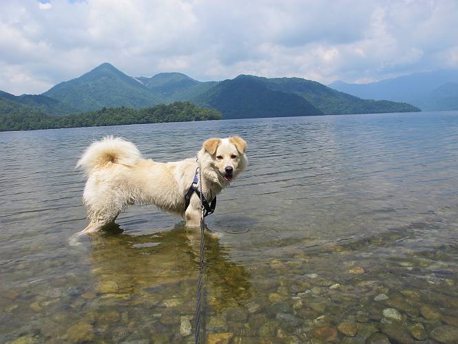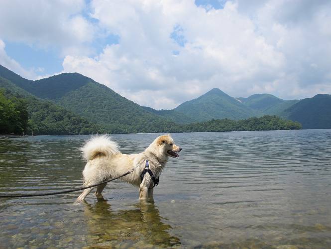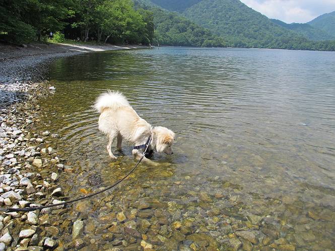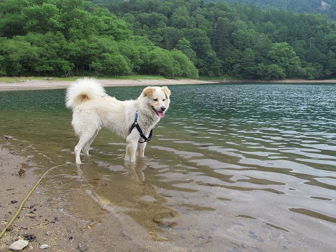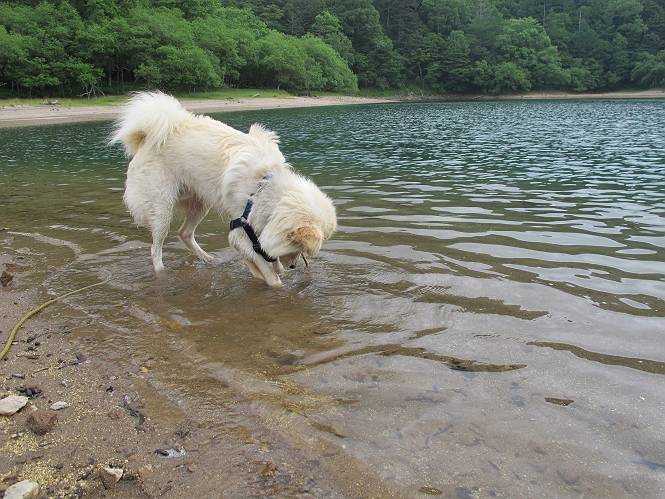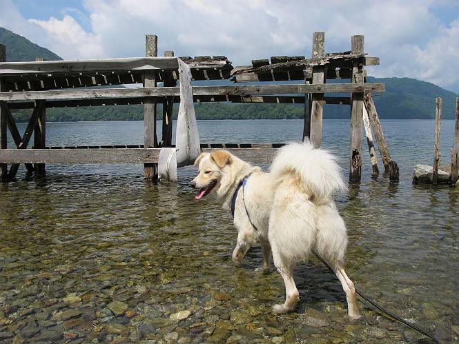 | 平成二十三年七月十四日 Before 写真集目次へ Next 猛暑が続いてますね。寝そべってばかりいるものですから、今日は奥日光へ連れてってもらいました。中禅寺湖南東の歌ケ浜から荒砥の静かな浜までブラブラして、金精道路を少し走り、そこから刈込湖まで散策してきました。涼しかったですね、湖のほとりで思い切り遊んで、いっぱいご飯も頂いてしまいました。 【前編】 荒砥の静かな浜にやってきました。 小石を敷き詰めたような感じの浅い浜です。 水が透き通っていてとてもきれいです。 ぼくの顔を近づけると写ってます。 後に見えている尖った山がお父さんの良く来る社山だそうです。 木片を投げてもらって、 くわえて運んだり、 小石を投げてもらって、 見つけて、 くわえて運んだりして遊びました。 長いロープを車に置いてきてしまったので、 近場でしか遊べなかったのですが、冷たく気持ちよかったです。 今度はお山へ移動するそうです。 戻り道、白いお花が沢山咲いてました、ノリウツギというそうです。 【後編】 金精道路を少し走ると湯元から刈込・切込湖に通じる登山道に出ます。 ここから刈込湖まで歩きます。 駐車場から木漏れ日の中をゆったりした道を進みます。 岩の間を通ったり、飛び越えたり、大きな木の根を乗り越えたりしながら徐々に急坂を上ってきました。ここは玉石がきれいに並べられています。ちょっと滑るかな。 小峠に出ました、お休み所になってます。ここで少しお休みです。 ここからもう少し上って、 コメツガの深い森の中、木の階段をいくつも下ります。 下りだからラクチンです。 この階段はちょっと長いですね。 道標が出てきました、真っ直ぐ行くと光徳へ、左に下りると刈込湖です。 刈込湖に着きました、リードを変えてもらって湖に入りました。 ここもきれいですね。 ここは砂浜でちょっと先は急に深くなります。 木片が打ち寄せられて溜まってます。 水が冷たくておいしいですよ。 お父さんにまた木片を投げてもらいましたが、深そうだな、行けるかな。 あっ、届きそうだ。 ヨイショ、ヨイショ エイッ、なかなか引っ張れないなあ。 やっと、ここまで引っ張ってこられた。 次はこの棒だ、沈んでしまっている。 口を水の中に入れてくわえたよ。 また沈んじゃってる、大きいしなあ??? お父さんがザックから出して食べ始めました、「ぼくもお腹がすいたよ、食べたいな」 ぼくの夕食をそっくり、持ってきてくれてました。たっぷり運動したし、さわやかな湖のほとり、ご飯もおいしいなあ。きれいに食べてしまいました。 食事の後は、ぼくの得意技です、ここが何だか匂うなあ。 両足を使って、掘って、掘って、かき出して。 おお、大きい木片が出たぞ、 もっと深く掘ろう、水っぽくなってきたな。 向きを変えて、それっ。 イヤー、掘ったね。「もう、良し、そろそろ戻ろう」 おじさんとおばさんが光徳の方へ行きました。ぼくとお父さんは右に曲って来た道を戻りました。途中で左後足から血が出ているのにお父さんが気づき、小峠でみてもらいました。爪の周りを少し傷つけたようでもう血が止まっていると言ってました。 途中で沢山の子供に会いました。 ぼくは、よけていると頭をなでて、「カワイイ」、なんて言ってました。「がんばってね、ワン」 帰り道、日足トンネルを出ると豪雨、街中を抜けた所で車を停め、顔についたダニをとってもらっていたら、今度は大きな雷鳴、びっくりして助手席まで逃げました。 お家に帰ってキズあとを良く洗って消毒してもらいましたが、大したことなかったようです。 Before 写真集目次へ Next |
