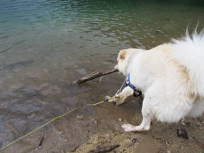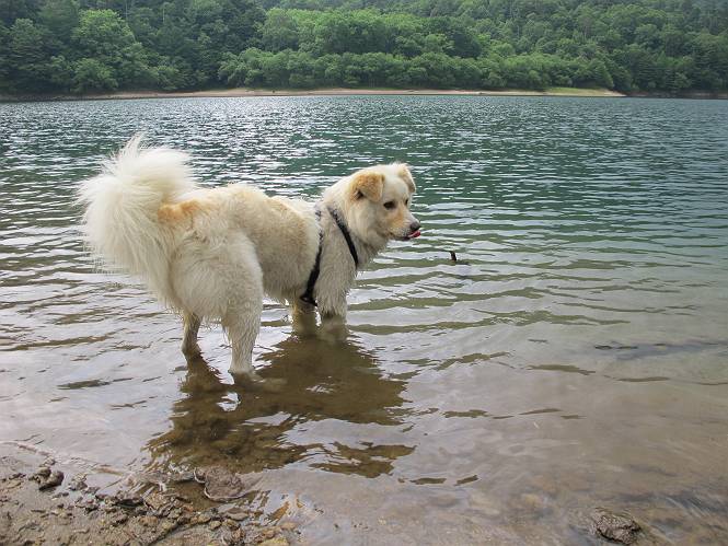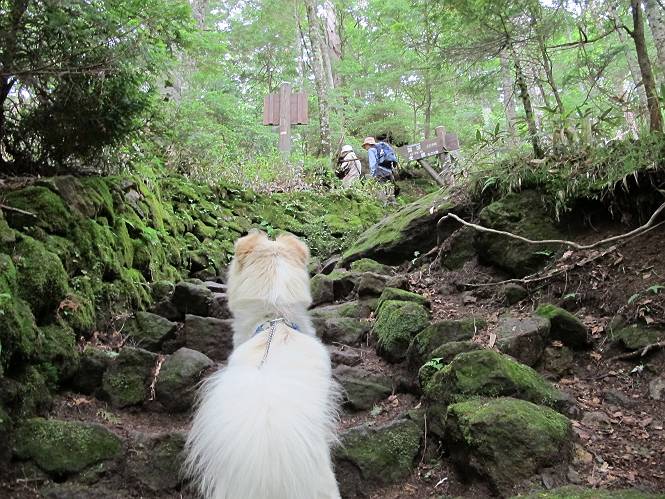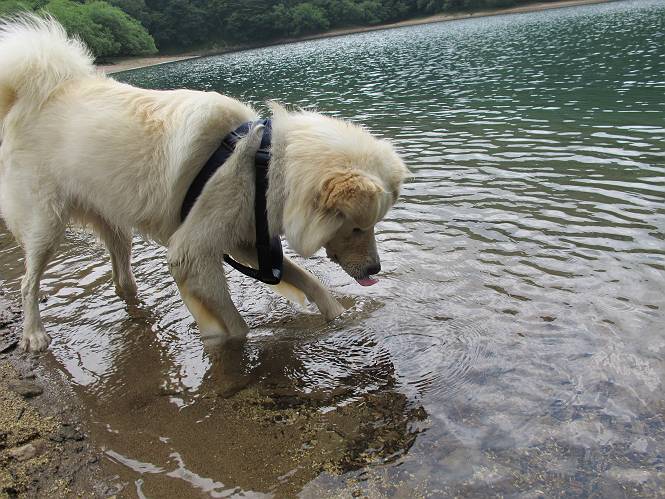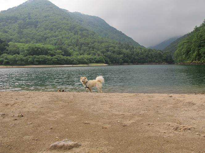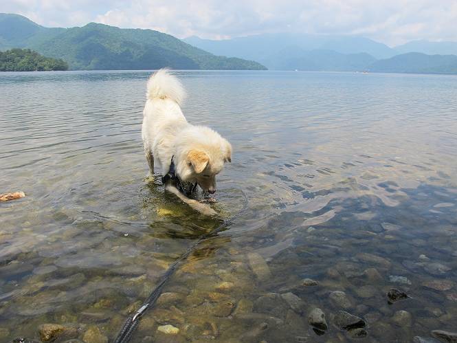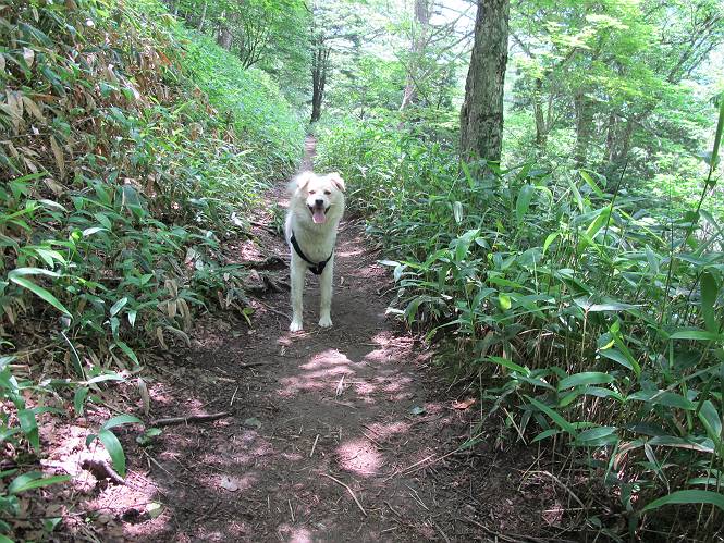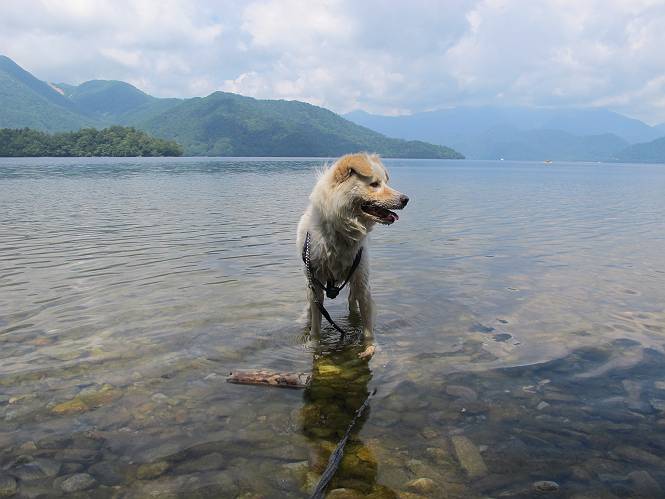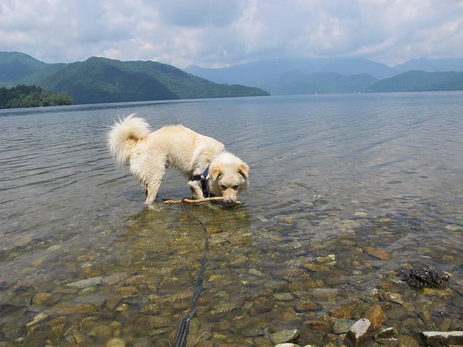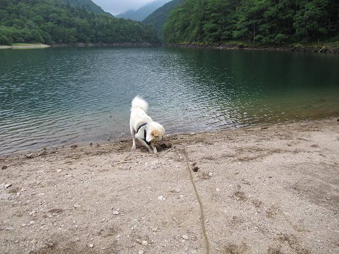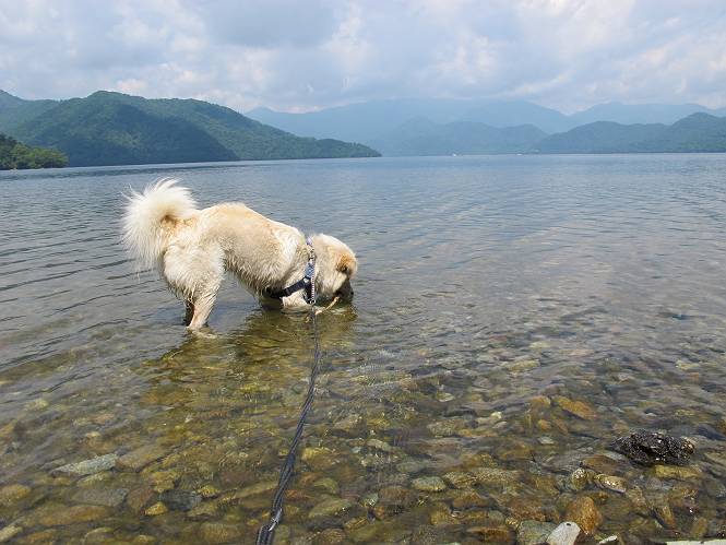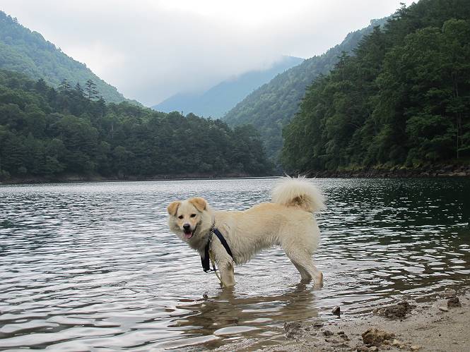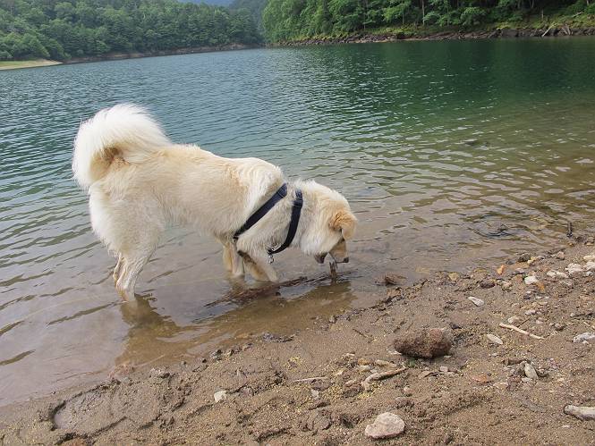 | 平成二十三年七月十四日 Before 写真集目次へ Next 猛暑が続いてますね。寝そべってばかりいるものですから、今日は奥日光へ連れてってもらいました。中禅寺湖南東の歌ケ浜から荒砥の静かな浜までブラブラして、金精道路を少し走り、そこから刈込湖まで散策してきました。涼しかったですね、湖のほとりで思い切り遊んで、いっぱいご飯も頂いてしまいました。 【前編】 荒砥の静かな浜にやってきました。 小石を敷き詰めたような感じの浅い浜です。 水が透き通っていてとてもきれいです。 ぼくの顔を近づけると写ってます。 後に見えている尖った山がお父さんの良く来る社山だそうです。 木片を投げてもらって、 くわえて運んだり、 小石を投げてもらって、 見つけて、 くわえて運んだりして遊びました。 長いロープを車に置いてきてしまったので、 近場でしか遊べなかったのですが、冷たく気持ちよかったです。 今度はお山へ移動するそうです。 戻り道、白いお花が沢山咲いてました、ノリウツギというそうです。 【後編】 金精道路を少し走ると湯元から刈込・切込湖に通じる登山道に出ます。 ここから刈込湖まで歩きます。 駐車場から木漏れ日の中をゆったりした道を進みます。 岩の間を通ったり、飛び越えたり、大きな木の根を乗り越えたりしながら徐々に急坂を上ってきました。ここは玉石がきれいに並べられています。ちょっと滑るかな。 小峠に出ました、お休み所になってます。ここで少しお休みです。 ここからもう少し上って、 コメツガの深い森の中、木の階段をいくつも下ります。 下りだからラクチンです。 この階段はちょっと長いですね。 道標が出てきました、真っ直ぐ行くと光徳へ、左に下りると刈込湖です。 刈込湖に着きました、リードを変えてもらって湖に入りました。 ここもきれいですね。 ここは砂浜でちょっと先は急に深くなります。 木片が打ち寄せられて溜まってます。 水が冷たくておいしいですよ。 お父さんにまた木片を投げてもらいましたが、深そうだな、行けるかな。 あっ、届きそうだ。 ヨイショ、ヨイショ エイッ、なかなか引っ張れないなあ。 やっと、ここまで引っ張ってこられた。 次はこの棒だ、沈んでしまっている。 口を水の中に入れてくわえたよ。 また沈んじゃってる、大きいしなあ??? お父さんがザックから出して食べ始めました、「ぼくもお腹がすいたよ、食べたいな」 ぼくの夕食をそっくり、持ってきてくれてました。たっぷり運動したし、さわやかな湖のほとり、ご飯もおいしいなあ。きれいに食べてしまいました。 食事の後は、ぼくの得意技です、ここが何だか匂うなあ。 両足を使って、掘って、掘って、かき出して。 おお、大きい木片が出たぞ、 もっと深く掘ろう、水っぽくなってきたな。 向きを変えて、それっ。 イヤー、掘ったね。「もう、良し、そろそろ戻ろう」 おじさんとおばさんが光徳の方へ行きました。ぼくとお父さんは右に曲って来た道を戻りました。途中で左後足から血が出ているのにお父さんが気づき、小峠でみてもらいました。爪の周りを少し傷つけたようでもう血が止まっていると言ってました。 途中で沢山の子供に会いました。 ぼくは、よけていると頭をなでて、「カワイイ」、なんて言ってました。「がんばってね、ワン」 帰り道、日足トンネルを出ると豪雨、街中を抜けた所で車を停め、顔についたダニをとってもらっていたら、今度は大きな雷鳴、びっくりして助手席まで逃げました。 お家に帰ってキズあとを良く洗って消毒してもらいましたが、大したことなかったようです。 Before 写真集目次へ Next |