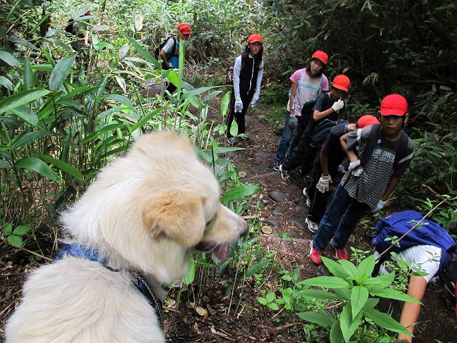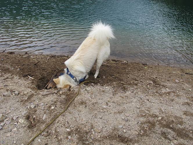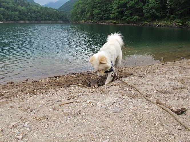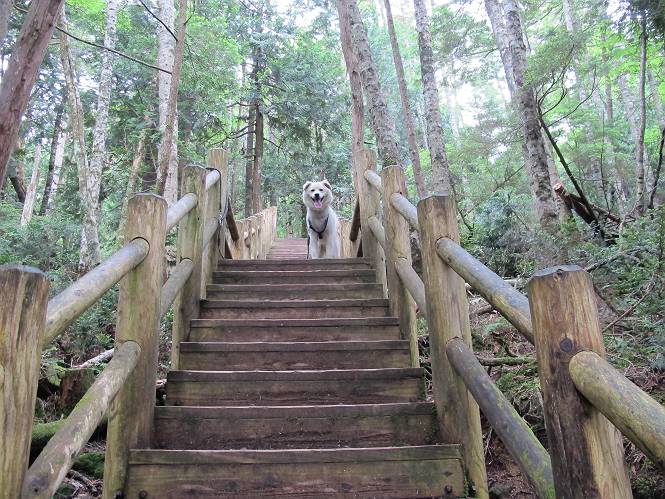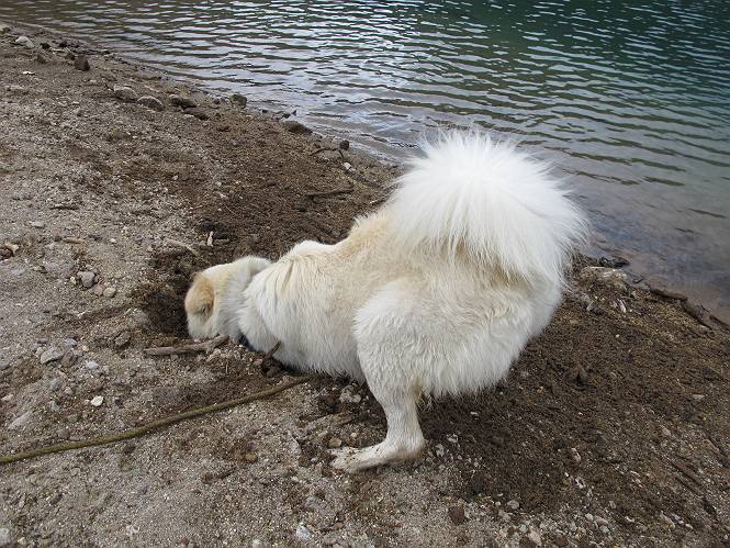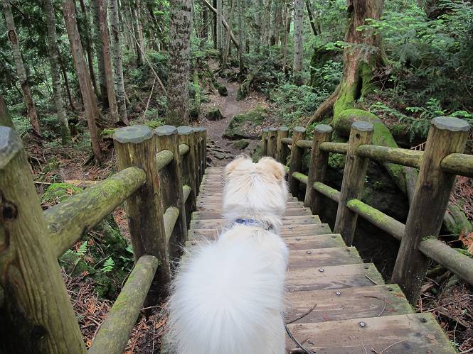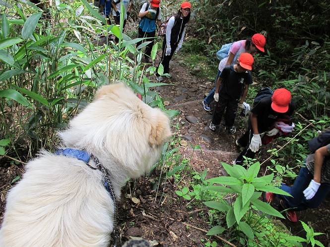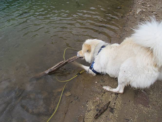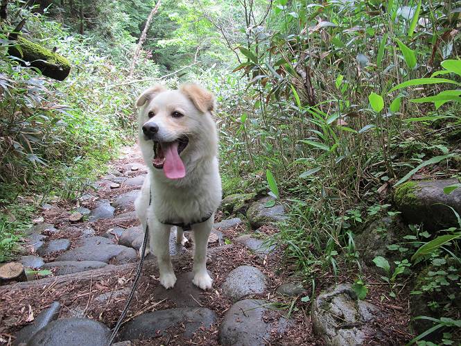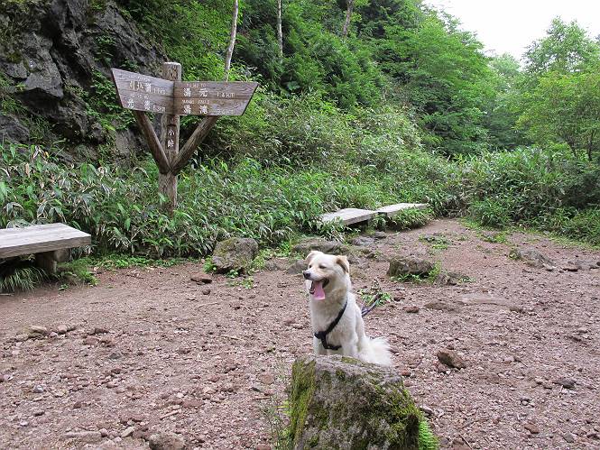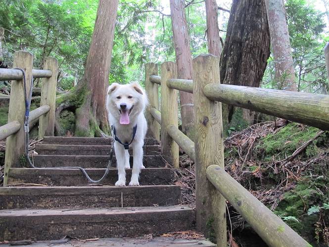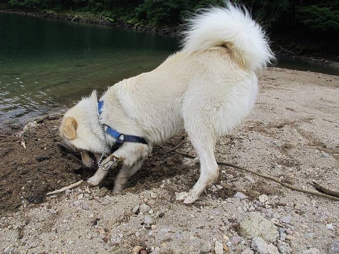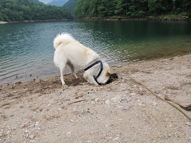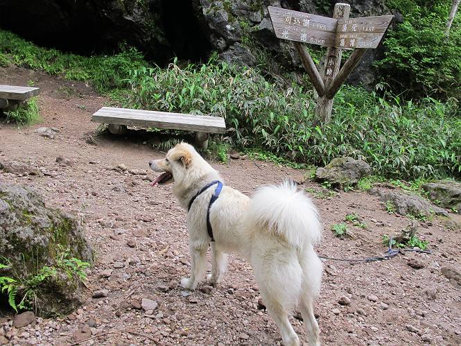 | 平成二十三年七月十四日 Before 写真集目次へ Next 猛暑が続いてますね。寝そべってばかりいるものですから、今日は奥日光へ連れてってもらいました。中禅寺湖南東の歌ケ浜から荒砥の静かな浜までブラブラして、金精道路を少し走り、そこから刈込湖まで散策してきました。涼しかったですね、湖のほとりで思い切り遊んで、いっぱいご飯も頂いてしまいました。 【前編】 荒砥の静かな浜にやってきました。 小石を敷き詰めたような感じの浅い浜です。 水が透き通っていてとてもきれいです。 ぼくの顔を近づけると写ってます。 後に見えている尖った山がお父さんの良く来る社山だそうです。 木片を投げてもらって、 くわえて運んだり、 小石を投げてもらって、 見つけて、 くわえて運んだりして遊びました。 長いロープを車に置いてきてしまったので、 近場でしか遊べなかったのですが、冷たく気持ちよかったです。 今度はお山へ移動するそうです。 戻り道、白いお花が沢山咲いてました、ノリウツギというそうです。 【後編】 金精道路を少し走ると湯元から刈込・切込湖に通じる登山道に出ます。 ここから刈込湖まで歩きます。 駐車場から木漏れ日の中をゆったりした道を進みます。 岩の間を通ったり、飛び越えたり、大きな木の根を乗り越えたりしながら徐々に急坂を上ってきました。ここは玉石がきれいに並べられています。ちょっと滑るかな。 小峠に出ました、お休み所になってます。ここで少しお休みです。 ここからもう少し上って、 コメツガの深い森の中、木の階段をいくつも下ります。 下りだからラクチンです。 この階段はちょっと長いですね。 道標が出てきました、真っ直ぐ行くと光徳へ、左に下りると刈込湖です。 刈込湖に着きました、リードを変えてもらって湖に入りました。 ここもきれいですね。 ここは砂浜でちょっと先は急に深くなります。 木片が打ち寄せられて溜まってます。 水が冷たくておいしいですよ。 お父さんにまた木片を投げてもらいましたが、深そうだな、行けるかな。 あっ、届きそうだ。 ヨイショ、ヨイショ エイッ、なかなか引っ張れないなあ。 やっと、ここまで引っ張ってこられた。 次はこの棒だ、沈んでしまっている。 口を水の中に入れてくわえたよ。 また沈んじゃってる、大きいしなあ??? お父さんがザックから出して食べ始めました、「ぼくもお腹がすいたよ、食べたいな」 ぼくの夕食をそっくり、持ってきてくれてました。たっぷり運動したし、さわやかな湖のほとり、ご飯もおいしいなあ。きれいに食べてしまいました。 食事の後は、ぼくの得意技です、ここが何だか匂うなあ。 両足を使って、掘って、掘って、かき出して。 おお、大きい木片が出たぞ、 もっと深く掘ろう、水っぽくなってきたな。 向きを変えて、それっ。 イヤー、掘ったね。「もう、良し、そろそろ戻ろう」 おじさんとおばさんが光徳の方へ行きました。ぼくとお父さんは右に曲って来た道を戻りました。途中で左後足から血が出ているのにお父さんが気づき、小峠でみてもらいました。爪の周りを少し傷つけたようでもう血が止まっていると言ってました。 途中で沢山の子供に会いました。 ぼくは、よけていると頭をなでて、「カワイイ」、なんて言ってました。「がんばってね、ワン」 帰り道、日足トンネルを出ると豪雨、街中を抜けた所で車を停め、顔についたダニをとってもらっていたら、今度は大きな雷鳴、びっくりして助手席まで逃げました。 お家に帰ってキズあとを良く洗って消毒してもらいましたが、大したことなかったようです。 Before 写真集目次へ Next |