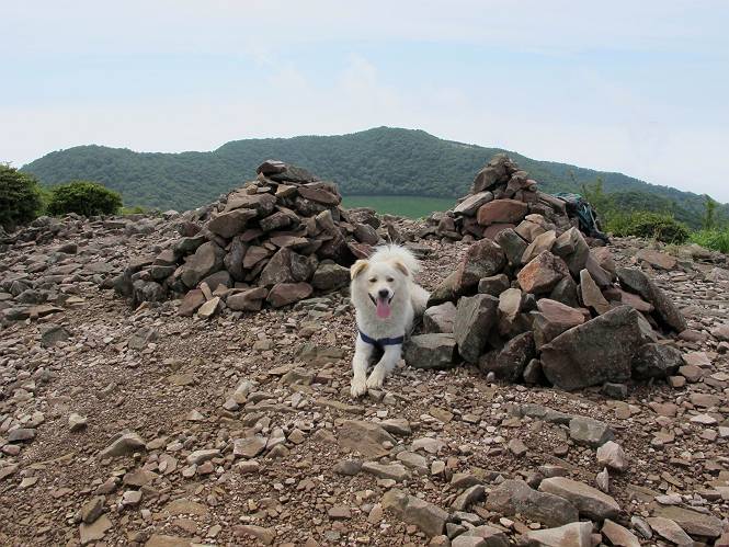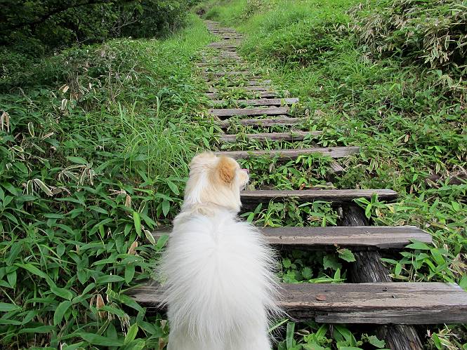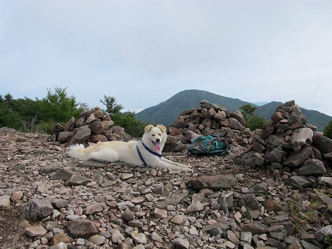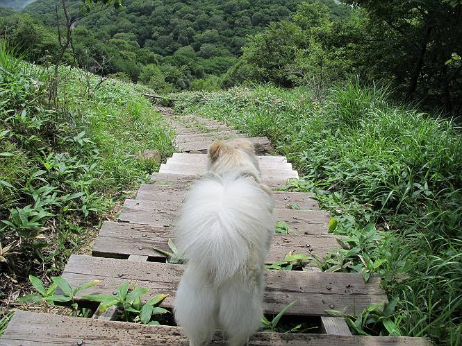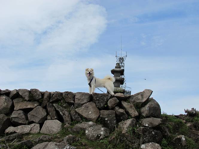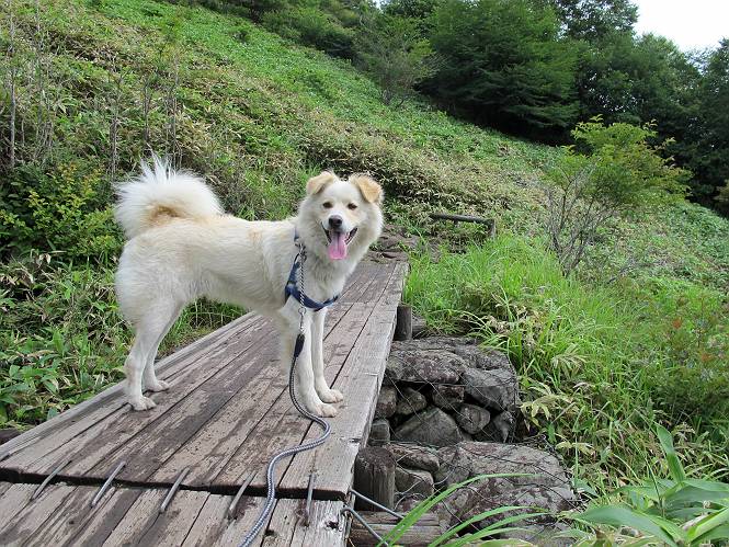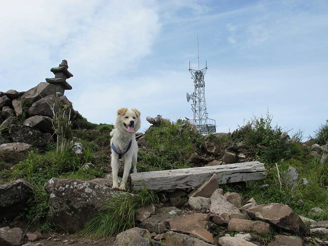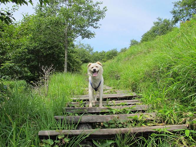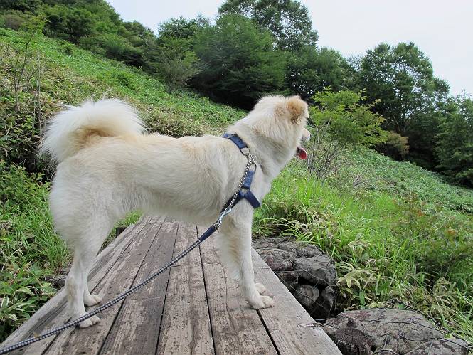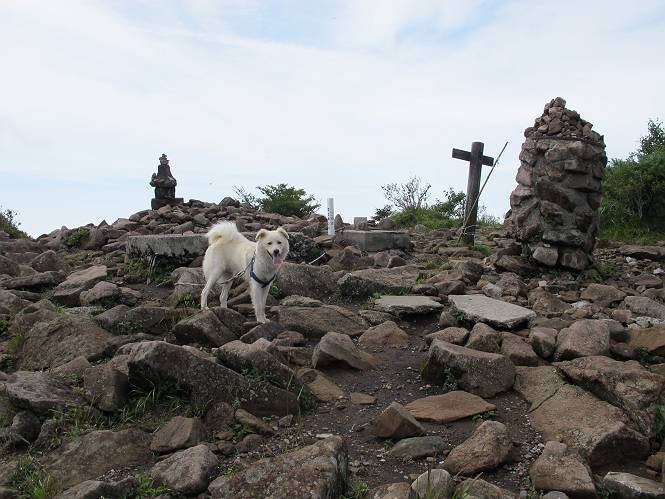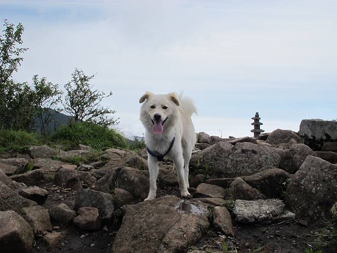 | 平成二十三年八月二日 Before 写真集目次へ Next 2ケ月ぶりに赤城山にやってきました。この前登った北のピーク、地蔵岳を八丁峠から往復します。ここへ来る道は濃い霧でライトをつけて走ってきましたが、忠治温泉から一台もあいませんでした。準備をしていると峠で親子が大きな網を振り回して昆虫を捕ってました。 笹の間の長い板の階段を上ってます。時々陽が差すまあまあの天気です。 一登りすると、横に緩やかに進みます。下には小沼とこの前歩いた牛石山が見えてます。 牛石山 小沼と長七郎山です。 お父さんは花を探してますが、なかなか見つからないようです。 また木段がしばらく続きました。 コメツツジ ハクサンフウロ ミネウスユキソウ 山頂の東側の休憩ポイントに出ました。下に小沼が見えてます。 銚子の伽藍と牛石山 黒檜山と駒ケ岳 山頂はアンテナの見える所です。 ぼくの後に見える山は黒檜山と駒ケ岳です。 ぼくの後に見える山は小地蔵岳と長七郎山、小沼です。 地蔵岳の山頂に到着です。 今日は、誰もいません。 お地蔵様を入れて撮ってもらいました。 良い眺めです。 でも、遠くの山は雲があって見えません。 北側に黒檜山と駒ケ岳、大沼です。 「こっちへ下るんですか」、「山頂をぐるっと回って戻ろう」 山頂を回ってきましたが、お花は少ないし、遠くの山は見えませんでした。 ここから少し下ると登山道に出るそうです。 やっと、一人、おじいさんがヨイショ、ヨイショって感じで登ってきます。 あと少しで木段が終わり、 八丁峠に出ます。 八丁峠から小沼にやってきました。霧に包まれてぼくだけが目立つでしょう。ここは砂浜と浅瀬が多く、大好きな水辺です。休憩を入れて1時間ほどたったそうです。 「忠治、そろそろ帰るぞ」、「ハーイ、また連れてきてね、ワン」 Before 写真集目次へ Next |