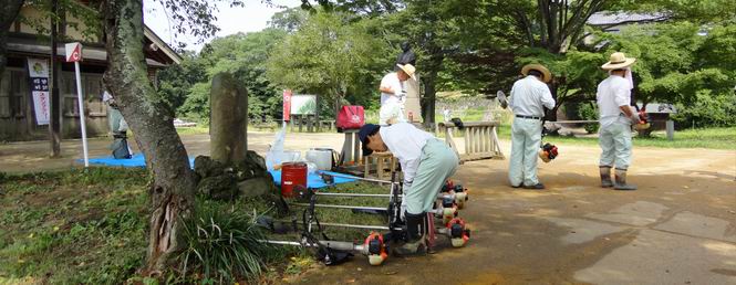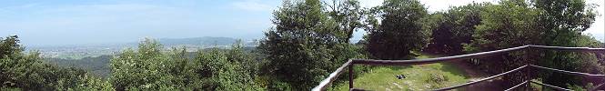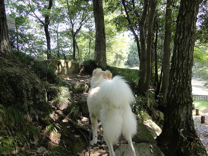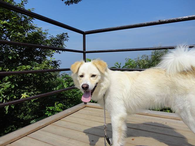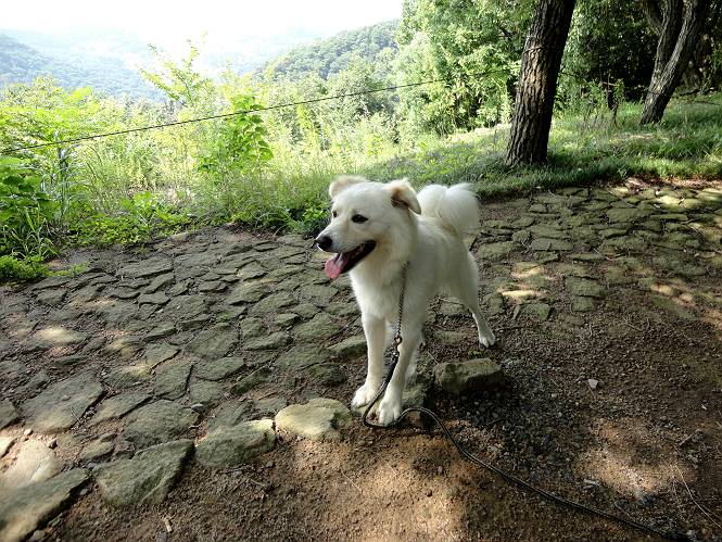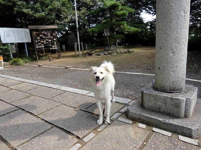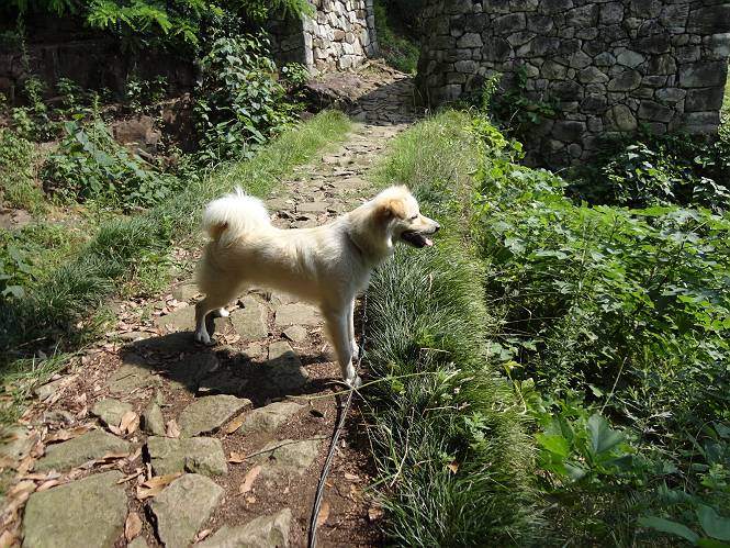 | 平成二十三年八月十五日 Before 写真集目次へ Next お盆中ですが、近くの金山へ午前中行って来ました。ぼくの家から歩いても遠くないのですが、暑いので車で山頂西の駐車場まで行きました。まだ涼しいうちでしたので、遠くから金山城址を見学に来た人、散歩する人、マウンテンバイクでトレーニングする人が沢山いました。 駐車場から岩の道を少し歩いて、石畳の道に出ました。 少し進むと、右下に道路が見えました、車が走ってました。 左方向に石段を上って行くと物見台跡に出ました。 展望台になっていまして北方向が一望できました。赤城山は霞んでいて見えませんでした。 左が北方向で、右の茂みが新田神社のある山頂です。 丸い日の池の南側にある展望台にやってきました。ここから太田市の中心部を一望できます。その南には利根川を挟んで熊谷市、秩父の山々、富士山も見えるそうです。今日は全然見えませんね。 左眼下が太田市の中心部で、右下が日の池です。 おじさんたちが草刈を始めるところで、ぼくを見て、「おとなしいなあ」、なんて言ってました。 山頂、新田神社前の鳥居にやってきました。写真を撮っていたら、どこかのお兄さんが「一緒に撮りましょうか」、と言ってました。「有難うございます、結構です」、とお断りしました。そう云えばお父さんとまだ一枚も一緒に撮ったことないね。 山頂の木陰でゆっくりお休みして戻りました。 Before 写真集目次へ Next |