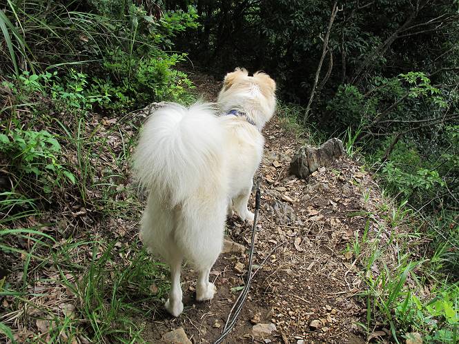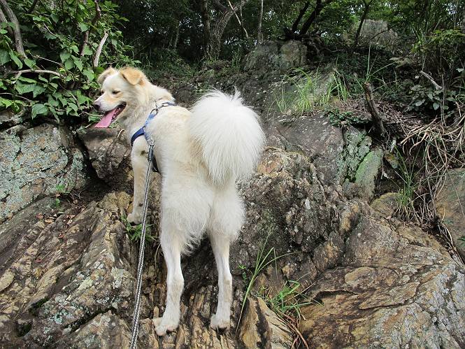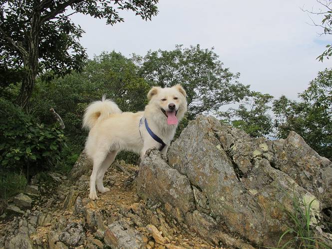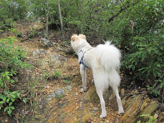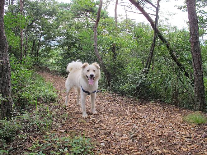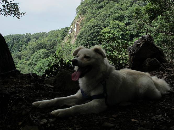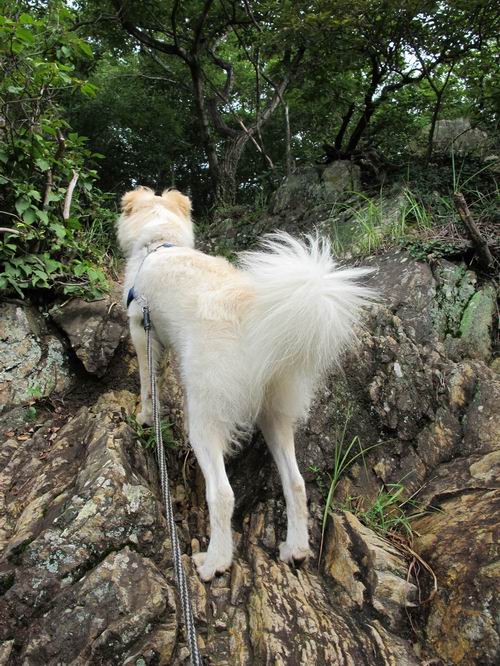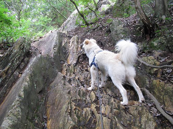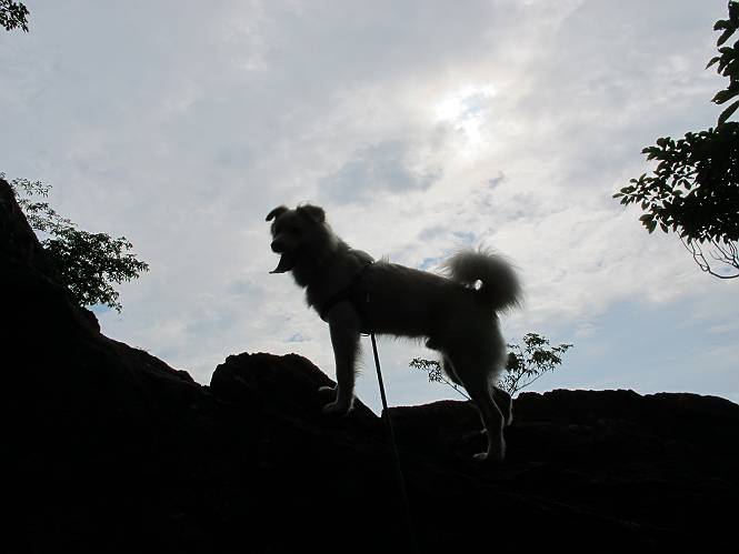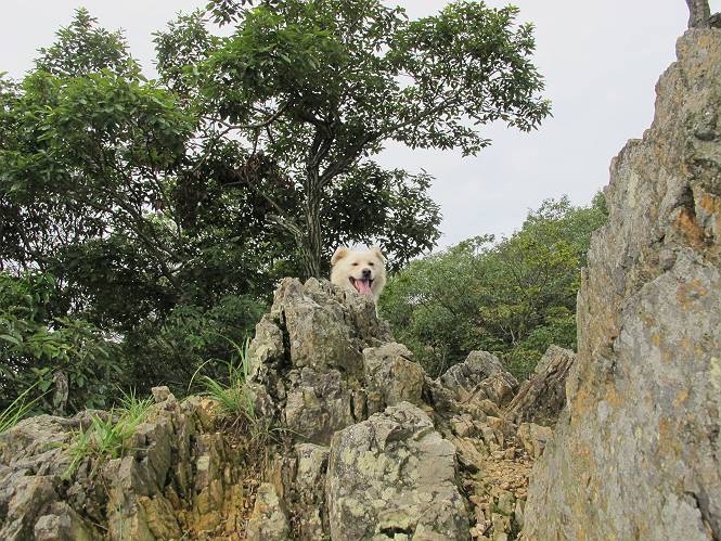 | 平成二十三年八月二十六日 Before 写真集目次へ Next 何だか雨が降りそうな空模様となってしまいました。でもお父さんと一緒に足利の大小山へ出かけました。阿夫利神社の駐車場には5台ほど車がありました。ここからコースを右に取り、杉林の中の急坂を登って雑木林に出ました。 蒸暑くてお父さんはすごい汗をかいてます。ぼくは呼吸が早くなってますが、まだ大丈夫です。 間もなく登山道にゴツゴツした岩が出てきました。 東の景色が開けました、佐野方面だそうです。 歩いてきた登山道です。 ハッ、ハッ、ハッ、ハッ、呼吸が早くなって熱いツバが吹き出てます。 岩場にでました。4名のGrが下ってきましたので、待っているとそれぞれぼくの頭を撫でてってくれました。写真も撮ってもらいました、良く撮れたって言ってました。 上りはじめるとおじさんが急に現れました、一段上って通過するのを待ちました。 岩の上に出ました、良い景色です。逆光で面白い写真になりました。 その先で“大小”の岩の見えるところで小休止しました。 次の岩場に出ました。 「ヨイショ!」 まだまだ続くようですね。 横に這いあがってます、カッコイイでしょう。 また岩の上に出ましたよ。 山頂かと思いましたが、 あと少しで、妙義山の山頂だそうです。 妙義山の山頂に着きました。 南方向の足利の街だそうです。 東方向の佐野の街だそうです。 また、お水を飲んで一休みしてます。 誰も来なかったですね。 ここから南方向に少し下って、 次のピークに出ました。ここが大小山だそうです。ここ東側の崖に先ほど見た“大小”の大きな文字が取り付けられているそうです。 大小山山頂 南に伸びる登山道です。 また一休みしてます。誰も来る気配がありません。 大分お休みしました。今日は暑いので、ここから最短距離で駐車場に戻ることになりました。 ちょっと進むと展望台経由駐車場への分岐点があります。 東の風景です。 大小山の南側から東側へ巻いて進みます。 この階段、狭くて急、大きなスキマがあるので、ぼくは階段に沿って斜面を下りました。 ここがアズマヤの展望台です。 上を見上げると大きな字が岩場にあります。 女坂をルンルン気分で下って駐車場に戻りました。 蒸暑かったけれど、山は楽しいですね。雨にも降られなかったし、ダニもスプレーしましたから大丈夫でしょう。ほんとうは大坊山まで歩きたかったのですが、途中でやめました。 Before 写真集目次へ Next |