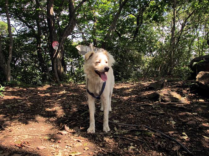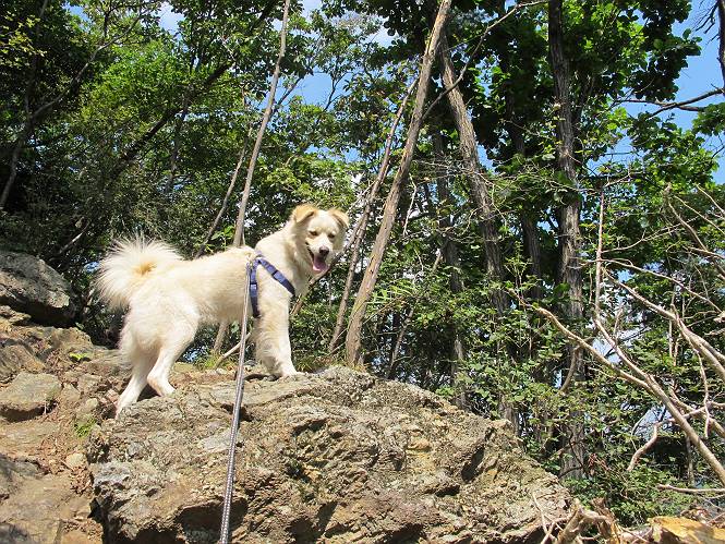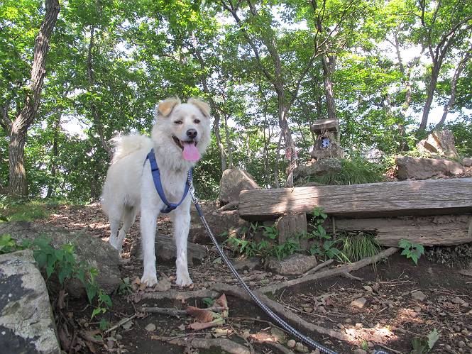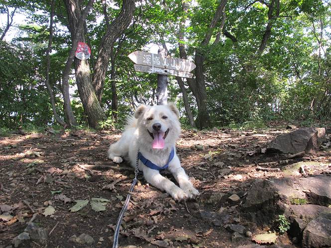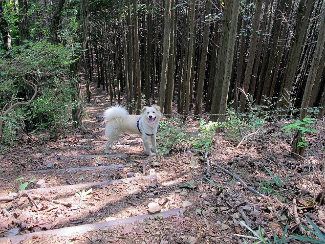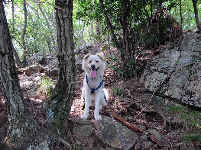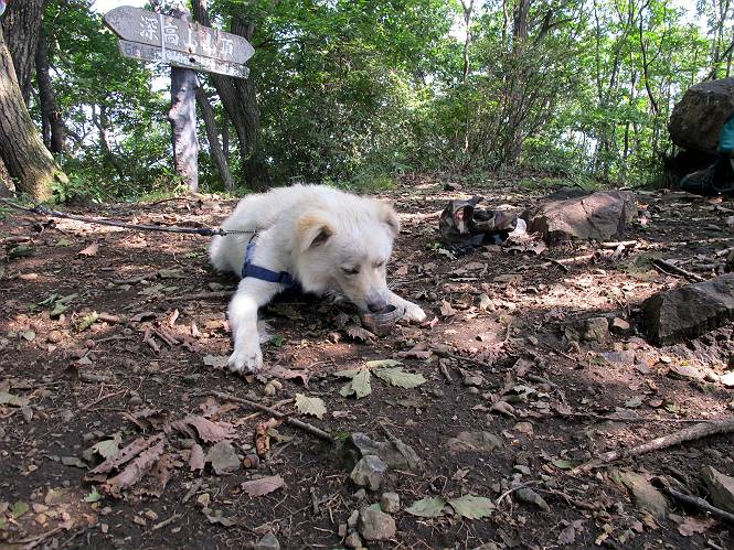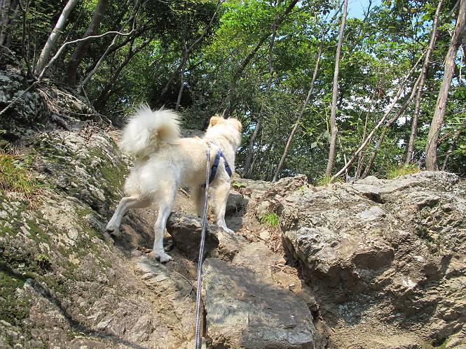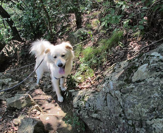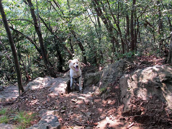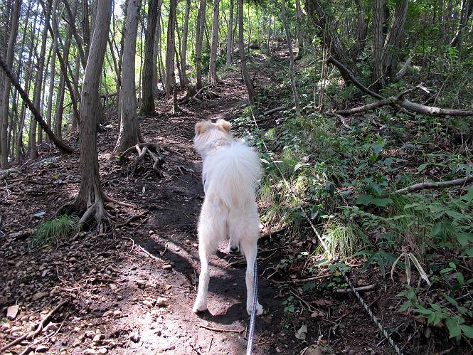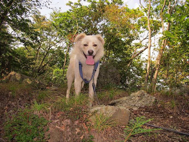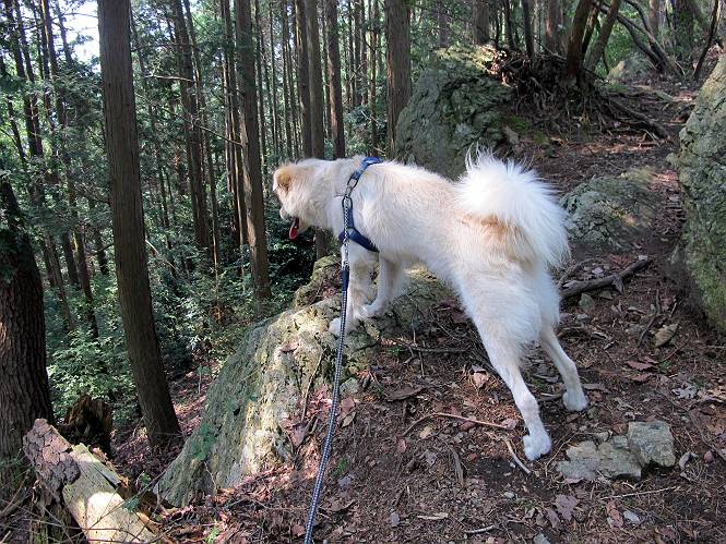 | 平成二十三年九月十日 Before 写真集目次へ Next 足利の小俣町の奥、猪子トンネルから林道を少し走った所から、深高山を目指して歩いています。桧の林を抜けて、ここから山頂まで急坂が続きます。今日は、朝の散歩をしてお庭で独りで遊んでいたら、お父さんがお部屋から「忠治、ヤマへ行くか?」、と言うんです。ぼくは、直ぐに大きな声で「ワン、ワン、ワン」、と返しました。お母さんがビックリして飛び出てきました。そんなわけで、連れてきてもらいました。 丸太の階段を上ってます。写真は緩やかに見えますが、急でしてロープにつかまって歩いてますよ。 岩場に入りました。ぼくはスイスイ登ってしまいますが、・・・・・です。 なかなかキツイ坂なんですョ。 ぼくもハー、ハーしてきました。 藪漕ぎも面白いですが、岩場をピョン、ピョン登って行くのは楽しいですよ。 何かいるみたいだなあ。 ここも緩やかに見えますが、最後のキツイ坂です。 深高山の山頂に着きました。木が茂って周辺が全く見えません。お父さんはスゴイ汗をかいてます、「お水、頂戴」 お水、おいしいなあ、これ2杯目ですよ。 おやすみ中です。登山口でダニスプレーするのを忘れちゃって、いま、かけられちゃいました。クサイので転がって地面に体や頭をこすりつけたらマックロケになってしまいました。 そろそろ出発のようです。 「真っ直ぐ行くんじゃないの?」 「今日は暑いから帰ろう」、って引っ張られてしまいました。 そんなわけで、林道から最短距離で深高山往復だけでした。でも山は好きだなあ。 Before 写真集目次へ Next |
