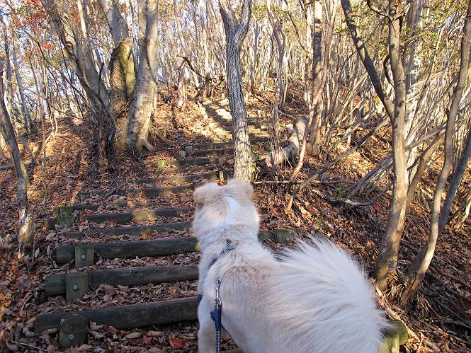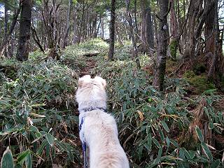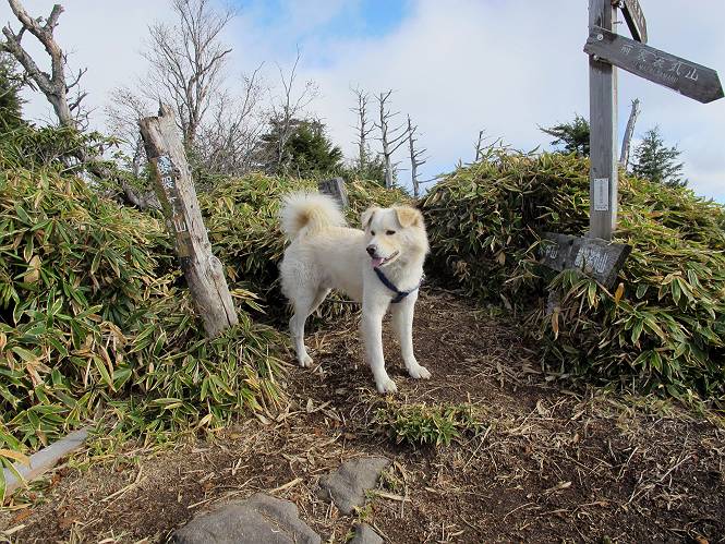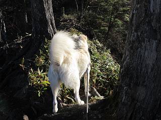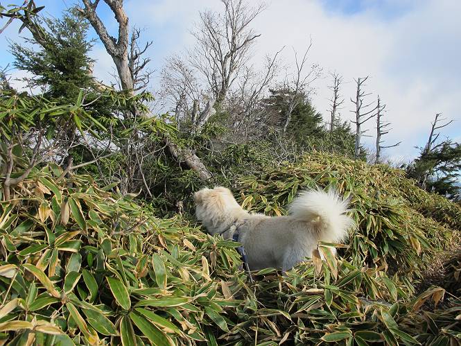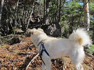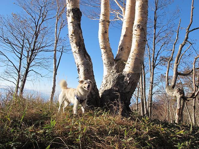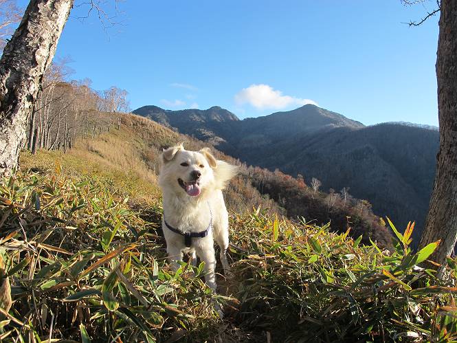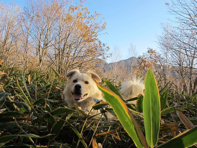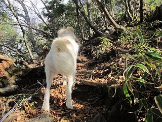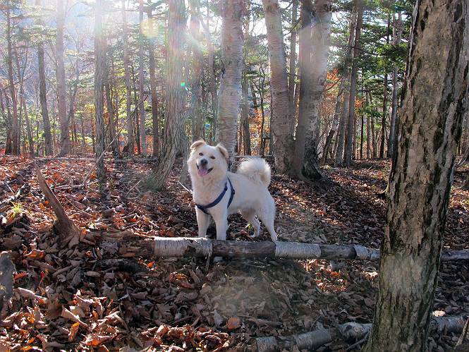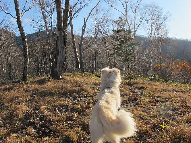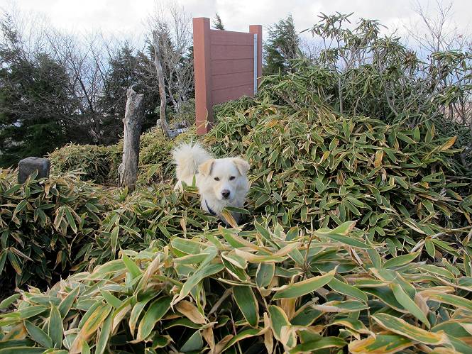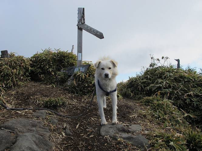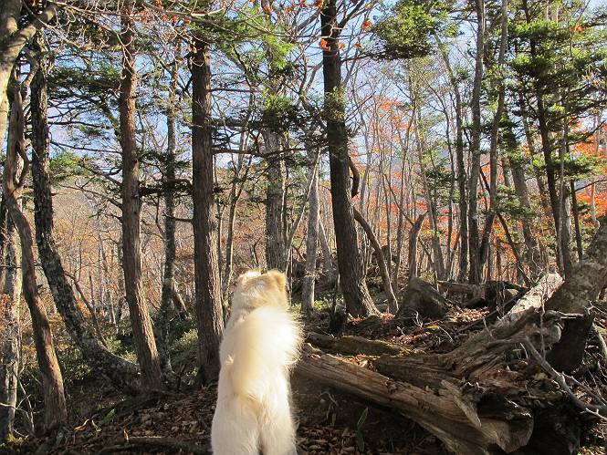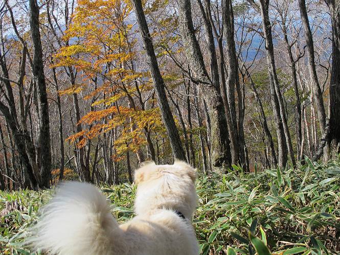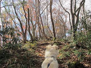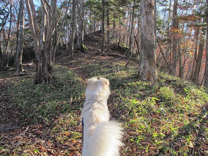 | 平成二十三年十月二十六日 Before 写真集目次へ Next ほんとうは、ぼくの誕生日の予定だったのですが、お父さんは富士山に行ってしまいましたので、1週間遅れで後袈裟丸山に行って来ました。途中までは2度行ってますが、山頂ははじめてです。 郡界尾根の登山口です。 ここから尾根に出るまで木段が続いてます。 ほとんどこの付近は終わってしまいましたが、残っているカエデの紅葉を見ながら歩いてます。 この丸太のハシゴを上れば尾根にでるのですが、最後の3段は引っ張り上げてもらいました。 緩やかに笹の斜面を進みます。 所々に綺麗な紅葉が残ってます。 この辺の紅葉です。 袈裟丸山が見えました、ヤブをこいで写真を撮ってもらいました。 右が前袈裟丸山で左が今日登る後袈裟丸山です。 広々とした尾根にでました。 白樺の大きな木です。 この辺はもう終わってしまいましたね。 少し下って登り返しました。 また東斜面に点々と紅葉が残ってます。 落葉樹から針葉樹に変るようです。 針葉樹の尾根から眺めると綺麗です。 根っ子の斜面を急登します。 シャクナゲの群生地に入り石祠がありました。 正面から撮ってもらいました。 緑のコメツガの樹林帯もいいですね。 まだ紅葉が残ってますよ、後は前袈裟丸山です。 所々深い笹道があります。 細い岩尾根もあります。 岩の上で小休止しました。 岩場、笹尾道を繰り返します。 段々勾配を増してきました。 根っ子に引っかかったりしながら急坂を登ってます。 やっと後袈裟丸山山頂につきました。 雲が多く、風も強く、周りの景色は見えません。時々白いものが飛んでます、風花だそうです。 こちらは道がありますがどこへ行くんでしょうか。 奥袈裟丸山だそうです。 オヤツを頂きました。ちょっとたりなかったな。 後の山は前袈裟丸山です。折場から登りました。 風が強く、寒いので早目の下山です。 ここまで下ったら陽が差してきました。 単調な下り道なので、ちょっと穴掘りで変化をつけてます。 ちょっと掘りすぎてしまいました。 風が強く、ゴー、ゴー鳴ってます、ぼく怖いです。 尾根の少し下を風を避けながら、遊びながら下りました。 笹の原で再び紅葉を眺め 笹の原 三角点 木段を下って 登山口付近の紅葉も青空に映えて、輝いてました。 ぼくん家の車が見えました、登山口到着です。 Before 写真集目次へ Next |
