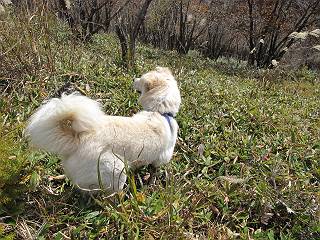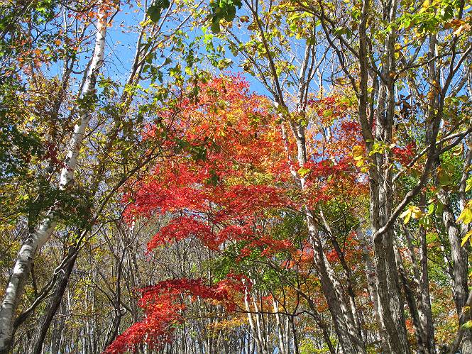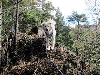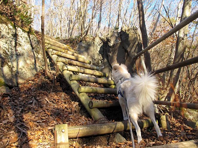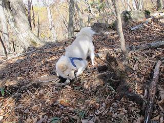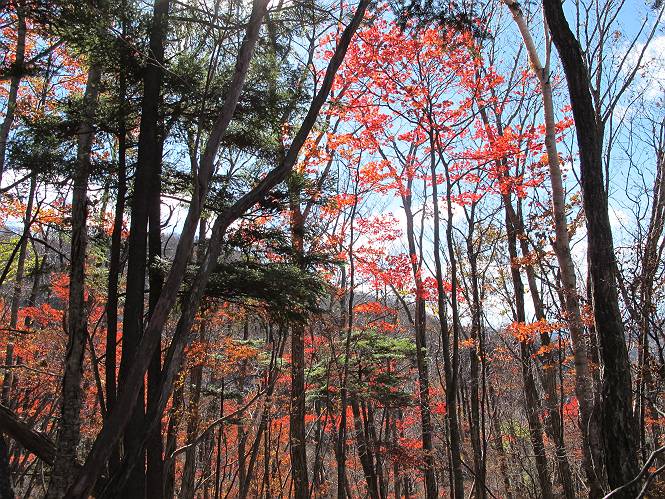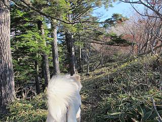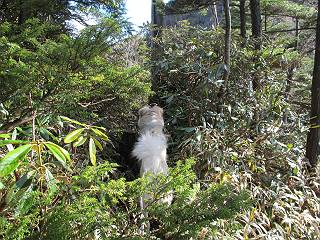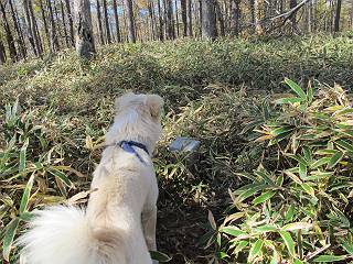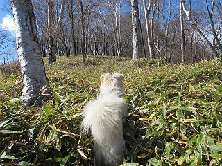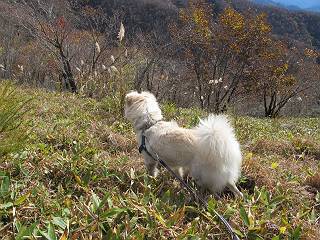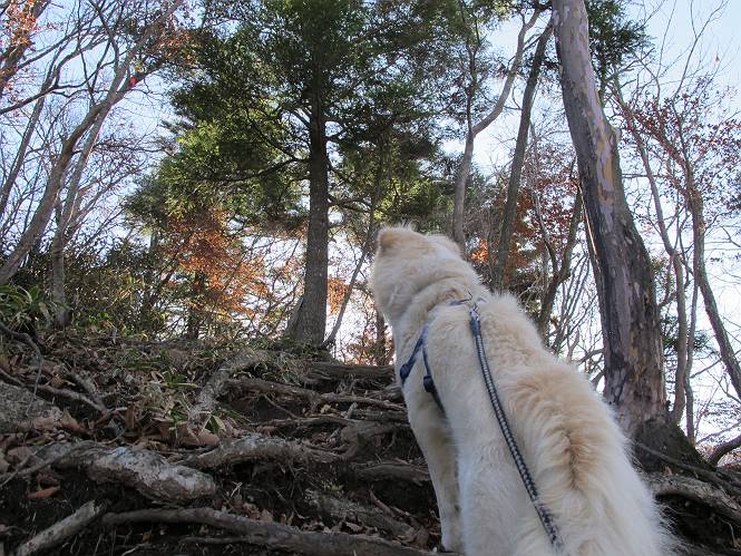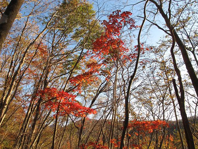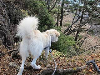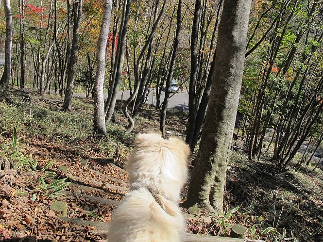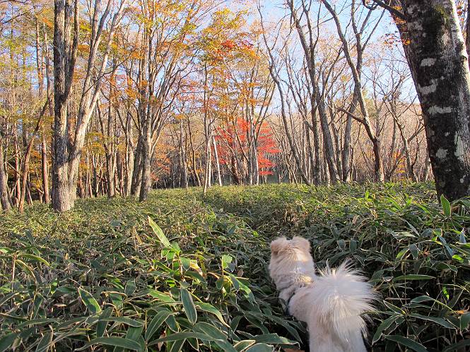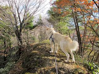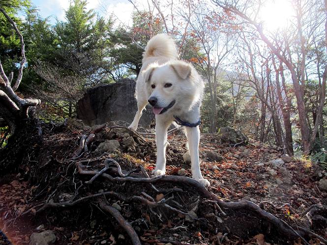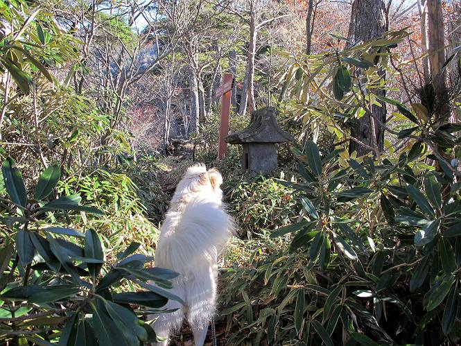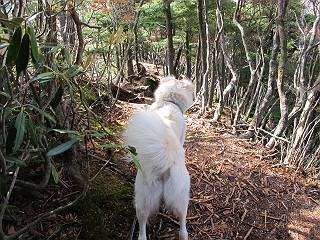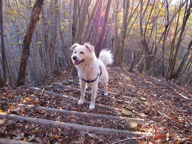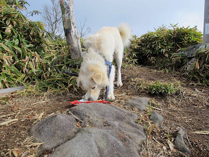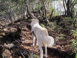 | 平成二十三年十月二十六日 Before 写真集目次へ Next ほんとうは、ぼくの誕生日の予定だったのですが、お父さんは富士山に行ってしまいましたので、1週間遅れで後袈裟丸山に行って来ました。途中までは2度行ってますが、山頂ははじめてです。 郡界尾根の登山口です。 ここから尾根に出るまで木段が続いてます。 ほとんどこの付近は終わってしまいましたが、残っているカエデの紅葉を見ながら歩いてます。 この丸太のハシゴを上れば尾根にでるのですが、最後の3段は引っ張り上げてもらいました。 緩やかに笹の斜面を進みます。 所々に綺麗な紅葉が残ってます。 この辺の紅葉です。 袈裟丸山が見えました、ヤブをこいで写真を撮ってもらいました。 右が前袈裟丸山で左が今日登る後袈裟丸山です。 広々とした尾根にでました。 白樺の大きな木です。 この辺はもう終わってしまいましたね。 少し下って登り返しました。 また東斜面に点々と紅葉が残ってます。 落葉樹から針葉樹に変るようです。 針葉樹の尾根から眺めると綺麗です。 根っ子の斜面を急登します。 シャクナゲの群生地に入り石祠がありました。 正面から撮ってもらいました。 緑のコメツガの樹林帯もいいですね。 まだ紅葉が残ってますよ、後は前袈裟丸山です。 所々深い笹道があります。 細い岩尾根もあります。 岩の上で小休止しました。 岩場、笹尾道を繰り返します。 段々勾配を増してきました。 根っ子に引っかかったりしながら急坂を登ってます。 やっと後袈裟丸山山頂につきました。 雲が多く、風も強く、周りの景色は見えません。時々白いものが飛んでます、風花だそうです。 こちらは道がありますがどこへ行くんでしょうか。 奥袈裟丸山だそうです。 オヤツを頂きました。ちょっとたりなかったな。 後の山は前袈裟丸山です。折場から登りました。 風が強く、寒いので早目の下山です。 ここまで下ったら陽が差してきました。 単調な下り道なので、ちょっと穴掘りで変化をつけてます。 ちょっと掘りすぎてしまいました。 風が強く、ゴー、ゴー鳴ってます、ぼく怖いです。 尾根の少し下を風を避けながら、遊びながら下りました。 笹の原で再び紅葉を眺め 笹の原 三角点 木段を下って 登山口付近の紅葉も青空に映えて、輝いてました。 ぼくん家の車が見えました、登山口到着です。 Before 写真集目次へ Next |