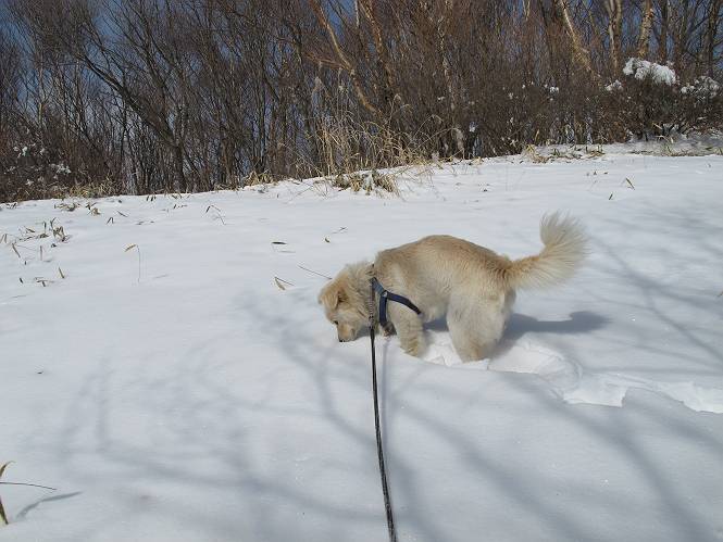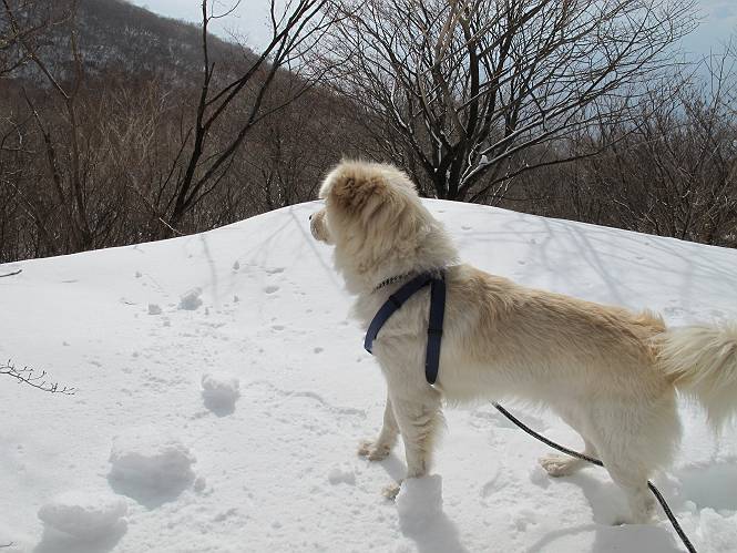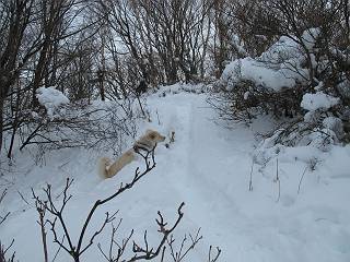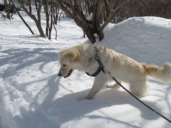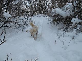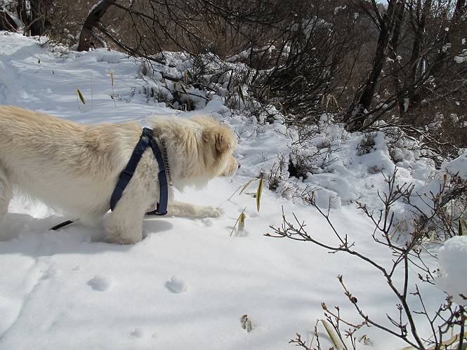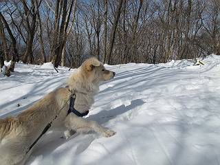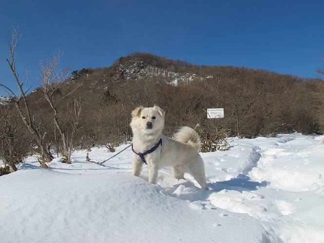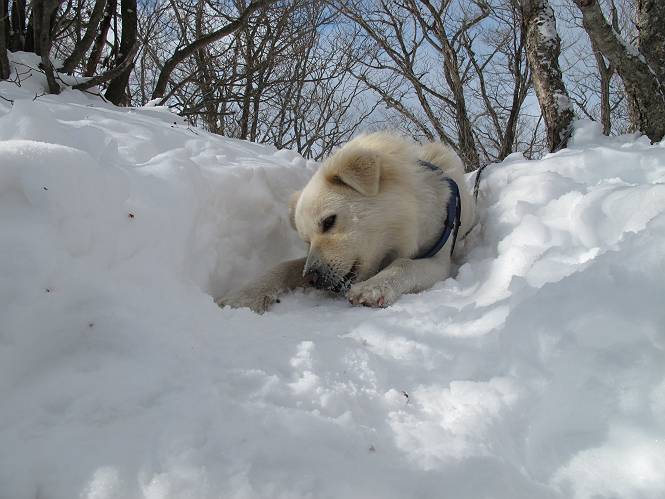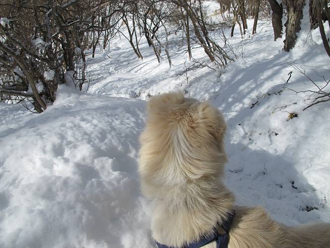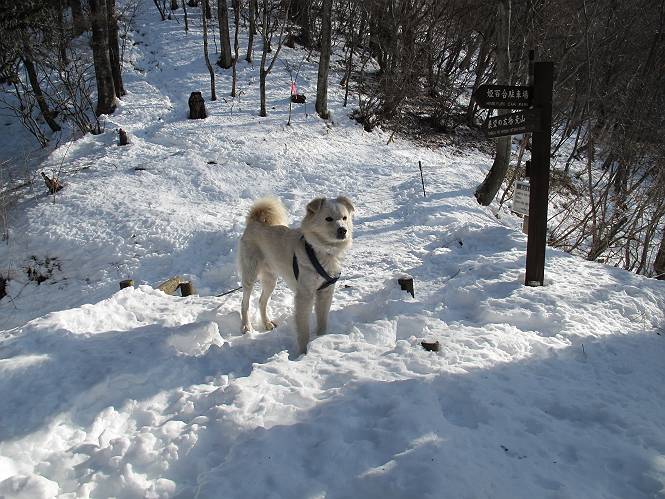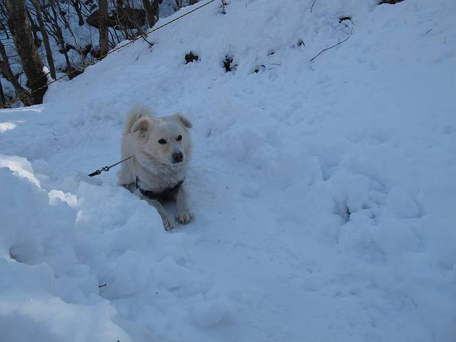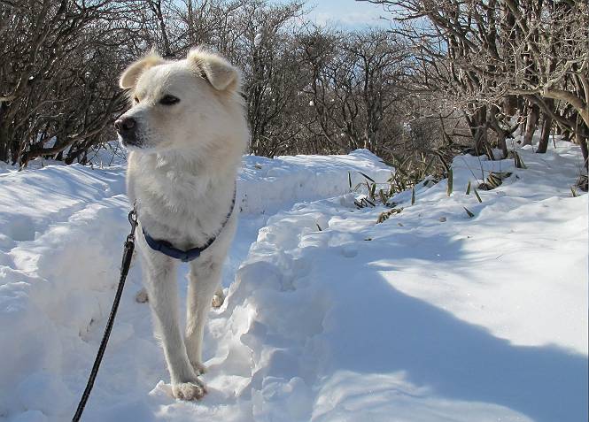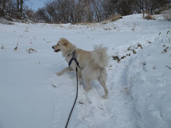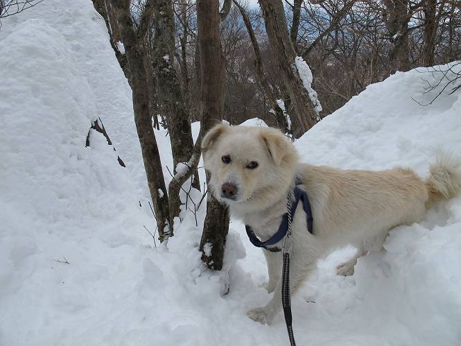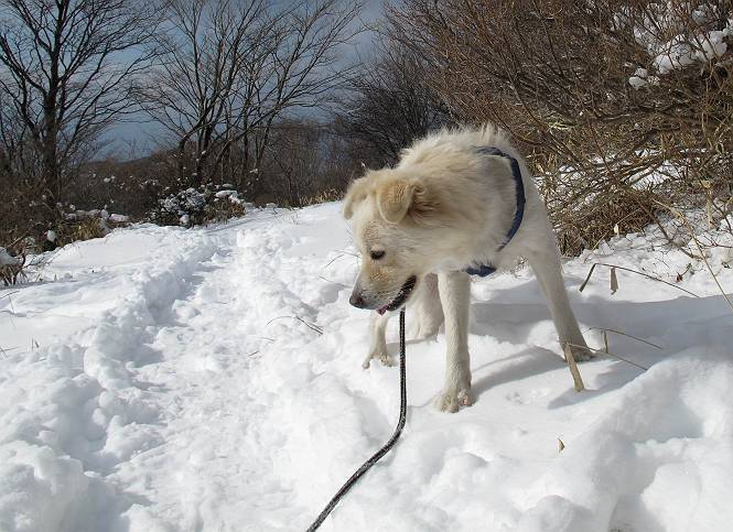 | 平成二十四年一月二十六日 Before 写真集目次へ Next 赤城山にも沢山雪が降ったようなので、里に近い荒山へ箕輪から往復しました。車から見た赤城山の山頂部は早くも雪雲に覆われようとしてました。今は晴れていますが、雪が降ってくるかも。 姫百合駐車場から、杉、桧の林を通って雑木の尾根に出ました。 トラロープの張られた登山道を上って行きます。 足の間に氷がついて痛くって歩けません。ボリボリかじってとりました、駐車場は−6℃だったとか。 荒山高原に出ました、まだ荒山の上空は真っ青ですね、黒檜山地蔵岳は雲がかかってます。 ここで少し休んで、雪の上で転がって遊びました。そろそろ荒山目指して進みます。 沢山降ったんですね、でも登山道の雪は踏み固められてます。 つつじの間が真っ白ですよ。 箕輪からの近道コースと合流しました。帰りはこの道を下るそうです。 道を歩いたり、 雑木林の中を踏み込んだり 雪道を楽しみました。 あれっ、何だ! 雪の下から小枝が跳ね上がったんですって。 あっ、あれは何かな? 小動物の歩いた跡のようです。 つつじの下にもぐっているのかな。 いろいろと面白いですね。 この前もここで遊んだ場所です。平らな大きな岩のようです。 雪、食べちゃった、冷たくておいしいですよ。 今度はあっちへ行こう。 登山道から南の斜面を下りはじめました。 さっそく、上って来いって言われました。 この辺は大きな吹き溜まりの出来る場所だそうです。今年はまだ笹に被った程度です。 表面は少し凍っていて硬いのですが、ズボッて足が入ってしまいます。 また登山道に戻れって言ってます。 登山道よりも、 まだ踏んでない雪の上の方が、 気持良いよね。 だんだん急斜面になってきました、ヨイショ。 岩場がもうすぐです、そこを抜ければ山頂です。 また指に氷がついちゃったよ、痛くて「キャーン」て泣いたら、お父さんがとってくれました。 岩場の手前ですが雪が深いですね。 荒山の山頂に到着しました。 オヤツをもらいました。 地蔵岳と長七郎山は薄い雪雲ではっきり見えませんでした。 「また、指の間が凍っちゃったよ」 「そのくらい、大丈夫だよ」 山頂の木の間を、 走り回って遊びました。 「もう、そろそろ帰るぞ」、「まだ来たばっかりなのに、もう?」 「つまんないなあ、もっと遊びたいよ」、「沢山降ったら、また連れてくるよ」 そんなわけで、最短距離で林の中を遊びながら下り、 杉林にでました。もう姫百合駐車場はすぐです。 Before 写真集目次へ Next |