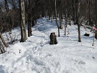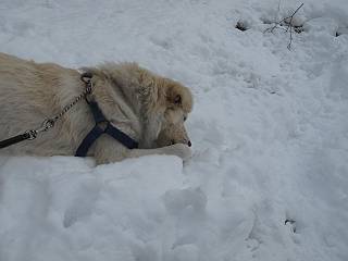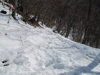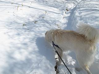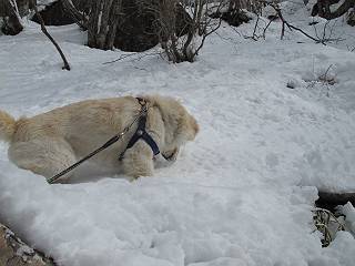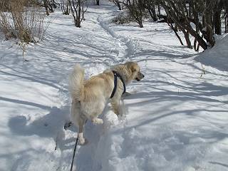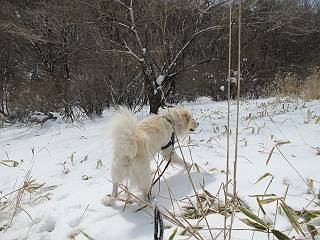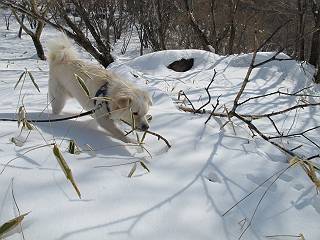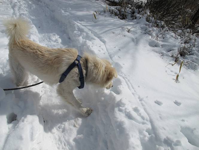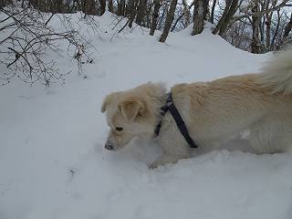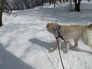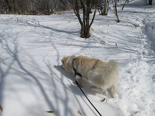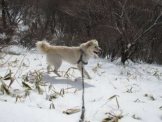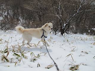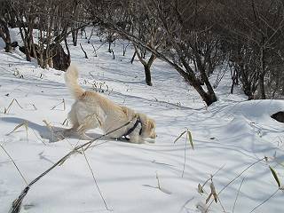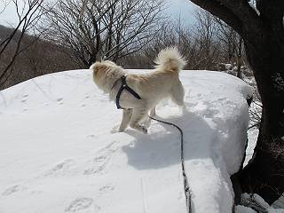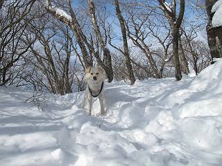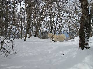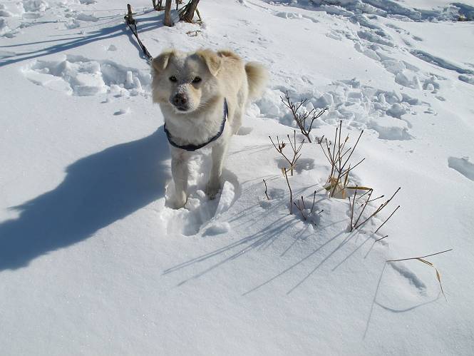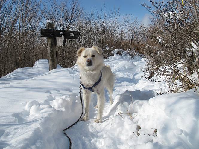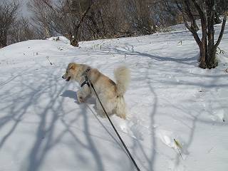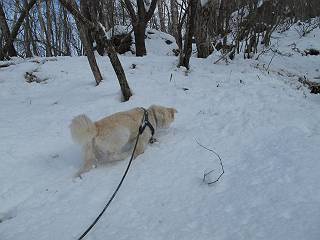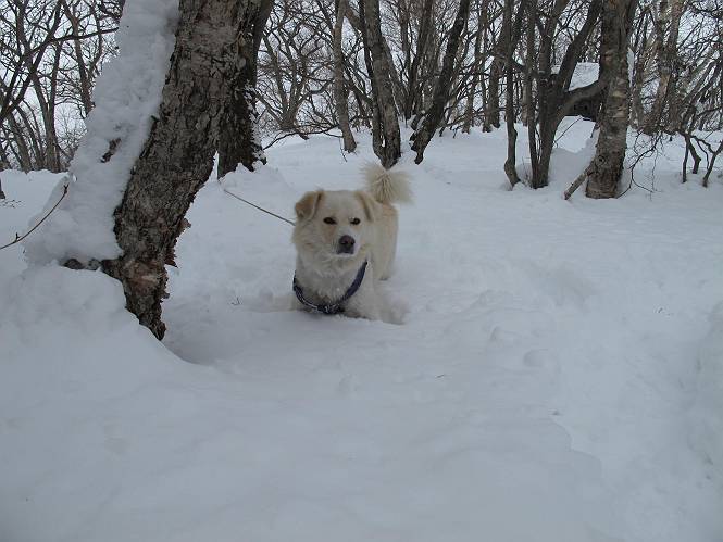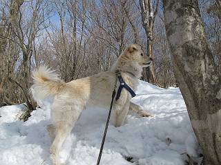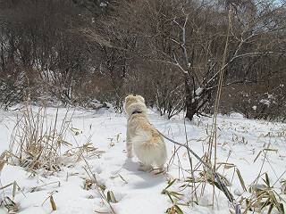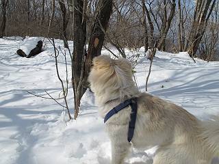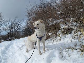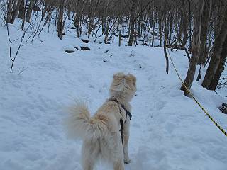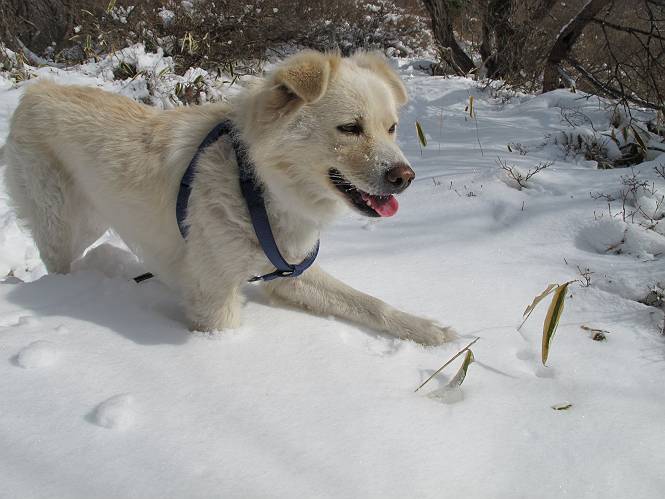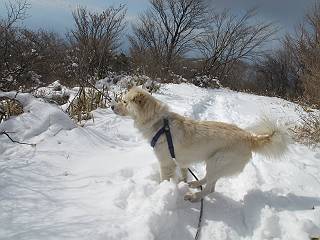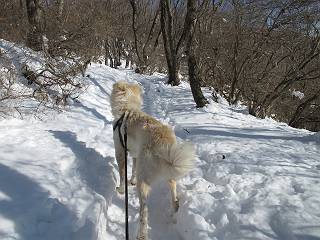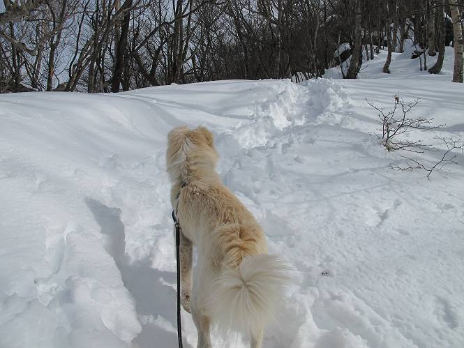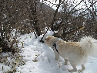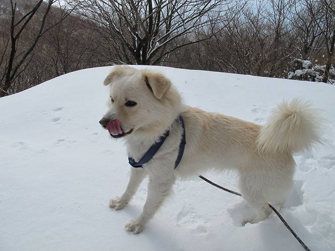 | 平成二十四年一月二十六日 Before 写真集目次へ Next 赤城山にも沢山雪が降ったようなので、里に近い荒山へ箕輪から往復しました。車から見た赤城山の山頂部は早くも雪雲に覆われようとしてました。今は晴れていますが、雪が降ってくるかも。 姫百合駐車場から、杉、桧の林を通って雑木の尾根に出ました。 トラロープの張られた登山道を上って行きます。 足の間に氷がついて痛くって歩けません。ボリボリかじってとりました、駐車場は−6℃だったとか。 荒山高原に出ました、まだ荒山の上空は真っ青ですね、黒檜山地蔵岳は雲がかかってます。 ここで少し休んで、雪の上で転がって遊びました。そろそろ荒山目指して進みます。 沢山降ったんですね、でも登山道の雪は踏み固められてます。 つつじの間が真っ白ですよ。 箕輪からの近道コースと合流しました。帰りはこの道を下るそうです。 道を歩いたり、 雑木林の中を踏み込んだり 雪道を楽しみました。 あれっ、何だ! 雪の下から小枝が跳ね上がったんですって。 あっ、あれは何かな? 小動物の歩いた跡のようです。 つつじの下にもぐっているのかな。 いろいろと面白いですね。 この前もここで遊んだ場所です。平らな大きな岩のようです。 雪、食べちゃった、冷たくておいしいですよ。 今度はあっちへ行こう。 登山道から南の斜面を下りはじめました。 さっそく、上って来いって言われました。 この辺は大きな吹き溜まりの出来る場所だそうです。今年はまだ笹に被った程度です。 表面は少し凍っていて硬いのですが、ズボッて足が入ってしまいます。 また登山道に戻れって言ってます。 登山道よりも、 まだ踏んでない雪の上の方が、 気持良いよね。 だんだん急斜面になってきました、ヨイショ。 岩場がもうすぐです、そこを抜ければ山頂です。 また指に氷がついちゃったよ、痛くて「キャーン」て泣いたら、お父さんがとってくれました。 岩場の手前ですが雪が深いですね。 荒山の山頂に到着しました。 オヤツをもらいました。 地蔵岳と長七郎山は薄い雪雲ではっきり見えませんでした。 「また、指の間が凍っちゃったよ」 「そのくらい、大丈夫だよ」 山頂の木の間を、 走り回って遊びました。 「もう、そろそろ帰るぞ」、「まだ来たばっかりなのに、もう?」 「つまんないなあ、もっと遊びたいよ」、「沢山降ったら、また連れてくるよ」 そんなわけで、最短距離で林の中を遊びながら下り、 杉林にでました。もう姫百合駐車場はすぐです。 Before 写真集目次へ Next |