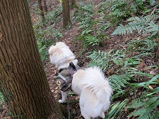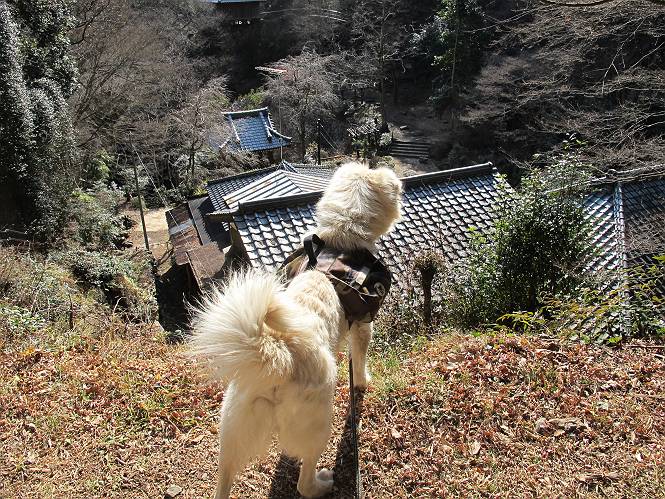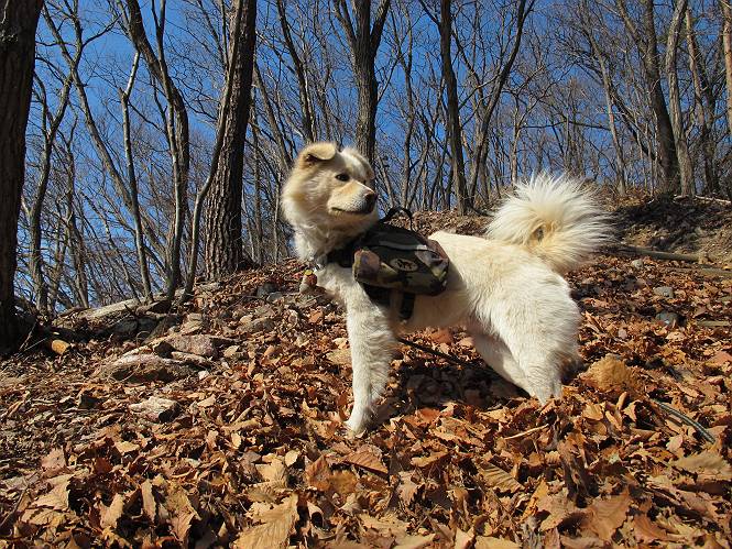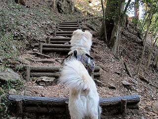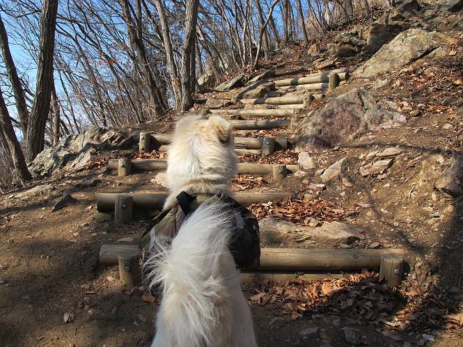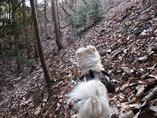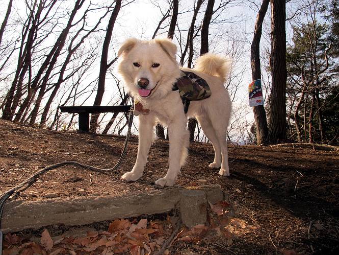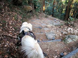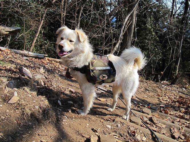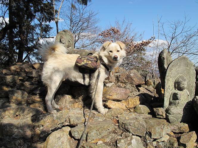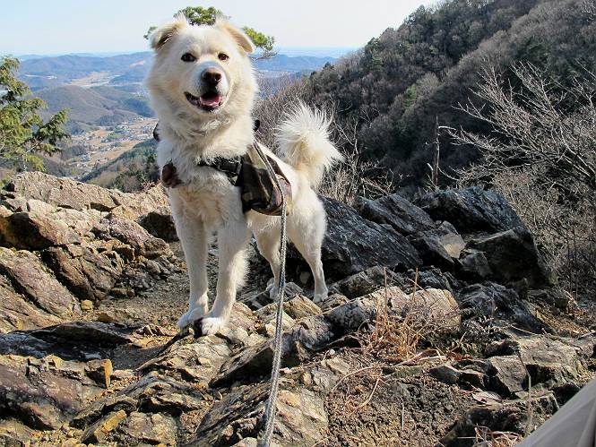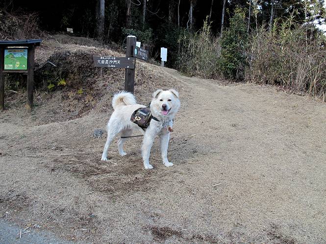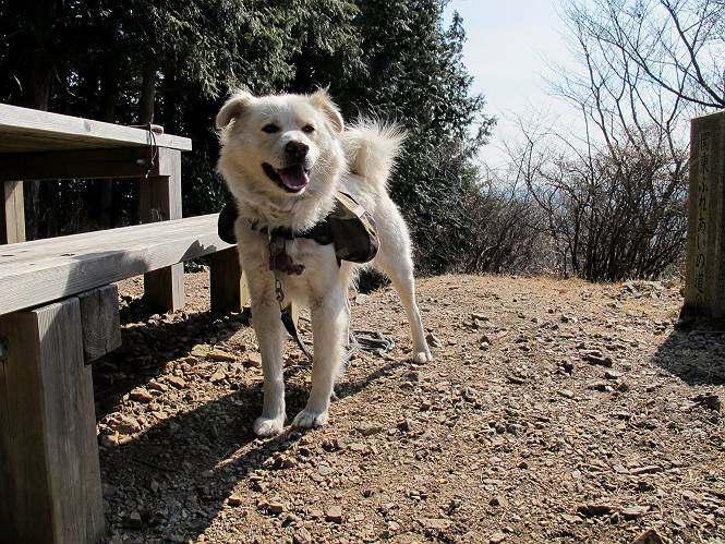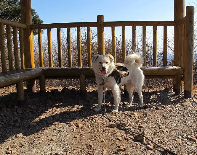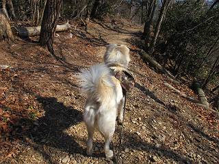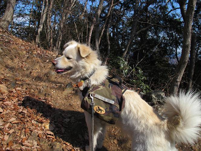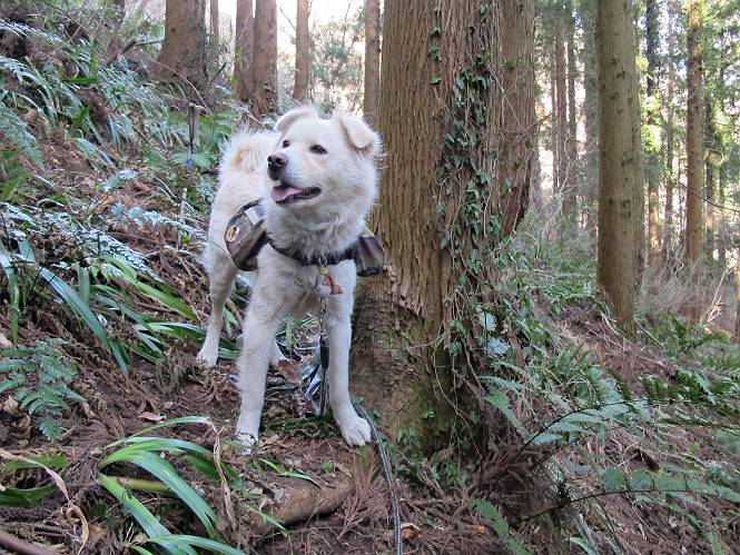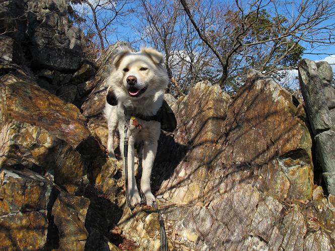 | 平成二十四年二月十日 Before 写真集目次へ Next 午後の散歩に足利の大岩山と行道山を一回りしてきました。林道の終点まで車で来ましたので、直ぐに大岩山に着いてしまいました。 大岩山の山頂です。 下って小さなピークを2つ、3つ越えます。今日は温かいですね、しばらくぶりのリュックスタイルです。 時々陽だまりハイクをしている人に会います。 また来たんみたい、4人で歩いてますよ。 この階段を越えれば間もなく行道山の山頂です。 山頂の東屋で撮ってもらいました。 赤城山と袈裟丸山は見えましたが、浅間山、日光方面の山は頭が見えませんでした。 山頂から下って、尾根から右に曲る所の休憩所です。 緩やかに下って、岩のゴツゴツした所を通り、 寝釈迦のある岩場に登ります。 ここが、小さな寝釈迦のある岩場です。 石仏を入れて撮ってもらいました。 寝釈迦と一緒に撮ってもらったのですが、お顔が隠れてしまいました。 階段を下って また少し上って下りました。 すると、浄因寺の上に出ました。 犬はどうしたのでしょう、猫が2匹いました。石段を少し下って山門を通りました。 沢山積った落葉を踏みしめ、しばらく歩くと、シダとシャガの斜面に変り緩やかに上ります。 もう少し上れば駐車場だそうです。 一回り、今日は1時間半だそうです、早かったですね。ぼく、帰りは時々走ってしまいました。 お水を行道山の頂上で飲んだだけでしたので、これからオヤツを食べて帰ります・ Before 写真集目次へ Next |