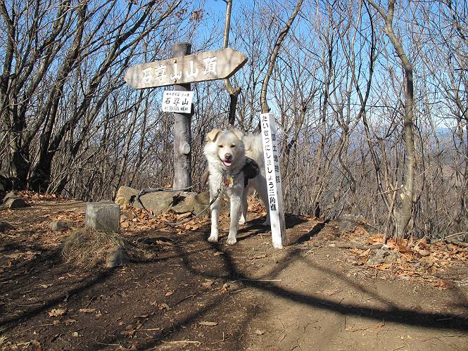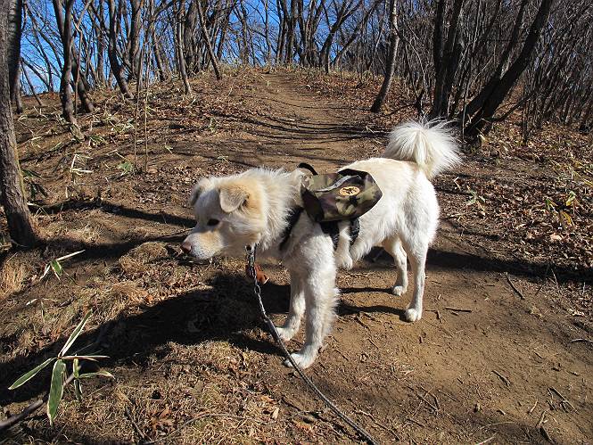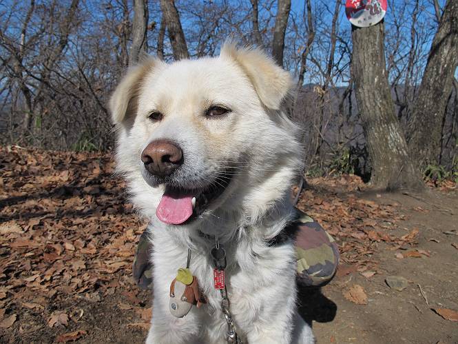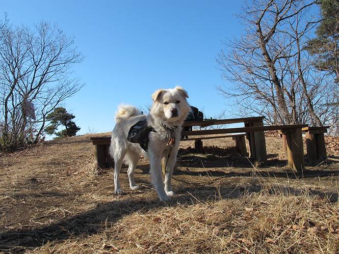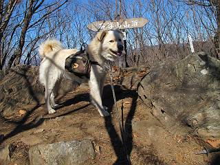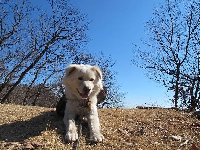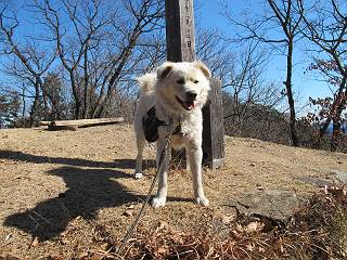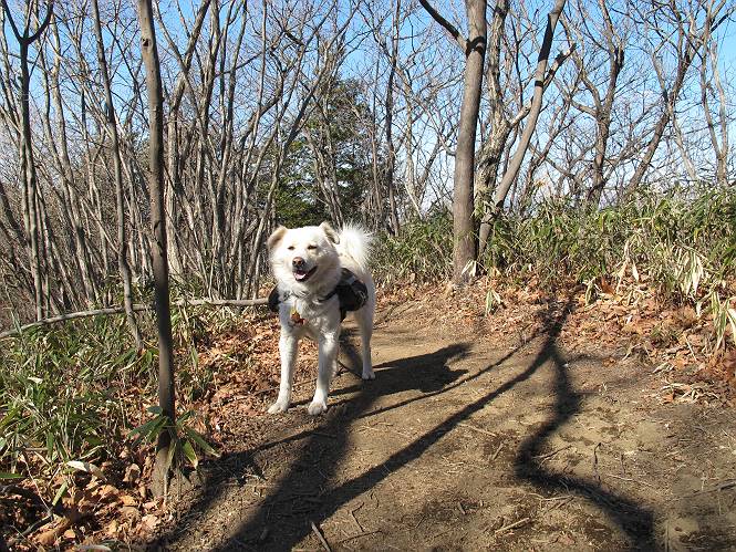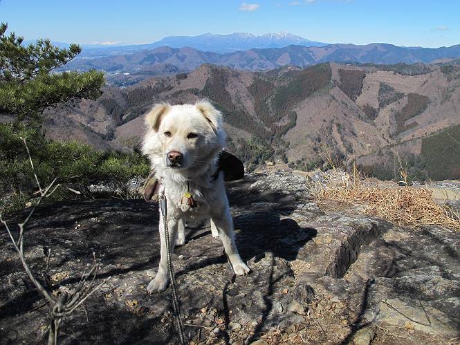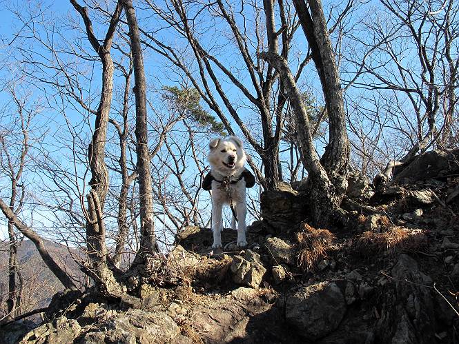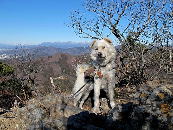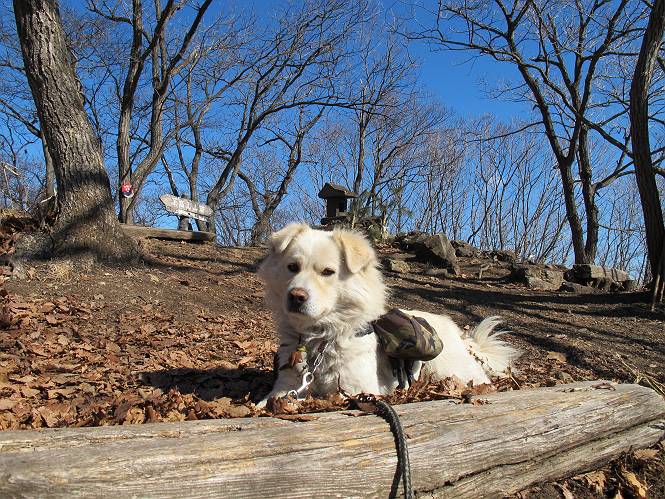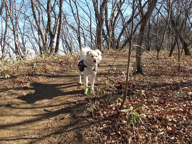 | 平成二十四年二月二十日 Before 写真集目次へ Next 「二十四節季の雨水が過ぎても寒いなあ、山のマンサクが咲き出しただろうか、忠治を連れて散策してくるか」、ということで、足利の石尊山と深高山を陽だまりハイクしてきました。 登山口の不動尊です。 杉森をしばらく歩きます。 もう少し進むと急坂になります。 いつも撮っている“女人禁制”の石碑です。 反対側に“登ったあとの ここちよさ”、と書いてあります。 桧林を抜けて雑木林に入りました。 ぎ木の階段を上れば尾根に出ます。 ベンチのある休憩所に出ました。 マンサクを探しに西の方向に進みました。 まだ蕾が小さくて、大分先になるようです。 まだだそうです、ベンチに戻って岩場に進みます。 ゴツゴツした岩場を上って見晴らしのきく場所に出ました。 遠く、富士山、八ヶ岳、浅間山、草津白根山、と赤城山が良く見えました。 写真をクリックすると大きくなるよ 赤城山です。 浅間山と手前は姥穴山です。 浅間山を大きくしました。 八ヶ岳です。 赤城山と榛名山の間に草津白根山が見えました。 赤城山を入れて撮ってもらいました。 釈迦岩だそうです。 奥の院だそうです。 奥の院の裏の広場にやって来ました。 東方向はモヤで、スカイツリーなんか見えるのですが、今日は見えません。 富士山は良く見えてます。 雑木のゆったりした尾根を進んで石尊山に着きました。 ここから明るい雑木林を、 上ったり下ったりしながら北方向に進みます。 男体山もクッキリ見えました。 深高山に着きました。 東に最近歩いた大岩-行道山が見えてます。 そして足利の街です。 オヤツをもらって お水もタップリ飲みました。 お父さんが食べ出しました。 おいしそうだなあ。 ぼくもほしいなあ。 「ちょうだい、ワン」、パンを少しもらいました。 少し休憩して、来た道を戻るそうです。 遊びながら雑木林を歩いてます、何かないかなあ。 あったぞ、見つけた。 フワフワの落葉です、良い感じですね。 石尊山を通って、 奥の院の広場まで戻りました。 ここは、ベンチがあって、景色も良いし、 芝生もあって、今日は暖かいし、良いねえ、寝転んでしまいました。 また、赤城山を入れて撮ってもらいました。 尾根のベンチまで下りました、もう少し下れば不動尊です。 今日は、10人ほど陽だまりハイクを楽しんでいる人に会いました。 Before 写真集目次へ Next |
