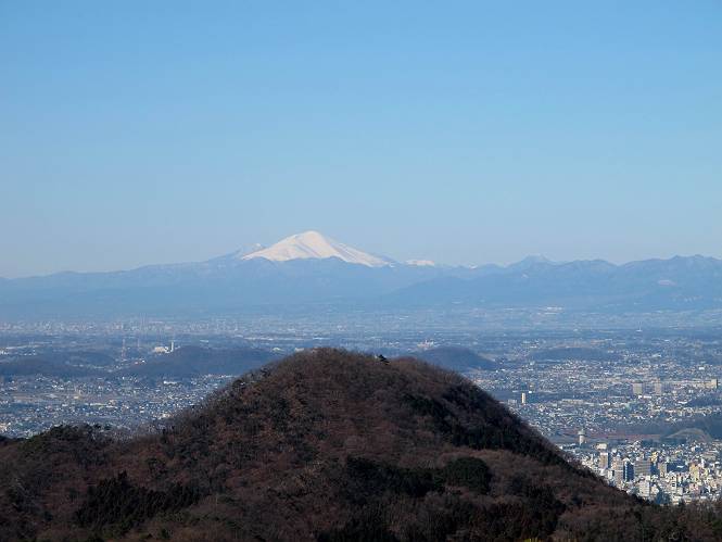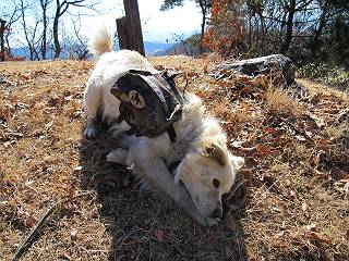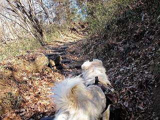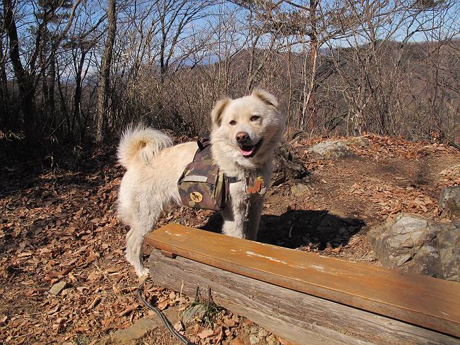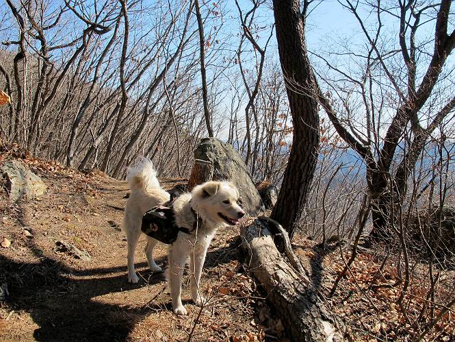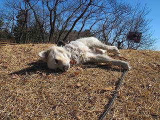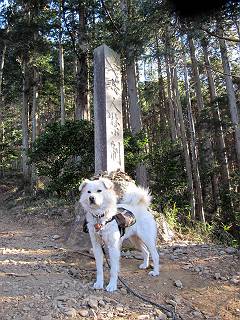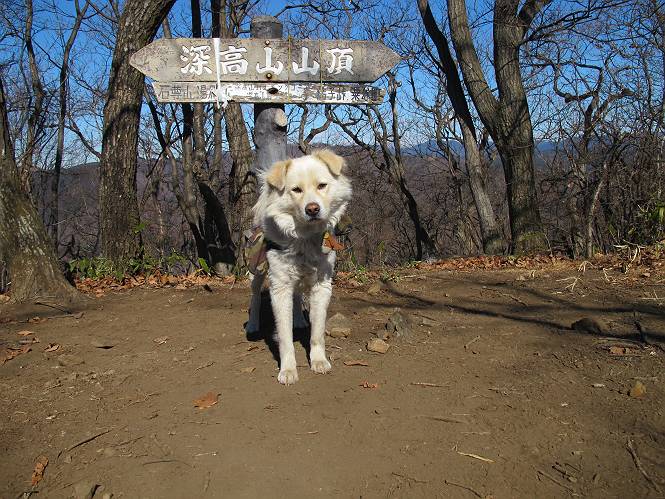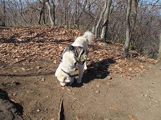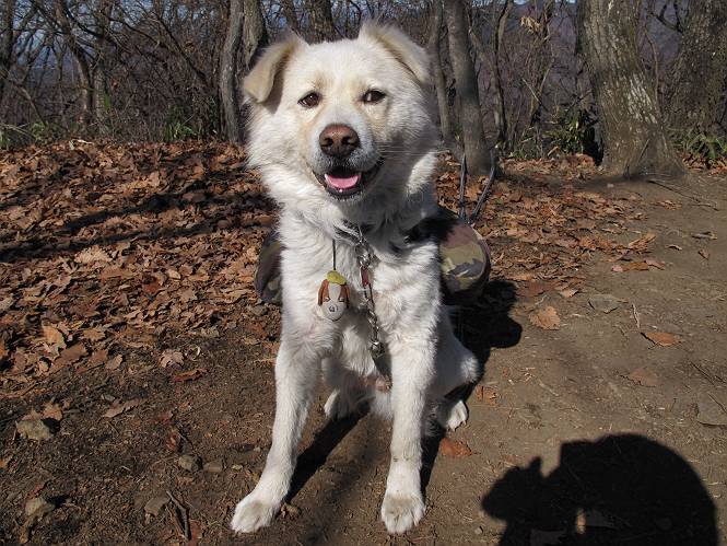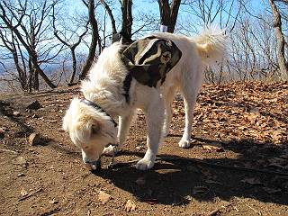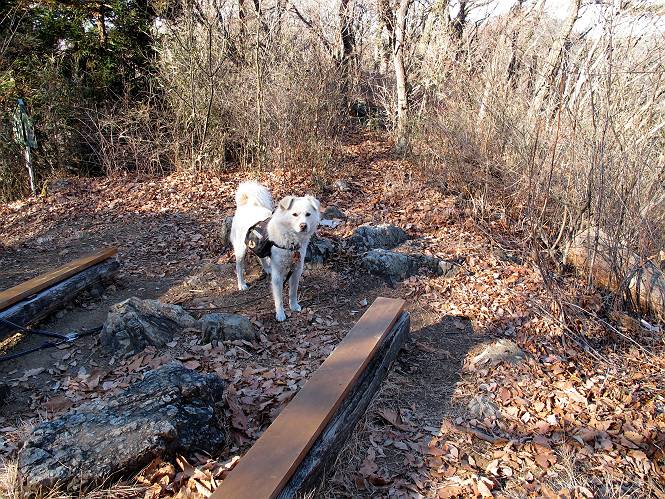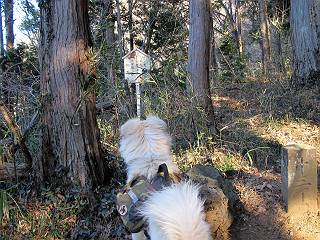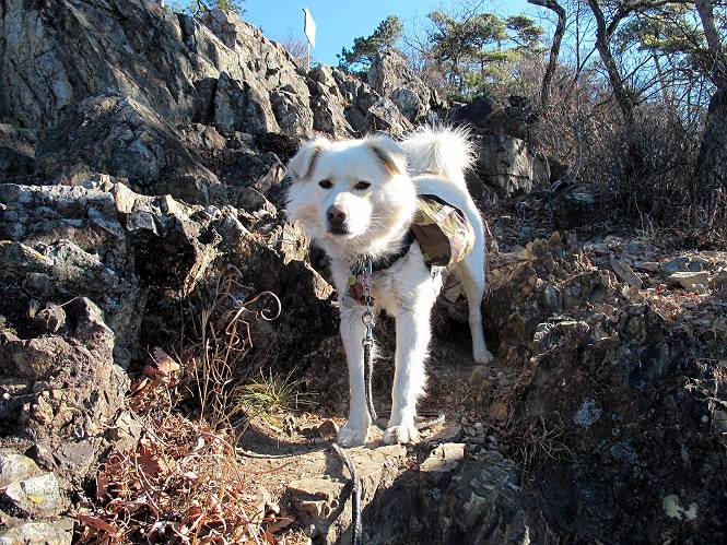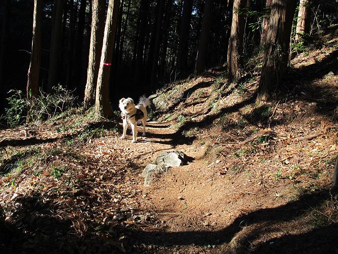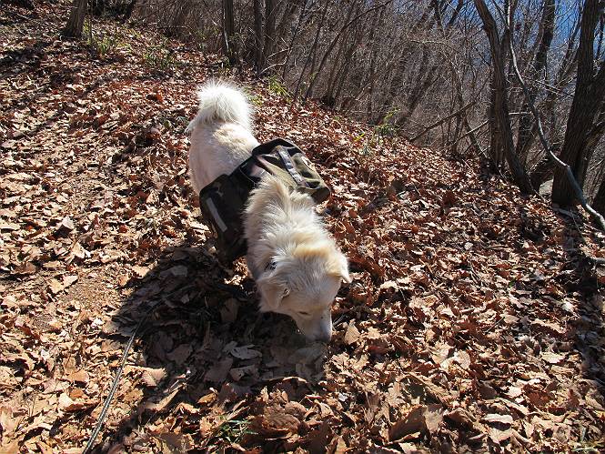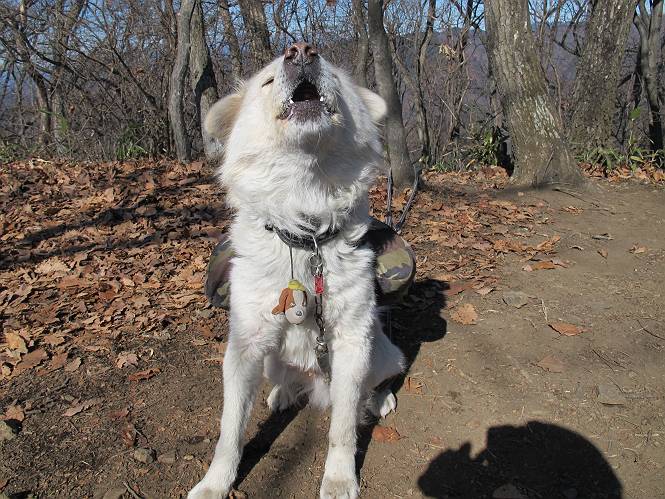| 平成二十四年二月二十日 Before 写真集目次へ Next 「二十四節季の雨水が過ぎても寒いなあ、山のマンサクが咲き出しただろうか、忠治を連れて散策してくるか」、ということで、足利の石尊山と深高山を陽だまりハイクしてきました。 登山口の不動尊です。 杉森をしばらく歩きます。 もう少し進むと急坂になります。 いつも撮っている“女人禁制”の石碑です。 反対側に“登ったあとの ここちよさ”、と書いてあります。 桧林を抜けて雑木林に入りました。 ぎ木の階段を上れば尾根に出ます。 ベンチのある休憩所に出ました。 マンサクを探しに西の方向に進みました。 まだ蕾が小さくて、大分先になるようです。 まだだそうです、ベンチに戻って岩場に進みます。 ゴツゴツした岩場を上って見晴らしのきく場所に出ました。 遠く、富士山、八ヶ岳、浅間山、草津白根山、と赤城山が良く見えました。 写真をクリックすると大きくなるよ 赤城山です。 浅間山と手前は姥穴山です。 浅間山を大きくしました。 八ヶ岳です。 赤城山と榛名山の間に草津白根山が見えました。 赤城山を入れて撮ってもらいました。 釈迦岩だそうです。 奥の院だそうです。 奥の院の裏の広場にやって来ました。 東方向はモヤで、スカイツリーなんか見えるのですが、今日は見えません。 富士山は良く見えてます。 雑木のゆったりした尾根を進んで石尊山に着きました。 ここから明るい雑木林を、 上ったり下ったりしながら北方向に進みます。 男体山もクッキリ見えました。 深高山に着きました。 東に最近歩いた大岩-行道山が見えてます。 そして足利の街です。 オヤツをもらって お水もタップリ飲みました。 お父さんが食べ出しました。 おいしそうだなあ。 ぼくもほしいなあ。 「ちょうだい、ワン」、パンを少しもらいました。 少し休憩して、来た道を戻るそうです。 遊びながら雑木林を歩いてます、何かないかなあ。 あったぞ、見つけた。 フワフワの落葉です、良い感じですね。 石尊山を通って、 奥の院の広場まで戻りました。 ここは、ベンチがあって、景色も良いし、 芝生もあって、今日は暖かいし、良いねえ、寝転んでしまいました。 また、赤城山を入れて撮ってもらいました。 尾根のベンチまで下りました、もう少し下れば不動尊です。 今日は、10人ほど陽だまりハイクを楽しんでいる人に会いました。 Before 写真集目次へ Next |