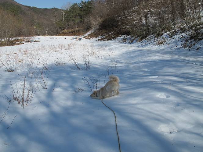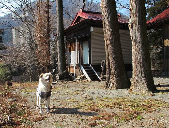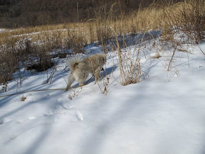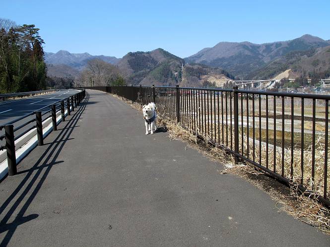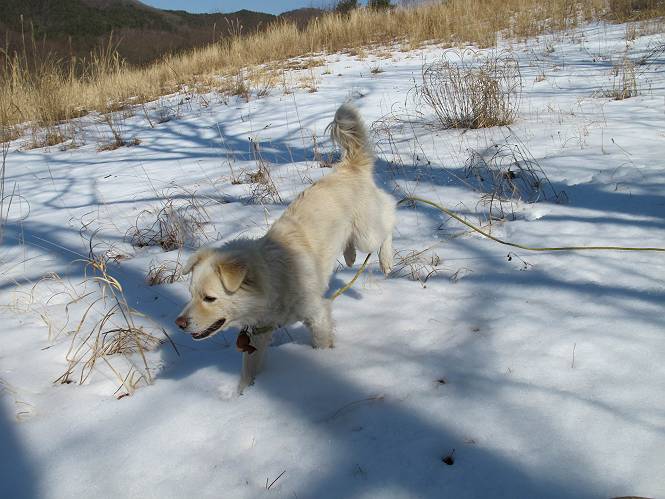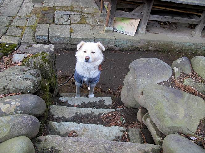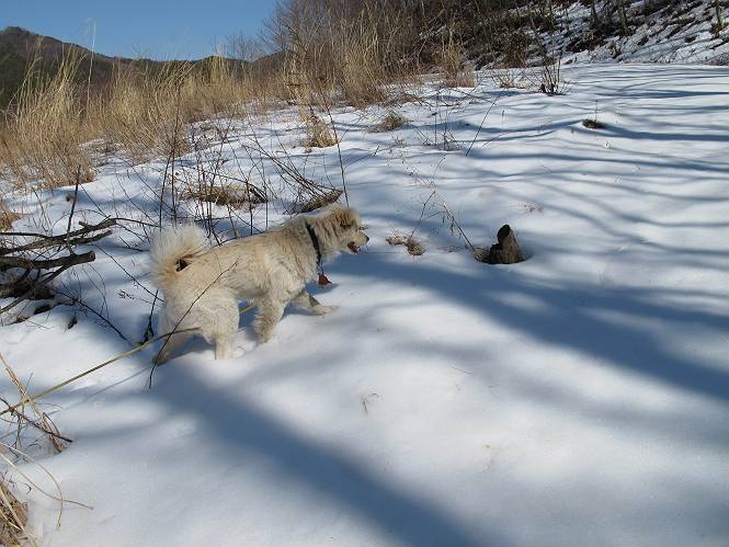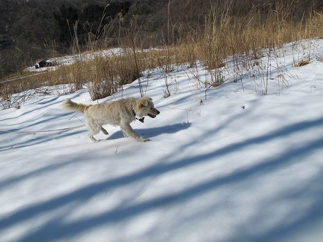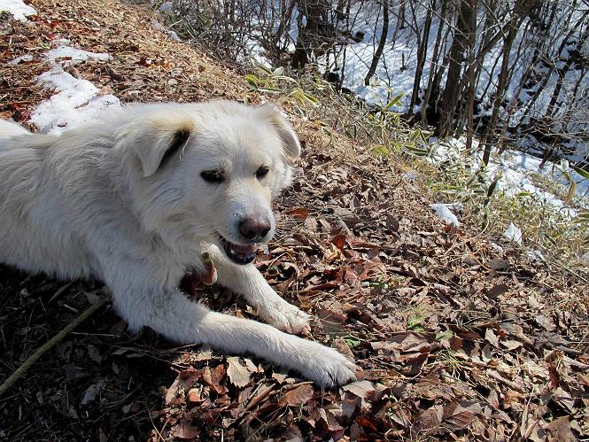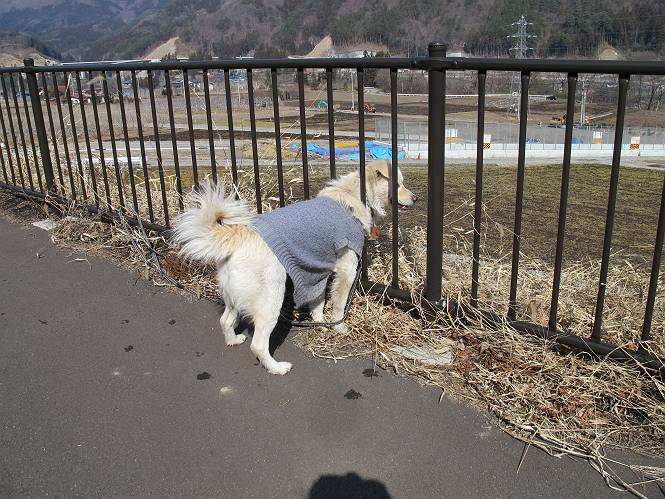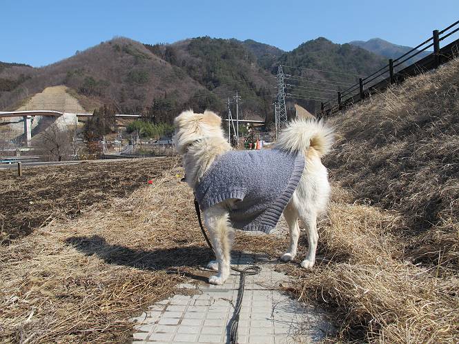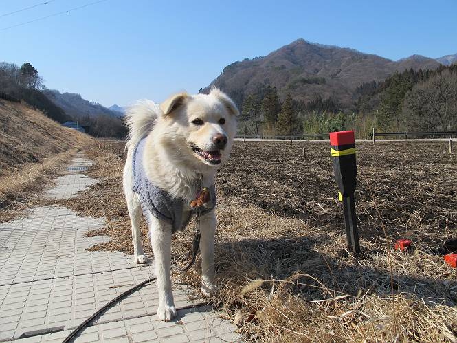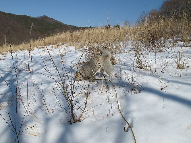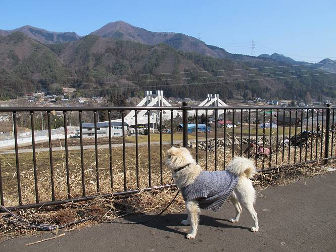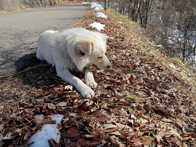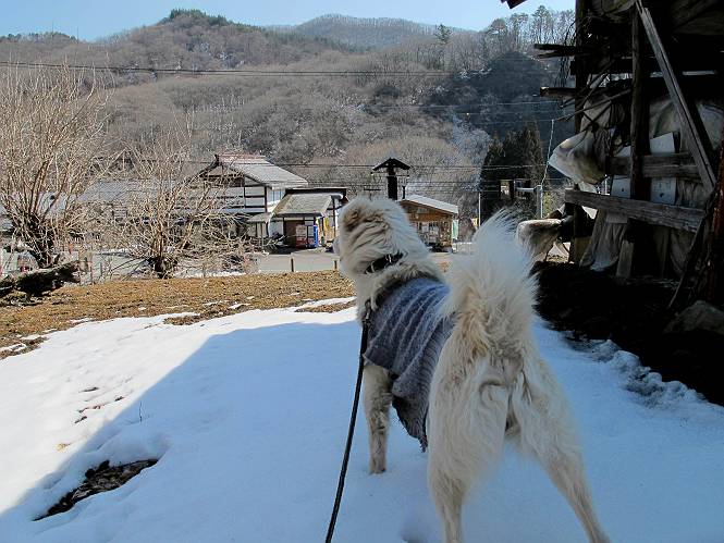| 平成二十四年二月二十四日 Before 写真集目次へ Next 今日は暖かくて良い天気なのでドライブに連れてってもらいました、お母さんも一緒です。行き先は、長野原方面だそうです。高速道路に乗って、ぼくは寝てしまって気づいたら東吾妻町のホームセンターでした。ここから少し走って松谷神社に立ち寄りました。 鳥居から建設中の大きな橋が見えてました。 神社の正面です。 大きな杉の木や、舞台があったり、歴史のありそうな神社だと言ってました。 左が獅子舞の舞台 拝殿の奥に立派な奥宮があります。 ぼくも上って見たいなあ。 また少し走って天狗の湯に来ました。 新しい道路が山の方に見えてます。 お母さんが温泉に入っている間に周辺を散策しました。 造成中の公園(?)の周りを歩いてます。 暖かくて気持ち良いですよ。 吾妻川に出られそうなので入ってみました。 ヤブを漕いで出たところは高圧線の鉄塔で行止まってしまいました。 お母さんも乗って、温泉の先で南方向に走り、雪があったので山際を散策しました。 少し凍っていて気持ち良かったです。 あっちへ行ってみよう。 道路を渡ってほどうを歩いてます。 あちらこちら沢山工事をしているようです、さきほど見た大きな橋も直ぐそこです。 スゴイ工事だなあ、家、道、橋、山の斜面・・・・。 工事場と山を入れて撮ってもらいました。 国道を草津方面に走って、川原湯温泉を通って、長野原草津口駅の先で野反湖方面に入りました。草津白根山がクッキリ見えてました。 白砂川の向こうは日影集落のようです。 白砂川にはツララが沢山できてました また、野反湖方面に少し走るときれいな山間の集落が見えました。 写真をクリックすると大きくなるよ 重要伝統的建造物群保存地区「六合赤岩」の集落だそうです。 ![]() 写真をクリックすると大きくなるよ また少し走って、道の駅“六合”に出ました。お母さんが買い物をしている間に、ちょっと周辺を散策しました。「さあ、道路を渡って山際に行こう」 山際の畑から道の駅を見下ろしてます。 今度は道の反対側に来ました。山の下に白砂川が流れています。 お母さんが呼んでいるようです。 「オヤツですか、ぼくお腹がすいたなあ」、家から持って来たオヤツをいっぱい頂きました。 ちょっと戻って暮坂峠方面の道に入りました。また草津白根山がきれいに見えました。 「きれいですね、沢山雪があるようですね」 暮坂峠の少し手前で林道に入りました。絶好の遊び場を見つけました。しばらく雪遊びをします。 ここは道のようですね、きれいな雪がいっぱいあります、真っ直ぐ行こうかな。 何のニオイだろう、良い感じ。 道の下は草むらになってます。長いリードをつけてもらって、ぼくの行きたいところへスイスイと。 良いな、良いな、♪♪♪ 大分上ってきたなあ あれっ、何だろう。 何の足跡かな。 そっちだ、それっ!! うーむ、下だなあ。 あっ、滑っちゃった。 それっ、走れ! むちゃくちゃ、走っちゃおう、走れ、走れ。 茂みに入っちゃったよ、ここからも草津白根山がきれいでした。 そろそろ下に遊びながら戻ります。 気になります、何だろうこのニオイ。 きれいな雪だなあ、真っ白。 ふーむ。 がぼっ、がぼっ。 ああ、楽しかった、雪遊び。 オヤツにもらったガムを食べてます。 おいしかった、「まだ遊んでいたいんだけど」、「???」 暮坂峠で一休みして、またあちこち立ち寄ったようです。 ぼくはハッチで寝てました。 Before 写真集目次へ Next |