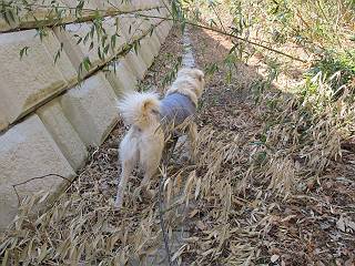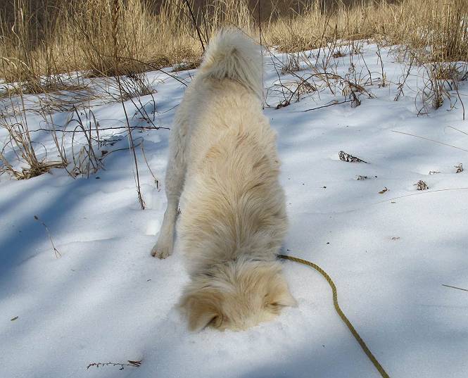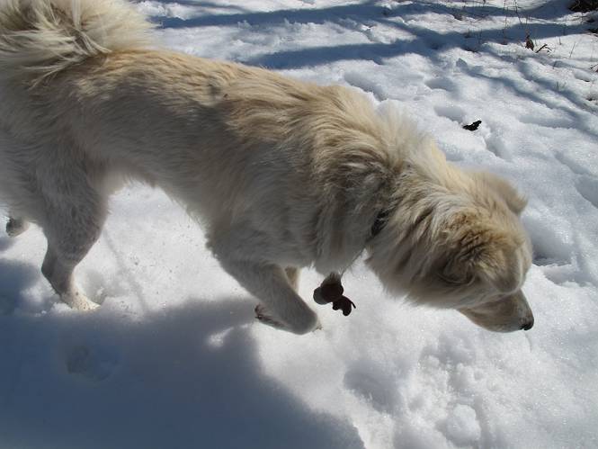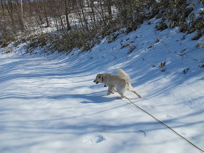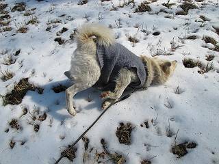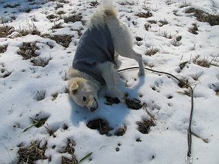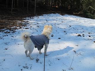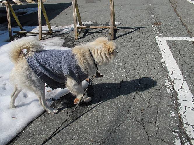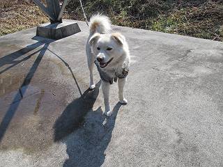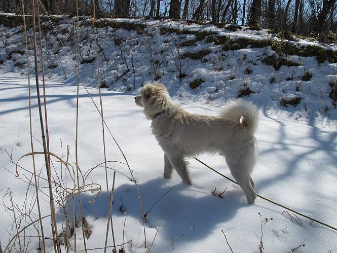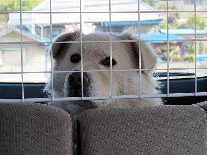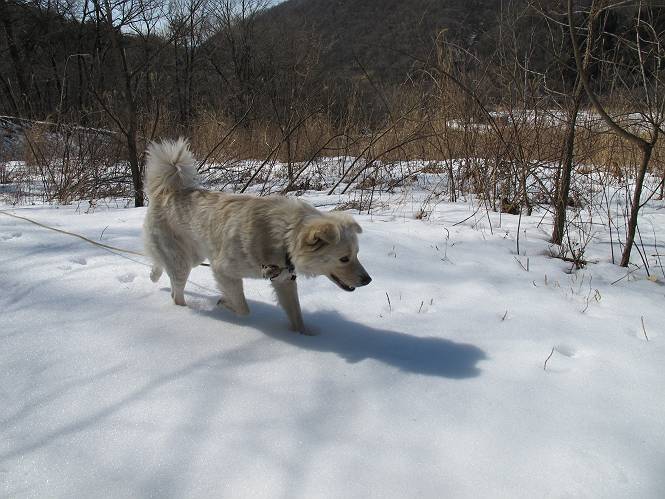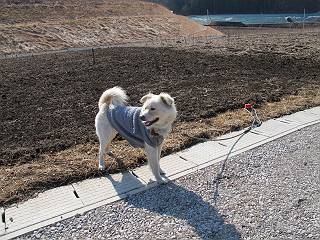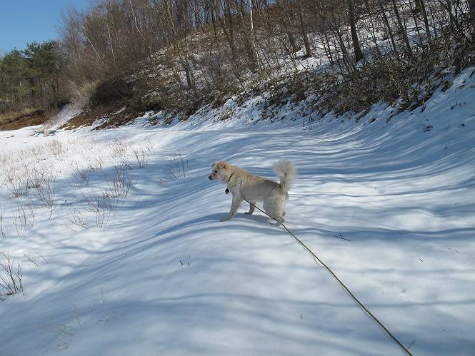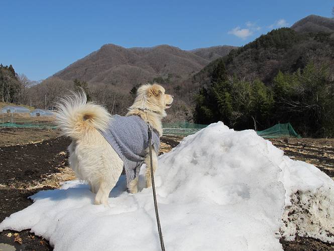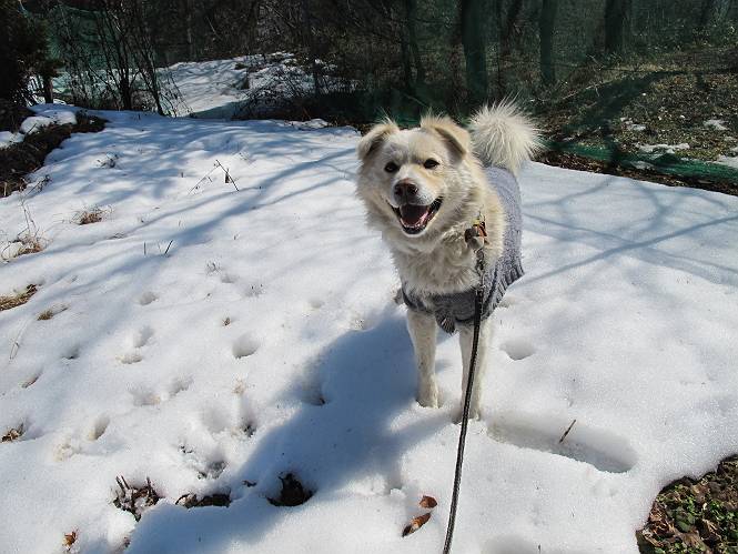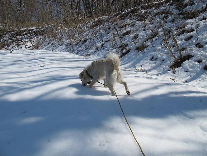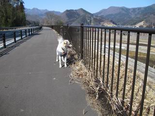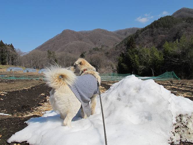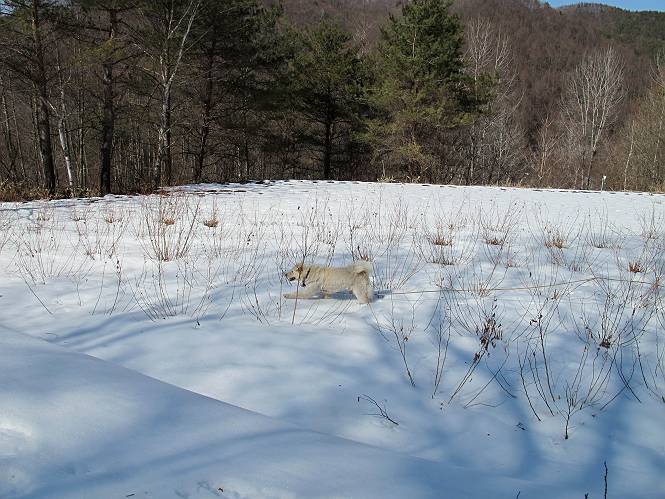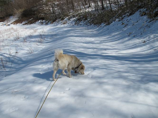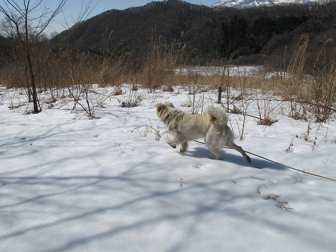 | 平成二十四年二月二十四日 Before 写真集目次へ Next 今日は暖かくて良い天気なのでドライブに連れてってもらいました、お母さんも一緒です。行き先は、長野原方面だそうです。高速道路に乗って、ぼくは寝てしまって気づいたら東吾妻町のホームセンターでした。ここから少し走って松谷神社に立ち寄りました。 鳥居から建設中の大きな橋が見えてました。 神社の正面です。 大きな杉の木や、舞台があったり、歴史のありそうな神社だと言ってました。 左が獅子舞の舞台 拝殿の奥に立派な奥宮があります。 ぼくも上って見たいなあ。 また少し走って天狗の湯に来ました。 新しい道路が山の方に見えてます。 お母さんが温泉に入っている間に周辺を散策しました。 造成中の公園(?)の周りを歩いてます。 暖かくて気持ち良いですよ。 吾妻川に出られそうなので入ってみました。 ヤブを漕いで出たところは高圧線の鉄塔で行止まってしまいました。 お母さんも乗って、温泉の先で南方向に走り、雪があったので山際を散策しました。 少し凍っていて気持ち良かったです。 あっちへ行ってみよう。 道路を渡ってほどうを歩いてます。 あちらこちら沢山工事をしているようです、さきほど見た大きな橋も直ぐそこです。 スゴイ工事だなあ、家、道、橋、山の斜面・・・・。 工事場と山を入れて撮ってもらいました。 国道を草津方面に走って、川原湯温泉を通って、長野原草津口駅の先で野反湖方面に入りました。草津白根山がクッキリ見えてました。 白砂川の向こうは日影集落のようです。 白砂川にはツララが沢山できてました また、野反湖方面に少し走るときれいな山間の集落が見えました。 写真をクリックすると大きくなるよ 重要伝統的建造物群保存地区「六合赤岩」の集落だそうです。 ![]() 写真をクリックすると大きくなるよ また少し走って、道の駅“六合”に出ました。お母さんが買い物をしている間に、ちょっと周辺を散策しました。「さあ、道路を渡って山際に行こう」 山際の畑から道の駅を見下ろしてます。 今度は道の反対側に来ました。山の下に白砂川が流れています。 お母さんが呼んでいるようです。 「オヤツですか、ぼくお腹がすいたなあ」、家から持って来たオヤツをいっぱい頂きました。 ちょっと戻って暮坂峠方面の道に入りました。また草津白根山がきれいに見えました。 「きれいですね、沢山雪があるようですね」 暮坂峠の少し手前で林道に入りました。絶好の遊び場を見つけました。しばらく雪遊びをします。 ここは道のようですね、きれいな雪がいっぱいあります、真っ直ぐ行こうかな。 何のニオイだろう、良い感じ。 道の下は草むらになってます。長いリードをつけてもらって、ぼくの行きたいところへスイスイと。 良いな、良いな、♪♪♪ 大分上ってきたなあ あれっ、何だろう。 何の足跡かな。 そっちだ、それっ!! うーむ、下だなあ。 あっ、滑っちゃった。 それっ、走れ! むちゃくちゃ、走っちゃおう、走れ、走れ。 茂みに入っちゃったよ、ここからも草津白根山がきれいでした。 そろそろ下に遊びながら戻ります。 気になります、何だろうこのニオイ。 きれいな雪だなあ、真っ白。 ふーむ。 がぼっ、がぼっ。 ああ、楽しかった、雪遊び。 オヤツにもらったガムを食べてます。 おいしかった、「まだ遊んでいたいんだけど」、「???」 暮坂峠で一休みして、またあちこち立ち寄ったようです。 ぼくはハッチで寝てました。 Before 写真集目次へ Next |