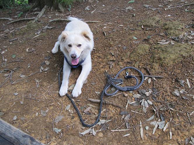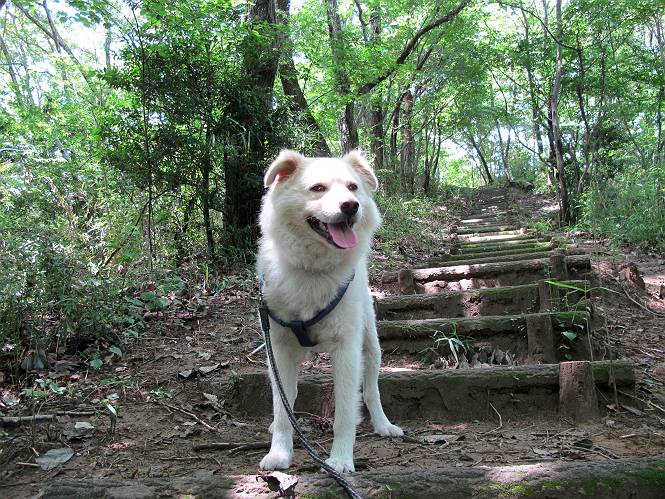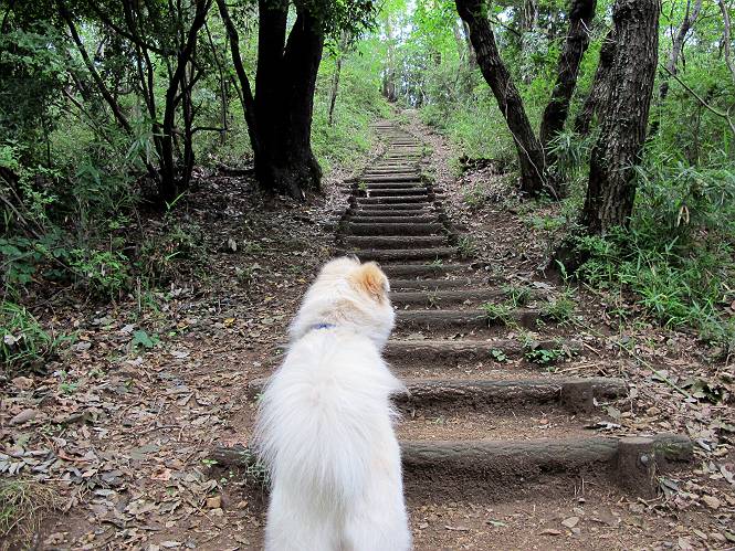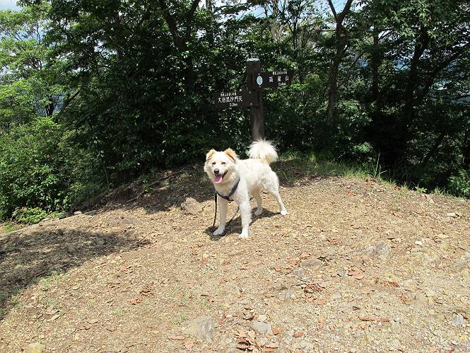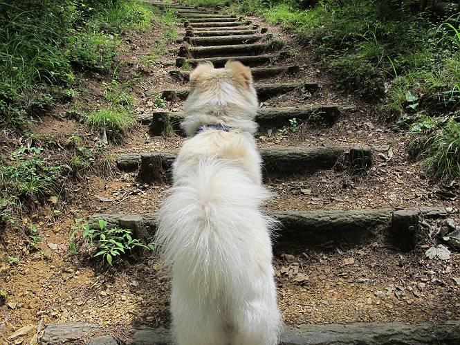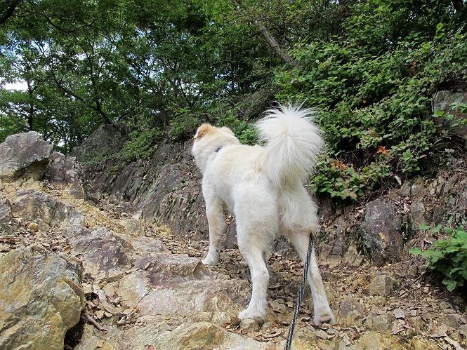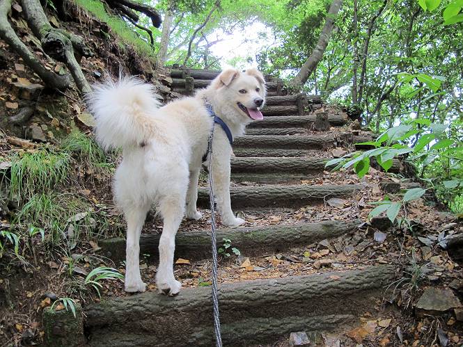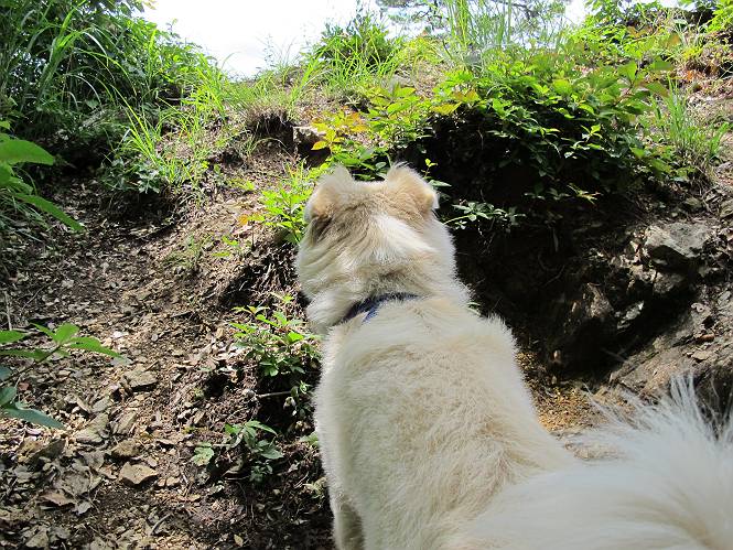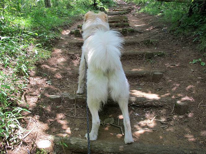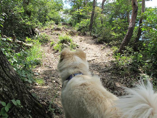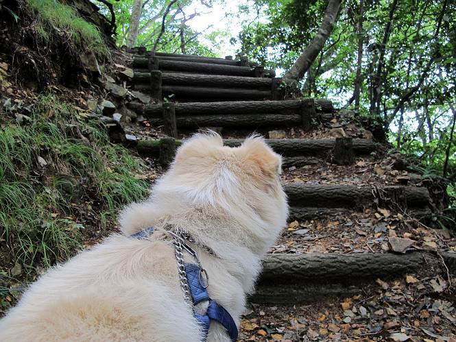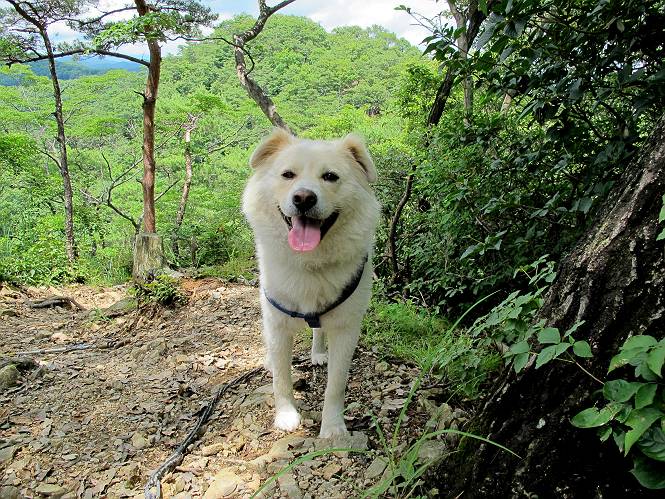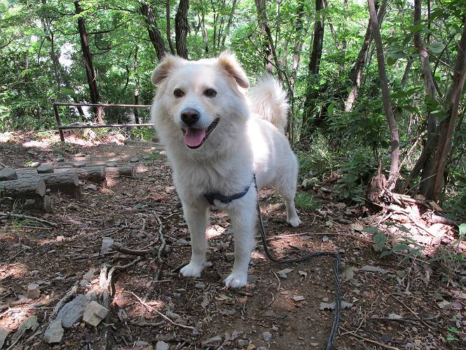 | 平成二十四年七月二日 Before 写真集目次へ Next 昼から晴れ上がりましたので、足利の両崖山に連れてってもらいました。歩き始めは木陰が涼しくて、気持ちよかったのですが、坂道を登ったりの連続で。暑くてたまりませんでした。 林道から丸太の階段を上ってきました。ここから下ってまた上ります。 2つ目のピークです。後ろに見える山は太田の金山です。 また下ってます。 暑いけれど木陰があって、結構気持ち良いですよ。 今度は上ります。 別な道と合流しました。おじさんとおばさんがお休みしてます。 「どきましょうか」、なんて親切言ってくれましたが、「大丈夫です、ごゆっくり」、ってお父さんが言いました。木陰でちょっとお休みしました。 岩場を下ってますが、暑くてたまりません。 お水をもらって、いくらか涼しく感じます。 次のピーク、4つ目かな、後ろが両崖山です。 もう一度下って、登り返せば山頂です。 最後の長い上りでーす。 もう少し、ね。 「お父さん、汗を拭くのが大変ですね」、「良い汗だけど、あちいなあ」 両崖山の山頂到着です。 お休みです。今日はダニよけスプレーをかけてきました、ダニ、つかなかったかな。 お水を飲んで、オヤツを頂きました。 お父さんが「お参りしてきな」、って言ってますので、 御嶽神社にお参りしました、ワン。 「さあ、下りましょう」 階段、長いでしょう。 登りが暑くてね、参りました。 お休みしたいなあ。 木陰でお休みしてまーす。 南方向の天狗山です。 北方向の大岩山です。 オカトラノオが咲いていました。ぼくの尻尾の方がデラックスでしょう。 もう出発ですか? もう少し休みましょう。 また上りだ、 ヘトヘトになっちゃったよ。 また、お休みです。 今日は、ここのピークを下った所からショートカットして林道に下って、車に戻りました。 まだ暑さはこれからですよね。頑張んなくっちゃね。ぼく、つらいけど負けないよ。 Before 写真集目次へ Next |