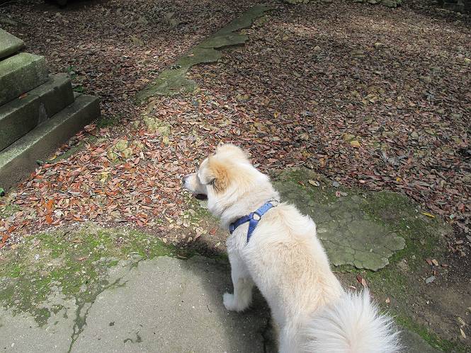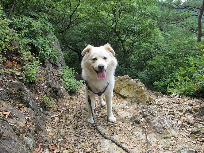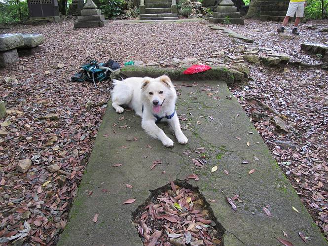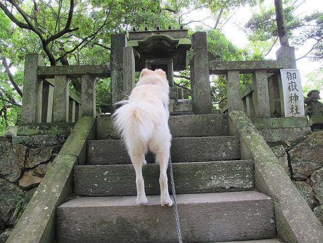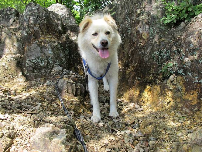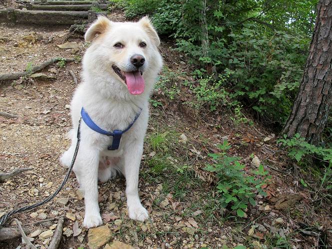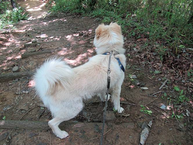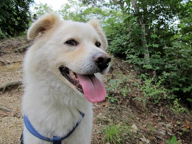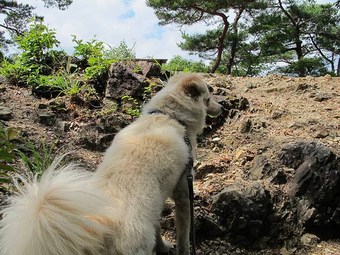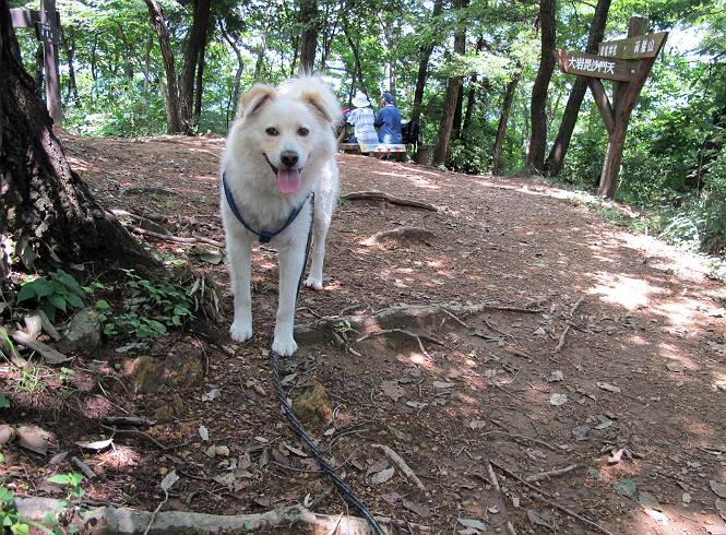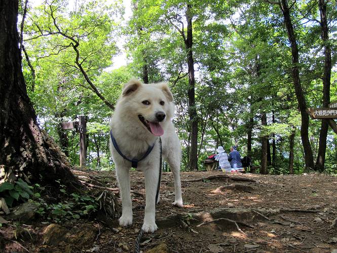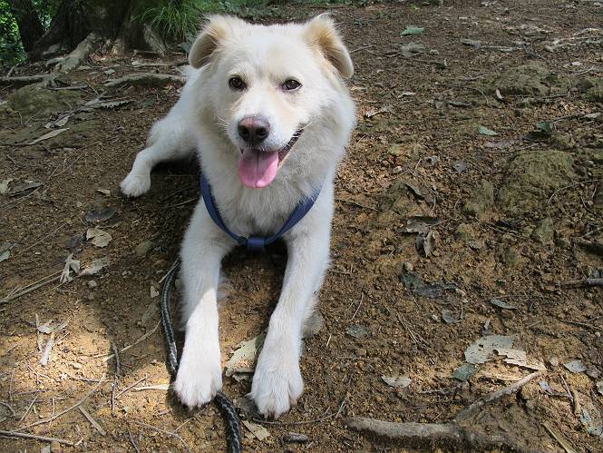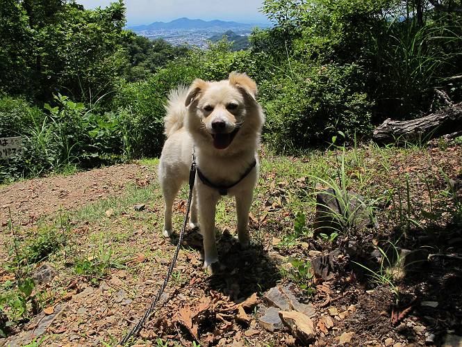 | 平成二十四年七月二日 Before 写真集目次へ Next 昼から晴れ上がりましたので、足利の両崖山に連れてってもらいました。歩き始めは木陰が涼しくて、気持ちよかったのですが、坂道を登ったりの連続で。暑くてたまりませんでした。 林道から丸太の階段を上ってきました。ここから下ってまた上ります。 2つ目のピークです。後ろに見える山は太田の金山です。 また下ってます。 暑いけれど木陰があって、結構気持ち良いですよ。 今度は上ります。 別な道と合流しました。おじさんとおばさんがお休みしてます。 「どきましょうか」、なんて親切言ってくれましたが、「大丈夫です、ごゆっくり」、ってお父さんが言いました。木陰でちょっとお休みしました。 岩場を下ってますが、暑くてたまりません。 お水をもらって、いくらか涼しく感じます。 次のピーク、4つ目かな、後ろが両崖山です。 もう一度下って、登り返せば山頂です。 最後の長い上りでーす。 もう少し、ね。 「お父さん、汗を拭くのが大変ですね」、「良い汗だけど、あちいなあ」 両崖山の山頂到着です。 お休みです。今日はダニよけスプレーをかけてきました、ダニ、つかなかったかな。 お水を飲んで、オヤツを頂きました。 お父さんが「お参りしてきな」、って言ってますので、 御嶽神社にお参りしました、ワン。 「さあ、下りましょう」 階段、長いでしょう。 登りが暑くてね、参りました。 お休みしたいなあ。 木陰でお休みしてまーす。 南方向の天狗山です。 北方向の大岩山です。 オカトラノオが咲いていました。ぼくの尻尾の方がデラックスでしょう。 もう出発ですか? もう少し休みましょう。 また上りだ、 ヘトヘトになっちゃったよ。 また、お休みです。 今日は、ここのピークを下った所からショートカットして林道に下って、車に戻りました。 まだ暑さはこれからですよね。頑張んなくっちゃね。ぼく、つらいけど負けないよ。 Before 写真集目次へ Next |