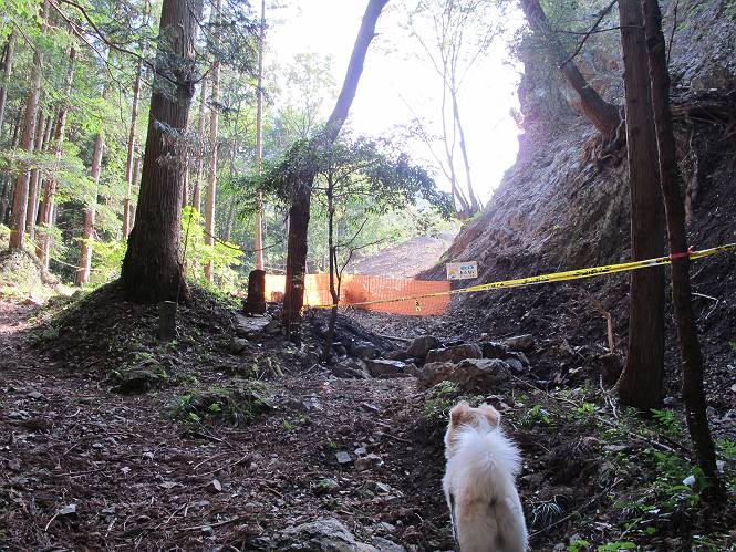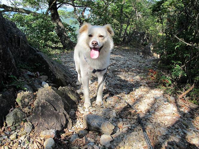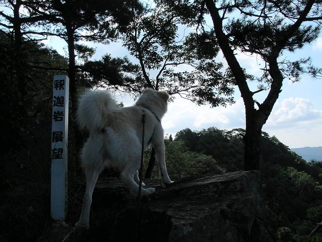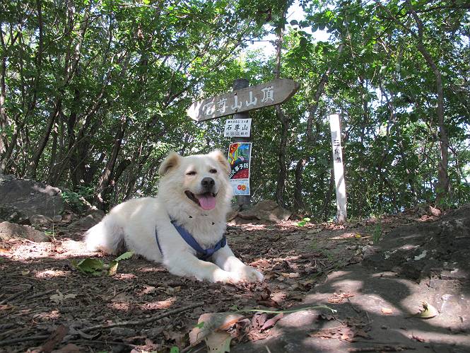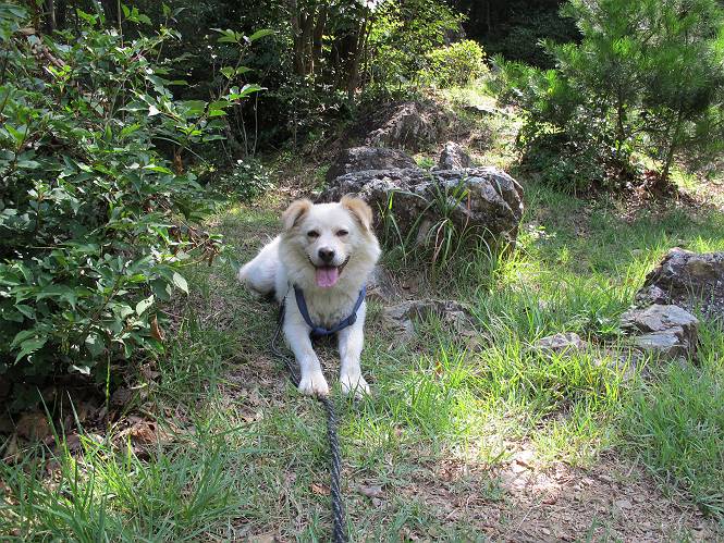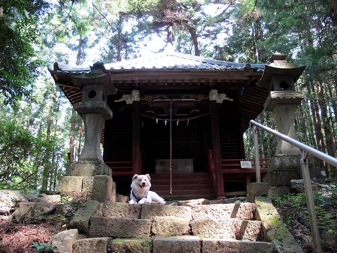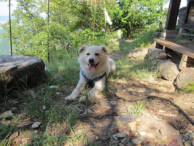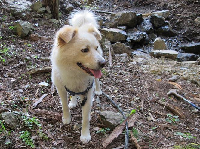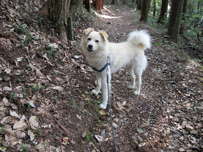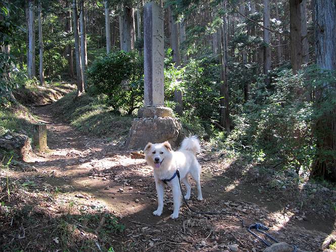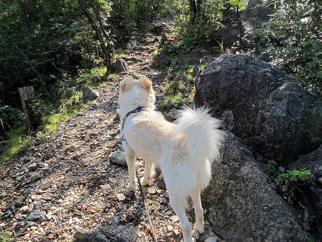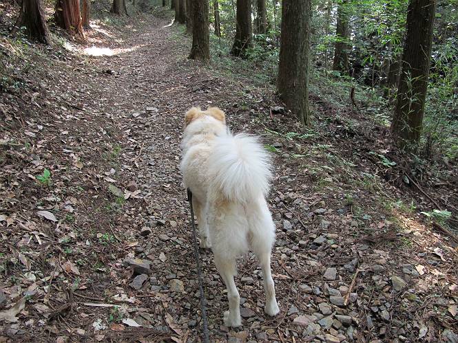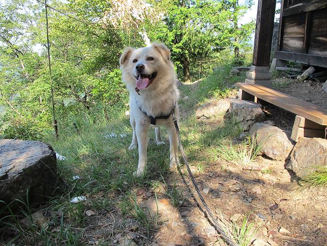 | 平成二十四年八月九日 Before 写真集目次へ Next 朝の涼しいうちに、足利の石尊山へ連れてってもらいました。低い山ですが木漏れ日の道は涼しく、あまり激しい息切れもしませんでした。登山口にある石尊不動尊の梵天祭り(8月14日)の準備も進んでいるようです。 この長い15mもある杉の丸太を大勢の人で石尊神社奥ノ宮の広場(見晴)まで引っ張り揚げて、お祭りを行うそうです。 下の案内板に、詳しいことがかかれているそうです。その模様を全国のお祭りをレポして歩いている“ツトムさん家の写真日記”をリンクしておきます。(2010/8/14に撮ったものだそうです) さー、出発です。 杉林の中を小さい沢に沿って進んで行きます。 「あれっ、なんだ、これは」、「南の砕石がここまで進んできたのかなあ」 「石仏の顔が怒っているよ」、「そう見えるね」 「そっちへ入ってはダメ」、「ハイ、直ぐ出ます」 でも、ちょっぴり明るくなって良い感じもするね。 根っ子だらけの急斜面を上って、女人禁制の石碑までやってきました。もう少しで尾根にでます。 尾根に出たベンチのあるところで、ワンちゃんを連れた人が休んでいました。停まっていたもう一台の方のようです。挨拶をして、そのまま岩場へ進んできました。 ガラガラ音のしている下の採石場が良く見えてます。 下の採石場です、後は湯殿山です。 右奥はぼくん家の方向です。 釈迦岩展望、はじめて上りました、釈迦岩が東方向に良く見えます。 少し進みました。ここも良い景色ですよ。 この辺は岩だらけです、どこからでも上がれちゃうんだよ。 石尊神社 奥ノ宮に着きました。 奥ノ宮です。 ここから見た南方向の景色です。 少し景色を見ながらお休み中です。 奥ノ宮の後ろの広場です。ここまであの丸太を引っ張り揚げるんですって、大変ですね。 そして、いろいろつけて、後に取り付けて、お祭りの始まり、始まりですってさ。 広場から小さい峰を2つ越えて石尊山山頂に到着しました。 お水とオヤツを頂いてます。 ダニよけスプレーをかけられて、スリスリしてしまいました。ゴミだらけになっちゃったよ。 広場に戻ってきましたが、 まだ、ワンちゃんを連れた人、来ないようです、どうしたのかな。 岩場を下り始めると、正面に綿のような雲が沢山浮かんでました。 会いましたよ、いました、また岩場で休んでました。 ぼくもちょっと下でお休みしてます。お父さんは、いろいろ話してましたよ。 また少し下って、杉林に入るところの木陰でお休みです。 杉林の急斜面を下って 水場で沢山お水を飲みました、冷たくて美味しかったです。 石尊不動尊到着です。 駐車場に着きました、今日は石尊山だけだったので、ぼく疲れてないよ。また連れて来てね。 Before 写真集目次へ Next |
