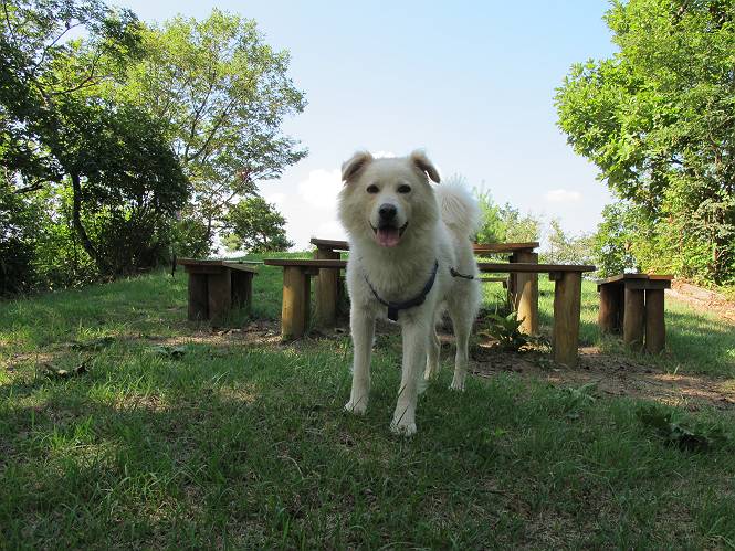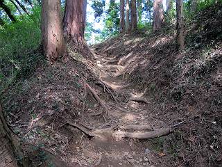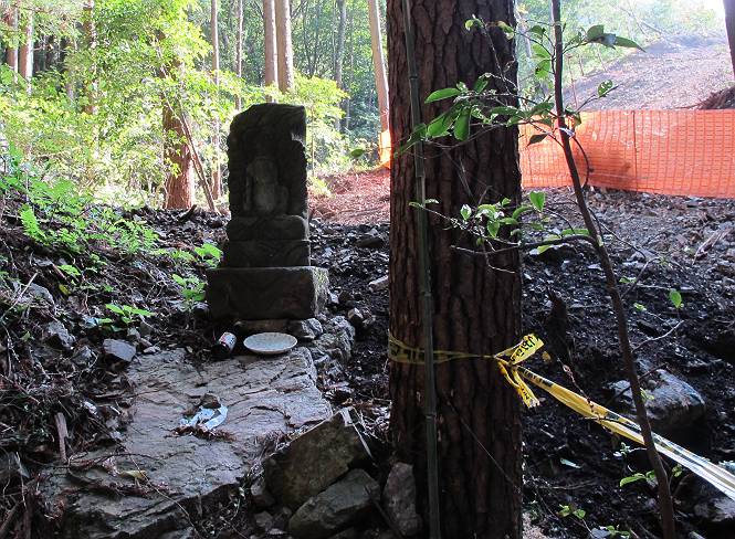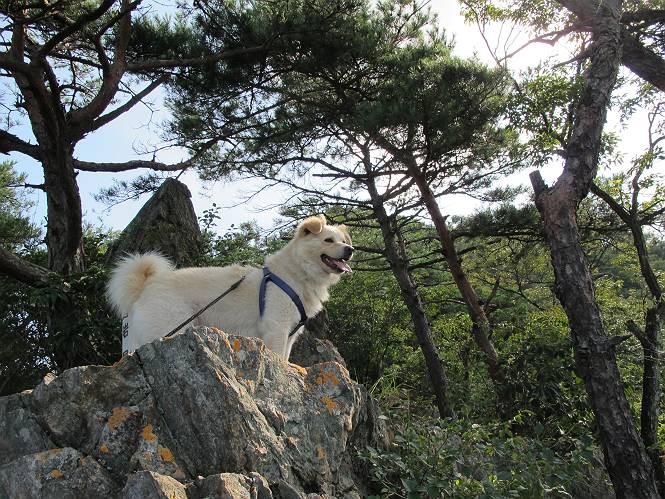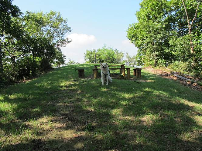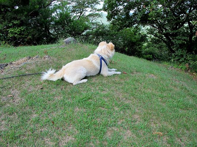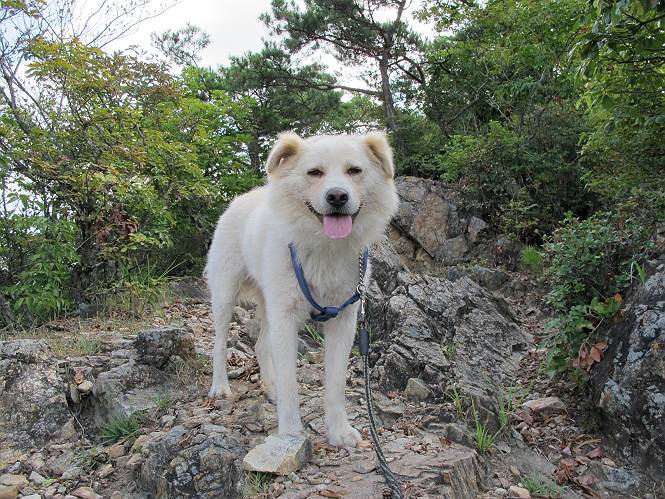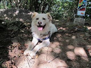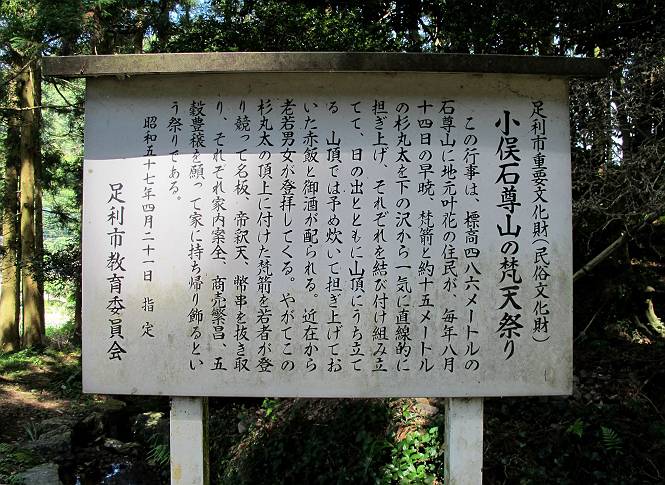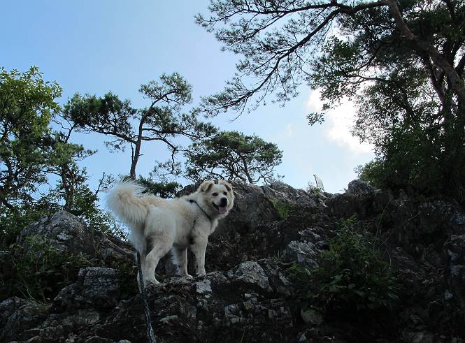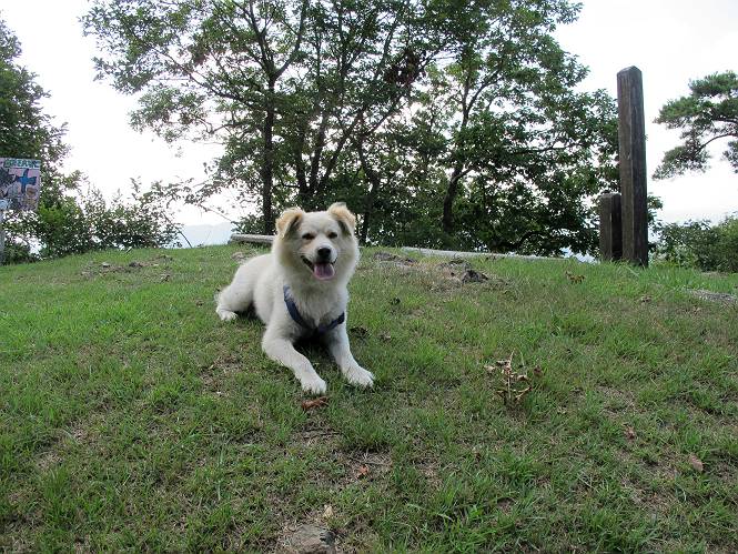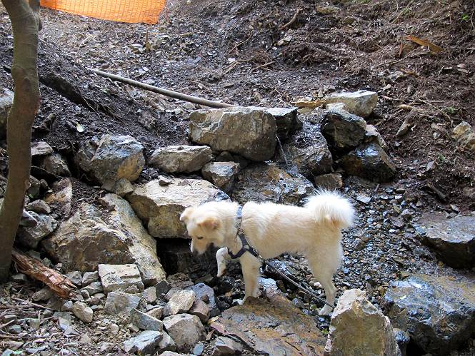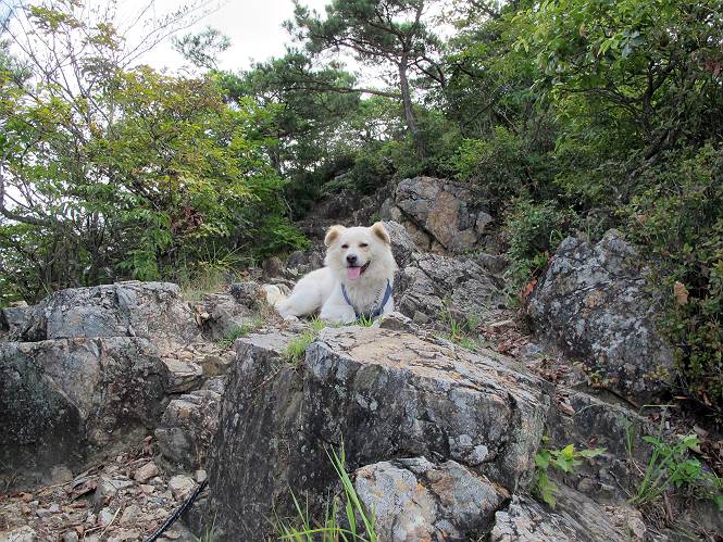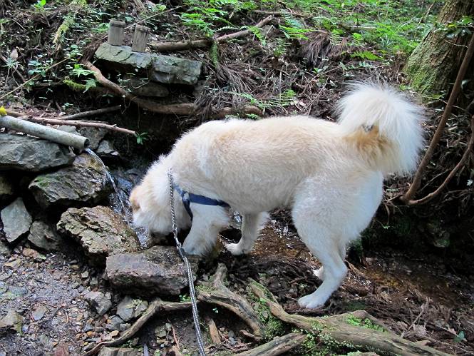 | 平成二十四年八月九日 Before 写真集目次へ Next 朝の涼しいうちに、足利の石尊山へ連れてってもらいました。低い山ですが木漏れ日の道は涼しく、あまり激しい息切れもしませんでした。登山口にある石尊不動尊の梵天祭り(8月14日)の準備も進んでいるようです。 この長い15mもある杉の丸太を大勢の人で石尊神社奥ノ宮の広場(見晴)まで引っ張り揚げて、お祭りを行うそうです。 下の案内板に、詳しいことがかかれているそうです。その模様を全国のお祭りをレポして歩いている“ツトムさん家の写真日記”をリンクしておきます。(2010/8/14に撮ったものだそうです) さー、出発です。 杉林の中を小さい沢に沿って進んで行きます。 「あれっ、なんだ、これは」、「南の砕石がここまで進んできたのかなあ」 「石仏の顔が怒っているよ」、「そう見えるね」 「そっちへ入ってはダメ」、「ハイ、直ぐ出ます」 でも、ちょっぴり明るくなって良い感じもするね。 根っ子だらけの急斜面を上って、女人禁制の石碑までやってきました。もう少しで尾根にでます。 尾根に出たベンチのあるところで、ワンちゃんを連れた人が休んでいました。停まっていたもう一台の方のようです。挨拶をして、そのまま岩場へ進んできました。 ガラガラ音のしている下の採石場が良く見えてます。 下の採石場です、後は湯殿山です。 右奥はぼくん家の方向です。 釈迦岩展望、はじめて上りました、釈迦岩が東方向に良く見えます。 少し進みました。ここも良い景色ですよ。 この辺は岩だらけです、どこからでも上がれちゃうんだよ。 石尊神社 奥ノ宮に着きました。 奥ノ宮です。 ここから見た南方向の景色です。 少し景色を見ながらお休み中です。 奥ノ宮の後ろの広場です。ここまであの丸太を引っ張り揚げるんですって、大変ですね。 そして、いろいろつけて、後に取り付けて、お祭りの始まり、始まりですってさ。 広場から小さい峰を2つ越えて石尊山山頂に到着しました。 お水とオヤツを頂いてます。 ダニよけスプレーをかけられて、スリスリしてしまいました。ゴミだらけになっちゃったよ。 広場に戻ってきましたが、 まだ、ワンちゃんを連れた人、来ないようです、どうしたのかな。 岩場を下り始めると、正面に綿のような雲が沢山浮かんでました。 会いましたよ、いました、また岩場で休んでました。 ぼくもちょっと下でお休みしてます。お父さんは、いろいろ話してましたよ。 また少し下って、杉林に入るところの木陰でお休みです。 杉林の急斜面を下って 水場で沢山お水を飲みました、冷たくて美味しかったです。 石尊不動尊到着です。 駐車場に着きました、今日は石尊山だけだったので、ぼく疲れてないよ。また連れて来てね。 Before 写真集目次へ Next |