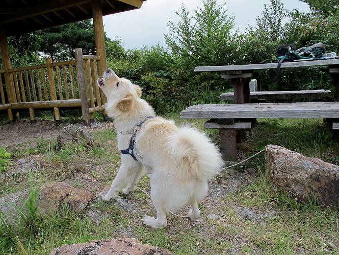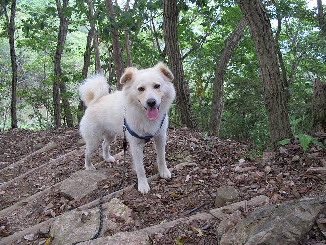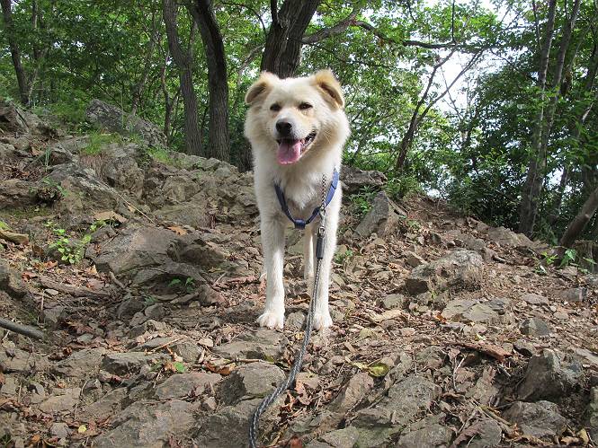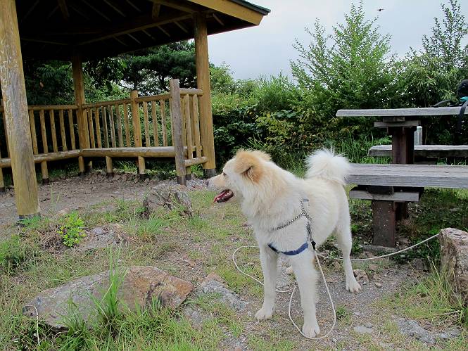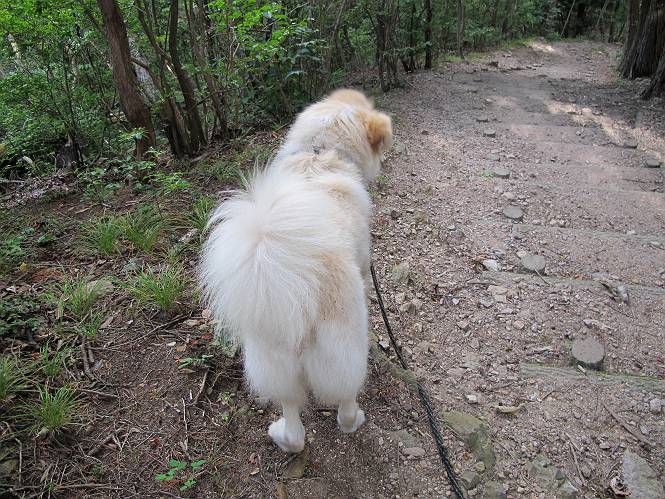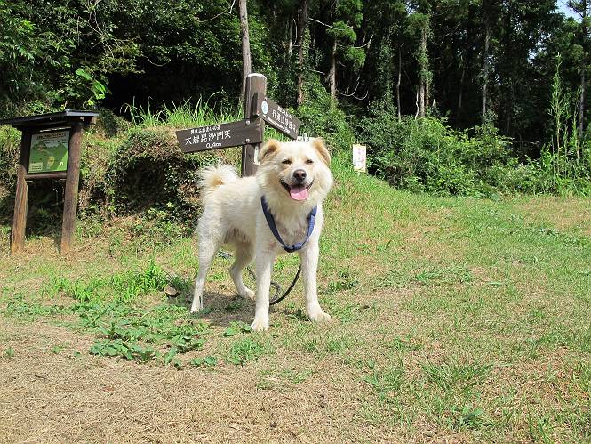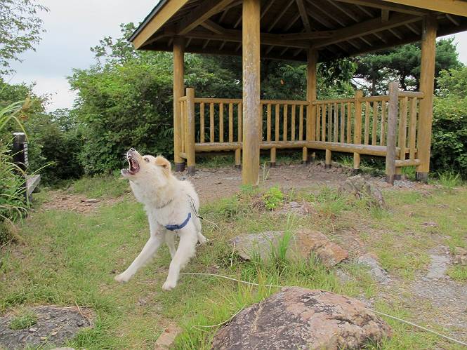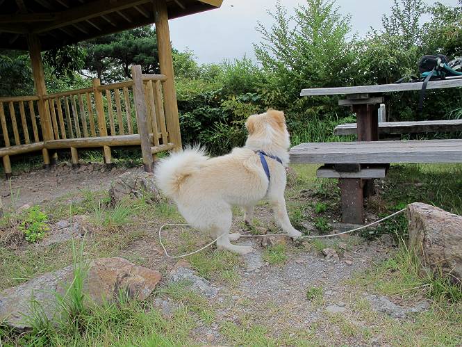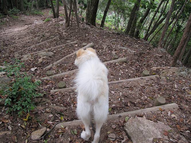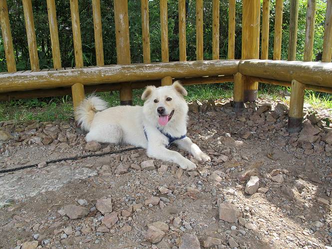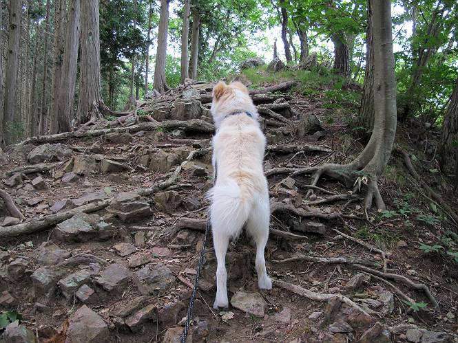| 平成二十四年八月十三日 Before 写真集目次へ Next 午前中、足利の大岩山と行道山へ出かけてきました。毘沙門天の一番奥の駐車場から、緑のトンネルの中をジグザグ歩いて大岩山の山頂に着きました。 途中で一人下山する方に会いましたが、山頂には誰もいません。 お水をもらって、一休みしました、結構さわやかですね。 丸太の階段を下って、 岩のゴツゴツした道を上って行きます。 また、下って 上りにかかります。、息切れしてます、日が差してきて暑くなりました。 最後の上りかな、ヨイショ、ヨイショ!! あっ、山頂が見えた。 行道山の山頂に着きました。このにはベンチや東屋があって、赤城山が良く見えるのですが、今日はモヤがかかっていて、見えません。 虫が行ったり来たり、うるさいなあ、コラッ!! 大きなハチが飛んでいる、やっつけてやるか。 ウオッー ワン! 逃げられちゃった。 アッ、息が切れた、今度は捕まえてやるぞ。 来たな、 キタ、キタ、 回ってるな、 ウオッー! ワン、 ワン、ワン! また、逃げられちゃった。 何度やっても、つかまらないなあ。 ここでゆっくり休んで、来た道を戻るんですって。 東屋って、良いね。涼しい風が時々ぬけていくんだよ。そろそろ下るようです。 なるべく木陰を選びながら下ってます。 下って、 上って、 また上って大岩山、東側へジグザグ下って、 炎天下の登山口に戻りました。 駐車場の木陰でお休みしてます。今日は、時間が短かったし、日差しの弱いうちだったので、あまり疲れませんでした。また連れてきてもらおうっと。 Before 写真集目次へ Next |