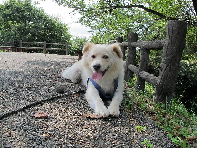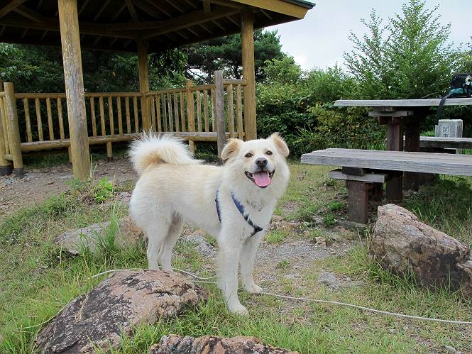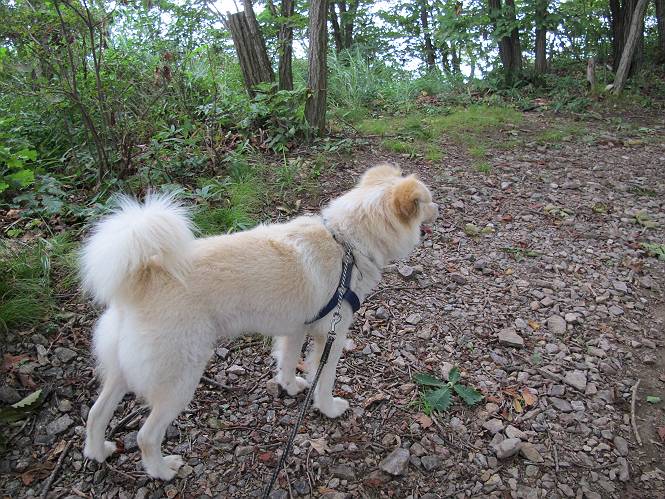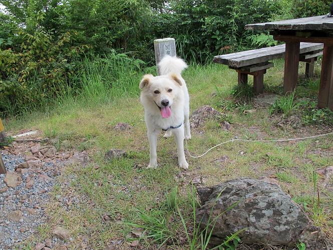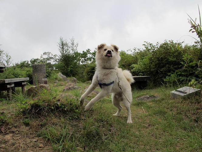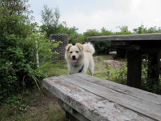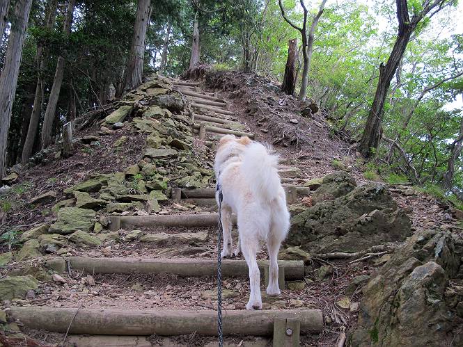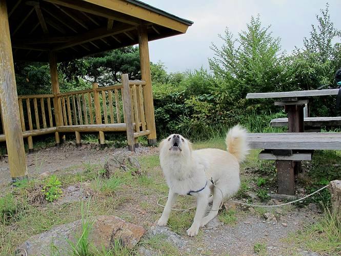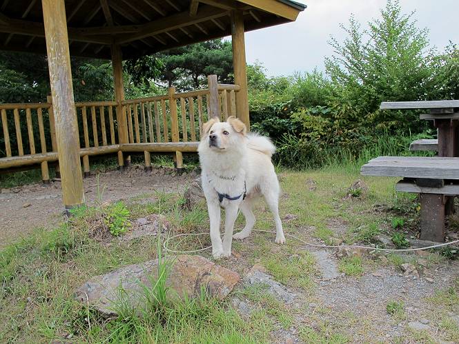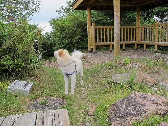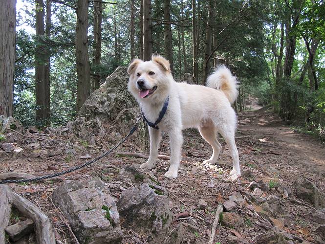 | 平成二十四年八月十三日 Before 写真集目次へ Next 午前中、足利の大岩山と行道山へ出かけてきました。毘沙門天の一番奥の駐車場から、緑のトンネルの中をジグザグ歩いて大岩山の山頂に着きました。 途中で一人下山する方に会いましたが、山頂には誰もいません。 お水をもらって、一休みしました、結構さわやかですね。 丸太の階段を下って、 岩のゴツゴツした道を上って行きます。 また、下って 上りにかかります。、息切れしてます、日が差してきて暑くなりました。 最後の上りかな、ヨイショ、ヨイショ!! あっ、山頂が見えた。 行道山の山頂に着きました。このにはベンチや東屋があって、赤城山が良く見えるのですが、今日はモヤがかかっていて、見えません。 虫が行ったり来たり、うるさいなあ、コラッ!! 大きなハチが飛んでいる、やっつけてやるか。 ウオッー ワン! 逃げられちゃった。 アッ、息が切れた、今度は捕まえてやるぞ。 来たな、 キタ、キタ、 回ってるな、 ウオッー! ワン、 ワン、ワン! また、逃げられちゃった。 何度やっても、つかまらないなあ。 ここでゆっくり休んで、来た道を戻るんですって。 東屋って、良いね。涼しい風が時々ぬけていくんだよ。そろそろ下るようです。 なるべく木陰を選びながら下ってます。 下って、 上って、 また上って大岩山、東側へジグザグ下って、 炎天下の登山口に戻りました。 駐車場の木陰でお休みしてます。今日は、時間が短かったし、日差しの弱いうちだったので、あまり疲れませんでした。また連れてきてもらおうっと。 Before 写真集目次へ Next |