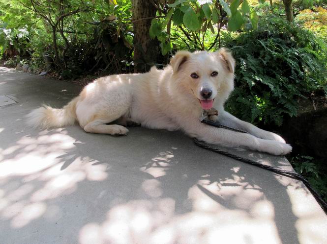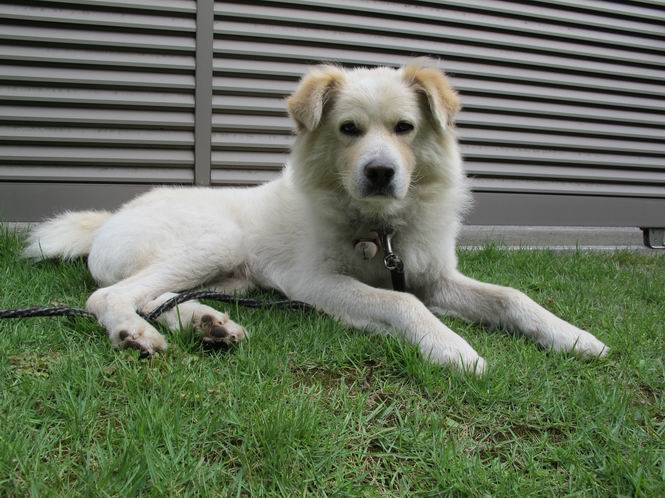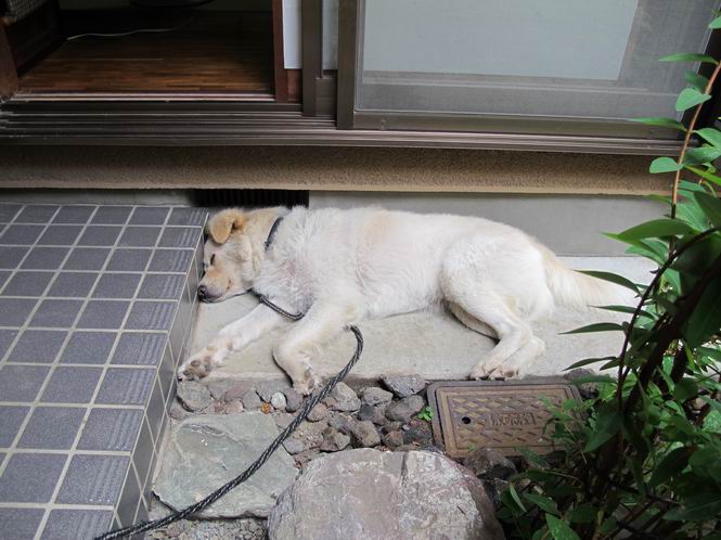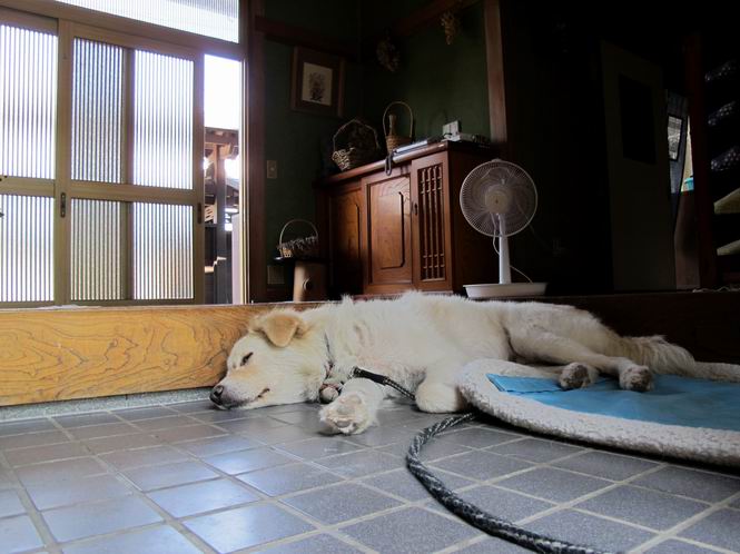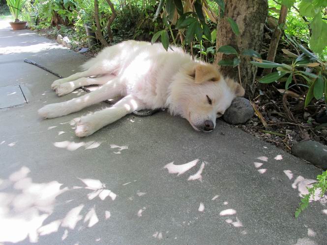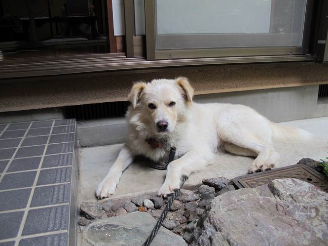 | 平成二十四年八月十六日 Before 写真集目次へ Next 朝のうちは幾分涼しくなったような気がしますが、日中は残暑が続いてます。今日は薄暗いうちに散歩して、お買い物に出かけるのを待っています。 行ってきまーす。今、出かけるとお店が開かないので、田沼の山奥を回って、あちらこちら寄り道しながら道の駅で買い物をするそうです。 ワンワンがいるかな、・・・・・・。 ただいま、帰りは高速道路を走ってきたので、まだ10時前だそうです。 ここはね、お兄ちゃんの車の入る所です。屋根の上に桜の枝があって、まだそれほど暑くはありません。少し遊んで、・・・・・・。 お勝手の前の木陰に移動してきました。上にモクセイ、下にツツジ、シャクナゲ、モミジの小さい木があって、お昼ぐらいまでは涼しいんですよ。食卓にも近いし、美味しいものをちょっと頂けたりして、・・・・・ね。 そのまま、寝転んだりしてね、これは石枕だ。ここに日が差してくると、 次は、西へ回り込んで、犬走りでお休みします。朝も良くここにいることがあります。床下から冷たい風が出て気持ち良いんですよ。 つい、寝てしまうんですが、番犬役はキチンとしているんですよ。門扉のピンポンが鳴ったり、よその車が入ってきたりすると、ぼくの出番です。 玄関前に日が差してくると暑くて最悪です。中に入って、扇風機をかけてもらって、じっと暑さを我慢してるんですよ。日が落ちて、道路の温度が下がるまで、ずっとこんなスタイルが続きます。そのうちに、「忠治、散歩に行くか」、と声がかかります。 真夏のぼくの一日でした。 下の写真は、先日ぼくの指の間、爪の元についていたマダニです。ぼくが、かゆくて指をかじっていたら、お父さんが良く見て捕ってくれました。1.3mmほどの大きさでゴミのように見えますが、動き回って、喰いついていたようです。前後両足で6匹いたそうです。山でついたのかなあ。体はそれなりに気をつけてましたが、・・・・。 Before 写真集目次へ Next |