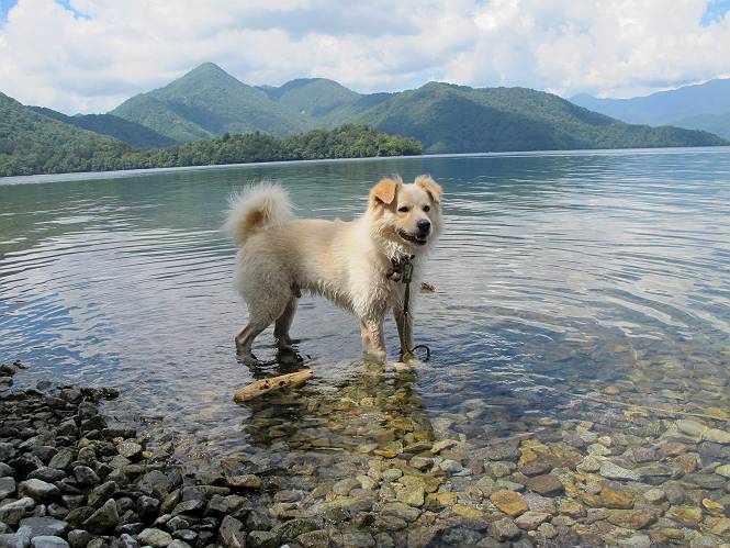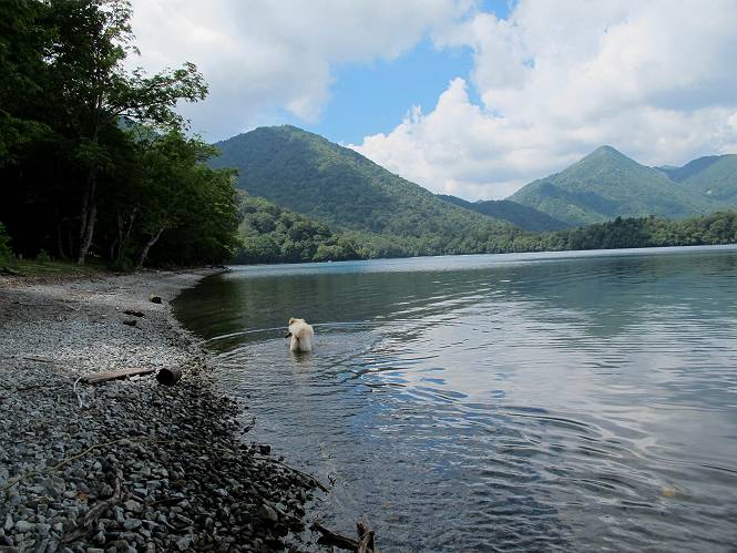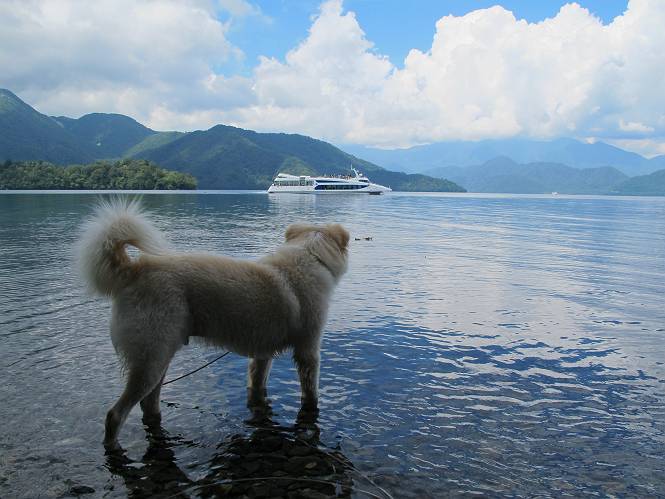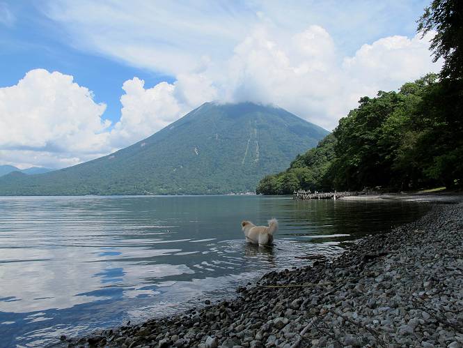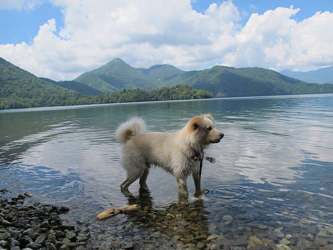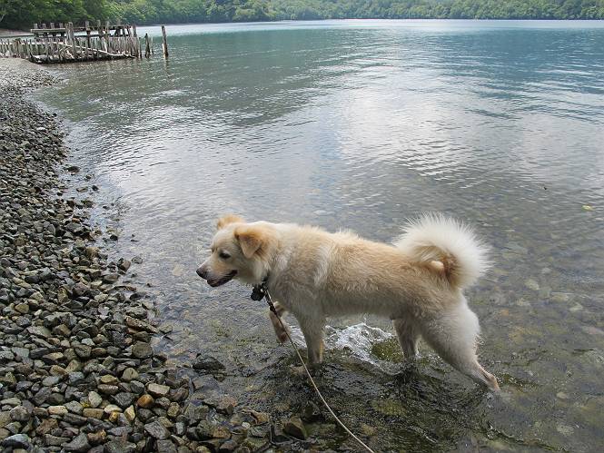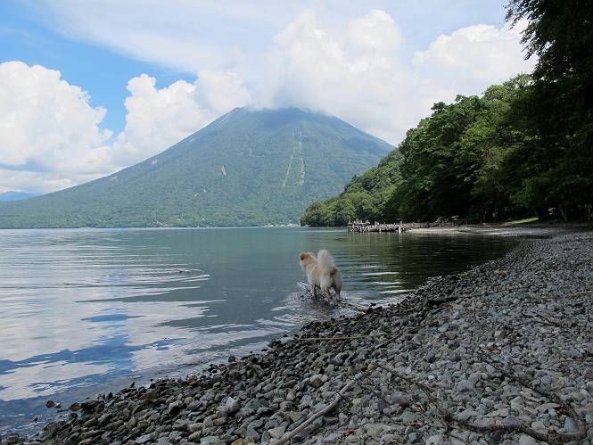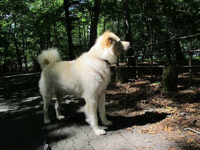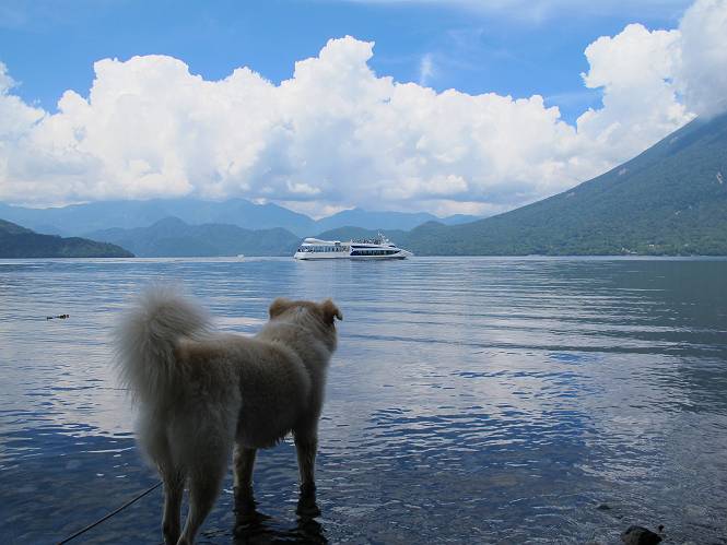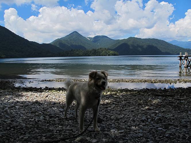 | 平成二十四年八月二十三日 Before 写真集目次へ Next 今日は遠くの涼しい場所に連れてってもらえそうな雰囲気です。お父さんはいろいろグッズを車に積んでます。ぼくのオヤツ、リード、お水も積んでます。お母さんも乗って、ゴー。燃料を満タンにして、高速道に入りました。奥日光の中禅寺湖へ向かうそうです。宇都宮ICで曲らず福島方面へ進んでしまい、上河内で降りて、山の中の細い道を走って、やっと今市で杉並木に出て、イロハ坂を上って、立木観音の駐車場に着きました。 ここから中禅寺湖に沿った細い道を少し歩きます。大きな木の下には白いお花、ゴマナが沢山咲いてました。 「ノコンギクに似ているなあ」、と言ってましたが色は真っ白です。湖畔を散策している人に沢山会いました、女の人が多いようです。 荒砥橋に出ました。ここは日が当たってましたが、ほとんど木陰で涼しい道でした。 “イタリア大使館別荘”が途中にあって、お母さんが入っていってしまいました。 お父さんは先に行こうと言うのですが、しばらく、道で待っていました そのちょっと先で湖畔に下りました。後の尖った山が社山だそうです、ぼくはまだ登ってません。荷物を降ろして、長いリードをつけてもらったりして支度をしました。 打ち寄せられた木片を浅瀬に投げてもらって、ぼくが水の中を走って行って取ってきて遊びました。 「ちょっと深いなあ、どうしよう、・・・・」 「今度はこっちだ、忠治、取って来い」、「あの辺なら良いね」 「くわえたぞ、・・・・」 こんな遊びを何回と無く繰り返し、オヤツタイムをはさんで独りで水辺を歩き回りました。動くものが浮いていたり、 水辺の石が動いて見えたり、面白いことが沢山あるんだよ。その石を足で引っかいてみるのですが、何でもないんですよね、ぼくにはとても不思議なのです。 ああ、ビショビショになっちゃったね。ブルブル、しちゃおうか。 「いいよ、投げて!」 走れ、走れ! これかな、あれかな、どれかな。 突然前の方に変なものが現れました。「何、何、何、あれ、車じゃないし」、「船だよ、観光船だよ」 「面白そうだけど、大きくて怖いなあ」 「船が行ったら、何だか、おかしいぞ」 「変な水が来たよ、何だこれ、ワン、ワン」、「波だよ、船が水をかいて起こるんだよ」、「ぼくにはむずかしくて解んないなあ」 「動いている水をかじってやるぞ、ワン」 「あれ、なくなっちゃったぞ????」 次々押し寄せてくる波に、ワンワン吠えて、波を食べてました? 男体山の雲が大分大きくなりました。 社山の上には真っ黒い雲ができました。 雨が降らないうちに、中禅寺湖を上りましょう。水遊びも面白かったけれど、“船”とか“波”、ぼくには分らないなあ。何しろ、はじめて見たんだもんね。 Before 写真集目次へ Next |
