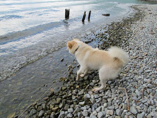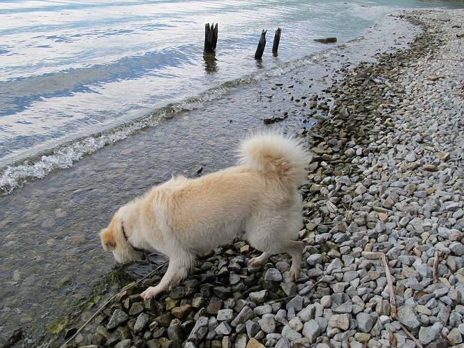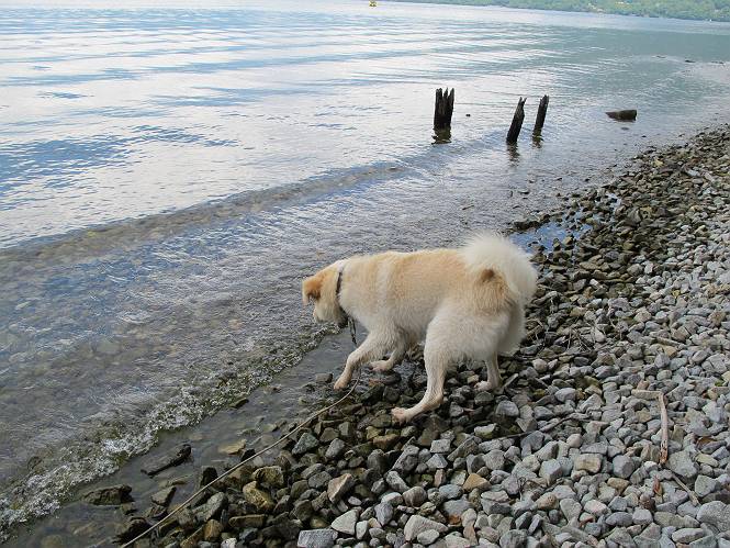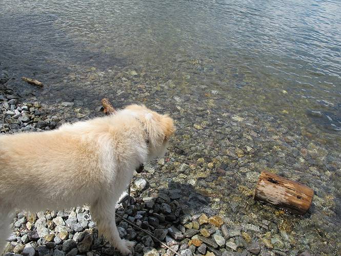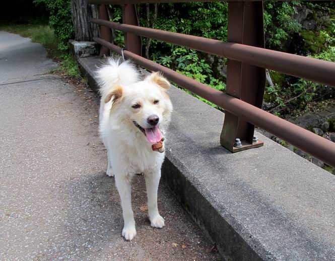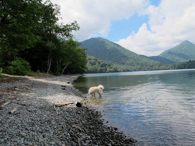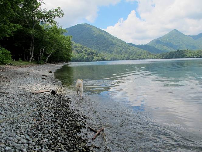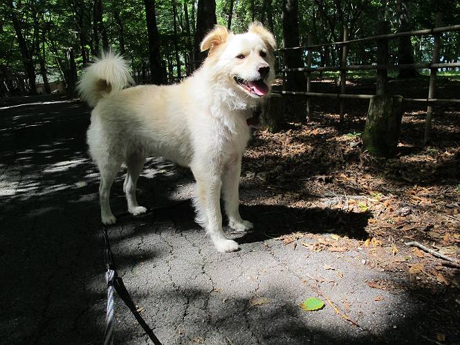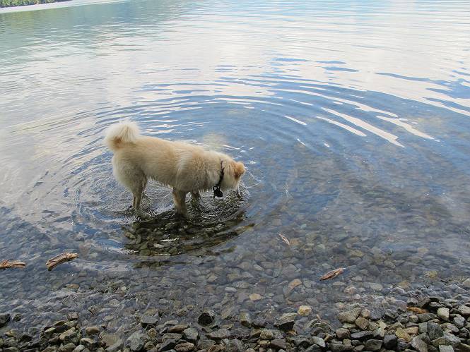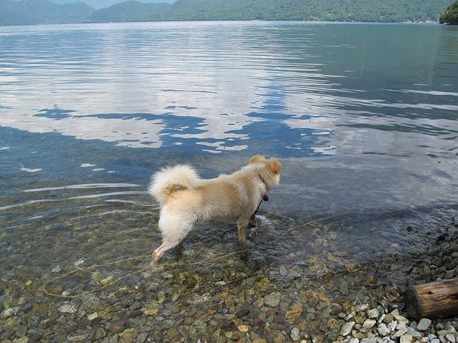 | 平成二十四年八月二十三日 Before 写真集目次へ Next 今日は遠くの涼しい場所に連れてってもらえそうな雰囲気です。お父さんはいろいろグッズを車に積んでます。ぼくのオヤツ、リード、お水も積んでます。お母さんも乗って、ゴー。燃料を満タンにして、高速道に入りました。奥日光の中禅寺湖へ向かうそうです。宇都宮ICで曲らず福島方面へ進んでしまい、上河内で降りて、山の中の細い道を走って、やっと今市で杉並木に出て、イロハ坂を上って、立木観音の駐車場に着きました。 ここから中禅寺湖に沿った細い道を少し歩きます。大きな木の下には白いお花、ゴマナが沢山咲いてました。 「ノコンギクに似ているなあ」、と言ってましたが色は真っ白です。湖畔を散策している人に沢山会いました、女の人が多いようです。 荒砥橋に出ました。ここは日が当たってましたが、ほとんど木陰で涼しい道でした。 “イタリア大使館別荘”が途中にあって、お母さんが入っていってしまいました。 お父さんは先に行こうと言うのですが、しばらく、道で待っていました そのちょっと先で湖畔に下りました。後の尖った山が社山だそうです、ぼくはまだ登ってません。荷物を降ろして、長いリードをつけてもらったりして支度をしました。 打ち寄せられた木片を浅瀬に投げてもらって、ぼくが水の中を走って行って取ってきて遊びました。 「ちょっと深いなあ、どうしよう、・・・・」 「今度はこっちだ、忠治、取って来い」、「あの辺なら良いね」 「くわえたぞ、・・・・」 こんな遊びを何回と無く繰り返し、オヤツタイムをはさんで独りで水辺を歩き回りました。動くものが浮いていたり、 水辺の石が動いて見えたり、面白いことが沢山あるんだよ。その石を足で引っかいてみるのですが、何でもないんですよね、ぼくにはとても不思議なのです。 ああ、ビショビショになっちゃったね。ブルブル、しちゃおうか。 「いいよ、投げて!」 走れ、走れ! これかな、あれかな、どれかな。 突然前の方に変なものが現れました。「何、何、何、あれ、車じゃないし」、「船だよ、観光船だよ」 「面白そうだけど、大きくて怖いなあ」 「船が行ったら、何だか、おかしいぞ」 「変な水が来たよ、何だこれ、ワン、ワン」、「波だよ、船が水をかいて起こるんだよ」、「ぼくにはむずかしくて解んないなあ」 「動いている水をかじってやるぞ、ワン」 「あれ、なくなっちゃったぞ????」 次々押し寄せてくる波に、ワンワン吠えて、波を食べてました? 男体山の雲が大分大きくなりました。 社山の上には真っ黒い雲ができました。 雨が降らないうちに、中禅寺湖を上りましょう。水遊びも面白かったけれど、“船”とか“波”、ぼくには分らないなあ。何しろ、はじめて見たんだもんね。 Before 写真集目次へ Next |
