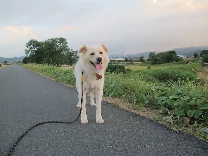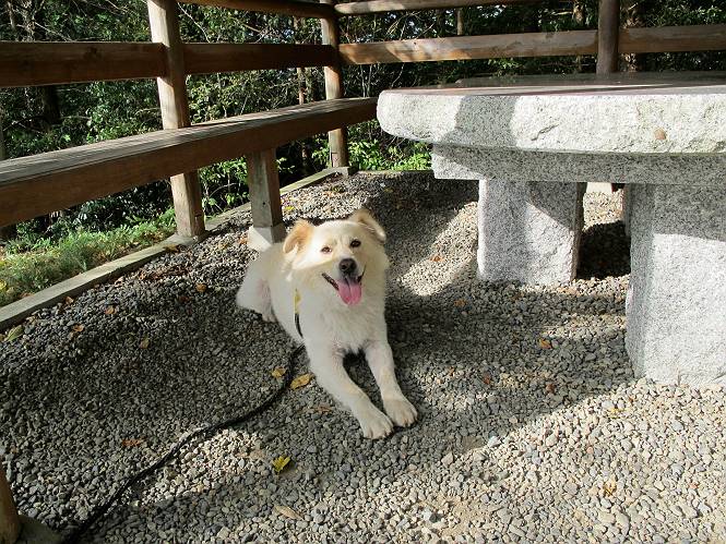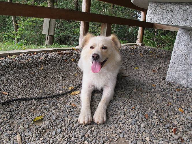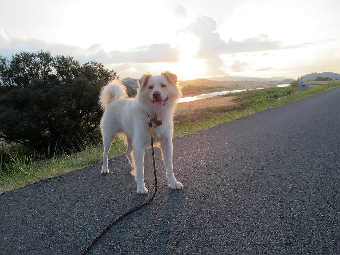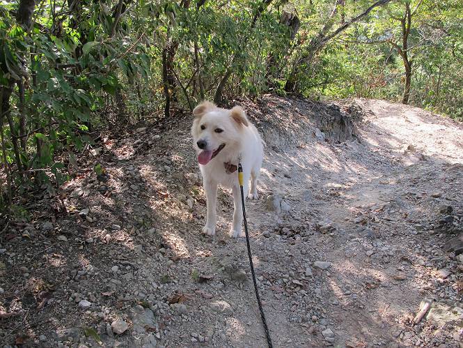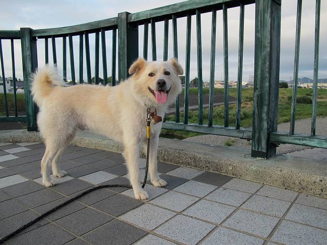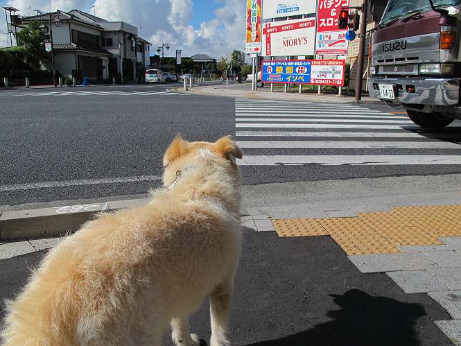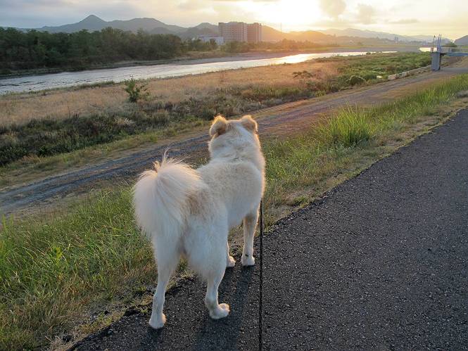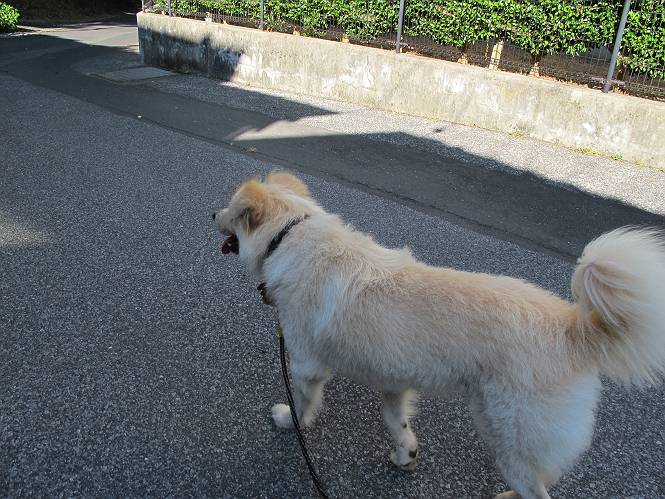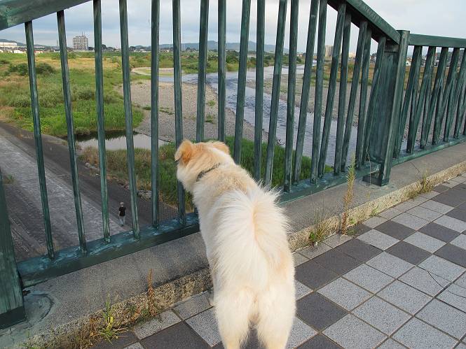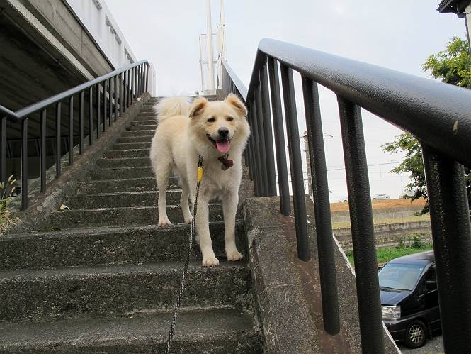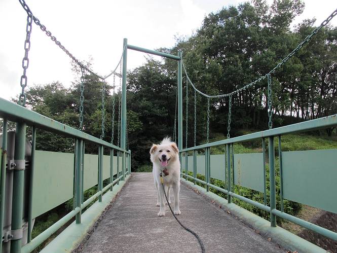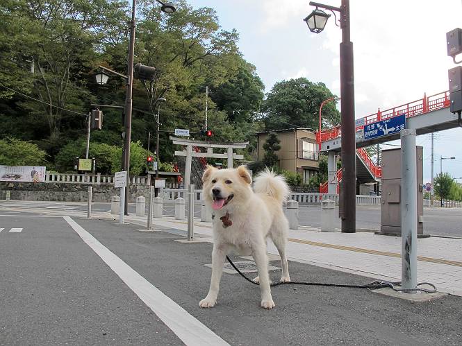 | 平成二十四年九月一日 Before 写真集目次へ Next 今日は早起きをして待っていると、「忠治、お山へ行ってくるか」、と言うんです。まだ真っ暗なのに、うれしくてワンワン騒いでしまいました。渡良瀬川の葉鹿橋から土手伝いに緑橋まで歩き、そこから織姫神社へ出て、奥の両崖山まで往復するんですって。 只今準備中です。ぼくのオヤツとお父さんの朝ごはんです。 葉鹿橋から歩き出すと大分明るくなってきました。ここは良く散歩する土手です。後が葉鹿橋です。 金山の方向にまだ月が残ってました。 鹿島橋を過ぎたところです。後が鹿島橋です、前には高速道路の大きな橋が見えてます。 高速道路の下をくぐりました。間もなく日の出のようです。 雲が多くてあまりきれいな日の出は見られませんでした。 渡良瀬川の向こうに尖った天狗山が見えてます。あの右奥が両崖山だそうです。 足利市に入り、歩道と車道が並んでます。 緑橋が見えてきました、歩いて渡るのは、はじめてです。 広い歩道がついていて、川が下に良く見えます。今、下に、誰か歩いてます。 歩道が所々で広くなっていて、よけられます。 橋を渡って右に曲り、渡良瀬川の左側を少し歩きます。下流の渡良瀬橋と中橋が見えてます。 織姫橋を渡って歩道を下ってます。 織姫神社前に着きました。 お水を飲んで、石段を上って織姫神社へ向かいます。 ヨイショ、 ヨイショ、です。 やっと、織姫神社に着きました。沢山の人が行き交ってます。 また階段を上ってきましたが、疲れて座りこんでしまいました。お水をもらって、お休みしてます。 公園の中の吊橋を渡ってます。 足利の街が遠くまで広がって見えます。 岩場の道に出ました。 暑いのと距離を歩いてますので、ヨイショで一歩一歩登ってます。 まだあるなあ、 もう少しで両崖山なのですが、ぼく、今日は、疲れてしまいました。 東屋に寄り込んでしまいました、お休みです。 山頂は階段をちょっと上れば良いのですが、・・・・・・。 階段を上って、鳥居の前で、また、座りこんでしまいました。 こんなところでお休みしているので、今下っていった人に笑われてしまいました。 ハーイ、両崖山山頂到着でーす ホントに、ぼく、疲れたよ。葉鹿橋からだもんね、ワン。 お水とオヤツをもらて、しばらくお休みしました。おじさんが大きな声で何か歌ってましたよ。 帰りは近道に変更して梅林を抜け、住宅地に下りました。 簡単に出られました、山頂からここまで休まず下れました。 でも、暑いなあ、日陰は涼しい、風もあるし。 お休みでーす。「オイ、オイ、忠治、ここは、よそ様の車庫だよ」 「あっ、そう、失礼しました、ワン」 ちょっと進んで、またお休みでーす。 炎天下の街中をしばらく歩きました、通り7丁目交差点です。 緑橋手前で、地下道を抜けました。 また、休んでしまいました。お父さんが、お母さんに出迎えの電話をしてました。緑橋を渡って、土手を少し歩き、群馬県に入った所でお母さんの車に会いました。今日はヘトヘトになって、お見苦しいところをお目にかけました、でも暑かったでーす、ワン。 Before 写真集目次へ Next |