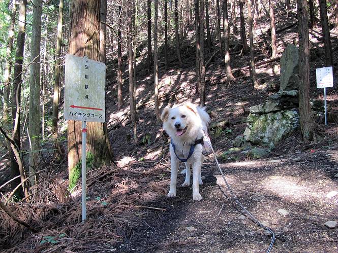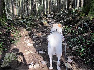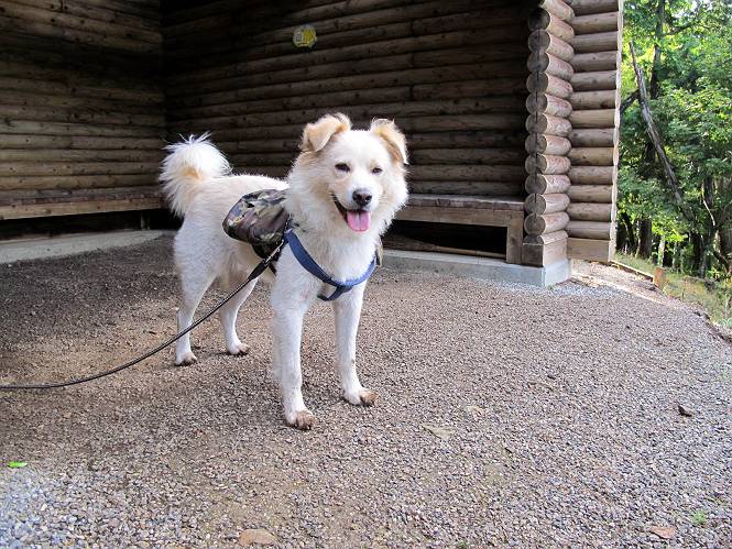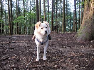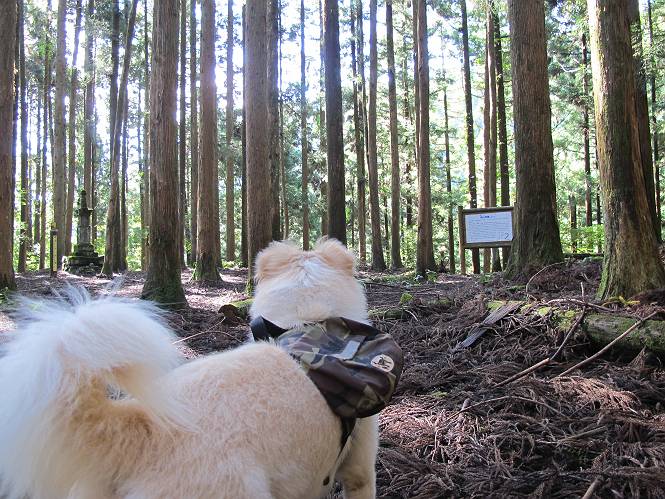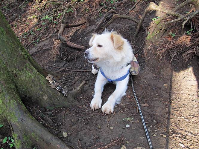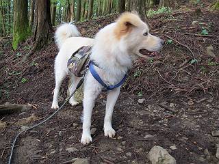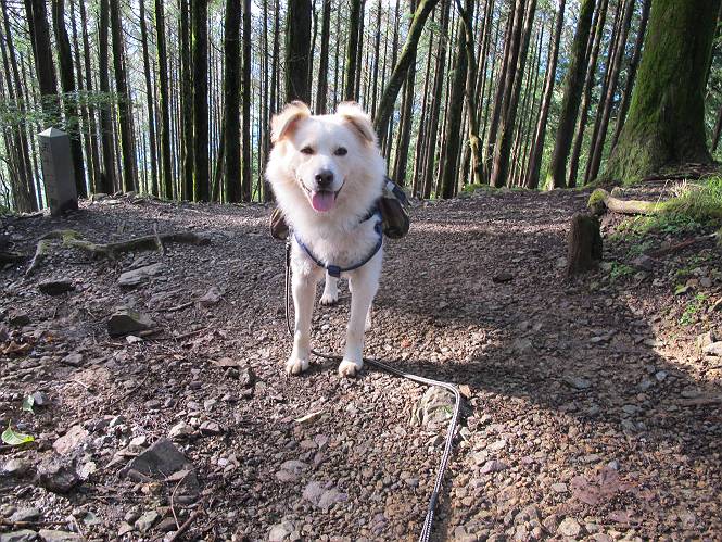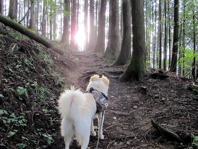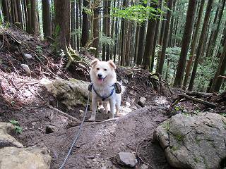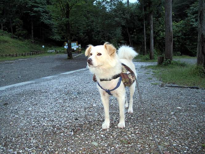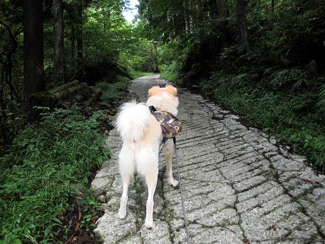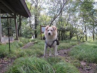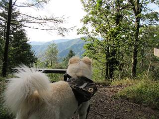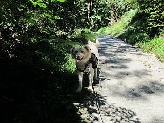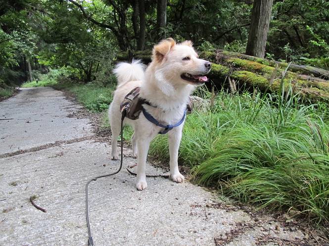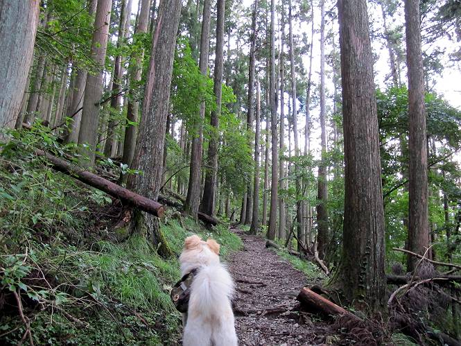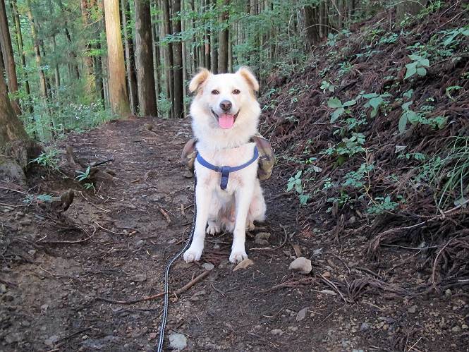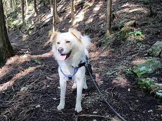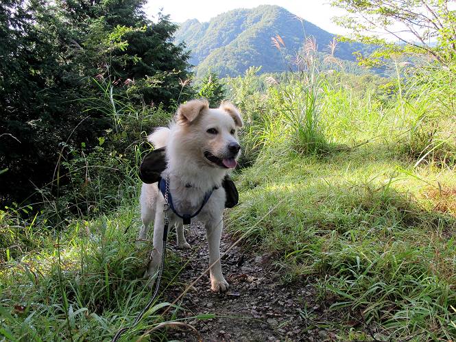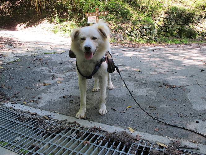 | 平成二十四年九月二十六日 Before 写真集目次へ Next 夜明け、真っ暗なうちに起こされて、秩父の武甲山へ行ってきました。秩父の山で歩いたのは金峰山だけで、武甲山は2つ目です。 ここは山頂にある御嶽神社の参道の基点の隣にある駐車場です。やっと明るくなったので出発です。 沢に沿ってしばらく細い道を歩いて行くと、林道にでました。 ここからコンクリートの急坂になりました。 途中に下山してくる道がありました、小さい橋も見えました。 ここからいよいよ山道に入るそうです。 木段が続いているようです。 橋が出てきました、ちょっと危なっかしいなあ。 間もなく、不動滝に出ました、夕べの雨で流れに勢いがあるようです。 不動さまでしょうか。 次の橋が見えてます。 立派な橋ですね、こういう橋なら安心して渡れるんだけど。 不動滝を入れて撮ってもらいました。 杉林がずっと続いています、武甲山御嶽神社参道、二十一丁目だそうです。 明るくてきれいな杉林ですね。 白いキクの花がいっぱい咲いてます、変なニオイがしますね。 石の祠が見えてます、この辺のコケ、きれいですね。 朝日が杉林に差し込んできました。 ちょっとお座りして一枚、ぼく疲れてないよね。 大きな杉の木が見えてきました。 大杉の広場だそうです。 標高1000mだそうです、駐車場が515mですって。 ちょっと、一休みします。 何かいるぞ、見つけた。 “ヒキガエル”だってさ、「一緒に遊ぼうよ」 「ウーウー、言ったって駄目だよ、忠治が怖いんだぞ」、「そうか・・・・・・」 そっとしてやろう、「バイ、バイ」 真っ白い石だらけの道に出ました。 木段もあって、結構な急坂です。 ジグザグ進んで、細いお水が出ている場所を通りました。 もう少しで御嶽神社だそうです。 帰りに下るシラジクボからの道に出ました。 ちょっと見難いですが、真正面が御嶽神社だそうです。 やっと着きました。ぼく、のどカラカラ、お腹ペコペコでーす。 休憩所でお水をたっぷり頂きました。 武甲山山頂の御嶽神社です。 狛犬(?)を入れて撮ってもらいました。 神社の裏から展望台に出ました。あっちが赤城山の方向だって。 ぼくには、わかんないなあ。 「お腹、ペコペコです、オヤツ頂だい」 青空の下、山頂のオヤツ、おいしいなあ この見晴台、柵が厳重で出られないんですよ。 御嶽神社に戻って、気づきました。山頂は五十二丁目だそうです。 南方向にに下って、大持山、小持山の見える場所に来ました。 大持山、小持山(手前)です。 小持山を入れて、また撮ってもらいました。 真っ直ぐ下って、シラジクボに出ました。 ここから左の狭い道を下るそうです。 林道に出ちゃったよ、どっちへ行くのかな。 持山寺跡を通って下るそうです。入口に石碑がありました。 持山寺跡に着きました、大きな石碑(?)と案内板があります。 石碑です。 進もうと思ったら通行禁止になってました。 先ほどの石碑まで戻て、ここから下るそうです。 桧、杉林を緩やかに下って、往く時見た橋に出ました、怖そうだなあ、こっちは深いし・・・。 渡れたヨ。 あとはスイスイだね。 団体さんに会ったよ、ぼくのリュック見て、「何が入ってるの」、って言ってたよ。 コンクリートの坂の下に着きました、あともう少しです。 沢に降りてちょっと遊んで、 間もなく駐車場に戻りました、この山、なかなか良いねえ、これから山頂に向かう人が沢山います。 【追記】 武甲山へ入るとき、お父さんがダニヨケスプレーを忘れてしまって、4日ほどたった29日、ぼくがアチコチかいたりかじるものだから、「忠治、ダニか」って、調べました。「忠治、全身ダニだらけだ」、と言って捕りはじめました。午前中かかってやっと終ったようです、全部で150匹ほどいたようです、中程度のダニが3匹、あとは米粒の1/4ほどのものでした。そして、まだ20-30匹いるだろうな、と言ってました、嫌だなあ。 Before 写真集目次へ Next |