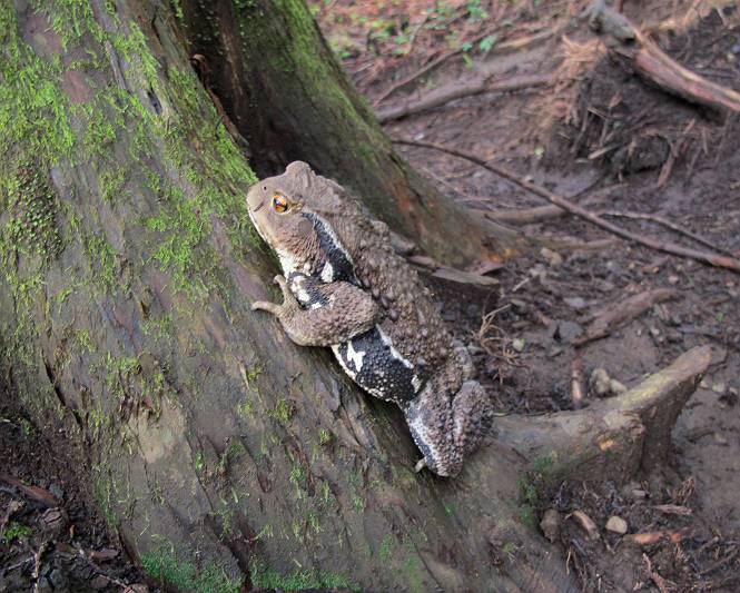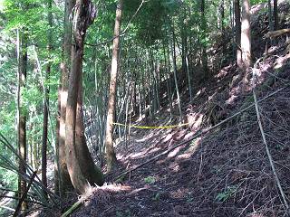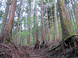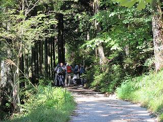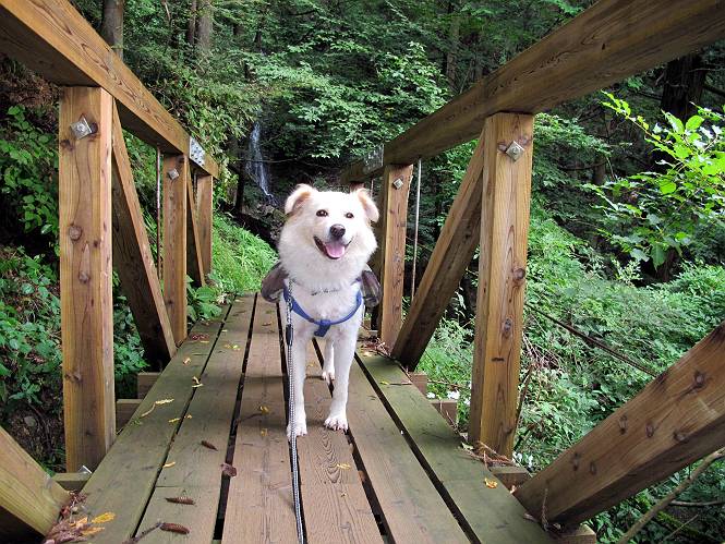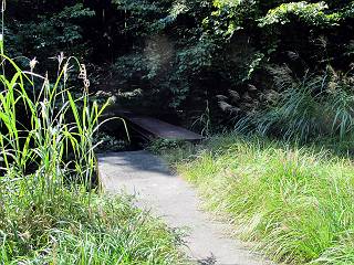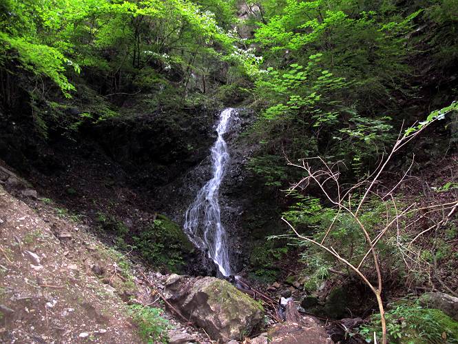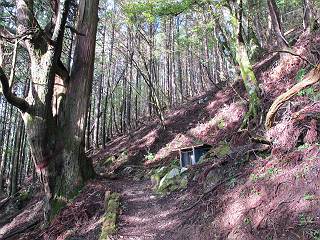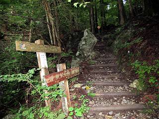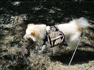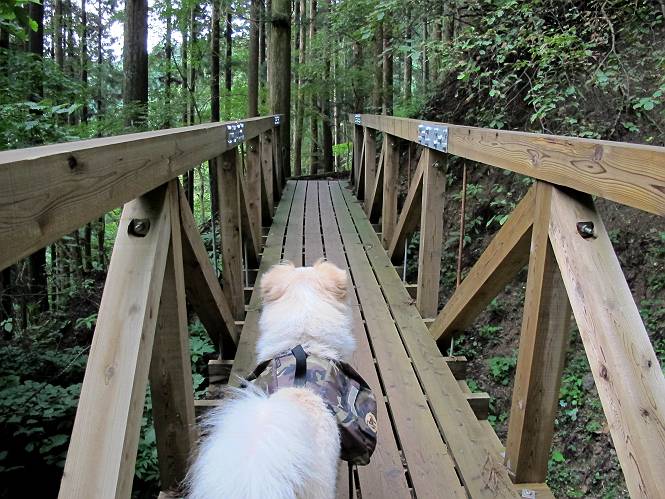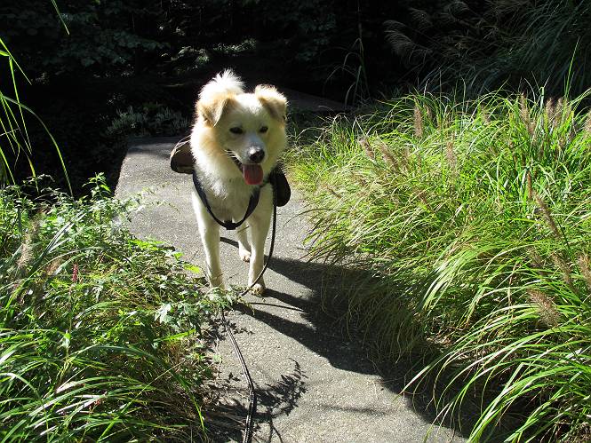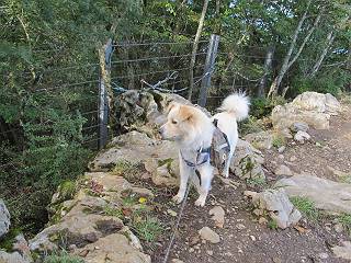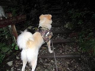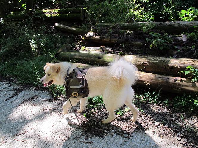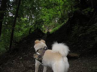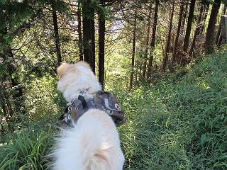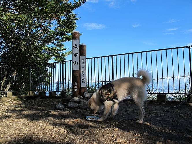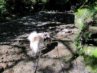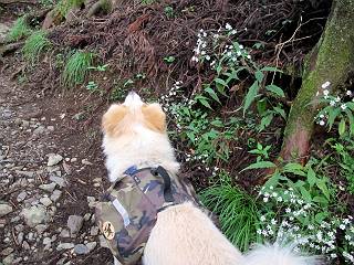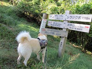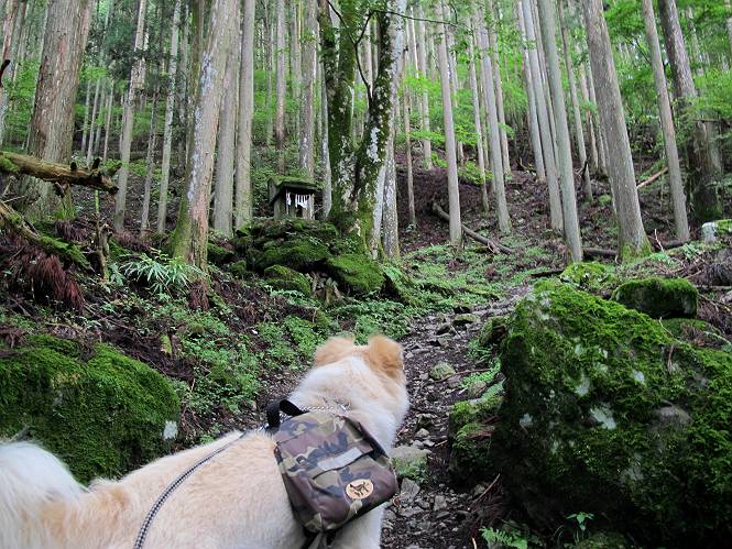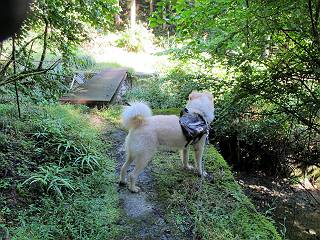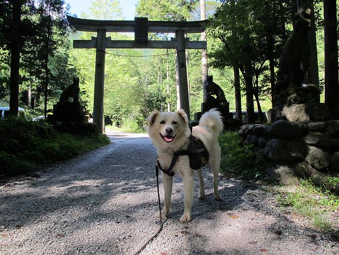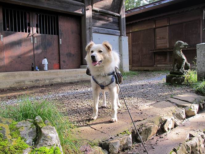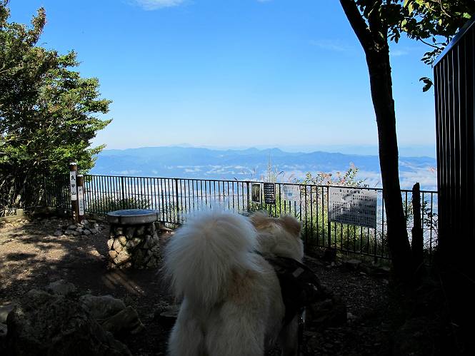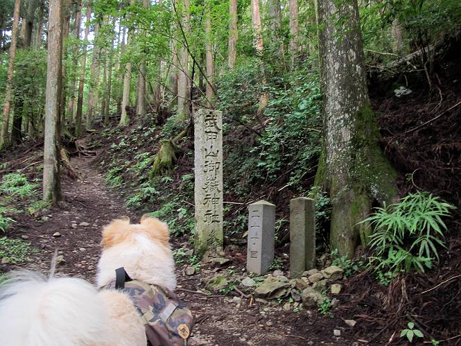 | 平成二十四年九月二十六日 Before 写真集目次へ Next 夜明け、真っ暗なうちに起こされて、秩父の武甲山へ行ってきました。秩父の山で歩いたのは金峰山だけで、武甲山は2つ目です。 ここは山頂にある御嶽神社の参道の基点の隣にある駐車場です。やっと明るくなったので出発です。 沢に沿ってしばらく細い道を歩いて行くと、林道にでました。 ここからコンクリートの急坂になりました。 途中に下山してくる道がありました、小さい橋も見えました。 ここからいよいよ山道に入るそうです。 木段が続いているようです。 橋が出てきました、ちょっと危なっかしいなあ。 間もなく、不動滝に出ました、夕べの雨で流れに勢いがあるようです。 不動さまでしょうか。 次の橋が見えてます。 立派な橋ですね、こういう橋なら安心して渡れるんだけど。 不動滝を入れて撮ってもらいました。 杉林がずっと続いています、武甲山御嶽神社参道、二十一丁目だそうです。 明るくてきれいな杉林ですね。 白いキクの花がいっぱい咲いてます、変なニオイがしますね。 石の祠が見えてます、この辺のコケ、きれいですね。 朝日が杉林に差し込んできました。 ちょっとお座りして一枚、ぼく疲れてないよね。 大きな杉の木が見えてきました。 大杉の広場だそうです。 標高1000mだそうです、駐車場が515mですって。 ちょっと、一休みします。 何かいるぞ、見つけた。 “ヒキガエル”だってさ、「一緒に遊ぼうよ」 「ウーウー、言ったって駄目だよ、忠治が怖いんだぞ」、「そうか・・・・・・」 そっとしてやろう、「バイ、バイ」 真っ白い石だらけの道に出ました。 木段もあって、結構な急坂です。 ジグザグ進んで、細いお水が出ている場所を通りました。 もう少しで御嶽神社だそうです。 帰りに下るシラジクボからの道に出ました。 ちょっと見難いですが、真正面が御嶽神社だそうです。 やっと着きました。ぼく、のどカラカラ、お腹ペコペコでーす。 休憩所でお水をたっぷり頂きました。 武甲山山頂の御嶽神社です。 狛犬(?)を入れて撮ってもらいました。 神社の裏から展望台に出ました。あっちが赤城山の方向だって。 ぼくには、わかんないなあ。 「お腹、ペコペコです、オヤツ頂だい」 青空の下、山頂のオヤツ、おいしいなあ この見晴台、柵が厳重で出られないんですよ。 御嶽神社に戻って、気づきました。山頂は五十二丁目だそうです。 南方向にに下って、大持山、小持山の見える場所に来ました。 大持山、小持山(手前)です。 小持山を入れて、また撮ってもらいました。 真っ直ぐ下って、シラジクボに出ました。 ここから左の狭い道を下るそうです。 林道に出ちゃったよ、どっちへ行くのかな。 持山寺跡を通って下るそうです。入口に石碑がありました。 持山寺跡に着きました、大きな石碑(?)と案内板があります。 石碑です。 進もうと思ったら通行禁止になってました。 先ほどの石碑まで戻て、ここから下るそうです。 桧、杉林を緩やかに下って、往く時見た橋に出ました、怖そうだなあ、こっちは深いし・・・。 渡れたヨ。 あとはスイスイだね。 団体さんに会ったよ、ぼくのリュック見て、「何が入ってるの」、って言ってたよ。 コンクリートの坂の下に着きました、あともう少しです。 沢に降りてちょっと遊んで、 間もなく駐車場に戻りました、この山、なかなか良いねえ、これから山頂に向かう人が沢山います。 【追記】 武甲山へ入るとき、お父さんがダニヨケスプレーを忘れてしまって、4日ほどたった29日、ぼくがアチコチかいたりかじるものだから、「忠治、ダニか」って、調べました。「忠治、全身ダニだらけだ」、と言って捕りはじめました。午前中かかってやっと終ったようです、全部で150匹ほどいたようです、中程度のダニが3匹、あとは米粒の1/4ほどのものでした。そして、まだ20-30匹いるだろうな、と言ってました、嫌だなあ。 Before 写真集目次へ Next |