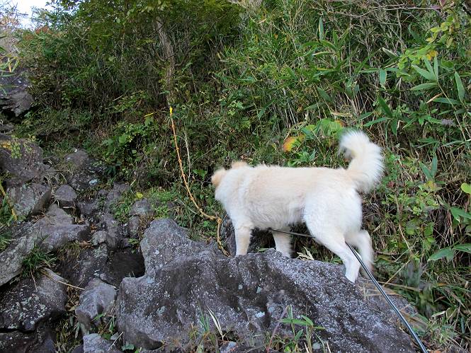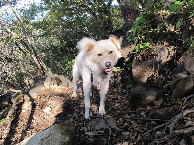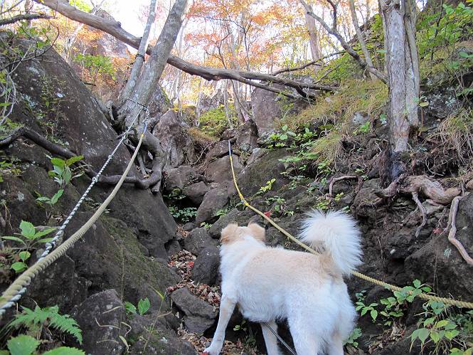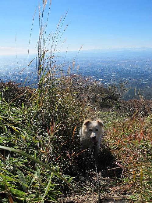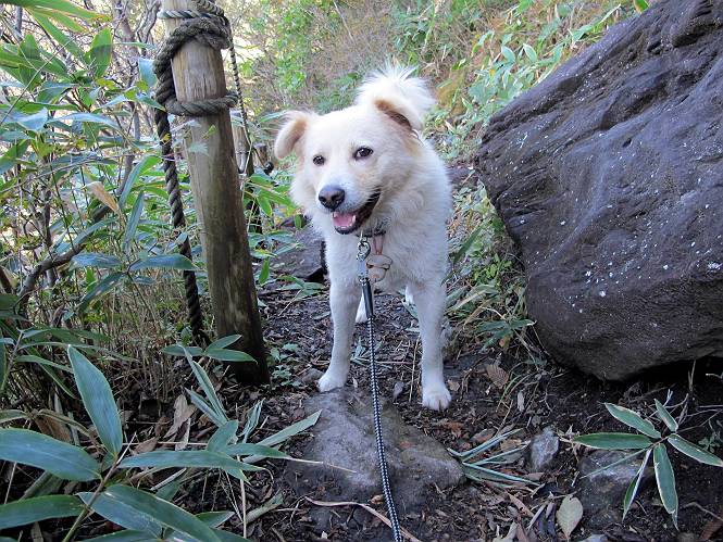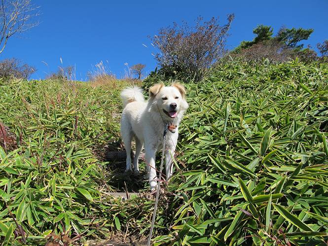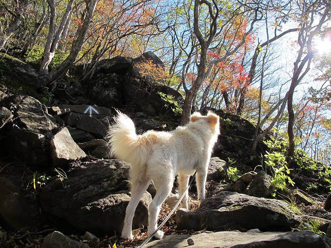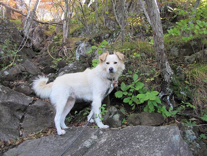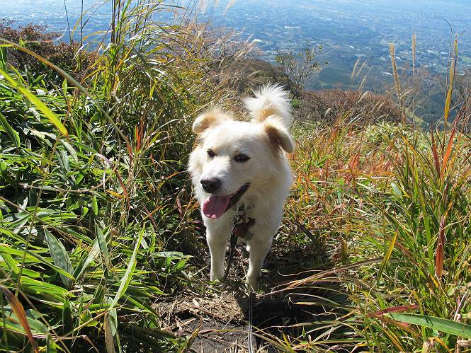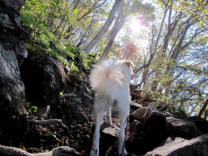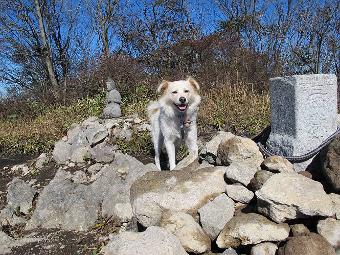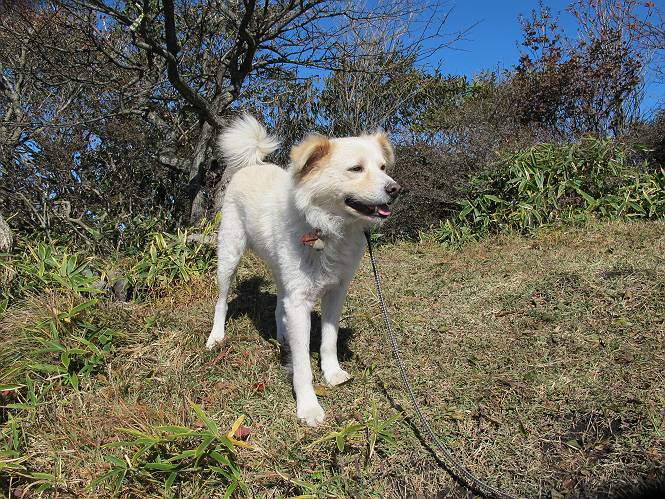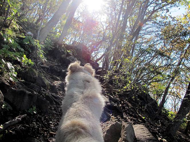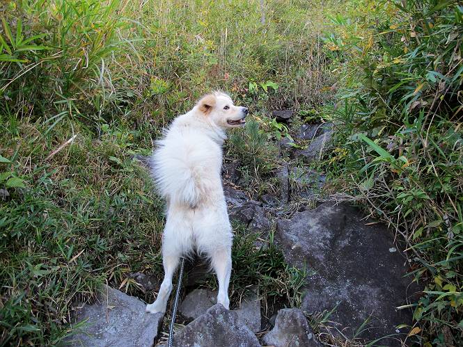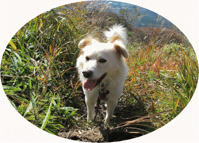 | 平成二十四年十月十九日 Before 写真集目次へ Next 今日はぼくの誕生日です、7才になりました。お天気も良いようで、鍋割山(赤城)をひと回りして、赤城神社に参拝して、お家に帰ったらお母さんが美味しいご馳走を用意して待っててくれるんだって、うれしくってあせっちゃうな。 鍋割山の南側の登山口から歩きました。 すぐに榛名山と浅間山が見えてきました。 すると、岩場が出てきます。 急斜面にロープが用意されてますが、 ぼくは爪が引っかかるので大丈夫です。 こんな狭い所でもスイスイ歩けるよ。 でも、呼吸が早くなるねえ。 「まだ、続く?」、「一旦、緩やかになるよ」 鍋割高原に着きました。 山頂がちょっと見えてきました。 ここからまた岩場に入ります。 つつじの紅葉が始まってます。 ゴツゴツした岩の道が続きます。 大きな木があるなあ。 大分上ってきたなあ。 オー、きれい。 こっちもだ。 でも、この道、急ですね。 葉があまりついてない木がありますね。 ロープが連続してますね。 お父さんはゆっくり歩いてまーす、ぼくは待ってまーす。 もう少しで平らな場所に出るようです。 もう少しだ、頑張っちゃうぞ。 山頂の一段下で、林になってます。 ここは歩きやすいなあ。 鍋破山前不動から上ってくる道と合流しました。帰りはここから下るそうです。 きれいな笹の斜面を上ってます。 笹の中を通りたいなあ 木段を上ってます、 もう直ぐ山頂のようです。 鍋割山山頂到着です。 用意してきたオヤツと水を頂きました。 良い眺めですねえ。 こちらは西側、渋川市で榛名山と浅間山です。 こちらは南側で前橋市、遠くに見えるのは八ヶ岳だそうです。 こちらも前橋市で、富士山と秩父の山々が見えているそうです。 富士山はもう真っ白ですね。 リンドウの花が元気に咲いてました。 これから下ります。 笹の斜面、いいなあ。 歩いて来い、と言ってくれました、いいねえ、面白い。 この辺で道に出ます。 先ほど通った分岐点です。 右に入ります。 つつじが真っ赤に紅葉してました。 「変なのがあるよ、なーに。」 「神様だよ。」 この紅葉もきれいですね。 つるつるな急坂を下って、鍋破山前不動に出ました。 まだまだ危ない急坂が続くんですって。 もう少しで緩やかになるようです。ここで登って来る人に会いました。ぼくのこと、白いカモシカと思ったって言ってました。 ここから左に曲って、 緩やかに来た道に戻るそうです。 ススキがきれいですね。 眺めもいいね、 榛名山です。 石段を下ると 駐車場に出ました。 近くの道路から見た今日の鍋割山です。 しばらく走って、お父さんとの出会いの場所を通って、三夜沢の赤城神社にやってきました。 いつまでも健康で過せるようにお祈りしました。 お賽銭もいれましたよ。 何だか緊張してしまいました。 家に帰って、早速ご馳走です、「食べて良い?」 「待て! だよ」 「良し!」、「いい、いただきまーす」 かつおぶしをふりかけたうどん、ロールケーキ、タマゴ焼き、 ビスケット、ジャッキーを巻いたガム、おいしいなあ。 ブタのおもちゃからガムを抜いて、外で食べようっと。 ガムはこんな格好で食べるんだよ 食べ終わってしまった、ぼく、今日から7才なんだ、早いものですね。番犬、頑張んなくっちゃね。 【忠治と共に 15】 本日で7歳になった忠治、人間の年齢に換算すると概ね44〜54歳のようだ。まだまだ、活発に動ける年齢、野山を歩き廻り、楽しめることでしょう。病的な症状はありませんが、加齢のためでしょうか、夏毛のせいもありましょうか、毛が全体に薄くなりました。今の時期、冬毛が生えるまでには時間があり寒さを感じるのでしょうか、小屋の隅で丸くなって寝ています。食欲は旺盛、4/下旬に3kgオーバーに気づき、夏バテで食欲減退、秋には戻ると考えましたが、そのまま減りませんでしたので、9月から若干食事を減らしてます。 2012/10/19 鍋割山にて 何と言っても健康第一、ブラッシングの時に念入りにチェック、ダニ、怪我、などを含め、異常の早期発見に努めています。 Before 写真集目次へ Next |
