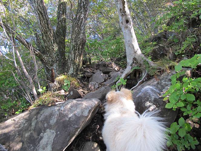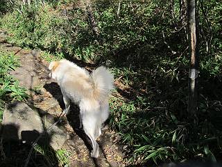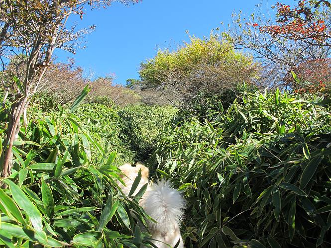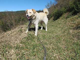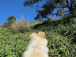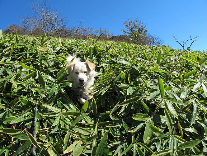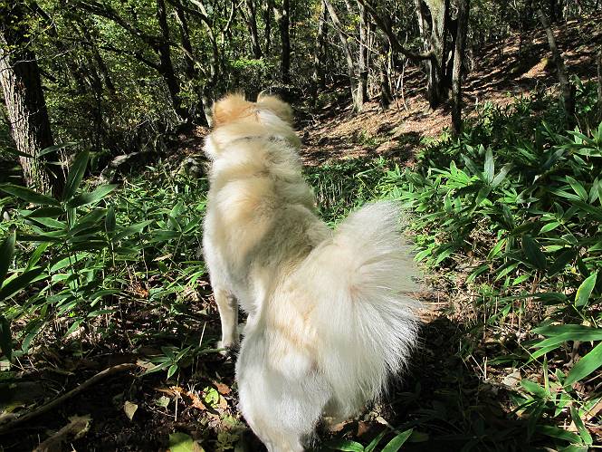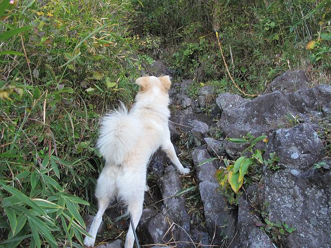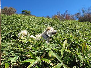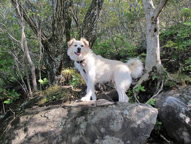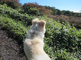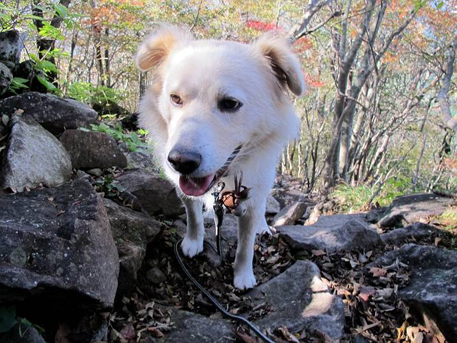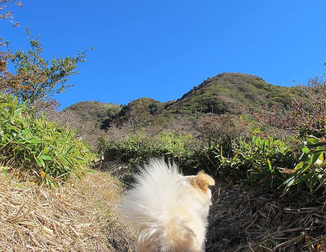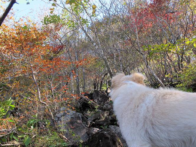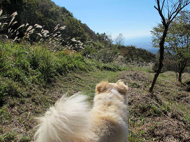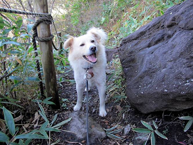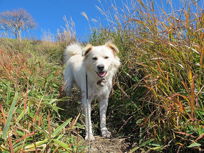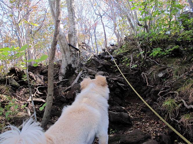 | 平成二十四年十月十九日 Before 写真集目次へ Next 今日はぼくの誕生日です、7才になりました。お天気も良いようで、鍋割山(赤城)をひと回りして、赤城神社に参拝して、お家に帰ったらお母さんが美味しいご馳走を用意して待っててくれるんだって、うれしくってあせっちゃうな。 鍋割山の南側の登山口から歩きました。 すぐに榛名山と浅間山が見えてきました。 すると、岩場が出てきます。 急斜面にロープが用意されてますが、 ぼくは爪が引っかかるので大丈夫です。 こんな狭い所でもスイスイ歩けるよ。 でも、呼吸が早くなるねえ。 「まだ、続く?」、「一旦、緩やかになるよ」 鍋割高原に着きました。 山頂がちょっと見えてきました。 ここからまた岩場に入ります。 つつじの紅葉が始まってます。 ゴツゴツした岩の道が続きます。 大きな木があるなあ。 大分上ってきたなあ。 オー、きれい。 こっちもだ。 でも、この道、急ですね。 葉があまりついてない木がありますね。 ロープが連続してますね。 お父さんはゆっくり歩いてまーす、ぼくは待ってまーす。 もう少しで平らな場所に出るようです。 もう少しだ、頑張っちゃうぞ。 山頂の一段下で、林になってます。 ここは歩きやすいなあ。 鍋破山前不動から上ってくる道と合流しました。帰りはここから下るそうです。 きれいな笹の斜面を上ってます。 笹の中を通りたいなあ 木段を上ってます、 もう直ぐ山頂のようです。 鍋割山山頂到着です。 用意してきたオヤツと水を頂きました。 良い眺めですねえ。 こちらは西側、渋川市で榛名山と浅間山です。 こちらは南側で前橋市、遠くに見えるのは八ヶ岳だそうです。 こちらも前橋市で、富士山と秩父の山々が見えているそうです。 富士山はもう真っ白ですね。 リンドウの花が元気に咲いてました。 これから下ります。 笹の斜面、いいなあ。 歩いて来い、と言ってくれました、いいねえ、面白い。 この辺で道に出ます。 先ほど通った分岐点です。 右に入ります。 つつじが真っ赤に紅葉してました。 「変なのがあるよ、なーに。」 「神様だよ。」 この紅葉もきれいですね。 つるつるな急坂を下って、鍋破山前不動に出ました。 まだまだ危ない急坂が続くんですって。 もう少しで緩やかになるようです。ここで登って来る人に会いました。ぼくのこと、白いカモシカと思ったって言ってました。 ここから左に曲って、 緩やかに来た道に戻るそうです。 ススキがきれいですね。 眺めもいいね、 榛名山です。 石段を下ると 駐車場に出ました。 近くの道路から見た今日の鍋割山です。 しばらく走って、お父さんとの出会いの場所を通って、三夜沢の赤城神社にやってきました。 いつまでも健康で過せるようにお祈りしました。 お賽銭もいれましたよ。 何だか緊張してしまいました。 家に帰って、早速ご馳走です、「食べて良い?」 「待て! だよ」 「良し!」、「いい、いただきまーす」 かつおぶしをふりかけたうどん、ロールケーキ、タマゴ焼き、 ビスケット、ジャッキーを巻いたガム、おいしいなあ。 ブタのおもちゃからガムを抜いて、外で食べようっと。 ガムはこんな格好で食べるんだよ 食べ終わってしまった、ぼく、今日から7才なんだ、早いものですね。番犬、頑張んなくっちゃね。 【忠治と共に 15】 本日で7歳になった忠治、人間の年齢に換算すると概ね44〜54歳のようだ。まだまだ、活発に動ける年齢、野山を歩き廻り、楽しめることでしょう。病的な症状はありませんが、加齢のためでしょうか、夏毛のせいもありましょうか、毛が全体に薄くなりました。今の時期、冬毛が生えるまでには時間があり寒さを感じるのでしょうか、小屋の隅で丸くなって寝ています。食欲は旺盛、4/下旬に3kgオーバーに気づき、夏バテで食欲減退、秋には戻ると考えましたが、そのまま減りませんでしたので、9月から若干食事を減らしてます。 2012/10/19 鍋割山にて 何と言っても健康第一、ブラッシングの時に念入りにチェック、ダニ、怪我、などを含め、異常の早期発見に努めています。 Before 写真集目次へ Next |