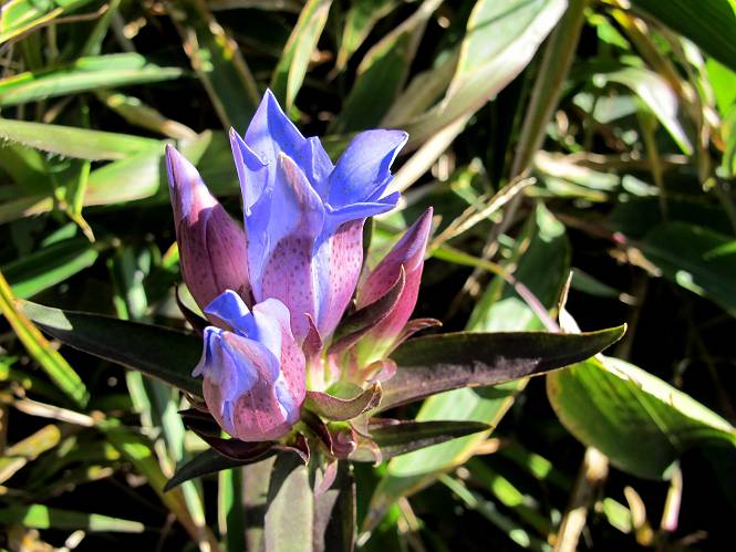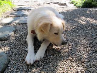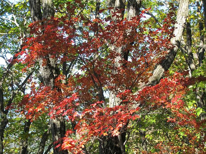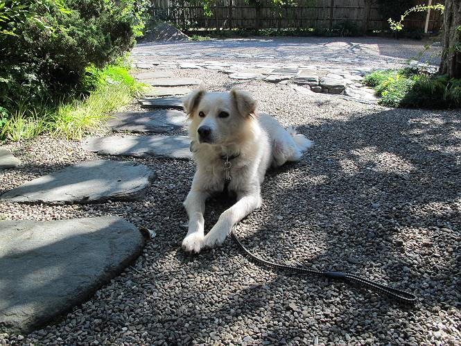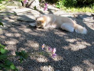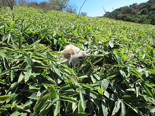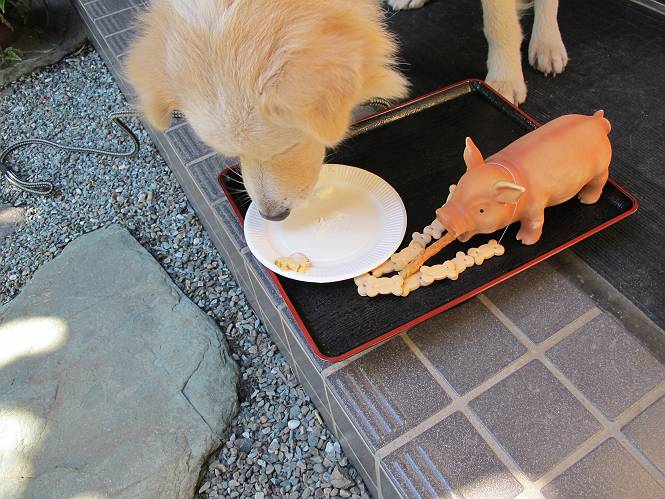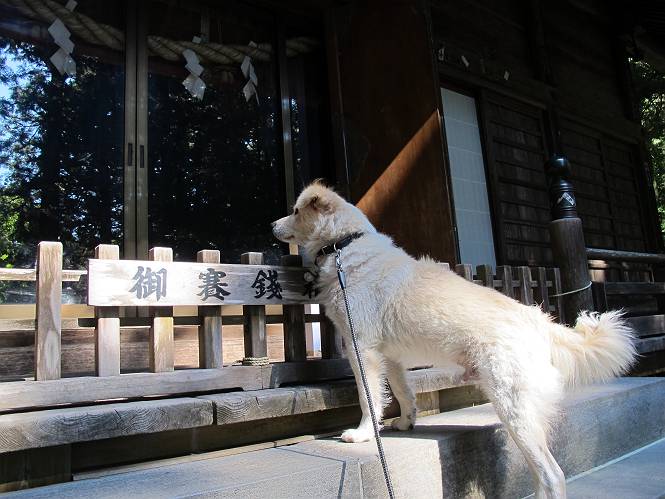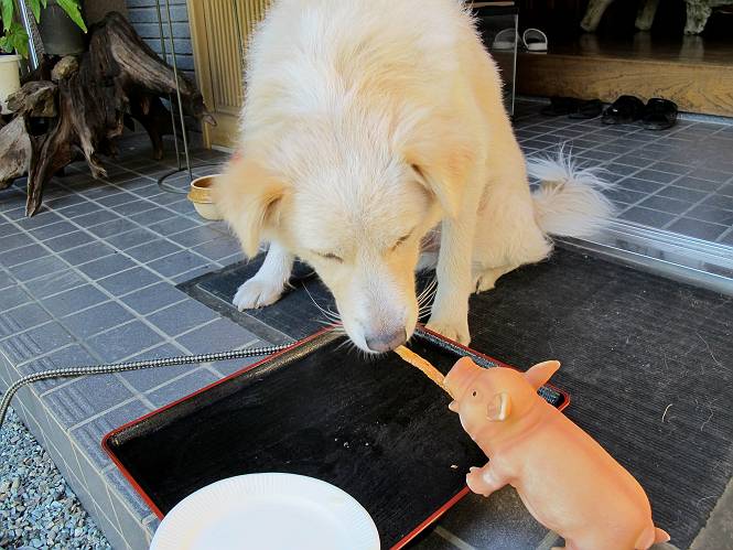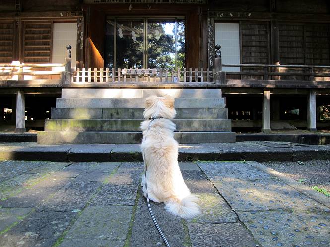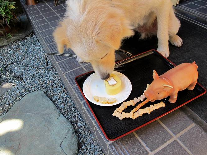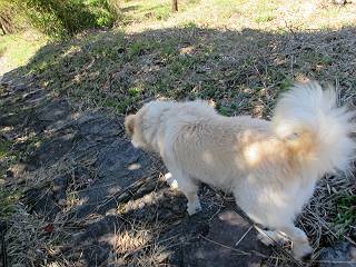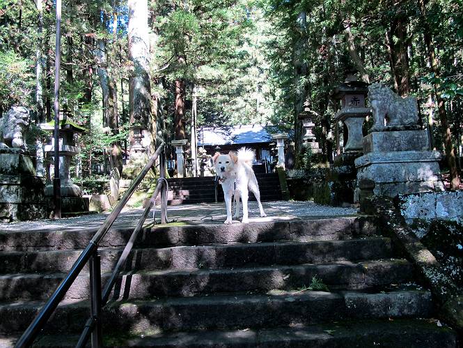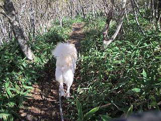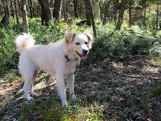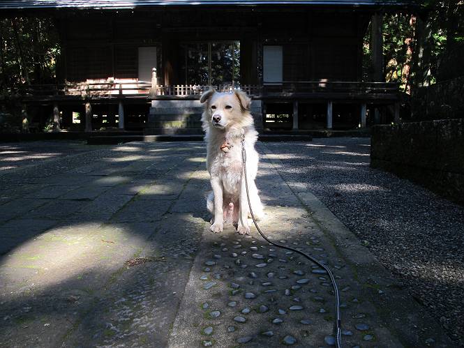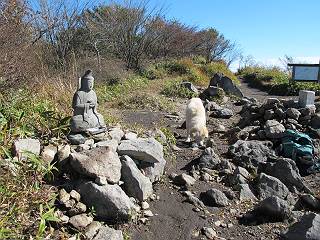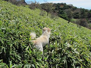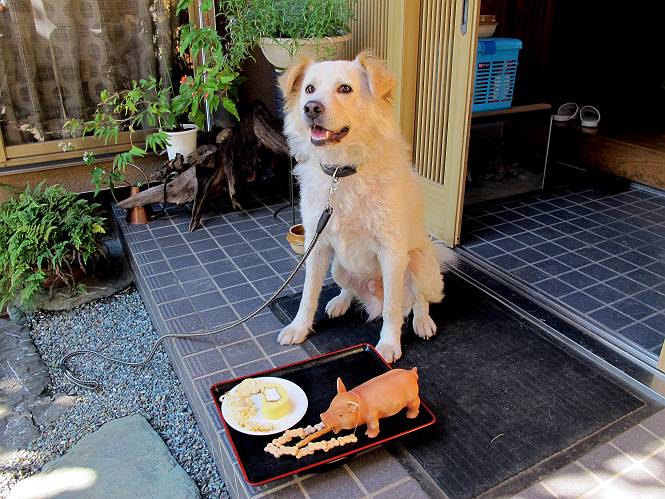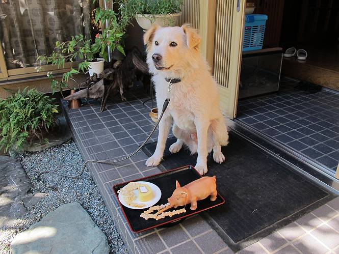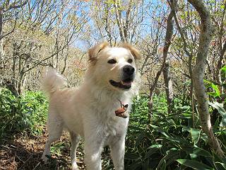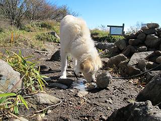 | 平成二十四年十月十九日 Before 写真集目次へ Next 今日はぼくの誕生日です、7才になりました。お天気も良いようで、鍋割山(赤城)をひと回りして、赤城神社に参拝して、お家に帰ったらお母さんが美味しいご馳走を用意して待っててくれるんだって、うれしくってあせっちゃうな。 鍋割山の南側の登山口から歩きました。 すぐに榛名山と浅間山が見えてきました。 すると、岩場が出てきます。 急斜面にロープが用意されてますが、 ぼくは爪が引っかかるので大丈夫です。 こんな狭い所でもスイスイ歩けるよ。 でも、呼吸が早くなるねえ。 「まだ、続く?」、「一旦、緩やかになるよ」 鍋割高原に着きました。 山頂がちょっと見えてきました。 ここからまた岩場に入ります。 つつじの紅葉が始まってます。 ゴツゴツした岩の道が続きます。 大きな木があるなあ。 大分上ってきたなあ。 オー、きれい。 こっちもだ。 でも、この道、急ですね。 葉があまりついてない木がありますね。 ロープが連続してますね。 お父さんはゆっくり歩いてまーす、ぼくは待ってまーす。 もう少しで平らな場所に出るようです。 もう少しだ、頑張っちゃうぞ。 山頂の一段下で、林になってます。 ここは歩きやすいなあ。 鍋破山前不動から上ってくる道と合流しました。帰りはここから下るそうです。 きれいな笹の斜面を上ってます。 笹の中を通りたいなあ 木段を上ってます、 もう直ぐ山頂のようです。 鍋割山山頂到着です。 用意してきたオヤツと水を頂きました。 良い眺めですねえ。 こちらは西側、渋川市で榛名山と浅間山です。 こちらは南側で前橋市、遠くに見えるのは八ヶ岳だそうです。 こちらも前橋市で、富士山と秩父の山々が見えているそうです。 富士山はもう真っ白ですね。 リンドウの花が元気に咲いてました。 これから下ります。 笹の斜面、いいなあ。 歩いて来い、と言ってくれました、いいねえ、面白い。 この辺で道に出ます。 先ほど通った分岐点です。 右に入ります。 つつじが真っ赤に紅葉してました。 「変なのがあるよ、なーに。」 「神様だよ。」 この紅葉もきれいですね。 つるつるな急坂を下って、鍋破山前不動に出ました。 まだまだ危ない急坂が続くんですって。 もう少しで緩やかになるようです。ここで登って来る人に会いました。ぼくのこと、白いカモシカと思ったって言ってました。 ここから左に曲って、 緩やかに来た道に戻るそうです。 ススキがきれいですね。 眺めもいいね、 榛名山です。 石段を下ると 駐車場に出ました。 近くの道路から見た今日の鍋割山です。 しばらく走って、お父さんとの出会いの場所を通って、三夜沢の赤城神社にやってきました。 いつまでも健康で過せるようにお祈りしました。 お賽銭もいれましたよ。 何だか緊張してしまいました。 家に帰って、早速ご馳走です、「食べて良い?」 「待て! だよ」 「良し!」、「いい、いただきまーす」 かつおぶしをふりかけたうどん、ロールケーキ、タマゴ焼き、 ビスケット、ジャッキーを巻いたガム、おいしいなあ。 ブタのおもちゃからガムを抜いて、外で食べようっと。 ガムはこんな格好で食べるんだよ 食べ終わってしまった、ぼく、今日から7才なんだ、早いものですね。番犬、頑張んなくっちゃね。 【忠治と共に 15】 本日で7歳になった忠治、人間の年齢に換算すると概ね44〜54歳のようだ。まだまだ、活発に動ける年齢、野山を歩き廻り、楽しめることでしょう。病的な症状はありませんが、加齢のためでしょうか、夏毛のせいもありましょうか、毛が全体に薄くなりました。今の時期、冬毛が生えるまでには時間があり寒さを感じるのでしょうか、小屋の隅で丸くなって寝ています。食欲は旺盛、4/下旬に3kgオーバーに気づき、夏バテで食欲減退、秋には戻ると考えましたが、そのまま減りませんでしたので、9月から若干食事を減らしてます。 2012/10/19 鍋割山にて 何と言っても健康第一、ブラッシングの時に念入りにチェック、ダニ、怪我、などを含め、異常の早期発見に努めています。 Before 写真集目次へ Next |