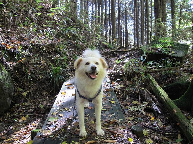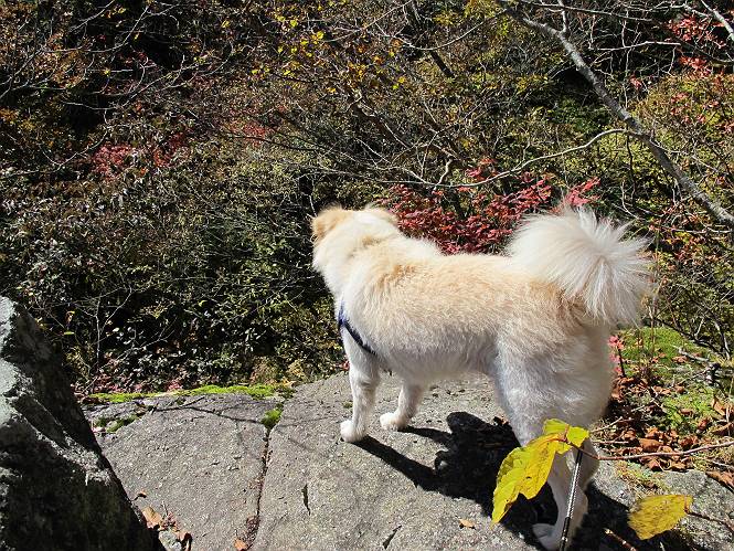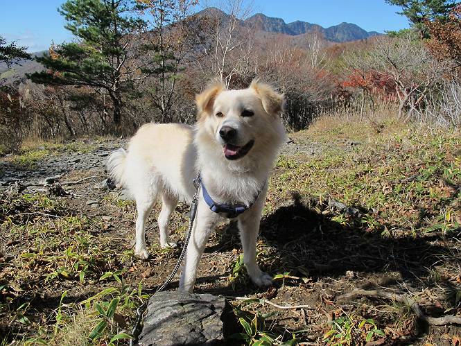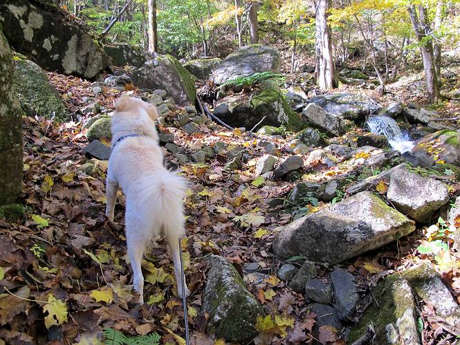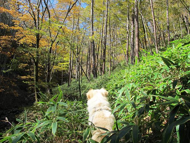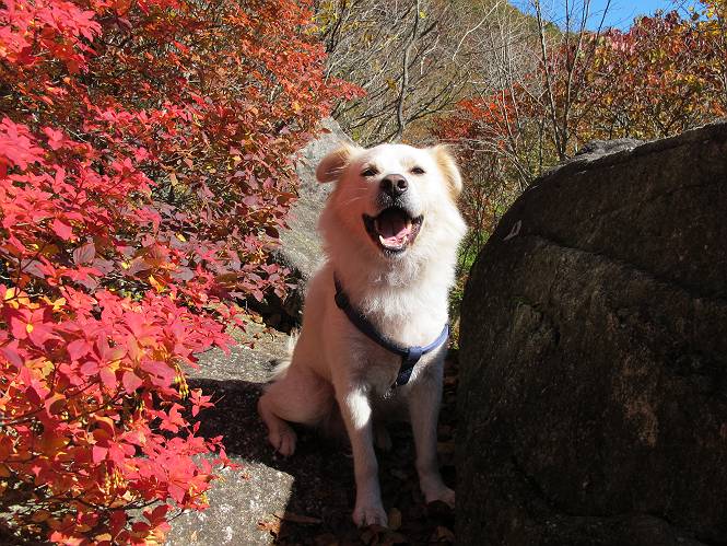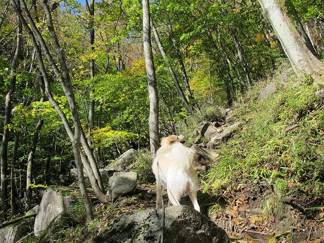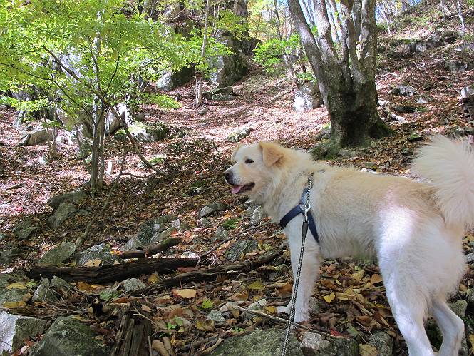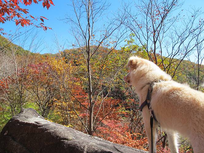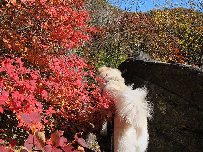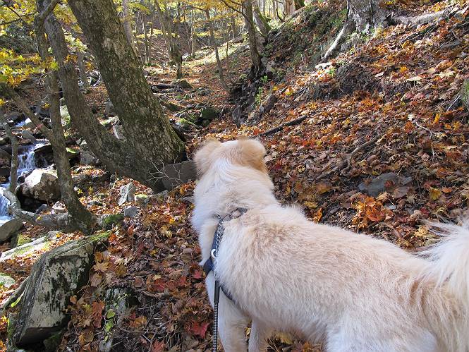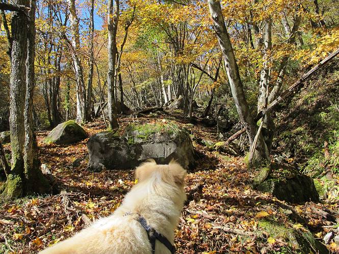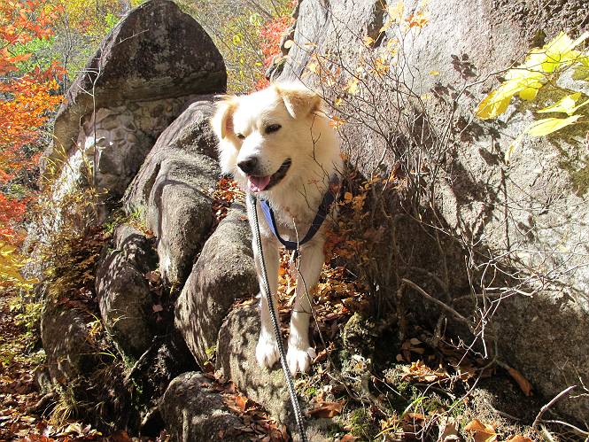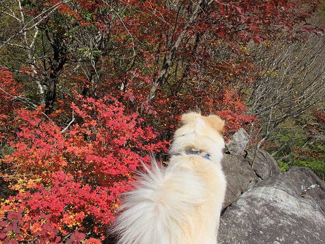 | 平成二十四年十月二十九日 Before 写真集目次へ Next 雨上がり、真っ青な空を見てどこかへ連れてってもらいたくなって、「ワン、ワン・・・・」、すると、お父さんが「忠治、出かけるか」、といつものパターン、ぼくの勝ち。お母さんも一緒、足尾の薬師岳か、袈裟丸山の中腹にある寝釈迦にしようと、草木ダムまで行きますと男体山に雲がかかってましたので寝釈迦にきまりました。沢入から細い山道を走って袈裟丸山の塔ノ沢登山口に着きました。 ここから壊れた林道を終点まで歩き、危なっかしい橋が寝釈迦の入口になります。橋を渡って山道に入ります、ぼく、お父さん、お母さんの順です。 塔ノ沢に沿って、堰堤を幾つか左に見ながら進みます。 大きな岩は時々現れます、「まるで城壁のようだな」、とお父さんが言ってました。 デッカイなあ、 これ、上るのかな? 上れないよね。 沢に時々降りてお水を飲んだり、遊んだりしてます。 また、橋に出ました。 ヒラヒラと葉っぱが落ちてきます。 面白いなあ、 飛びついてみようかな。 沢に降りたり、橋を渡ったりしながら上ってます。 木の葉が大分黄色っぽくなってきました。 赤いのも点々と見えます。 そろそろ紅葉のきれいな場所に出るようです。 上の方は色濃く、 下の方は黄ばんだ葉が輝いてます。 赤いのが、 増えてきました。 奥に岩場があって、 周辺が、 真っ赤っ赤です。 道が緩やかについているので、歩くのが楽ですよ。 丸太の段が出てきました、これは急ですよ。 見上げると紅葉が美しいですよ、ゆっくり眺めながら歩きましょう。 寝釈迦に近づきました、道標が見えてます。 岩の間から寝釈迦に上ります、周りはキレイだけど怖いなあ。 下の沢と黄葉、 まるで黄金の輝きですね。 怖いよう、 ガタガタ、ブルブルです、ちょっとお休みしてます。 やっと落ち着きました、寝釈迦と周りの山と紅葉です。 アブラツツジ アカヤシオ ネジキ 高いなあ。 怖かったけど、素晴しい眺めでした。 寝釈迦を降りて沢の反対側の相輪塔へやってきました。「あれに上るの? うそでしょう」 相輪塔 まだ登れるけれど、 「怖い、もう駄目、降りましょう」 ここは先ほど立った寝釈迦の裏側になります。 「さっき、あれ、登ったんだ」 「ああ、怖かった」 まだ、ぼくもお母さんも疲れてないので、賽ノ河原まで行くそうです。5歳の誕生祝いに前袈裟丸山に連れて来てもらった時、通ってます、お母さんは3回ほど来ているそうです。 紅葉のキレイな林を通り、 クマザサの斜面を横切ったり、 沢を2、3度行ったり来たりしました。 すると、カラマツの林の中に小さなお家(避難小屋)が現れました。 横を通って少し進むと、賽ノ河原に出ました。 おじさんが二人、袈裟丸山から下ってきたところでした。 ちょっとお休みして、展望台まで行くそうです。 展望台の傍から袈裟丸山を入れて撮ってもらいました。 展望台から見た袈裟丸山です。 紅葉はほとんど終わってました。 これは展望台から見た赤城山です。 ぼくも登りたいのですが、真っ直ぐなハシゴなので無理だそうです。 帰りも同じ道を戻りました。 お母さんが、少し遅れてやっと見えました。 今日歩いた寝釈迦は賽ノ河原のほぼ中間点に位置するそうです。足場は岩だらけで、その上、落葉に遮られて歩きにくかったですが、沢筋や紅葉がきれいだったですよ。 Before 写真集目次へ Next |