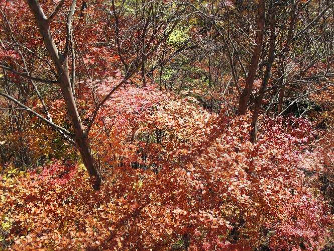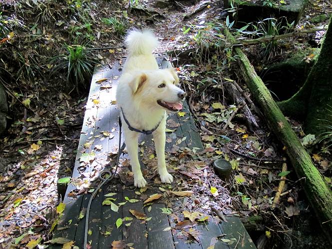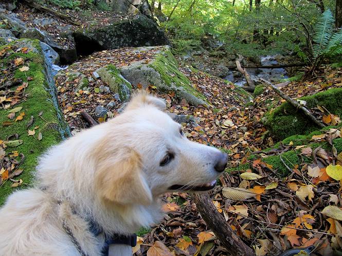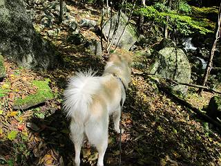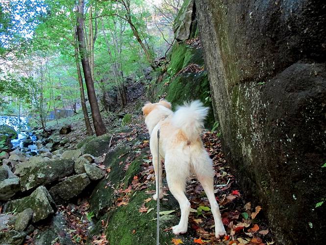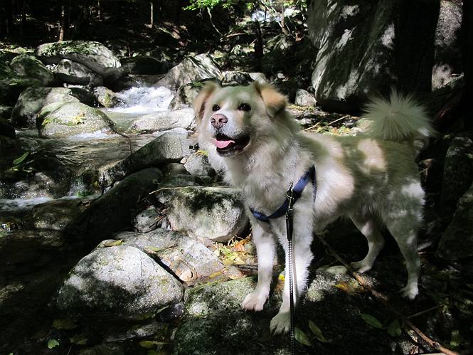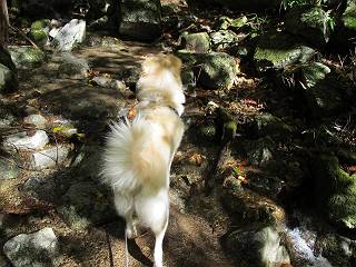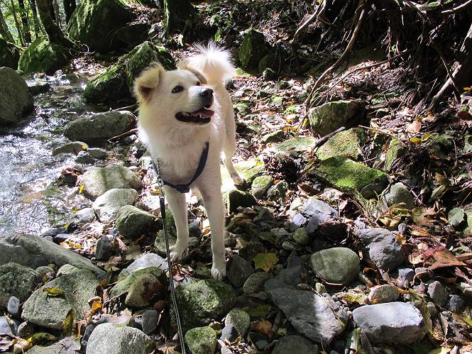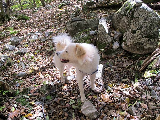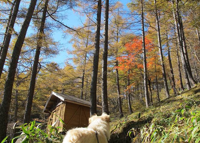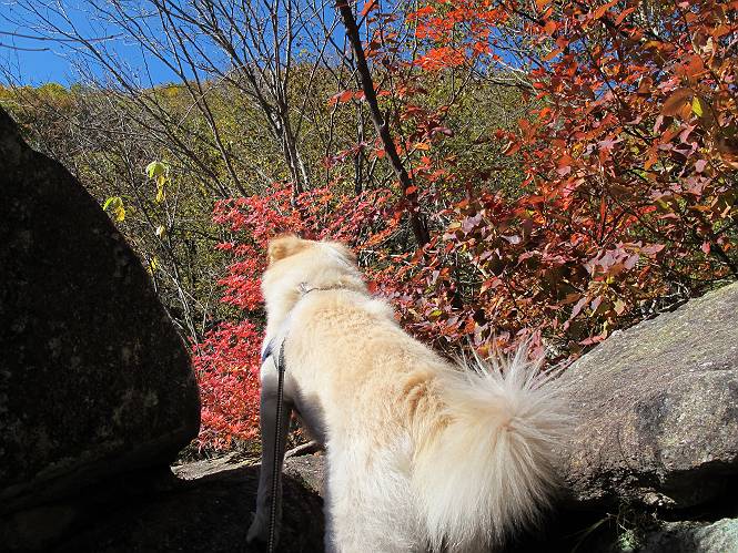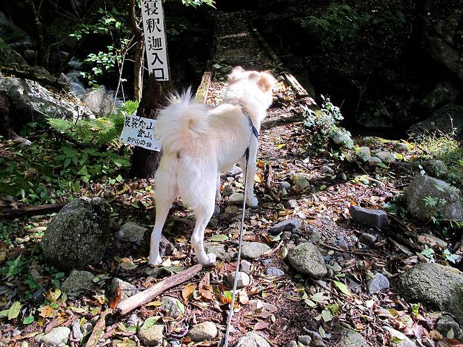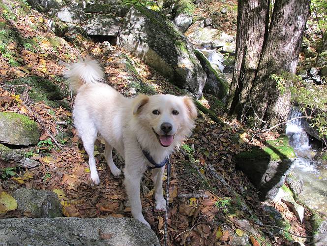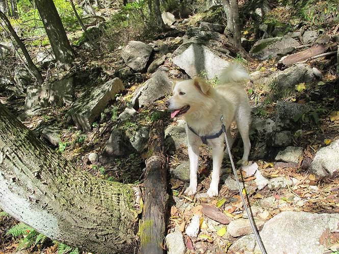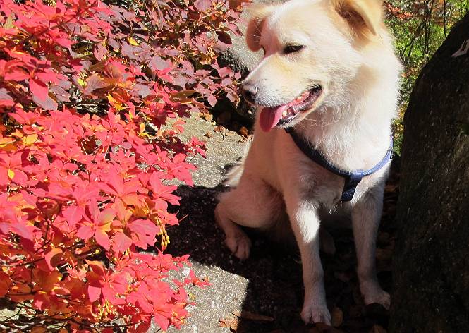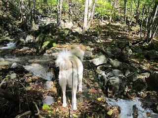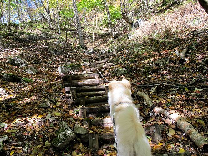 | 平成二十四年十月二十九日 Before 写真集目次へ Next 雨上がり、真っ青な空を見てどこかへ連れてってもらいたくなって、「ワン、ワン・・・・」、すると、お父さんが「忠治、出かけるか」、といつものパターン、ぼくの勝ち。お母さんも一緒、足尾の薬師岳か、袈裟丸山の中腹にある寝釈迦にしようと、草木ダムまで行きますと男体山に雲がかかってましたので寝釈迦にきまりました。沢入から細い山道を走って袈裟丸山の塔ノ沢登山口に着きました。 ここから壊れた林道を終点まで歩き、危なっかしい橋が寝釈迦の入口になります。橋を渡って山道に入ります、ぼく、お父さん、お母さんの順です。 塔ノ沢に沿って、堰堤を幾つか左に見ながら進みます。 大きな岩は時々現れます、「まるで城壁のようだな」、とお父さんが言ってました。 デッカイなあ、 これ、上るのかな? 上れないよね。 沢に時々降りてお水を飲んだり、遊んだりしてます。 また、橋に出ました。 ヒラヒラと葉っぱが落ちてきます。 面白いなあ、 飛びついてみようかな。 沢に降りたり、橋を渡ったりしながら上ってます。 木の葉が大分黄色っぽくなってきました。 赤いのも点々と見えます。 そろそろ紅葉のきれいな場所に出るようです。 上の方は色濃く、 下の方は黄ばんだ葉が輝いてます。 赤いのが、 増えてきました。 奥に岩場があって、 周辺が、 真っ赤っ赤です。 道が緩やかについているので、歩くのが楽ですよ。 丸太の段が出てきました、これは急ですよ。 見上げると紅葉が美しいですよ、ゆっくり眺めながら歩きましょう。 寝釈迦に近づきました、道標が見えてます。 岩の間から寝釈迦に上ります、周りはキレイだけど怖いなあ。 下の沢と黄葉、 まるで黄金の輝きですね。 怖いよう、 ガタガタ、ブルブルです、ちょっとお休みしてます。 やっと落ち着きました、寝釈迦と周りの山と紅葉です。 アブラツツジ アカヤシオ ネジキ 高いなあ。 怖かったけど、素晴しい眺めでした。 寝釈迦を降りて沢の反対側の相輪塔へやってきました。「あれに上るの? うそでしょう」 相輪塔 まだ登れるけれど、 「怖い、もう駄目、降りましょう」 ここは先ほど立った寝釈迦の裏側になります。 「さっき、あれ、登ったんだ」 「ああ、怖かった」 まだ、ぼくもお母さんも疲れてないので、賽ノ河原まで行くそうです。5歳の誕生祝いに前袈裟丸山に連れて来てもらった時、通ってます、お母さんは3回ほど来ているそうです。 紅葉のキレイな林を通り、 クマザサの斜面を横切ったり、 沢を2、3度行ったり来たりしました。 すると、カラマツの林の中に小さなお家(避難小屋)が現れました。 横を通って少し進むと、賽ノ河原に出ました。 おじさんが二人、袈裟丸山から下ってきたところでした。 ちょっとお休みして、展望台まで行くそうです。 展望台の傍から袈裟丸山を入れて撮ってもらいました。 展望台から見た袈裟丸山です。 紅葉はほとんど終わってました。 これは展望台から見た赤城山です。 ぼくも登りたいのですが、真っ直ぐなハシゴなので無理だそうです。 帰りも同じ道を戻りました。 お母さんが、少し遅れてやっと見えました。 今日歩いた寝釈迦は賽ノ河原のほぼ中間点に位置するそうです。足場は岩だらけで、その上、落葉に遮られて歩きにくかったですが、沢筋や紅葉がきれいだったですよ。 Before 写真集目次へ Next |