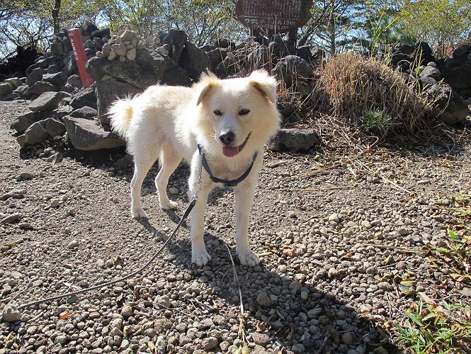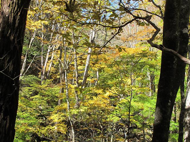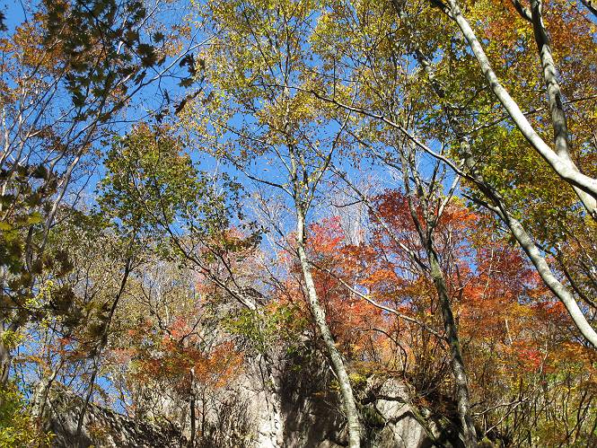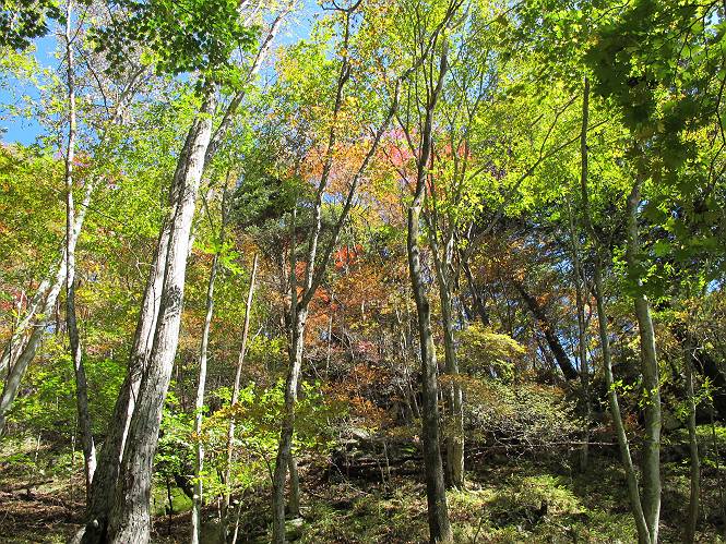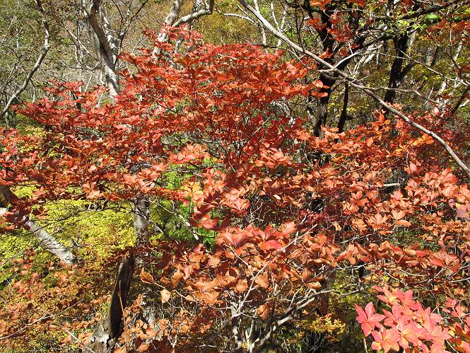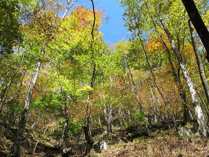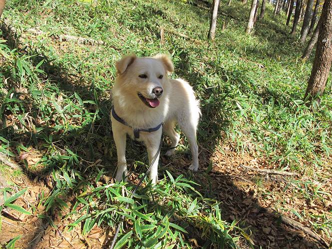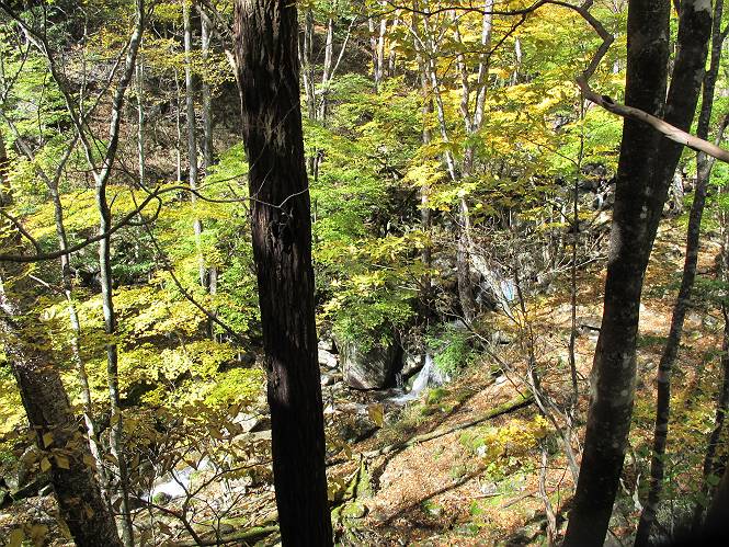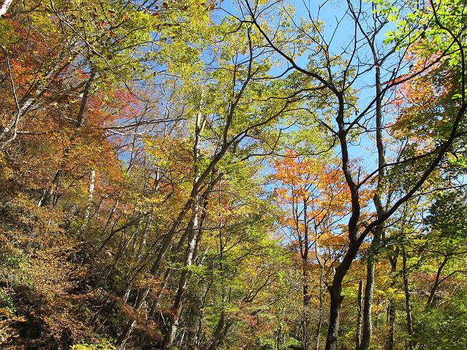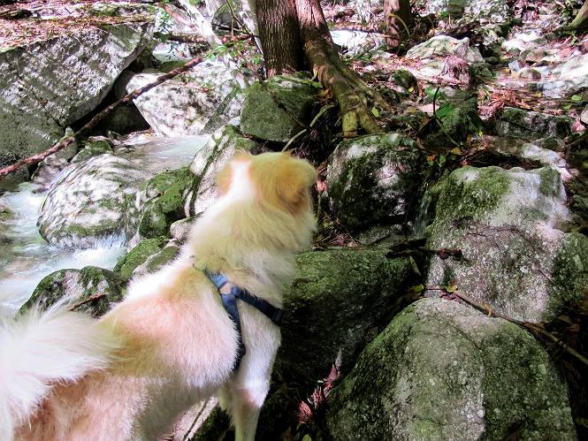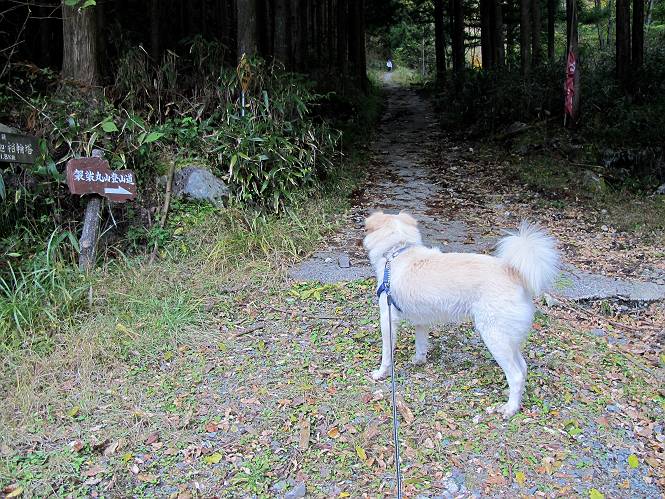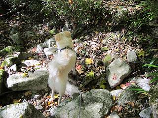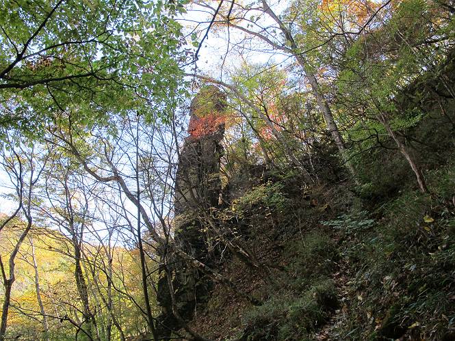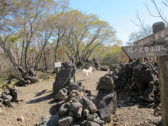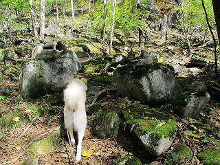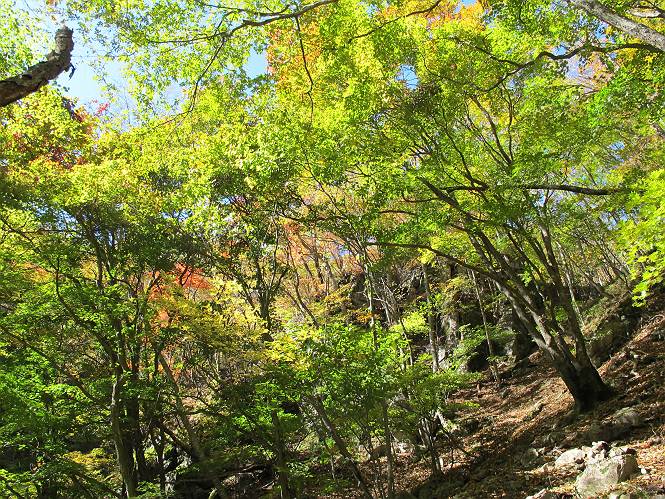 | 平成二十四年十月二十九日 Before 写真集目次へ Next 雨上がり、真っ青な空を見てどこかへ連れてってもらいたくなって、「ワン、ワン・・・・」、すると、お父さんが「忠治、出かけるか」、といつものパターン、ぼくの勝ち。お母さんも一緒、足尾の薬師岳か、袈裟丸山の中腹にある寝釈迦にしようと、草木ダムまで行きますと男体山に雲がかかってましたので寝釈迦にきまりました。沢入から細い山道を走って袈裟丸山の塔ノ沢登山口に着きました。 ここから壊れた林道を終点まで歩き、危なっかしい橋が寝釈迦の入口になります。橋を渡って山道に入ります、ぼく、お父さん、お母さんの順です。 塔ノ沢に沿って、堰堤を幾つか左に見ながら進みます。 大きな岩は時々現れます、「まるで城壁のようだな」、とお父さんが言ってました。 デッカイなあ、 これ、上るのかな? 上れないよね。 沢に時々降りてお水を飲んだり、遊んだりしてます。 また、橋に出ました。 ヒラヒラと葉っぱが落ちてきます。 面白いなあ、 飛びついてみようかな。 沢に降りたり、橋を渡ったりしながら上ってます。 木の葉が大分黄色っぽくなってきました。 赤いのも点々と見えます。 そろそろ紅葉のきれいな場所に出るようです。 上の方は色濃く、 下の方は黄ばんだ葉が輝いてます。 赤いのが、 増えてきました。 奥に岩場があって、 周辺が、 真っ赤っ赤です。 道が緩やかについているので、歩くのが楽ですよ。 丸太の段が出てきました、これは急ですよ。 見上げると紅葉が美しいですよ、ゆっくり眺めながら歩きましょう。 寝釈迦に近づきました、道標が見えてます。 岩の間から寝釈迦に上ります、周りはキレイだけど怖いなあ。 下の沢と黄葉、 まるで黄金の輝きですね。 怖いよう、 ガタガタ、ブルブルです、ちょっとお休みしてます。 やっと落ち着きました、寝釈迦と周りの山と紅葉です。 アブラツツジ アカヤシオ ネジキ 高いなあ。 怖かったけど、素晴しい眺めでした。 寝釈迦を降りて沢の反対側の相輪塔へやってきました。「あれに上るの? うそでしょう」 相輪塔 まだ登れるけれど、 「怖い、もう駄目、降りましょう」 ここは先ほど立った寝釈迦の裏側になります。 「さっき、あれ、登ったんだ」 「ああ、怖かった」 まだ、ぼくもお母さんも疲れてないので、賽ノ河原まで行くそうです。5歳の誕生祝いに前袈裟丸山に連れて来てもらった時、通ってます、お母さんは3回ほど来ているそうです。 紅葉のキレイな林を通り、 クマザサの斜面を横切ったり、 沢を2、3度行ったり来たりしました。 すると、カラマツの林の中に小さなお家(避難小屋)が現れました。 横を通って少し進むと、賽ノ河原に出ました。 おじさんが二人、袈裟丸山から下ってきたところでした。 ちょっとお休みして、展望台まで行くそうです。 展望台の傍から袈裟丸山を入れて撮ってもらいました。 展望台から見た袈裟丸山です。 紅葉はほとんど終わってました。 これは展望台から見た赤城山です。 ぼくも登りたいのですが、真っ直ぐなハシゴなので無理だそうです。 帰りも同じ道を戻りました。 お母さんが、少し遅れてやっと見えました。 今日歩いた寝釈迦は賽ノ河原のほぼ中間点に位置するそうです。足場は岩だらけで、その上、落葉に遮られて歩きにくかったですが、沢筋や紅葉がきれいだったですよ。 Before 写真集目次へ Next |