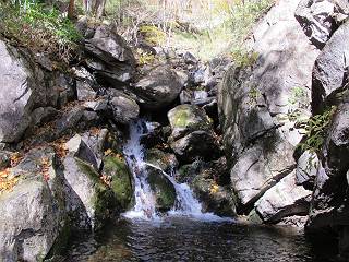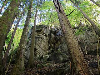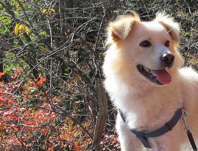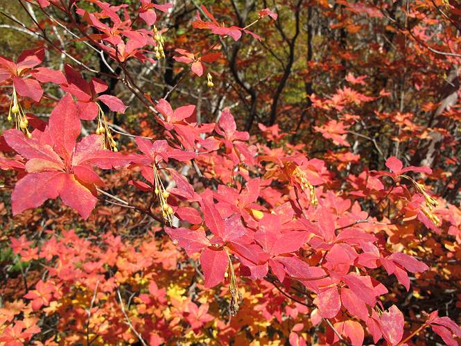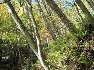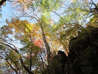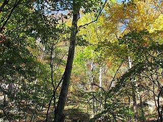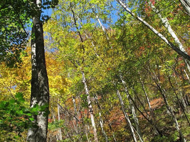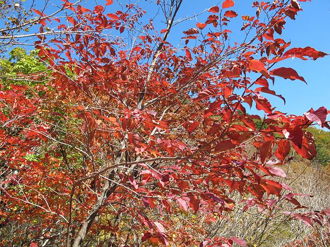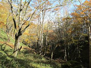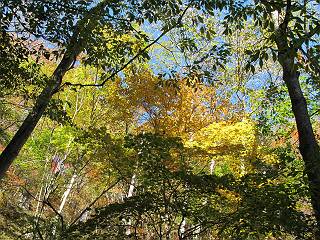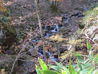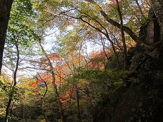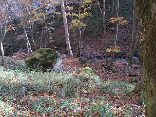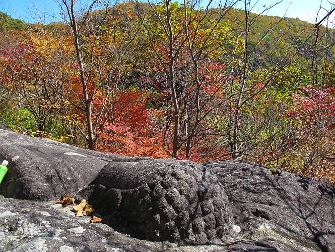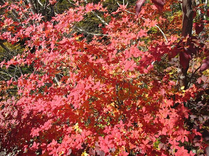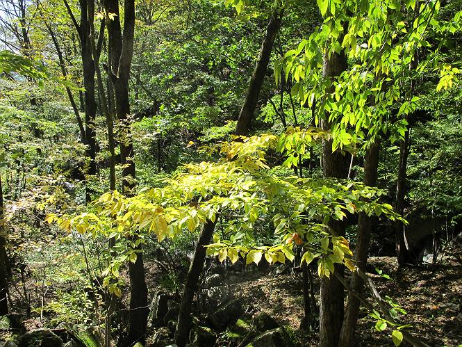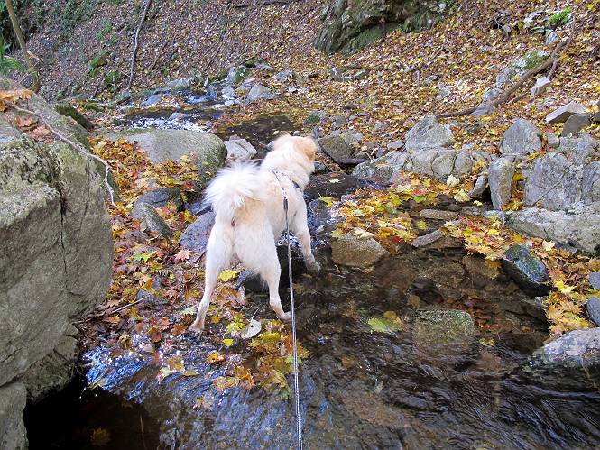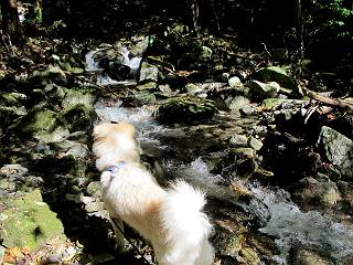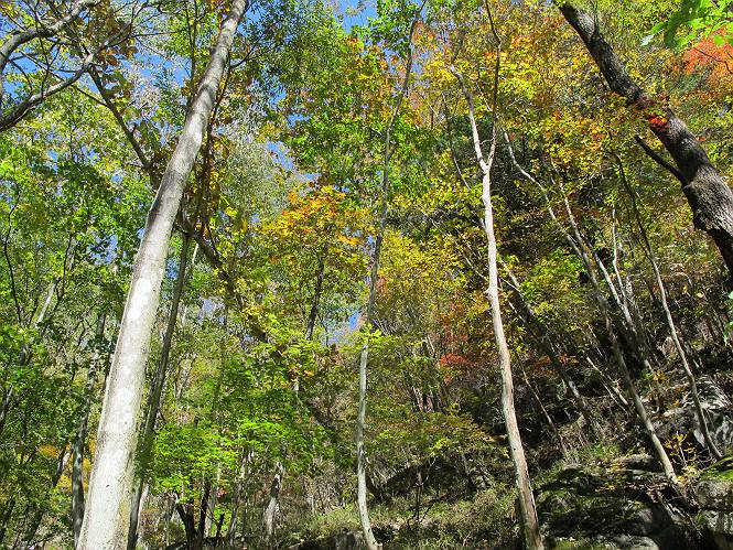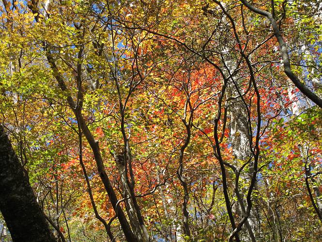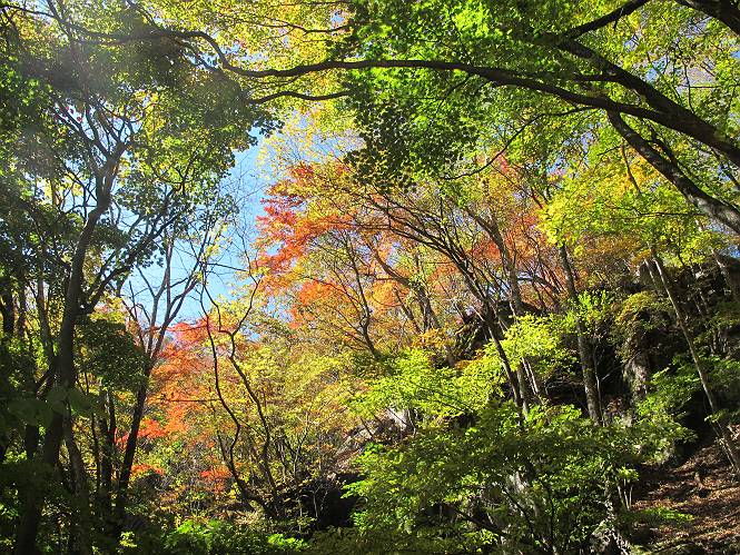 | 平成二十四年十月二十九日 Before 写真集目次へ Next 雨上がり、真っ青な空を見てどこかへ連れてってもらいたくなって、「ワン、ワン・・・・」、すると、お父さんが「忠治、出かけるか」、といつものパターン、ぼくの勝ち。お母さんも一緒、足尾の薬師岳か、袈裟丸山の中腹にある寝釈迦にしようと、草木ダムまで行きますと男体山に雲がかかってましたので寝釈迦にきまりました。沢入から細い山道を走って袈裟丸山の塔ノ沢登山口に着きました。 ここから壊れた林道を終点まで歩き、危なっかしい橋が寝釈迦の入口になります。橋を渡って山道に入ります、ぼく、お父さん、お母さんの順です。 塔ノ沢に沿って、堰堤を幾つか左に見ながら進みます。 大きな岩は時々現れます、「まるで城壁のようだな」、とお父さんが言ってました。 デッカイなあ、 これ、上るのかな? 上れないよね。 沢に時々降りてお水を飲んだり、遊んだりしてます。 また、橋に出ました。 ヒラヒラと葉っぱが落ちてきます。 面白いなあ、 飛びついてみようかな。 沢に降りたり、橋を渡ったりしながら上ってます。 木の葉が大分黄色っぽくなってきました。 赤いのも点々と見えます。 そろそろ紅葉のきれいな場所に出るようです。 上の方は色濃く、 下の方は黄ばんだ葉が輝いてます。 赤いのが、 増えてきました。 奥に岩場があって、 周辺が、 真っ赤っ赤です。 道が緩やかについているので、歩くのが楽ですよ。 丸太の段が出てきました、これは急ですよ。 見上げると紅葉が美しいですよ、ゆっくり眺めながら歩きましょう。 寝釈迦に近づきました、道標が見えてます。 岩の間から寝釈迦に上ります、周りはキレイだけど怖いなあ。 下の沢と黄葉、 まるで黄金の輝きですね。 怖いよう、 ガタガタ、ブルブルです、ちょっとお休みしてます。 やっと落ち着きました、寝釈迦と周りの山と紅葉です。 アブラツツジ アカヤシオ ネジキ 高いなあ。 怖かったけど、素晴しい眺めでした。 寝釈迦を降りて沢の反対側の相輪塔へやってきました。「あれに上るの? うそでしょう」 相輪塔 まだ登れるけれど、 「怖い、もう駄目、降りましょう」 ここは先ほど立った寝釈迦の裏側になります。 「さっき、あれ、登ったんだ」 「ああ、怖かった」 まだ、ぼくもお母さんも疲れてないので、賽ノ河原まで行くそうです。5歳の誕生祝いに前袈裟丸山に連れて来てもらった時、通ってます、お母さんは3回ほど来ているそうです。 紅葉のキレイな林を通り、 クマザサの斜面を横切ったり、 沢を2、3度行ったり来たりしました。 すると、カラマツの林の中に小さなお家(避難小屋)が現れました。 横を通って少し進むと、賽ノ河原に出ました。 おじさんが二人、袈裟丸山から下ってきたところでした。 ちょっとお休みして、展望台まで行くそうです。 展望台の傍から袈裟丸山を入れて撮ってもらいました。 展望台から見た袈裟丸山です。 紅葉はほとんど終わってました。 これは展望台から見た赤城山です。 ぼくも登りたいのですが、真っ直ぐなハシゴなので無理だそうです。 帰りも同じ道を戻りました。 お母さんが、少し遅れてやっと見えました。 今日歩いた寝釈迦は賽ノ河原のほぼ中間点に位置するそうです。足場は岩だらけで、その上、落葉に遮られて歩きにくかったですが、沢筋や紅葉がきれいだったですよ。 Before 写真集目次へ Next |
