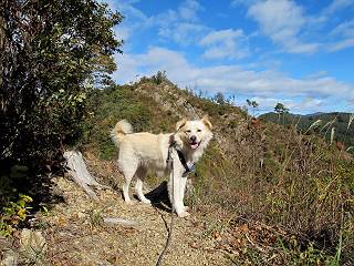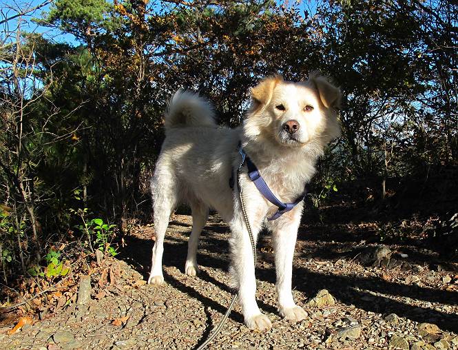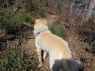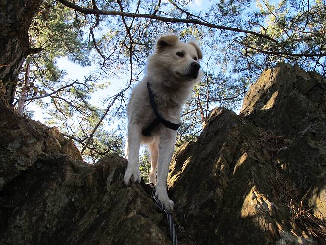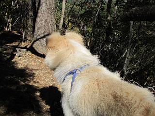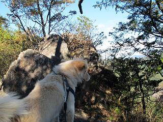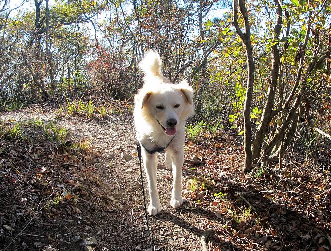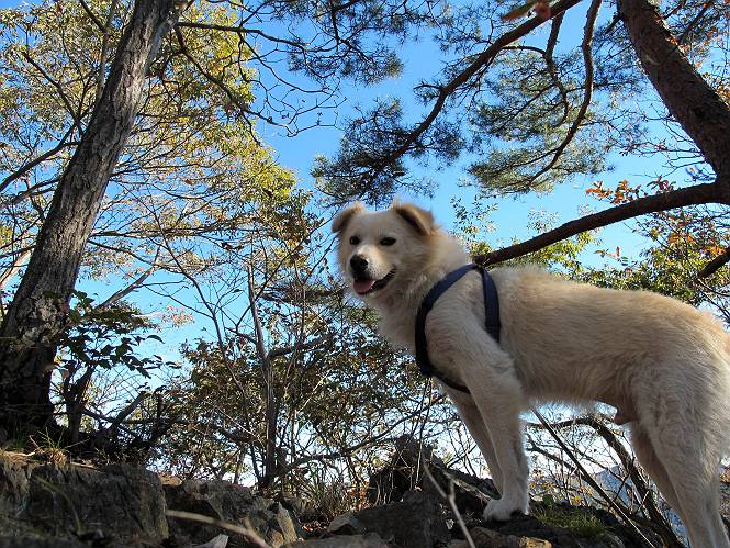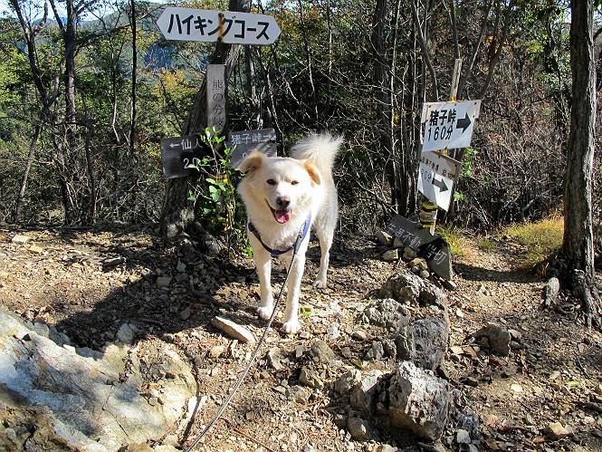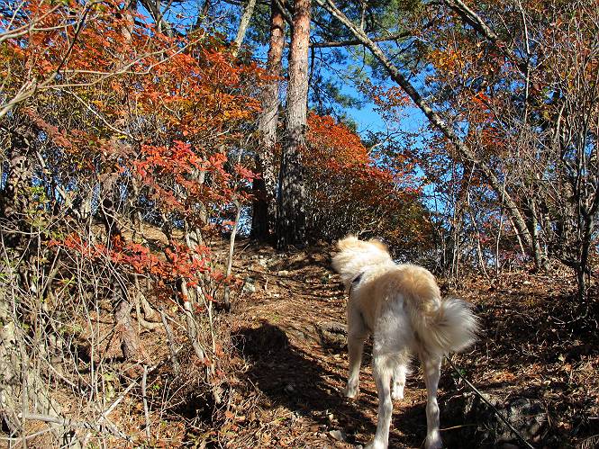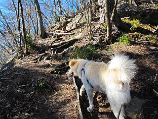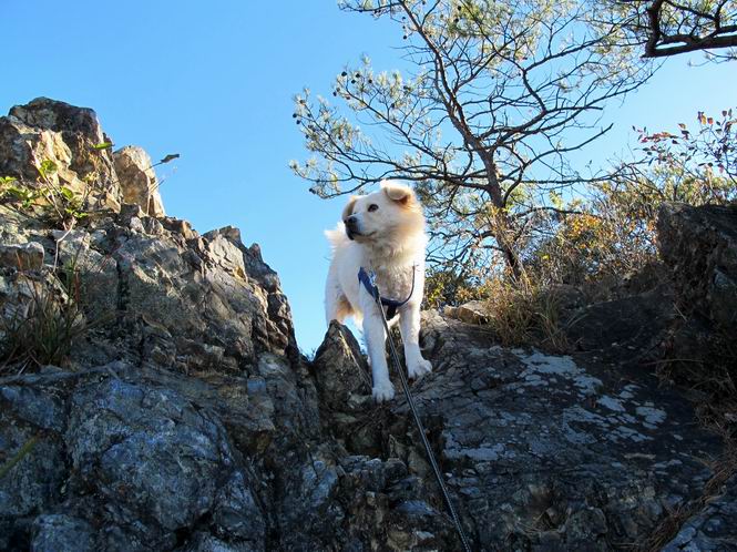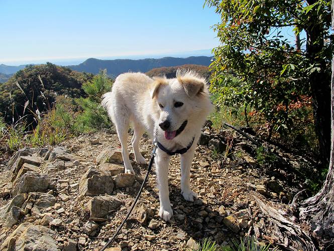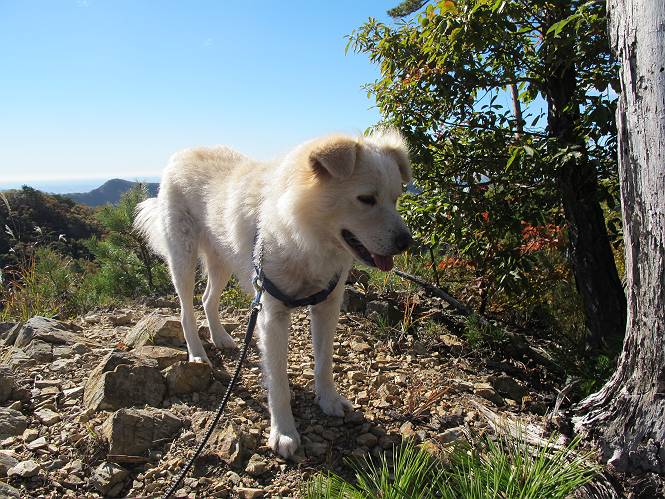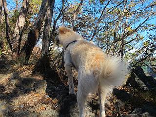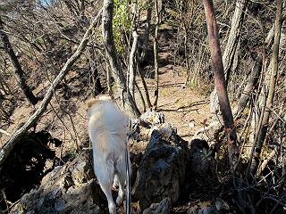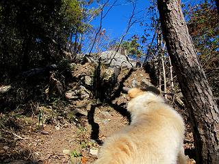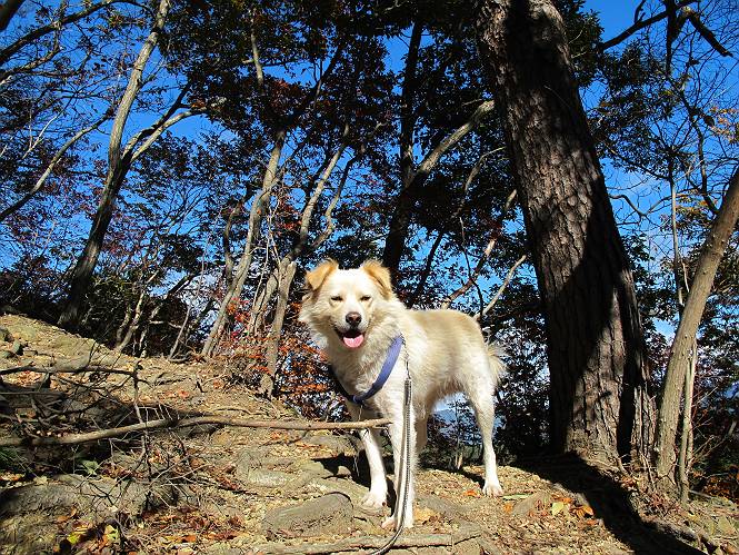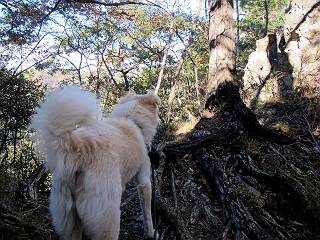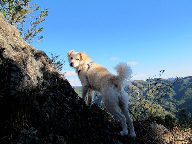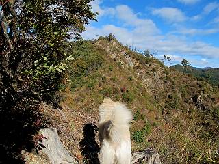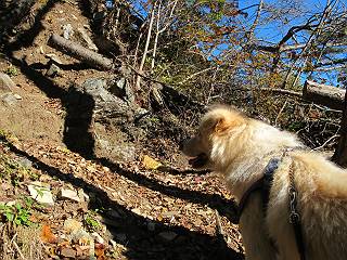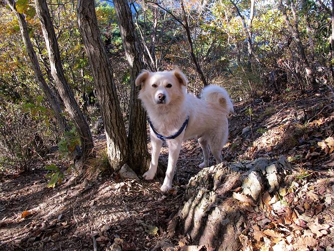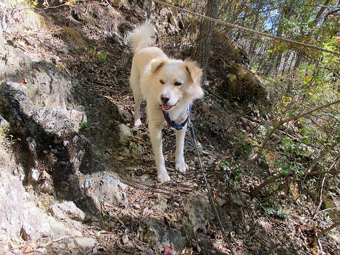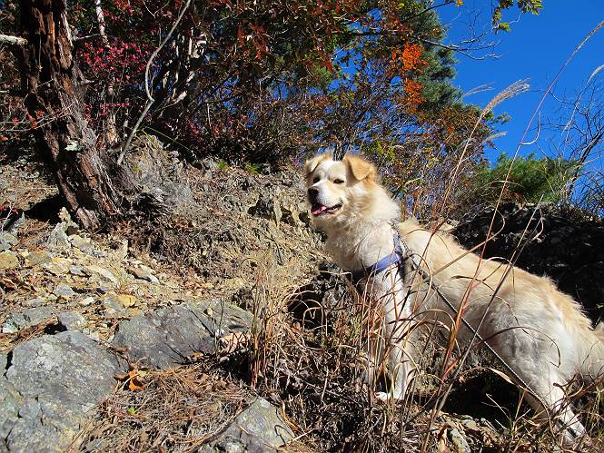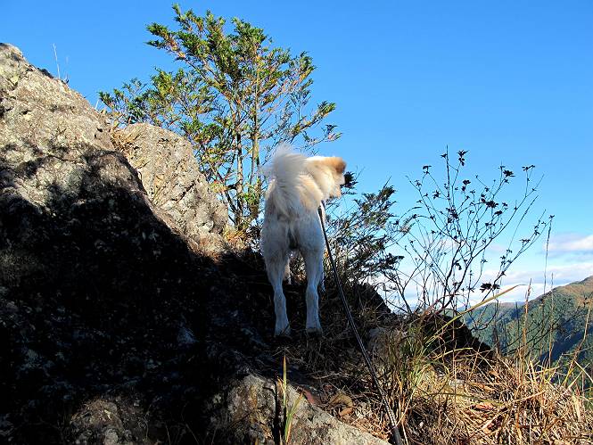 | 平成二十四年十一月十日 Before 写真集目次へ Next お父さんの予定が急に変わって、足利の仙人ケ岳へ連れてってもらいました、1年半ぶりです。歩くコースは前と同じで、松田川ダムの南尾根から山頂へ、帰りは岩切沢に沿って下ります。 猪子トンネルの東側から林道を少し歩きます。 道標にしたがって山道に入ります。 急坂を抜けた所です。 右に進むと直ぐに猪子峠に出ます。左は深高山、右は仙人ケ岳です。 うっそうとした桧の林を抜けます。 急坂ですが直ぐに抜けて明るい尾根道に出ます。 しばらく進むと岩まじりの落葉樹の道に変ります。 お父さんが、 「紅葉が見られる」と言ってましたが、まだ色づいた木が少し見えるだけです。 見晴らしの良い場所に出ました、風もなく暑いです。 南に富士山が見えます、右は深高山です。 岩場を上ると、 平らな場所に出ました、道がここで大きく左に曲ります。 少し下ると、 赤雪山の良く見える場所に出ました。 少し進むと大きな岩場に突き当たりました。 この岩に「忠治、上れ」、って言うんです。 下は深い谷からダムになってます、怖いなあ。 「それ、もう少しだ、頑張れ」、怖いけど・・・・。 やっと登りました、怖かったなあ。 その先も岩場が連続してました、ここはラクチンです。 ここを上ると小さなピークに出るそうです。 ここがヤシオツツジの綺麗に咲く所だそうです。 岩場を少し進むと南の尾根と仙人ケ岳が一望できます。 またまた、怖そうな岩場です。 でも、素晴しい景色です。 南に深高の尾根と富士山が見えます。 富士山を拡大しました、真っ白ですね。 ツツジの紅葉がきれいな場所にでました、アカヤシオだそうです。 少し下って登り返してます、道が大分ガレてます。 次に下ると“犬帰り”という岩場に出ました。クサリ場でぼくは通れませんので、下の巻き道を下って、 登り返して、 尾根に出ます。 また、紅葉の綺麗な所に出ました。 赤雪山と松田川ダムも 綺麗に見えます。 こっち側もいいなあ。 また、また岩場の切り立った場所です、面白いのですが、・・・・。 また下って、山火事現場が正面に見える場所にきました。 リンドウが一輪だけ咲いてました。 ここからまた坂道です、ピークに近づくと展望が開けます。南に富士山が見えます。 東に上ってきた、 凸凹した尾根が見えます。 下には、 松田川ダムが見えます。 紅葉を眺めながら、 お休みしてます。 ここから少し進むと、山火事の跡を通ります。 地面には、もう松や桧の小さな木が育っています。 松 桧 やっと、熊の分岐に着きました。 もう少しで山頂に着くようですが、なかなか進みません。 立ち止まって、紅葉を眺めたりしながら、 一歩一歩進みます。 やっと、仙人ケ岳山頂に着きました。 少し疲れてますが、食欲はスゴイですよ。 疲れたなあ、まだ食べたいんだけど、お父さんがくれないんだよね。 ちょっとお休みしたら、元気を取戻しました。 下りですからスイスイです。 大蛇のように曲った松、とうとう枯れてしまったようです。お父さんが残念がってました。 松の幹 最後まで残っていた枝 熊の分岐から沢に下ってます。 沢筋もスイスイ、下りはラクチンですね。 生不動に到着です、これから山頂に向かう人がいました。 丸太を組んだ橋を沢山渡りました。 途中で、疲れ直しにちょっと遊ばしてもらって、 顔が泥だらけだってさ、ぼくわかりません。 ぼく疲れてないよ、林道をさっそうと歩いて、 道路を歩き、トンネルを抜ければゴールです。 Before 写真集目次へ Next |