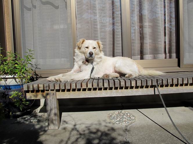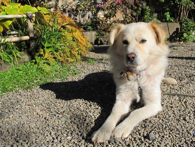 | 平成二十四年十一月二十五日 Before 写真集目次へ Next 今日は久しぶりに風もなく良い天気ですね。お父さんは、庭の花とか、紅葉の写真を撮ってます。お母さんは、お庭を掃除したり、洗濯物を干したり、そうそう、昨日頂いたボタンを植えてました。それを、日向からじっと見ています。 今、脚立の上から紅葉の写真を撮ってます。 ぼくは、怖くて脚立なんか上れないよ。 干し柿と紅葉だってさ、干し柿って美味しいんだよね、 でもぼくは食べてはいけないんだってさ。 これはツツジの紅葉です、真っ赤っかでしょう。 見てるだけでは飽きちゃって、穴掘りを始めると、「忠治、コラ!」って怒られちゃうんだよ。 そして、縁台の上でオヤツ待ちです。お母さんは、まだ庭にいます、早く・・・・。 Before 写真集目次へ Next |