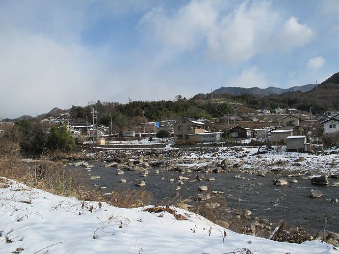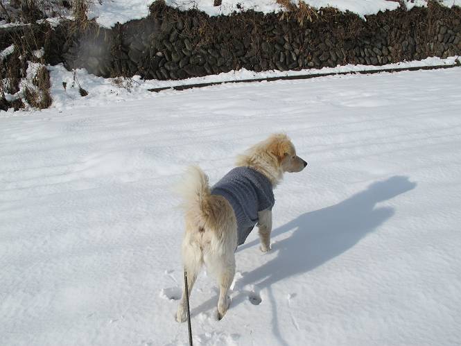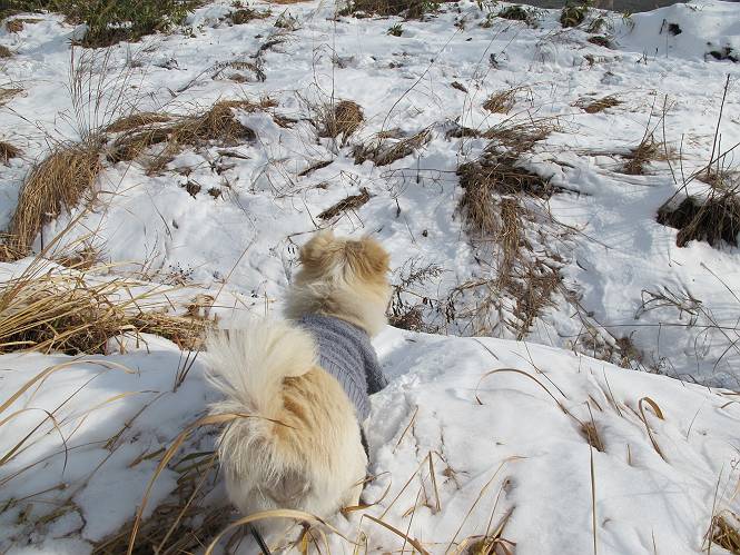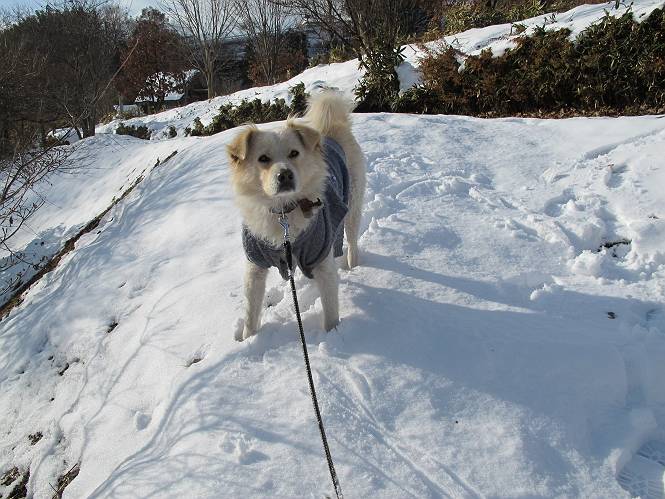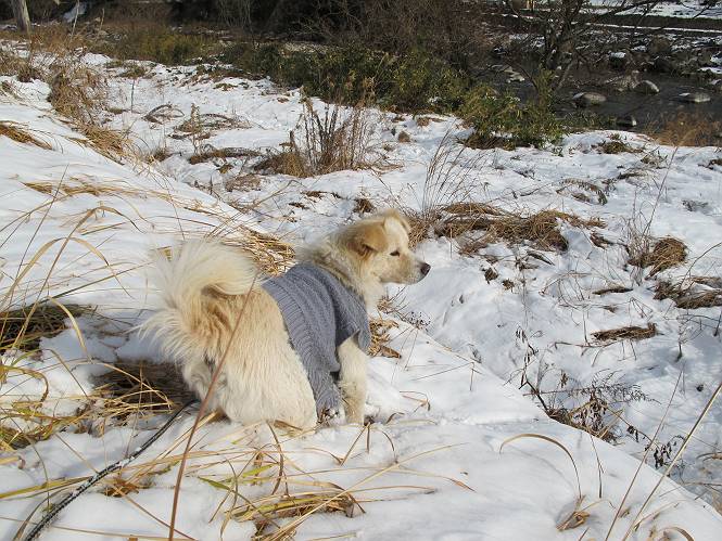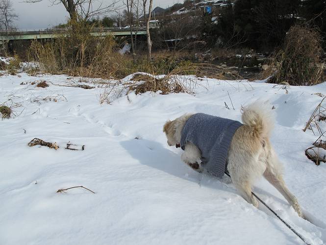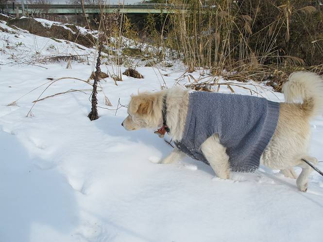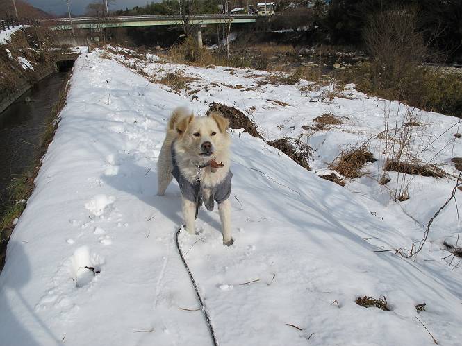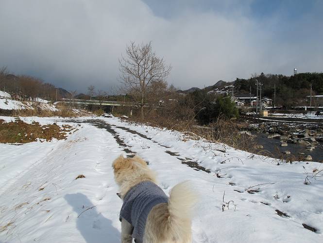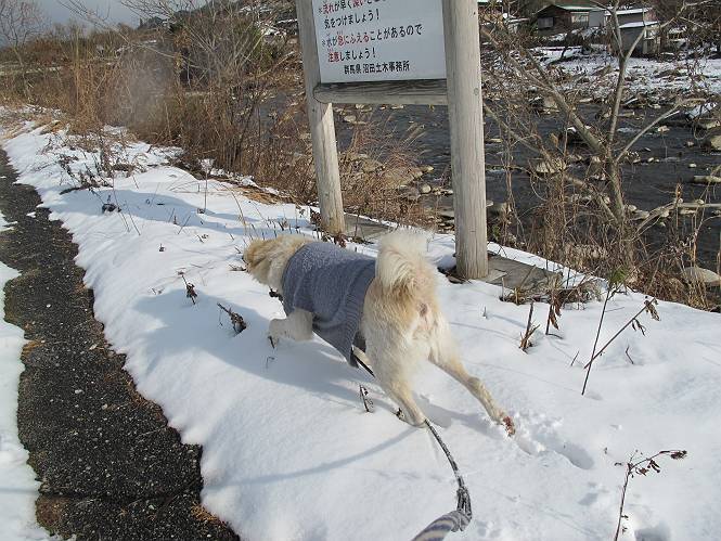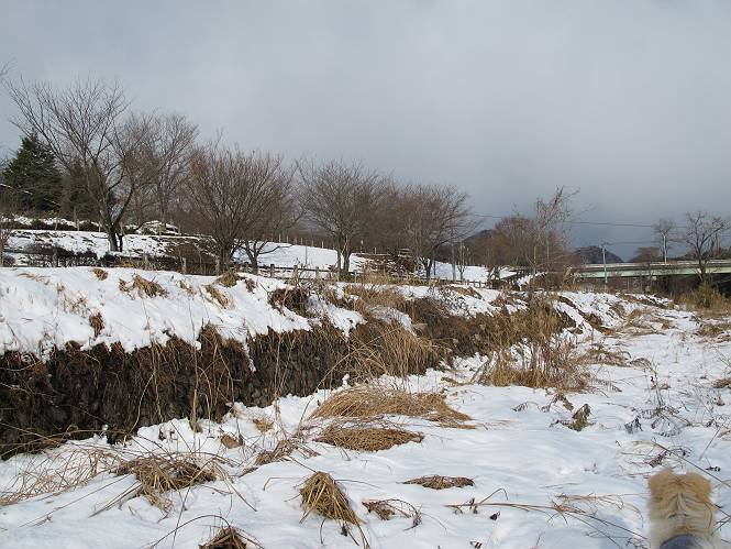| 平成二十四年十二月十三日 Before 写真集目次へ Next 高速道路を走って月夜野ICからみなかみ町の月夜野親水公園(道の駅)にやってきました。ここには、農産物直売所、軽食コーナー、公園、国指定史跡「矢瀬遺跡」があってぼくの好きな道の駅です。駐車場から二段下がった遊歩道を歩いています。 大きな川が下を流れています、利根川だそうです。 「川の近くまで下りて行こう」、と。 「あれっ、田圃に降りてしまった、駄目だなあ」 こっちはからは降りられないのかなあ。 この石垣は上れないし、 この先から降りよう。 やっと、川のほとりに来ました、水は少ないようです。北の方向は曇っていて、 谷川岳の方向は、厚い雲に覆われています。「雪が降っているんじゃないか」、って言ってました。 橋の向こう、奥の方が谷川岳だそうです。 変なところに着てしまった、どっちへ行くのかなあ。 足跡について行ってみよう。 こっちかなあ? 何だこれ、ずっと歩かないと出られないぞ。 ここは降りられないし、 先まで行くしかないようです。 雪と草の深い土手を南方向に歩いてます、遠くに見える山は赤城山だそうです。 ぐるぐるまわって、やっと抜けられて、矢瀬遺跡へ来ました。もっとゆっくり遊びたいのですが、これから伊香保温泉まで行くそうです、では車に戻ります。 雪遊びには良い所ですよ、また連れてきてね。 Before 写真集目次へ Next |