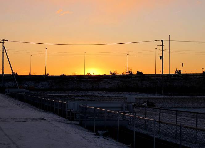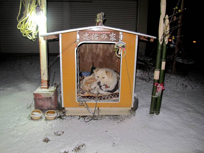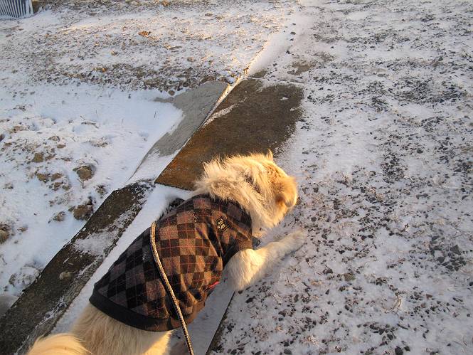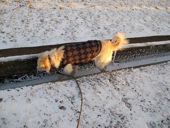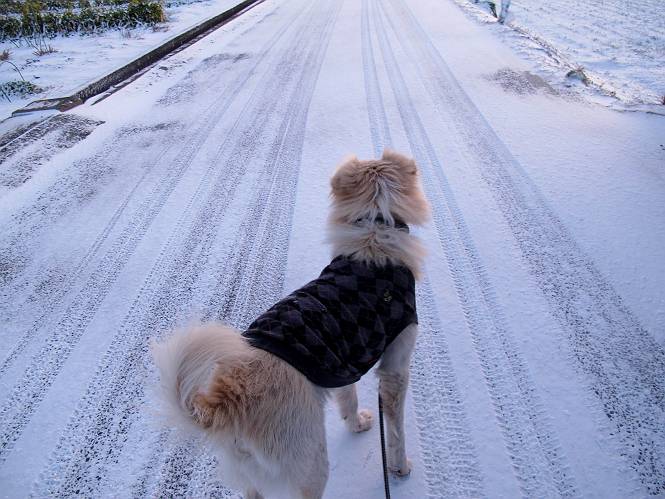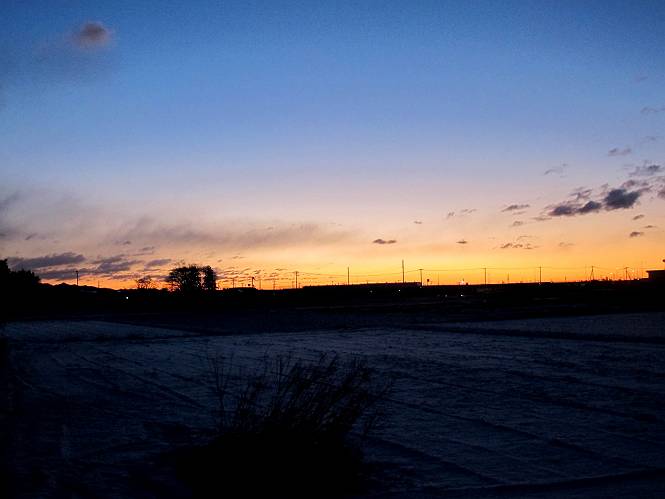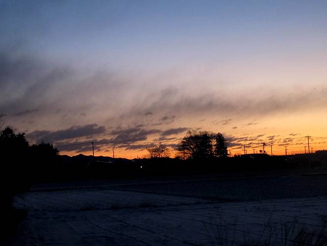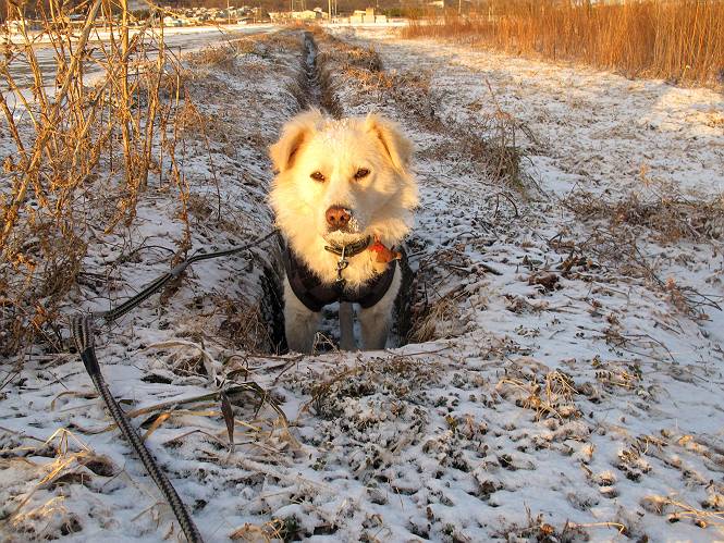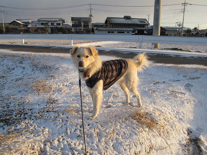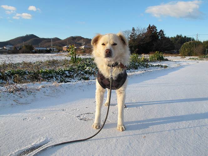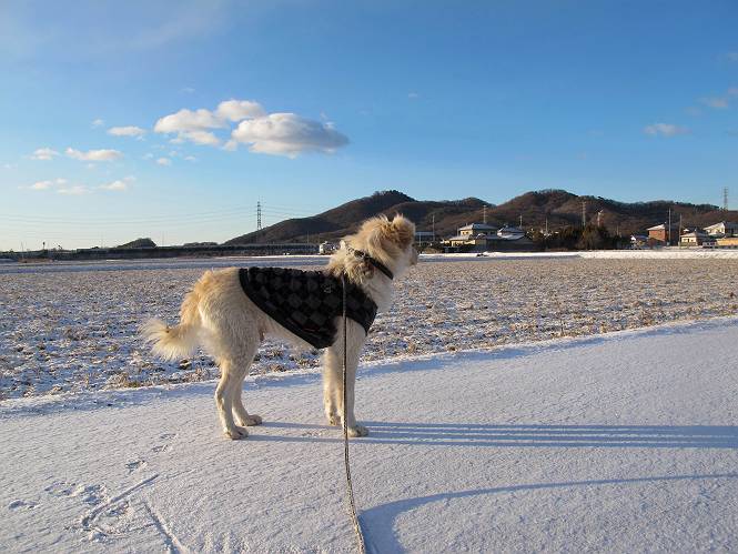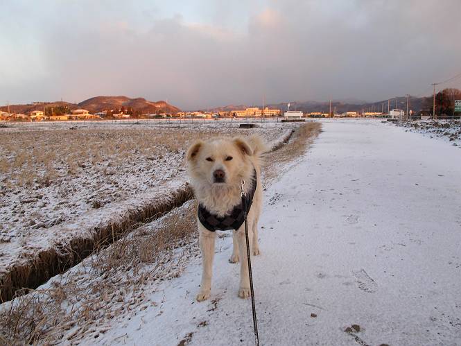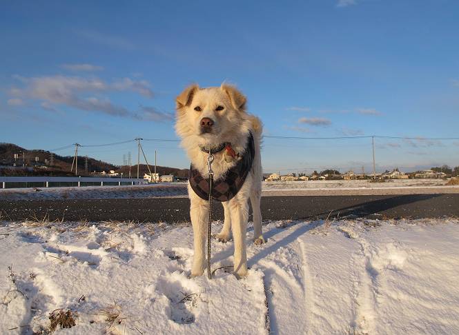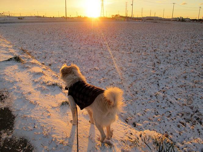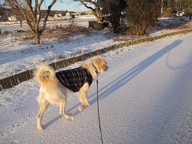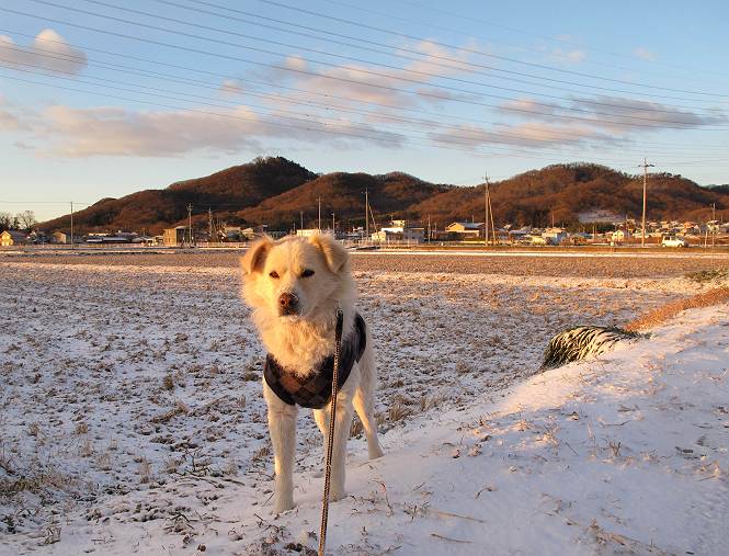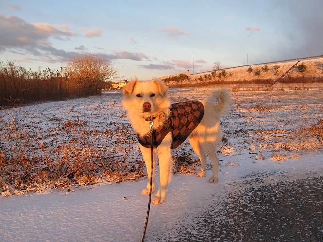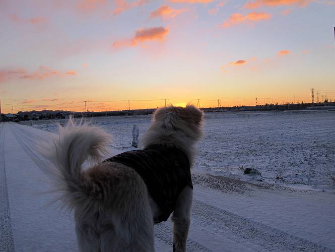 | 平成二十五年一月二十七日 Before 写真集目次へ Next 今朝、この冬2回目の雪が降りました。ぼくは寝込んでいて、強い風が吹いていたのは知ってますが、雪は全然気づきませんでした。 「忠治、雪だ、起きろ!」、とぼくの耳元で言うんですよ。 「眠いなあ、雪が少し積もったんだ」 「散歩に出かけるぞ」、と言うのですが、寒そうだし、まだ暗いんですよ。 凍りついた道路を渡って、田圃に沿って歩道を歩いてました。 きれいな朝焼けです。 高速道路の向こうから陽が昇っているようです。 日の出、点々とした雲、きれいですね。 お家が赤く染まってきました。 後に赤城山が見える位置ですが、雪雲に覆われて見えません。 もう少し進んで高速道路の下をくぐり南側に抜けます。 太陽が眩しいです。 インターチェンジの南側を高速道路に沿って歩いてます。 金山をバックに撮ってもらいました。 側溝の中を歩いてます、ニオイがするんですよ。 蓋があります、ここは上って、その先で・・・、 あれ? また蓋が、 出たり入ったりしましたが、ここで行止まってしまいました。 高速道路をくぐって北側に回り込みました。真っ黒い雲がありますね。 こちらは南、西方向です、空は真っ青です。 狭い露地を抜けていきます。ぼくの影、長いでしょう。 金山が綺麗でしょう、雪が少し見えてます。 ぼくんちは、もうすぐです。2回目の雪、雪道の散歩、楽しかったでーす。 ぼくは雪を楽しんでますが、雪国の人たちは大変なようです。寒い冬も峠にかかってます。もうすぐ春が・・・、頑張りましょうね。 Before 写真集目次へ Next |