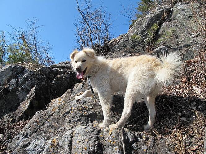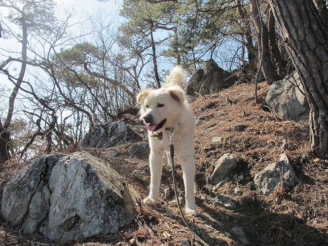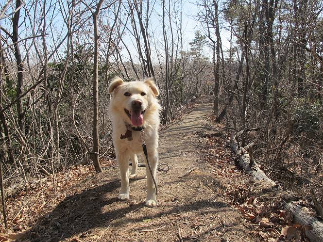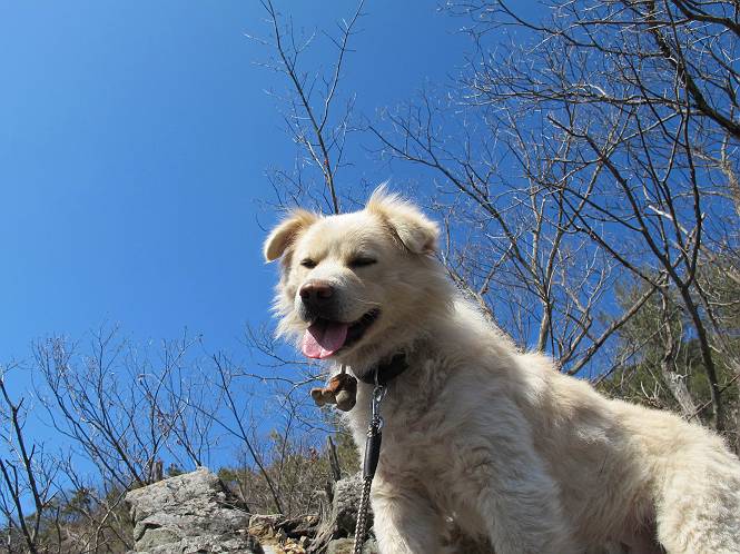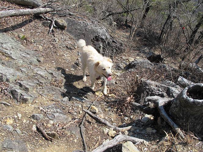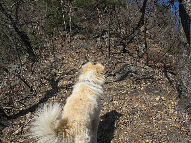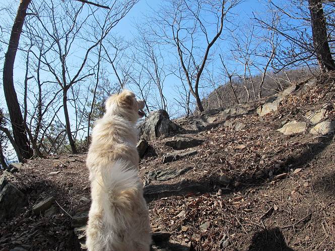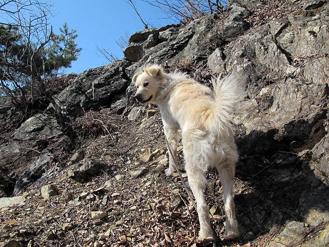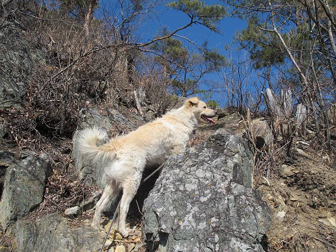 | 平成二十五年二月二十八日 Before 写真集目次へ Next 午後の散歩を途中でやめて、足利の湯殿山に行ってきました。なぜ途中でやめたかというと、急に春らしい陽気になって、陽だまりハイクがしたくなって出かけたってわけ。いつも歩いている表登山口から入って、湯殿山に登って、月山、羽黒山と歩いて、鉄塔の下を通り杉山を下って戻るコースです。 ここが表登山口です。この石段を上って尾根伝いに進みます。 ゆったりした尾根で気持ち良いですよ、今日は暑いくらいですね。 岩場が近づいてきました。 ここから坂が少しきつくなります。 ちょっと急でしょう、ぼくはヘッチャラだよ。 歩いてきた尾根を振り返ってます、もう半分ぐらい上ったようです。 こんな岩場がここから山頂まで続きます。 見晴しが良いですよ、気分サイコー。 「早く、早く、ぼくが引っ張ってやろうか」、「いいよ、景色でも眺めてな」 お父さんは、ゆっくり、両手を使って登ってきます。 この先も面白い場所が沢山あります。つつじの咲く頃はきれいですよ。 不動様に出ました、不動様ものどがかわくのかな、お水があるよ、ぼくと同じだね??? ちょっとだけ、この辺は緩くなってます。 ピョンピョン上って、ちょっと止まって、お父さんを待ってます。 でも、この坂ってキツイですね。 「お水がほしいなあ、下さい」、「もうすぐ山頂だからガマンしな!」 「ハーイ」 ちょっと疲れましたが、湯殿山の山頂に着きました。お水とオヤツを頂いていたら、西方向から4人づれのおばさんがやってきました。下る道をいろいろ聞いてました。結局ぼくたちと同じ方向のようです。 ここは月山ですか、お父さんもわからないんですって。 ここは? 三角点のある所です。 先に出た、おばさんのグループに近づいてしまいました。 ぼくはツメが効くもんね、岩場は滑ると怪我しちゃうもんね、慎重にね。 鉄塔、その先の階段まで後をついて行きましたが、分岐点から前に出させてもらいました。久しぶりの陽だまりハイク、花の咲くころまで、楽しめますね。 Before 写真集目次へ Next |