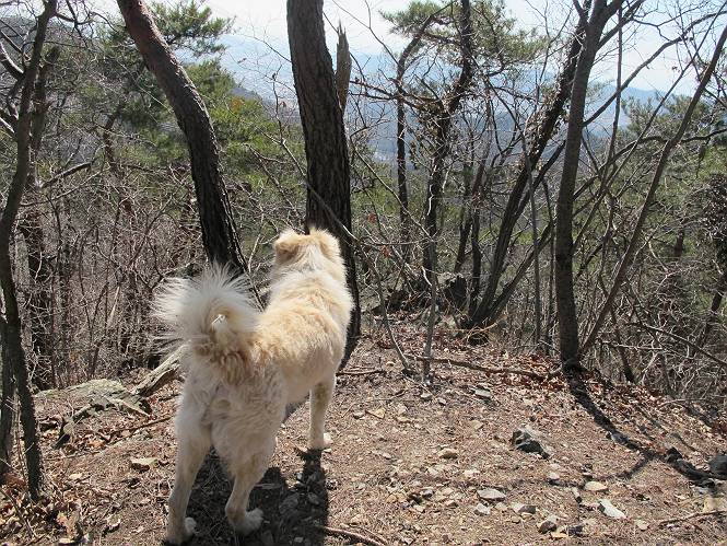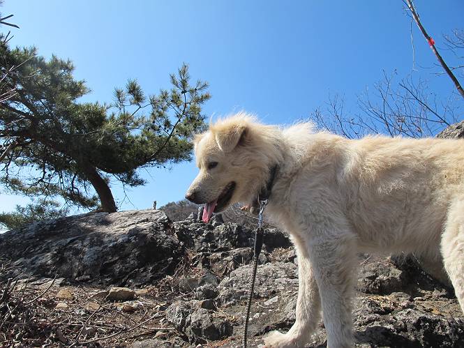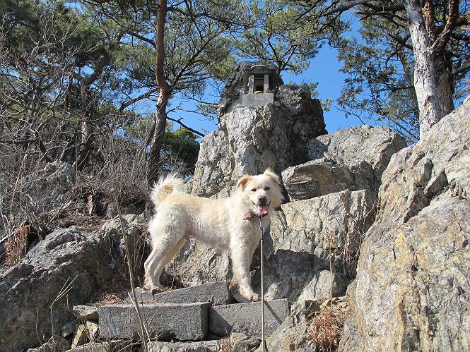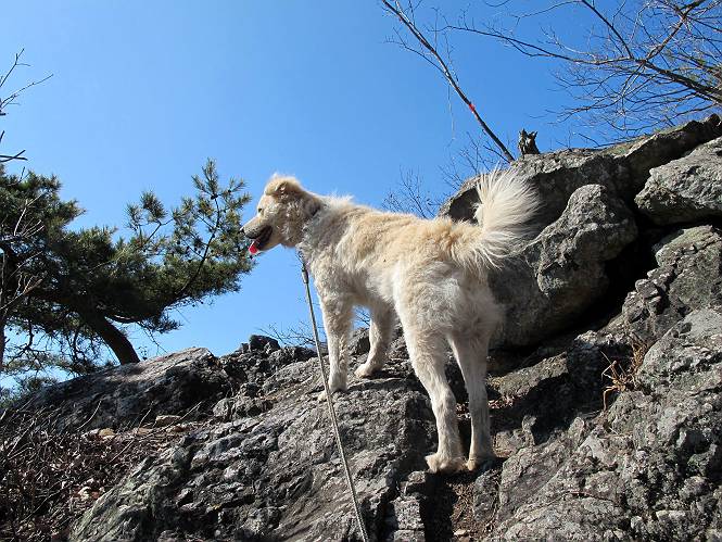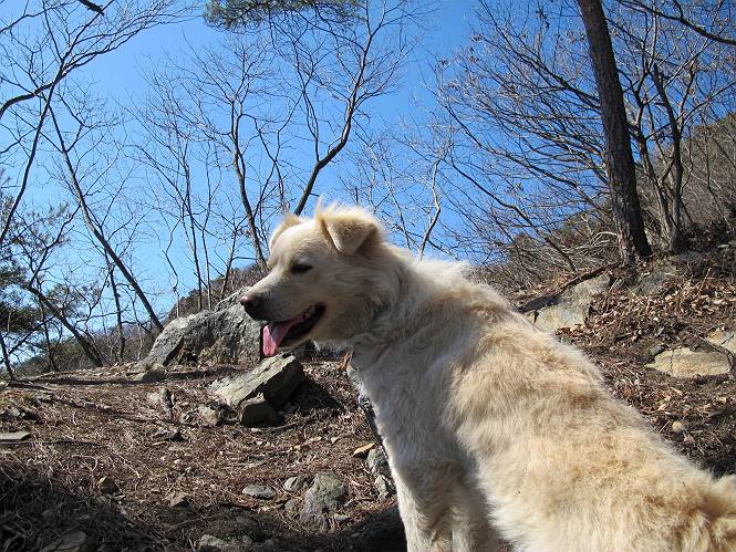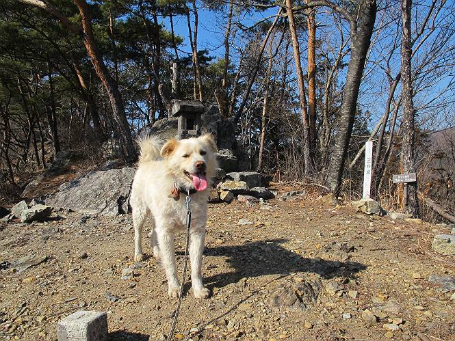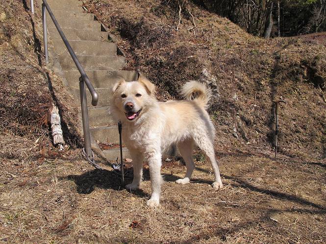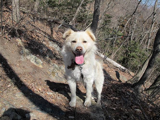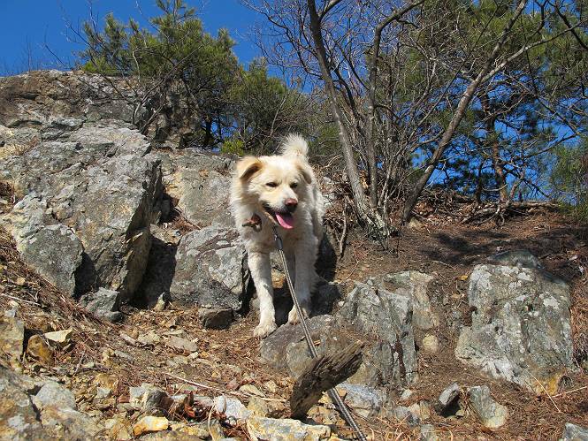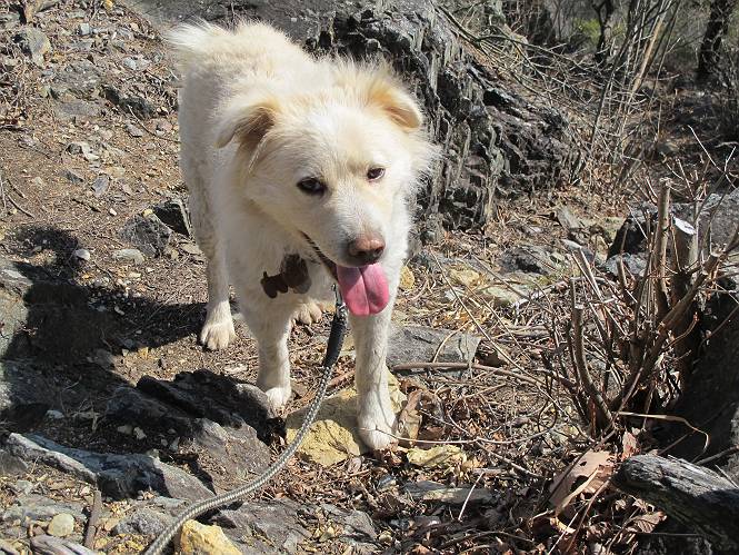 | 平成二十五年二月二十八日 Before 写真集目次へ Next 午後の散歩を途中でやめて、足利の湯殿山に行ってきました。なぜ途中でやめたかというと、急に春らしい陽気になって、陽だまりハイクがしたくなって出かけたってわけ。いつも歩いている表登山口から入って、湯殿山に登って、月山、羽黒山と歩いて、鉄塔の下を通り杉山を下って戻るコースです。 ここが表登山口です。この石段を上って尾根伝いに進みます。 ゆったりした尾根で気持ち良いですよ、今日は暑いくらいですね。 岩場が近づいてきました。 ここから坂が少しきつくなります。 ちょっと急でしょう、ぼくはヘッチャラだよ。 歩いてきた尾根を振り返ってます、もう半分ぐらい上ったようです。 こんな岩場がここから山頂まで続きます。 見晴しが良いですよ、気分サイコー。 「早く、早く、ぼくが引っ張ってやろうか」、「いいよ、景色でも眺めてな」 お父さんは、ゆっくり、両手を使って登ってきます。 この先も面白い場所が沢山あります。つつじの咲く頃はきれいですよ。 不動様に出ました、不動様ものどがかわくのかな、お水があるよ、ぼくと同じだね??? ちょっとだけ、この辺は緩くなってます。 ピョンピョン上って、ちょっと止まって、お父さんを待ってます。 でも、この坂ってキツイですね。 「お水がほしいなあ、下さい」、「もうすぐ山頂だからガマンしな!」 「ハーイ」 ちょっと疲れましたが、湯殿山の山頂に着きました。お水とオヤツを頂いていたら、西方向から4人づれのおばさんがやってきました。下る道をいろいろ聞いてました。結局ぼくたちと同じ方向のようです。 ここは月山ですか、お父さんもわからないんですって。 ここは? 三角点のある所です。 先に出た、おばさんのグループに近づいてしまいました。 ぼくはツメが効くもんね、岩場は滑ると怪我しちゃうもんね、慎重にね。 鉄塔、その先の階段まで後をついて行きましたが、分岐点から前に出させてもらいました。久しぶりの陽だまりハイク、花の咲くころまで、楽しめますね。 Before 写真集目次へ Next |