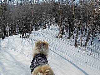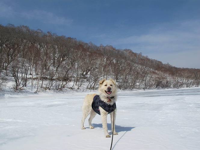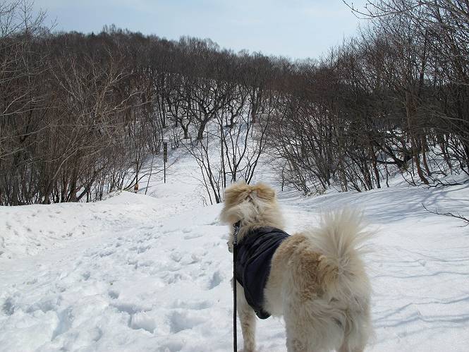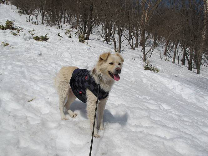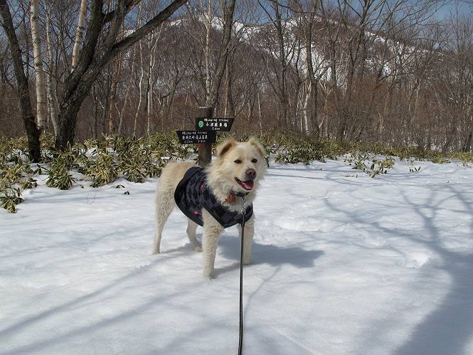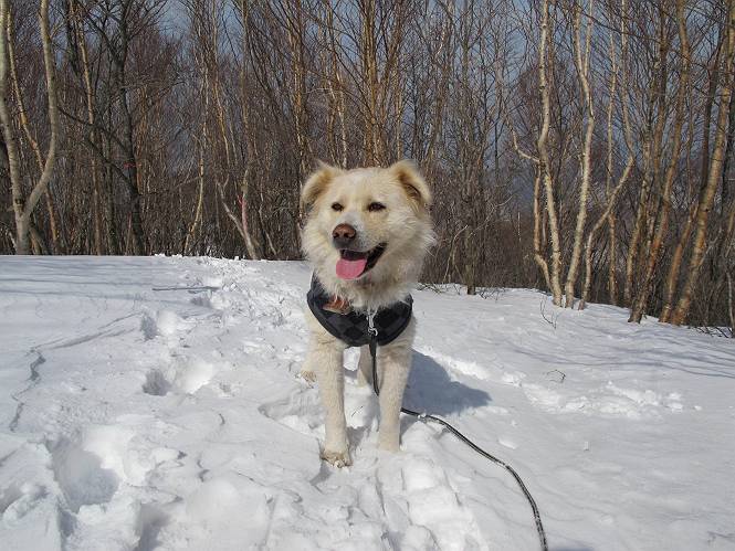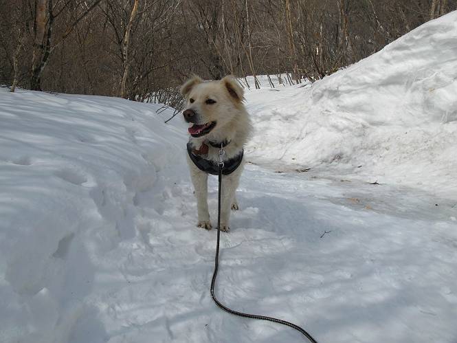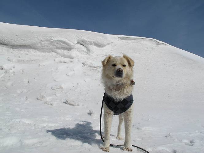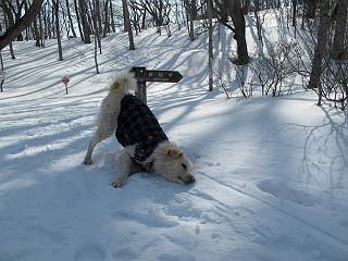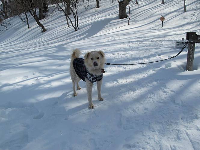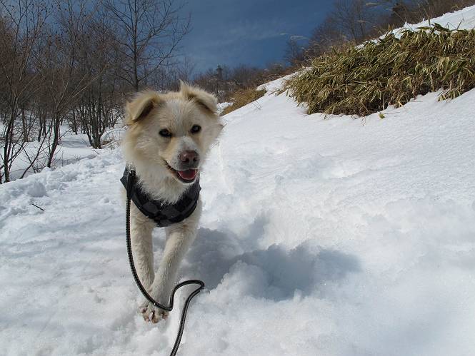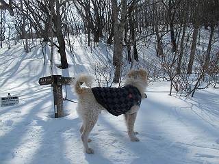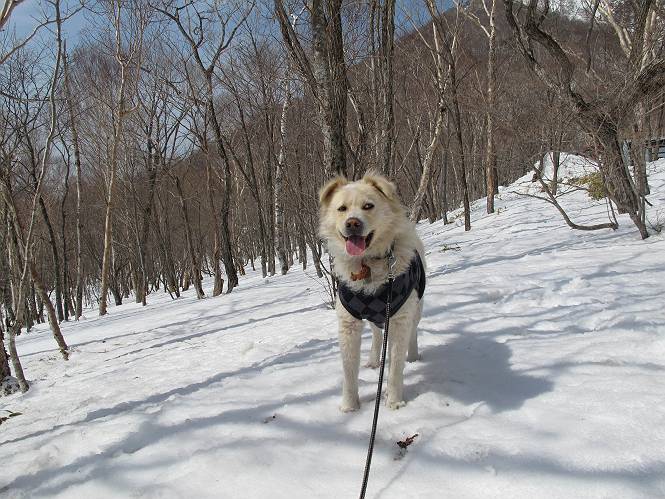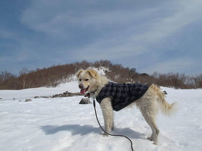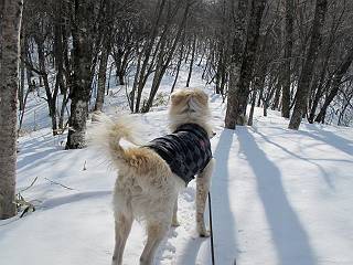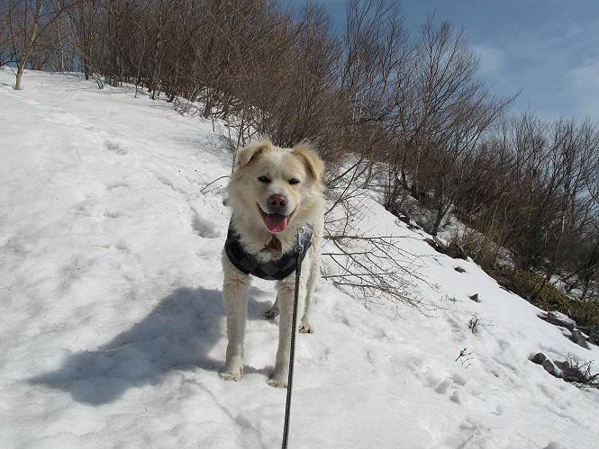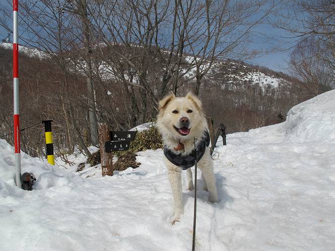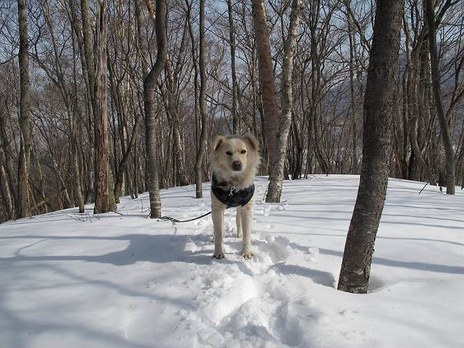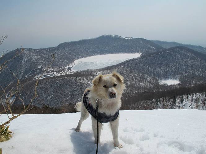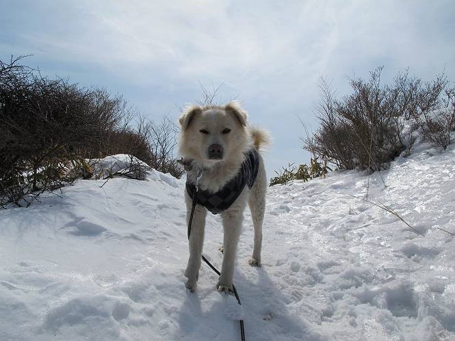 | 平成二十五年三月七日 Before 写真集目次へ Next 【前編】 【後編】も見てね 急に暖かくなってきましたね。今年のお山の雪遊びも最後になるかも知れません。今日はお天気も良さそうなので赤城山へ出かけました。2駆ノーマルタイヤで行ける所まで行って、そこから歩くそうです。順調に走れて、見晴山駐車場にやってきました。ここから地蔵岳、八丁峠、小沼、長七郎山、小地蔵岳、鳥居峠、覚満淵、大沼と歩いて、赤城少年自然の家から句碑の道を歩いて駐車場に戻る予定です。 沢山雪がありますね、 良い感じ。 さあ出発です、距離が長いし、道路を3回横断する以外は雪と氷の上ですって、大丈夫かな。 道は、はっきりついてます、森の中をしばらく歩くそうです。 雪の表面は硬いのですが、時々落ちてしまうんですよ。 静かな森を牧場の有刺鉄線に沿って歩いてます、時々車の走る音が聞こえてきます。 ここはちょっと雪が軟らかくて、ぼくの足がスッポリ入ってしまいます。 尾根に出ました、ここから急坂になるようです。 尾根に出ても、全然景色は見えません。早く見晴らしの良い所へ行きたいな。 道が大きく凹んでます、土も出てますね。 急坂だし森の中だし、右も左も何も見えません。 おお、やっと開けた所に出ました。 山頂のアンテナが見えてきました。 アンテナの隣に沢山雪が吹き溜まってました。 吹き溜まりの上から周りを見ていますが、霞んでいて遠くが見えません。 山頂の標識のある所が直ぐそこですね。 この吹き溜まり、軟らかい所があって、スッポリ落ちちゃうんですよ。 周辺には、誰もいないようです、ぼくたちだけです。 地蔵岳山頂の三角点の脇にいます。黒檜山を入れて撮ってもらいましたが、霞んじゃってね。 休憩ですって、こうしていても全然寒くないです。 山頂のアチラコチラを 歩き回って、 東のビューポイントにたってきました。これから行く小沼、長七郎山、小地蔵岳が見えてます。 つつじの間を抜けて、森に入りましたが、雪が深くて、 結局、道をあるくことになりました。 遊びながら歩いていたら荷物を山頂に運んでいる人達に会いました。 下るって、ラクチンですね。 おやっ、もう八丁峠かな、 早かった。 八丁峠です、車が3台、先ほどの人たちでしょう。 ちょっと、また、遊んで、 森の中に入りました。 暖かくて良い気持ちです。 道標がありました、後ろが先ほど通ってきた地蔵岳です。 小沼の遊歩道に出ました、いいなあ。 吹き溜まった雪が道に沿って続いてます。 小沼に降りました、真っ白です、氷の上に雪が少し積もってます。 小地蔵岳の左に、黒檜山、駒ケ岳の頭が見えてます。 湖上のぼくです、長七郎山の裾を入れて一枚撮ってもらいました。 小沼も広いですね、 あそこ(沼尻)まで歩くんだ。 小沼につけた、お父さんとぼく、一人一匹の足跡です。 沼尻に着きました、良い眺めでしょう。 南に回り込んで、長七郎山の登山口にやってきました、広々した道から入りました。 森の中の急坂です、面白い格好ですが頑張っています。 広い雪の窪んだ所に出て、少しらくになりました。 広々した場所にでました、もうすぐ山頂なのですが、お腹がすいちゃったね。 のどもかわいたし、雪でも食べて、我慢しましょうか。 地蔵岳を入れて撮られちゃいました、こんな格好で失礼します。やっとオヤツを少しだけ頂きました。 あっちから上ってきたんだ、 あれが山頂だ、もう一息だね。 ぼく、オヤツもらって元気でたよ。 長七郎山の山頂につきました。 お父さんは取り出してモシャモシャ食べ始めました、ぼくは雪をかじってましたが、干芋を頂きました。山頂に居合わせたご夫婦が「写真を撮らせて・・・」、「どうぞ」、変な格好の一人一匹、・・・・・。 一休みして、次は1ヶ月ほど前に歩いた小地蔵岳に向かいます。 ちょっと長くなってすみません、続きは【後編】をご覧下さい。 Before 写真集目次へ Next |
