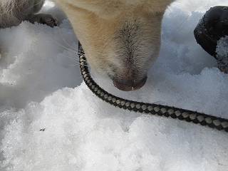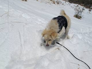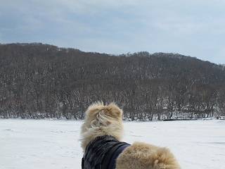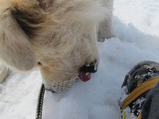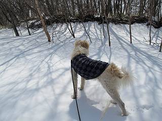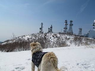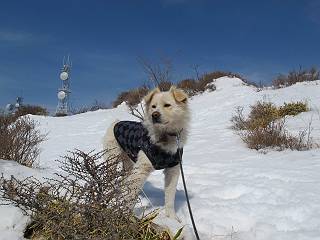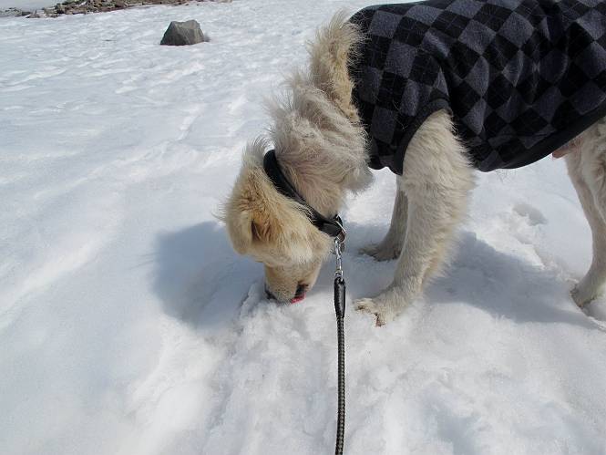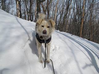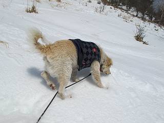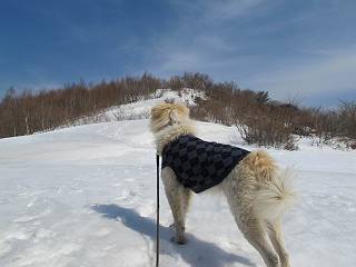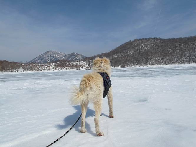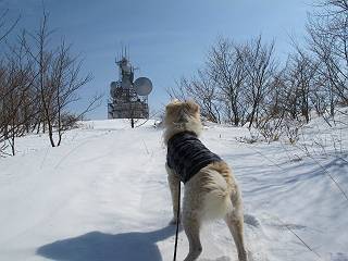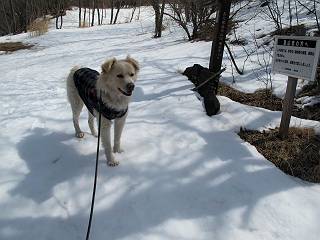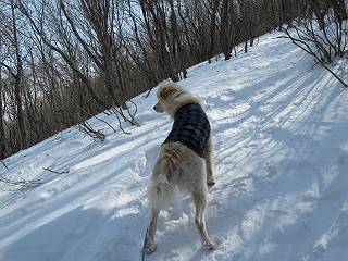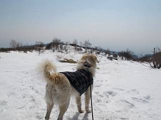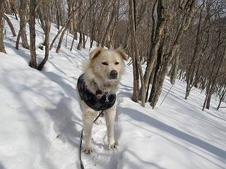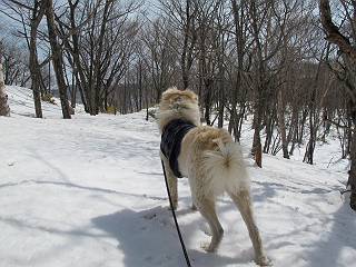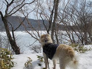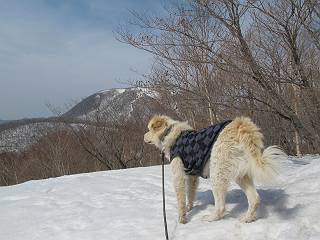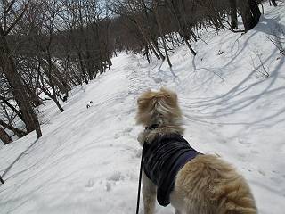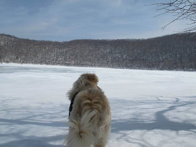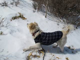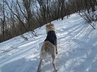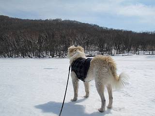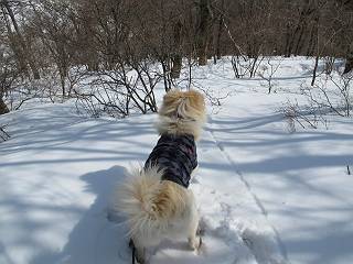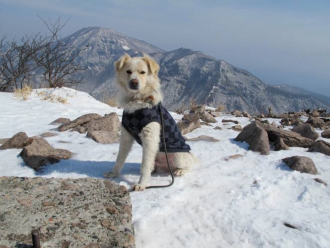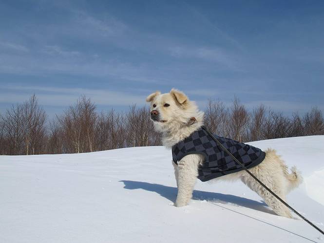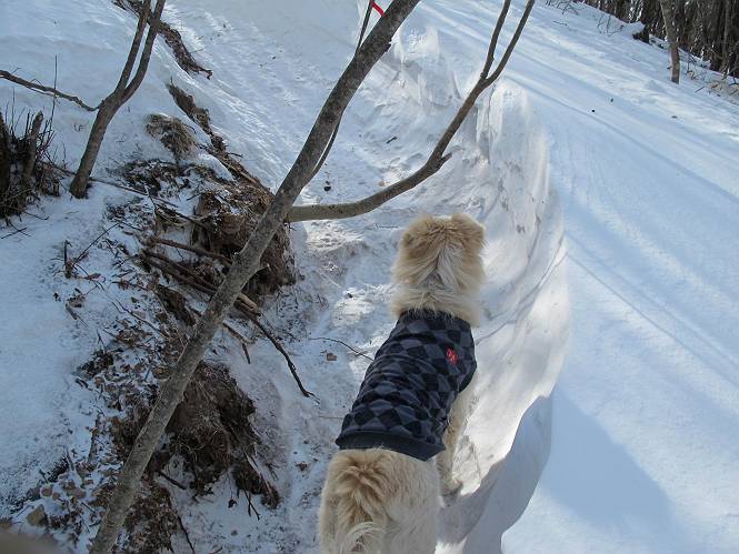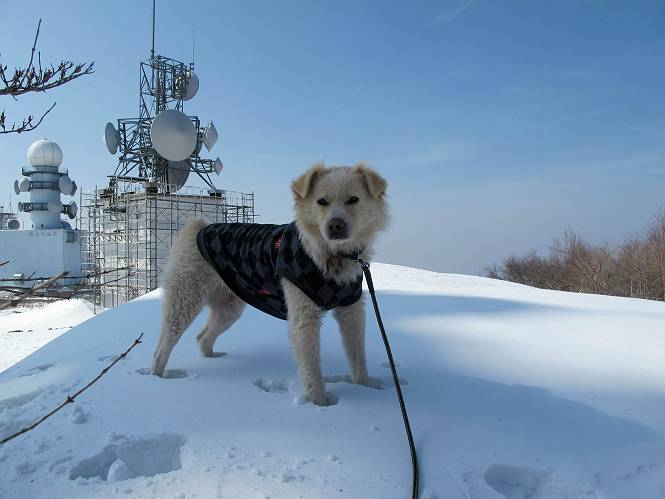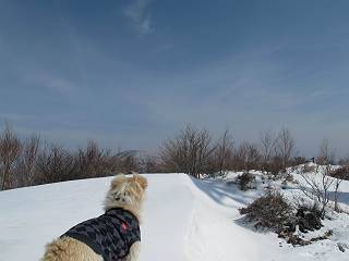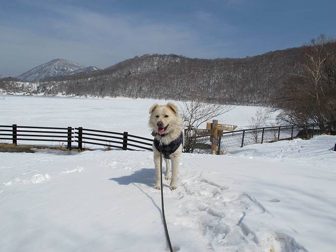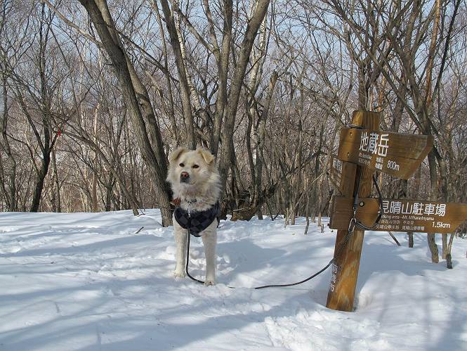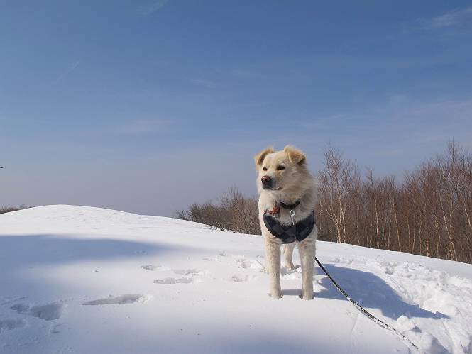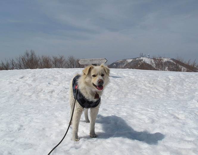 | 平成二十五年三月七日 Before 写真集目次へ Next 【前編】 【後編】も見てね 急に暖かくなってきましたね。今年のお山の雪遊びも最後になるかも知れません。今日はお天気も良さそうなので赤城山へ出かけました。2駆ノーマルタイヤで行ける所まで行って、そこから歩くそうです。順調に走れて、見晴山駐車場にやってきました。ここから地蔵岳、八丁峠、小沼、長七郎山、小地蔵岳、鳥居峠、覚満淵、大沼と歩いて、赤城少年自然の家から句碑の道を歩いて駐車場に戻る予定です。 沢山雪がありますね、 良い感じ。 さあ出発です、距離が長いし、道路を3回横断する以外は雪と氷の上ですって、大丈夫かな。 道は、はっきりついてます、森の中をしばらく歩くそうです。 雪の表面は硬いのですが、時々落ちてしまうんですよ。 静かな森を牧場の有刺鉄線に沿って歩いてます、時々車の走る音が聞こえてきます。 ここはちょっと雪が軟らかくて、ぼくの足がスッポリ入ってしまいます。 尾根に出ました、ここから急坂になるようです。 尾根に出ても、全然景色は見えません。早く見晴らしの良い所へ行きたいな。 道が大きく凹んでます、土も出てますね。 急坂だし森の中だし、右も左も何も見えません。 おお、やっと開けた所に出ました。 山頂のアンテナが見えてきました。 アンテナの隣に沢山雪が吹き溜まってました。 吹き溜まりの上から周りを見ていますが、霞んでいて遠くが見えません。 山頂の標識のある所が直ぐそこですね。 この吹き溜まり、軟らかい所があって、スッポリ落ちちゃうんですよ。 周辺には、誰もいないようです、ぼくたちだけです。 地蔵岳山頂の三角点の脇にいます。黒檜山を入れて撮ってもらいましたが、霞んじゃってね。 休憩ですって、こうしていても全然寒くないです。 山頂のアチラコチラを 歩き回って、 東のビューポイントにたってきました。これから行く小沼、長七郎山、小地蔵岳が見えてます。 つつじの間を抜けて、森に入りましたが、雪が深くて、 結局、道をあるくことになりました。 遊びながら歩いていたら荷物を山頂に運んでいる人達に会いました。 下るって、ラクチンですね。 おやっ、もう八丁峠かな、 早かった。 八丁峠です、車が3台、先ほどの人たちでしょう。 ちょっと、また、遊んで、 森の中に入りました。 暖かくて良い気持ちです。 道標がありました、後ろが先ほど通ってきた地蔵岳です。 小沼の遊歩道に出ました、いいなあ。 吹き溜まった雪が道に沿って続いてます。 小沼に降りました、真っ白です、氷の上に雪が少し積もってます。 小地蔵岳の左に、黒檜山、駒ケ岳の頭が見えてます。 湖上のぼくです、長七郎山の裾を入れて一枚撮ってもらいました。 小沼も広いですね、 あそこ(沼尻)まで歩くんだ。 小沼につけた、お父さんとぼく、一人一匹の足跡です。 沼尻に着きました、良い眺めでしょう。 南に回り込んで、長七郎山の登山口にやってきました、広々した道から入りました。 森の中の急坂です、面白い格好ですが頑張っています。 広い雪の窪んだ所に出て、少しらくになりました。 広々した場所にでました、もうすぐ山頂なのですが、お腹がすいちゃったね。 のどもかわいたし、雪でも食べて、我慢しましょうか。 地蔵岳を入れて撮られちゃいました、こんな格好で失礼します。やっとオヤツを少しだけ頂きました。 あっちから上ってきたんだ、 あれが山頂だ、もう一息だね。 ぼく、オヤツもらって元気でたよ。 長七郎山の山頂につきました。 お父さんは取り出してモシャモシャ食べ始めました、ぼくは雪をかじってましたが、干芋を頂きました。山頂に居合わせたご夫婦が「写真を撮らせて・・・」、「どうぞ」、変な格好の一人一匹、・・・・・。 一休みして、次は1ヶ月ほど前に歩いた小地蔵岳に向かいます。 ちょっと長くなってすみません、続きは【後編】をご覧下さい。 Before 写真集目次へ Next |